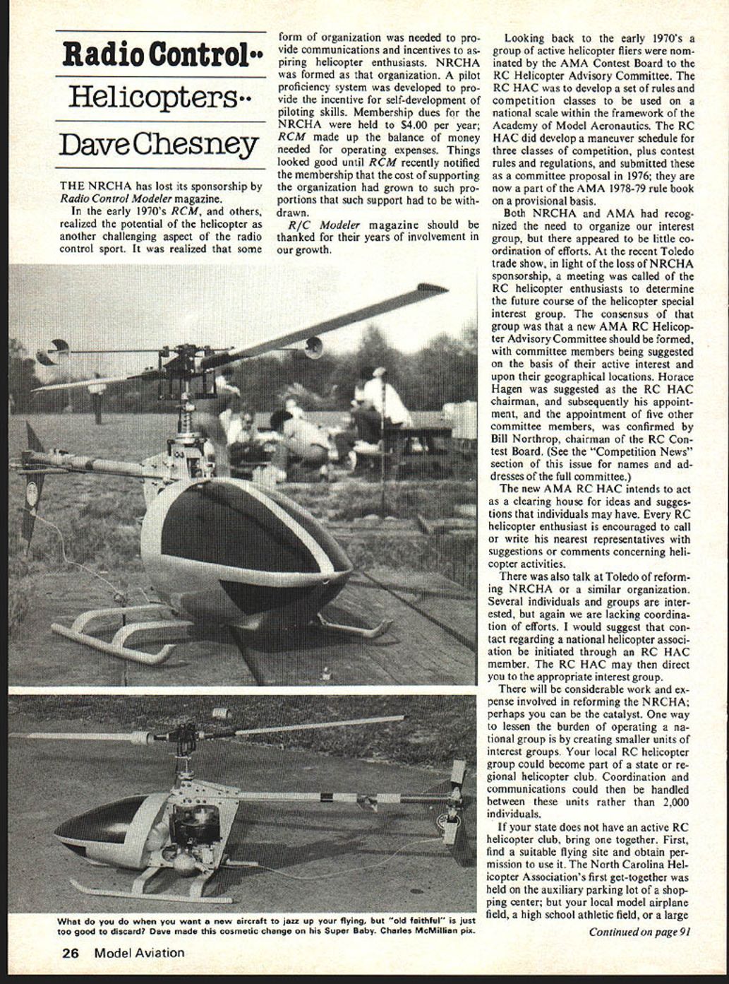 Radio Control Helicopters Dave Chesney THE NRCHA has lost its sponsorship Radio Control Modeler magazine early 1970s RCM others realized potential helicopter another challenging aspect radio control sport realized some form organization needed pro vide communications incentives piring helicopter enthusiasts NRCHA formed organization pilot proficiency system developed pro vide incentive self-development piloting skills Membership dues NRCHA held $400 per year RCM made up balance money needed operating expenses Things looked good until RCM recently notified membership cost supporting organization grown such pro portions such support drawn RIC Modeler magazine should thanked years involvement growth Looking back early 1970s group active helicopter fliers nom inated AMA Contest Board RC Helicopter Advisory Committee RC HAC develop set rules competition classes used national scale within framework Academy Model Aeronautics RC HAC did develop maneuver schedule three classes competition plus contest rules regulations submitted committee proposal 1976 now part AMA 1978-79 rule book provisional basis Both NRCHA AMA recog nized need organize interest group appeared little co ordination efforts recent Toledo trade show light loss NRCHA sponsorship meeting called RC helicopter enthusiasts determine future course helicopter special interest group consensus group new AMA RC Helicop ter Advisory Committee should formed committee members being suggested basis active interest upon geographical locations Horace Hagen suggested RC HAC chairman subsequently appoint ment appointment five other committee members confirmed Bill Northrop chairman RC Con test Board See Competition News section issue names ad dresses full committee new AMA RC HAC intends act clearing house ideas sugges tions individuals may have RC helicopter enthusiast encouraged call write nearest representatives suggestions comments concerning heli copter activities also talk Toledo reform ing NRCHA similar organization Several individuals groups inter ested again lacking coordina tion efforts would suggest con tact regarding national helicopter associ ation initiated through RC HAC member RC HAC may direct appropriate interest group will considerable work ex pense involved reforming NRCHA perhaps can catalyst way lessen burden operating na tional group creating smaller units interest groups local RC helicopter group could become part state re gional helicopter club Coordination communications could handled between units rather 2000 individuals state does have active RC helicopter club bring together First find suitable flying site obtain per mission use North Carolina Hel icopter Associations first get-together held auxiliary parking lot shop ping center local model airplane field high school athletic field large Continued page 91 26 Model Aviation What you want new alrcratt jazz up TIyIng oui 010 raatnrui I5 jusT too good discard Dave made cosmetic change Super Baby Charles McMillian pix cially like Rookie Race comments couple held Southern California few years ago very successful think need couple Rookie Races season Thats month go fast turn left Dave Lane 4477 W 136th St Haw thorne CA 90250 RC Helicopters/Chesney continued page 26 vacant lot may usedbut insure site safe permission use verified AMA Contest Director available enlist help would suggest first meet informal After preliminaries get word out Mail letter AMA chartered club state letter should include date time meet location site map list local motels phone numbers name ad dress phone number Also include brief statement about meet tentions final request everyone pass word waiting date come around prepare quan tity questionnaires handed out meet person attending can requested fill name address phone number AMA number types helicopters flown date comes whether first meet yields club assure will rewarding Dont forget collect some ideas pass Horace ad dress Horace Hagen 15 Parkway Place Red Bank NJ 07701 necessary expert helicopter flier order stimulate local interest fact big benefit state helicopter group will ability communicate problems successes helicopter flying others sharing interest alone can speed progress about retire three-year-old Heli-baby decided experiment stead photos result ex periment Since helicopter diffi cult wear out got little tired see ing same old scarred bubble elected make fiberglass canopy Most helicopters will last long time de spite hard knocks learning fly may elect try type cosmetic modification before retiring bird cases canopy similar shown photos may produced just few hours Ill explain next month sketch few ideas new~ helicopter Dave Chesney Rt 9 Box 621A Greensboro NC 27407 writing advertiseis mention read about MA open groove occurs Move elevators check binding connector dowel passing through fuselage Cement wing position insuring perpendicular fuselage exhaust stacks inboard side body cut /4 balsa sheet cemented strip 1/32 plywood thin cardboard Make cannon 3/16 balsa sheet Both above painted black assembled model after has painted Give plane two coats clear fuel-proof dope sanding #300 paper between coats Using soldered coupling join pushrod wing Kwik-Link bellcrank parallel fuselage eleva tors should level plane painted follows Fuse lage top sides top wing stab rudder splintered pattern brown green under side fuselage wing stab panels landing gear light blue canopy silver canopy frame brown painted tape spinner yellow roundels lettering numbers other markings cut Mon okote Trim Sheets Outboard can non added strip yellow equally above below point leading edge plane powered 15 motor September1978 91 Weve done new innovative manufacturing process allows us reproduce authentic markings incredibly strong thin Mylar sheeting Pressure sensitive ease application colors fuel proof fade proof decals will lay flat painted marking rich assortment styles available ranging World War current insignias Look new well other fine Pica Products hobby store AVAILABL