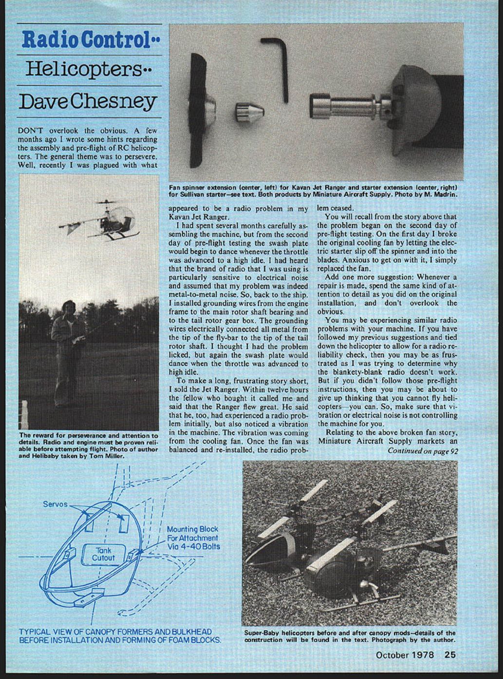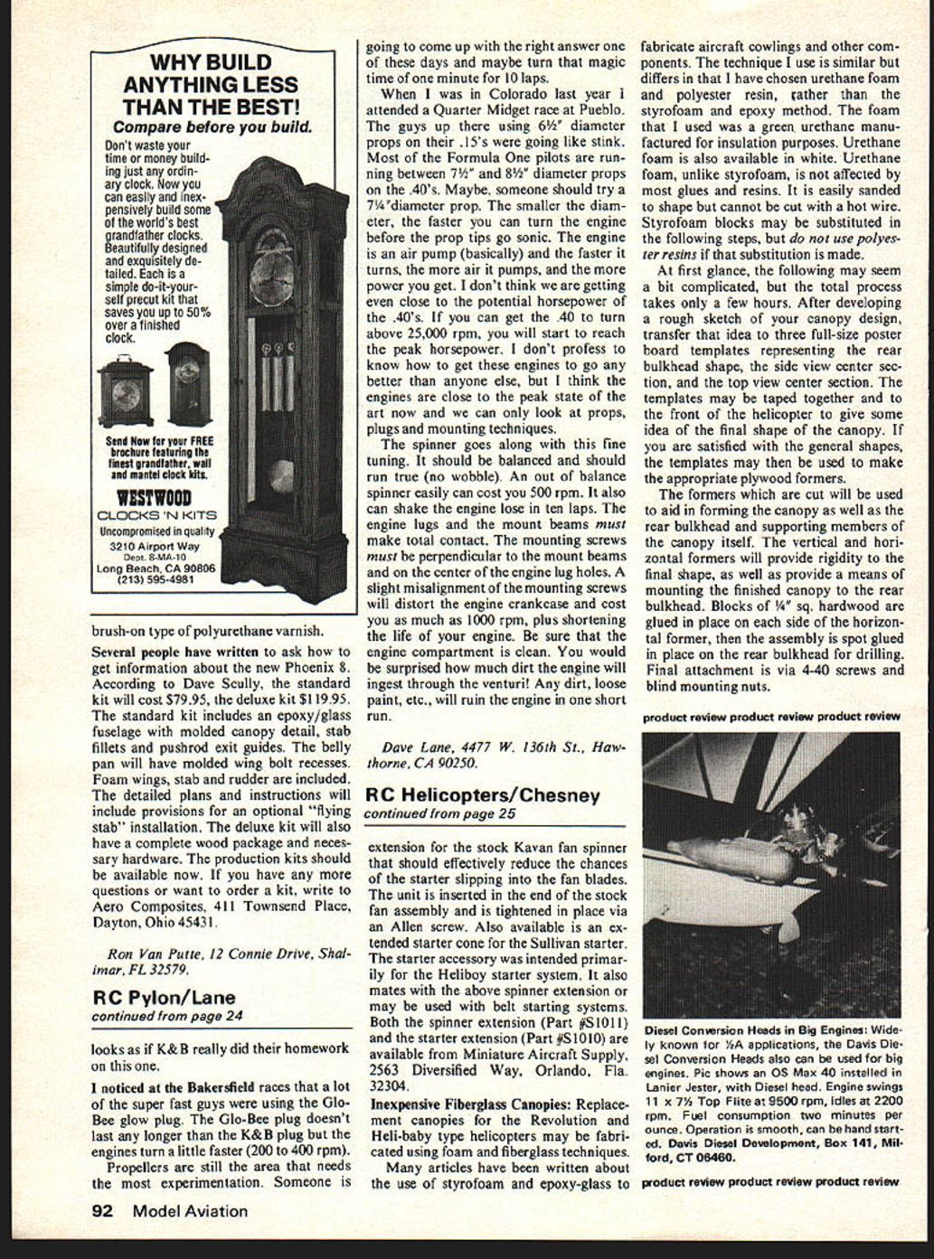 pro onths car Ut the swas never idle U o electrical blern back t s thi r shaft bea lox gi .ted m o tip oi pi swash plate advanc Qtrating story ithin called great I-I radi vii ration c Once fE d radic 2mw Whet IC y stions b La deter doesi v those may us J i-I-r -I WHY BUILD ANYTHING LESS THAN THE BEST Compare before build Dont waste time money build ing just ordin ary clock Now can easily inex pensively build some worlds best grandfather clocks Beautifully designed exquisitely de tailed simple do-it-your self precut kit 50% IISTIGOD CLOCKS N KITS Uncompromised quality 3210 Airport Way Dept 8-MA-iD Long Beach CA 90806 213 595-4981 brush-on type polyurethane varnish Several people have written ask get information about new Phoenix 8 According Dave Scully standard kit will cost S7995 deluxe kit $11995 standard kit includes epoxy/glass fuselage molded canopy detail stab fillets pushrod exit guides belly pan will have molded wing bolt recesses Foam wings stab rudder included detailed plans instructions will include provisions optional flying stab installation deluxe kit will also have complete wood package neces sary hardware production kits should available now have questions want order kit write Aero Composites 411 Townsend Place Dayton Ohio 45431 Ron Van Pune 12 Connie Drive Shal imar FL 32579 RC Pylon/Lane continued page 24 looks K&B really did homework noticed Bakersfield races lot super fast guys using GbBee glow plug Gb-Bee plug doesnt last longer K&B plug engines turn little faster 200 400 rpm Propellers still area needs experimentation Someone going come up right answer days maybe turn magic time minute 10 laps Colorado last year attended Quarter Midget race Pueblo guys up using 6 diameter props 15s going like stink Most Formula pilots run ning between 7 8 diameter props 40s Maybe someone should try 7/4diameter prop smaller diam eter faster can turn engine before prop tips go sonic engine air pump basically faster turns air pumps power get dont think getting close potential horsepower 40s can get 40 turn above 25000 rpm will start reach peak horsepower dont profess know get engines go better anyone else think engines close peak state art now can look props plugs mounting techniques spinner goes along fine tuning should balanced should run true no wobble An out balance spinner easily can cost 500rpm also can shake engine lose ten laps engine lugs mount beams must make total contact mounting screws must perpendicular mount beams center engine lug holes slight misalignment mounting screws will distort engine crankcase cost much 1000 rpm plus shortening life engine sure engine compartment clean would surprised much dirt engine will ingest through venturi Any dirt loose paint etc will ruin engine short run Dave Lane 4477 W 136th St Haw thorne CA 90250 R C Helicopters/Chesney continued page 25 extension stock Kavan fan spinner should effectively reduce chances starter slipping fan blades unit inserted end stock fan assembly tightened place via Allen screw Also available ex tended starter cone Sullivan starter starter accessory intended primar ily Heliboy starter system also mates above spinner extension may used belt starting systems Both spinner extension Part #S 1011 starter extension Part #S 1010 available Miniature Aircraft Supply 2563 Diversified Way Orlando Fla 32304 Inexpensive Fiberglass Canopies Replace ment canopies Revolution Heli-baby type helicopters may fabri cated using foam fiberglass techniques articles have written about use styrofoam epoxy-glass fabricate aircraft cowlings other com ponents technique use similar differs have chosen urethane foam polyester resin rather styrofoam epoxy method foam used green urethane manu factured insulation purposes Urethane foam also available white Urethane foam unlike styrofoam affected glues resins easily sanded shape cannot cut hot wire Styrofoam blocks may substituted following steps use polyes ter resins substitution made first glance following may seem bit complicated total process takes few hours After developing rough sketch canopy design transfer idea three full-size poster board templates representing rear bulkhead shape side view center sec tion top view center section templates may taped together front helicopter give some idea final shape canopy satisfied general shapes templates may used make appropriate plywood formers formers cut will used aid forming canopy well rear bulkhead supporting members canopy itself vertical hori zontal formers will provide rigidity final shape well provide means mounting finished canopy rear bulkhead Blocks ardwood glued place side horizon tal former assembly spot glued place rear bulkhead drilling Final attachment via 4-40 screws blind mounting nuts 92 Model Aviation Send Now yeur FREE brochure featuring finest grandfather wall mantel clock kits product review product review product review Diesel Conversion Heads Big Engines Wide ly known AA applications Davis Die sel Conversion Heads also can used big engines Pic shows OS Max 40 installed Lanier Jester Diesel head Engine swings 11 x 7/ Top Flite 9500 rpm idles 2200 rpm Fuel consumption two minutes per ounce Operation smooth can hand start ed Davis Diesel Development Box 141 Mu ford CT 06460 product review proluct review product review Before final assembly vertical horizontal formers protect rear bulkhead permanent attachment covering forward side bulkhead 3 strips masking tape Now bolt formers bulkhead assembly viewed front will form quadrants quadrants filled blocks urethane foam urethane foam may contact cemented vertical horizontal formers masked rear bulkhead After foam has installed sand final canopy shape make sure outside edges formers bulk head exposed Templates wire con tour gauge may used aid sanding final shape Urethane foam sands very easily dust surprisingly abrasive take care final shape vacuumed remove excess dust point unwanted depressions may filled mixture urethane dust polyester resin following should accomplished outside 