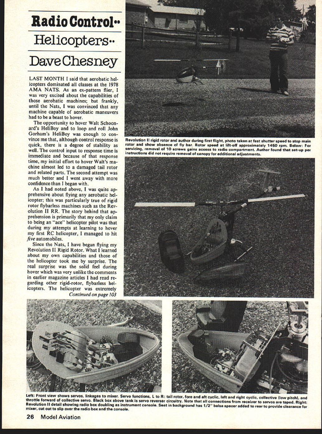 Radio Control Helicopters. Dave Chesney LAST MONTH said acrobatic hel icopters dominated classes 1978 AMA NATS As ex-pattern flier very excited about capabilities acrobatic machines frankly until Nats convinced machine capable aerobatic maneuvers beast hover opportunity hover Walt Schoon ards HeliBoy loop roll John Gorhams HeliBoy enough con vince although control response quick degree stability well control input response time immediate because response time initial effort hover Walts ma chine almost led damaged tail rotor related parts second attempt much better went away confidence began As noted above quite ap prehensive about flying aerobatic hel icopter particularly true rigid rotor flybarless machines such Rev olution II RR story behind ap prehension primarily claim being ace helicopter pilot during attempts learning hover first RC helicopter managed hit five automobiles Since Nats have begun flying Revolution II Rigid Rotor What learned about own capabilities helicopter took surprise real surprise solid feel during hover very unlike comments earlier magazine articles read re garding other rigid-rotor flybarless hel icopters helicopter extremely Continued page 103 26 Model Aviation Revolution II rigid rotor sulfur ouring rirst rHignI pnoto taken tast shUtter speed stop main rotor show absence fly bar Rotor speed lift-off approximately 1450 rpm Below servicing removal 10 screws gains access radio compartment Author found set-up per instructions did reauire removal canoov additmnnnl RfIHtnrnnt Len 1-ront view shows servos linkages mixer Servo functions L R tail rotor fore aft cyclic left right cyclic collective low pltcn throttle forward collective servo Black box above tank servo reverser circuitry Note connections receiver servos taped Right Revolution II detail showing radio box doubling instrument console Seat background has 1/2 balsa spacer added rear provide clearance mixer cut Out slip over radio box console fillets around bulkheads new Pettit product welcome works Ron Van Puue 12 Connie Drive Shalimar FL 32579 RC Helicopters/Chesney continued page 26 quick respond control inputs unlike Hiller systems am familiar As turned out quickness abso lute control welcome change hurry up wait Hiller system difference control response ad vantage between rigid rotor flybarless helicopter primarily because direct inputs swash plate rotor blade Hiller systems must rely stabilizing flybar servo main rotors other words swash plate acts upon flybar turn powers main rotor pitch change mechanism absence flybar servo paddles cans also disadvantage because servo power must come directly radio systems servo addition force multiplying ef fect flybar paddles flybar also responsible much stability rotor system acting gyro scope flybarless helicopter blades weighted allow spinning rotor system act also gyroscope stabilize machine possible put much weight blade control inputs rotors will have affect upon altitude helicop ter Too little weight blades will result very little gyroscopic effect machine could become almost impos sible control folks American R/C Helicopter have found best com promise Revolution II Rigid Rotor caution against changing amount location rotor tip weights Another type rotor system use combination system allowing direct input rotor blades well input through flybar rotor believe re ferred BelIer system BelIer system used Kavan Jet Ranger HeliBoy Revolution Commander light helicopter such HeliBoy Revolution Com mander Beller system offers aerobatic performance plus additional stability power provided flybar back Revolution II RR Revolution II shown photos began its career standard Revolu tion II Fixed Pitch Kit Rigid Rotor flybarless system added conver sion kit Since Revolution earlier kits some drilling neces sary install modification Later Revolutions supplied holes factory drilled will simplify stallation modifications available availability modification kits standard Revolution II offers heli copter can grow proficiency grows addition flybarless Rigid Rotor GRISH IS BIGGER propellers Ways BEST Grish designs propellers. others copy Sizes pitches styles needs LARGE WOOD SIZES 7 18 modification kit new Commander aerobatic head kit has also re leased Soon hope new flybarless four bladed head will also available Commander head four-bladed system may added existing Revolution II Rigid Rotor simply removing fly barless head installing new head associated swash plate pitch arm linkage same could apply Com mander helicopter just change rotor heads would necessary convert flybarless two- four-blade systems addition rotor systems now available Revolution II Jet Ranger fuselage available may added Revolution fixed pitch heli HARDWOOD. too hard minimizes chances costly plane engine damage True pitch airfoil fully carved Craftsman adds own final copter Revolution Commander Revolution II Rigid Rotor Revolution II regardless initial configuration offers tremendous degree flexibility its owner As noted above paragraphs Revolution II Rigid Rotor result Rigid Rotor modification kit kit added very little deviation instructions photos show de tails particular radio installation except modification seat console related placement receiver battery pack per stallation instructions provided modification kit machine arrived first flight addition 4 oz nose December1978 103 RISH RGE WOOD PROPELLERS touches ISH BROS ST JOHN GRINDIANA 46373 diameters 6810 pItch] / weight required plus usual blade track ing pitch adjustments necessary new machine preparing first flight Revolution II Rigid Rotor similar machine word advicedo give cyclic control machine until off ground Unlike teetering head type helicopters cyclic control just point lift off absolute im mediateto give command would invite tip-over After familiarity control re sponse gained same quickness response will offer advantages both hover forward flight ma chine capable recovery almost flight attitude primary limiting factor being pilots ability recogni
