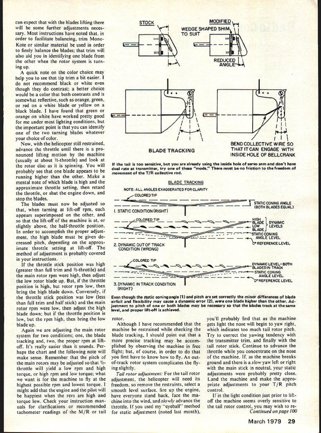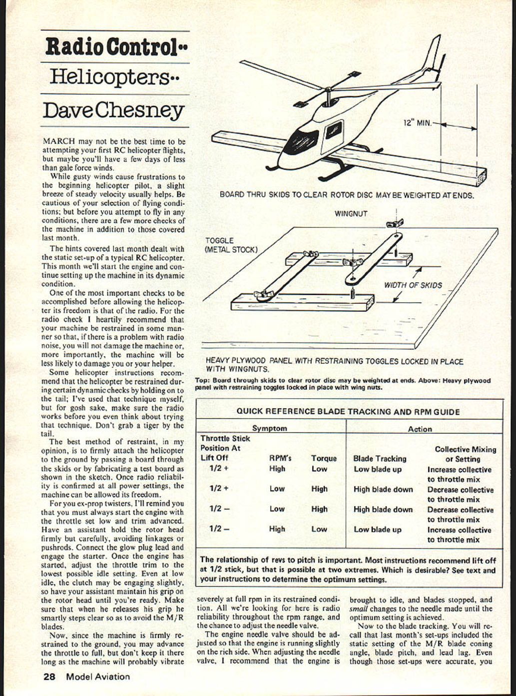 Radio Control Helicopters. Dave Chesney MARCH may best time attempting first RC helicopter flights maybe youll have few days less gale force winds gusty winds cause frustrations beginning helicopter pilot slight breeze steady velocity usually helps cautious selection flying condi tions before attempt fly conditions few checks machine addition covered last month hints covered last month dealt static set-up typical RC helicopter month well start engine con tinue setting up machine its dynamic condition important checks accomplished before allowing helicop ter its freedom radio radio check heartily recommend machine restrained some man ner problem radio noise will damage machine importantly machine will less likely damage helper Some helicopter instructions recom mend helicopter restrained dur ing certain dynamic checks holding tail Ive used technique myself gosh sake make sure radio works before think about trying technique Dont grab tiger tail best method restraint opinion firmly attach helicopter ground passing board through skids fabricating test board shown sketch Once radio reliabil ity confirmed power settings machine can allowed its freedom ex-prop twisters Ill remind you must always start engine throttle set low trim advanced Have assistant hold rotor head firmly carefully avoiding linkages pushrods Connect glow plug lead engage starter Once engine has started adjust throttle trim lowest possible idle setting low idle clutch may engaging slightly have assistant maintain grip rotor head until youre ready Make sure releases grip smartly steps clear avoid M/R blades Now since machine firmly re strained ground may advance throttle full dont keep long machine will probably vibrate BOARD THRU SKIDS TO CLEAR ROTOR DISC MAY BE WEIGHTED AT ENDS WINGNUT TOGGLE METAL STOCK ____i 7 WIDTH OF SKIDS -- A / ---- V HEAVY PLYWOOD PANEL WITH RESTRAINING TOGGLES LOCKED IN PLACE WITH WINGNUTS Top Board through skids clear rotor disc may weighted ends Above Heavy plywood panel restraining toggles locked place wing nuts Throttle Stick Position Collective Mixing Lift OffRPMsTorqueBlade Tracking ting 1/2 HighLowLow blade upIncrease collective throttle mix 1/2 LowHighHigh blade downDecrease collective throttle mix 1/2 LowHighHigh blade downDecrease collective throttle mix 1/2 HighLowLow blade upIncrease collective throttle mix severely full rpm its restrained condi tion looking radio reliability throughout rpm range chance adjust needle valve engine needle valve should ad justed engine running slightly rich side adjusting needle valve recommend engine brought idle blades stopped small changes needle made until optimum setting achieved Now blade tracking will re call last months set-ups included static setting M/R blade coning angle blade pitch lead lag though set-ups accurate 28 Model Aviation QUICK REFERENCE BLADE TRACKING AND RPM GUIDE SymptomAction relationship revs pitch important Most instructions recommend lift off 1/2 stick possible two extremes Which desirable See text instructions determine optimum settings can expect blades lifting will some further adjustments neces sary Most instructions have noted order facilitate balancing trim Mono Kote similar material used order finely balance blades trim will also aid identifying blade other rotor system turn ing up quick note color choice may help see tip trim bit easier recommend black white though contrast better choice would color both contrasts somewhat reflective such orange green red white blade yellow black blade have found green orange white have worked pretty good under lighting conditions important point can identify two turning blades whatever choice color Now helicopter still restrained advance throttle until pro nounced lifting motion machine usually about -throttle look rotor disc spinning will probably see blade appears running higher other Make mental note blade high approximate throttle setting retard throttle shut engine down stop blades blades must now adjusted turning lift-off rpm appears superirfiposed other lift-off machine slightly above half-throttle position order accomplish proper adjust ment high blade must given de creased pitch depending approx imate throttle setting lift-off method adjustment probably covered instructions throttle stick position high greater full trim -throttle main rotor rpm high adjust low rotor blade up throttle position high rotor rpm low bring high blade down Conversely throttle stick position low less full trim half stick main rotor rpm low adjust high blade down throttle position low rpm high bring low blade up Again adjusting main rotor system two conditions blade tracking two proper rpm lift off Its really easier sounds Per haps chart following note will make sense Remember pitch main rotors may adjusted throttle will yield low rpm high torque high rpm low torque what want machine fly highest possible rpm lowest torque might add engine pilot will happiest revs high torque low Check instruction man uals clarifications recommended tachometer readings M/R tail STOCKMODIFIED 1WEDGESHAPEDSHIM\1 TO SUIT LJPJ3 REDUCED ANGLE I. / BLADE TRACKING BEND COLLECTIVE WIRE SO THAT ITCAN ENGAGE WITH INSIDE HOLE OF BELLCRANK tail too sensitive already using inside hole servo arm dont have dual rate transmitter try mode must no friction freedom movement T/R collective rod BLADE TRACKING NOTE ALL ANGLES EXAGGERATED FOR CLARITY COLORED TIP jSTATIC CONING ANGLE BOTI-IBLADESEQUAL I STATIC CONDITION RIGHT COLORED TIP~ BLADE DYNAMIC OW f LEVELS -~STATICCONING 2 DYNAMIC OUTOF TRACK0 REFERENCE LEVEL CONDITION WRONG COLORED TIP DYNAMIC LEVEL- BOTH % ADES IN TRACK - - --- STATIC CONING ~OREFERENCE LEVEL 3 DYNAMIC IN TRACK CONDITION though static coning angle 1 pitch set correctly minor differences blade airfoil flexibility may cause dynamic error 21 blade higher other Ad justment pitch both blades may necessary blades track same level proper lift-off achieved rotor Although have recommended machine restrained checking blade trac