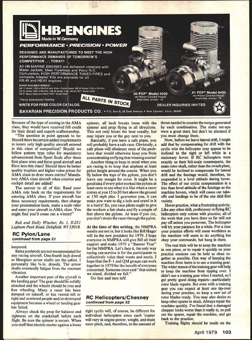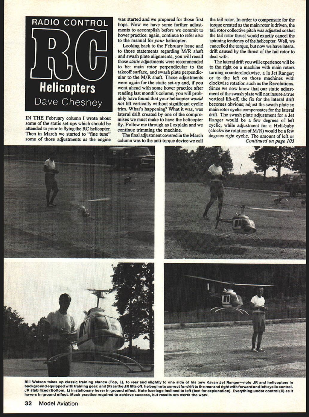 IN THE February column wrote about some static set-ups should attended prior flying RC helicopter March started fine tune some adjustments engine started prepared first hops Now have some further adjust ments accomplish before commit hover practice again continue refer also manual helicopter Looking back February issue statements regarding M/R shaft swash plate alignments will recall static adjustments recommended main rotor perpendicular takeoff surface swash plate perpendic ular MIR shaft adjustments again static set-up went ahead some hover practice after reading last months column will prob ably have found helicopter would lift vertically significant cyclic trim Whats happening What was lateral drift created compro mises must make have helicopter fly Follow through explain continue trimming machine final adjustment covered March column anti-torque device call tail rotor order compensate torque created main rotor driven tail rotor collective pitch adjusted tail rotor thrust would exactly cancel spinning tendency helicopter Well cancelled torque now have lateral drift caused thrust tail rotor deal lateral drift will experience will right machine main rotors turning counterclockwise Ia Jet Ranger left machines clockwise rotation such Revolutions Since now know static adjust ment swash plate will insure true vertical lift-off fix lateral drift becomes obvious adjust swash plate main rotor cyclic compensates lateral drift swash plate adjustment Jet Ranger would few degrees left cyclic adjustment Heli-baby clockwise rotation MIR would few degrees right cyclic amount left Continued page 103 Bill Watson takes up classic training stance Top L rear slightly side ew Kavan Jet Rangernote JR helicopters background equipped training gear R JR lifts off beginsto correct fordriftto rearand rightwith forward left cyclic controi JR stabilized Bottom L stationary hover ground effect Note fuseiage inclined left text expianation Everything under control CR hovers ground effect Much practice required achieve success results worth work 32 Model Aviation Because type scoring AMA class would have received full credit detail superb craftsmanship question point appears Should certain added requirements insure high quality aircraft entered class competition Should follow pattern type rules mandatory advancement Sport Scale after three first place wins force good aircraft fliers class Should better quality trophies higher value prizes AMA class draw entries Manda tory AMA class aircraft exterior cockpit detail added answer Read AMA rule book requirements entering AMA class aircraft has necessary requirements change presentation book make scale ruler enter aircraft AMA class might find youll come out winner Bob Dolly Wischer Rt 1 S-221 Lapham Peak Roa4 Delafleld WI 53018 RC Pylon/Lane continued page 31 keepered Balsa pushrods recommended racing aircraft One-fourth inch dowel fiberglass arrow shafts safest personally like -in dowels The- arrow shafts eventually fatigue constant vibration Another important part aircraft landing gear gear should solidly attached wheels should true free wheeling racer has dumped takeoff has veered left right scattered people and/or destroyed equipment because wheel landing gear has failed Always check prop balance tightness crankshaft before flight sure spinner secure stuff electric starter against loose spinner heck breaks loose spinner prop flying directions blows heat usually may injure guy next Basically have safe plane will probably have safe race Obviously safe plane will eliminate prob lems would otherwise keep concentrating flying winning course Another thing keep mind racing keep airplane least pylon height around course fly below tops pylons dont leave margin error might good idea pilot worked pylons least once see what like racer comes 15 20 feet above ground 150 mph plus guarantee can make want dig hole crawl hurry So race pilots ought give workers fair shake fly couple feet above pylons least cut dont strain racer through pylon time writing NMPRA results looks like Bill Hager will new president 1979 hope everyone NMPRA will give Bill support make 1979 Banner Year NMPRA Lets face way racing can survive participants collectively voice wants needs hope F- 1 QM groups can work together 1979 benefit everyone concerned Someone once said united stand divided fall Go fast turn left RC Helicopters/Chesney continued page 32 right cyclic will course different individual helicopters since copter will vary engine power weight main rotor pitch therefore amount thrust needed counter torque generated combination static set-ups great start dont alarmed must change Now before leave lateral drift might add compensating drift cyclic trim helicopter may appear inclined right left stationary hover RC helicopters exactly full-scale counterparts main rotor shaft rather swash plate would inclined compensate lateral drift fuselage would therefore suspended level attitude during hover effect cyclic compensation less level attitude fuselage machine hovers will cause take offs landings skid first variety Hover practice what frustrating activity Like other skill proficiency flying RC helicopters comes practice work have done far will pay off unless persevere helicopter will try patience time practice efforts will seem worthless machine will seem anything obey commands hang real trick will keep machine piece repair quickly practice sessions can held close gether possible way keeping machine harm use training gear wider stance training gear will help keep machine tipping over didnt use training gear started got pretty good doing repairsparticularly rotor blade repairs training gear can expect least tip-over during practice keep new set rotor blades ready may also desire keep other spares stock Always repair machine quickly Ive found damaged chopper looks worse really pull out spares repair machine get back practice Training flights should made April 1979 103 1 n poly T-shirt NGS M AMA $650 50$ Postage 