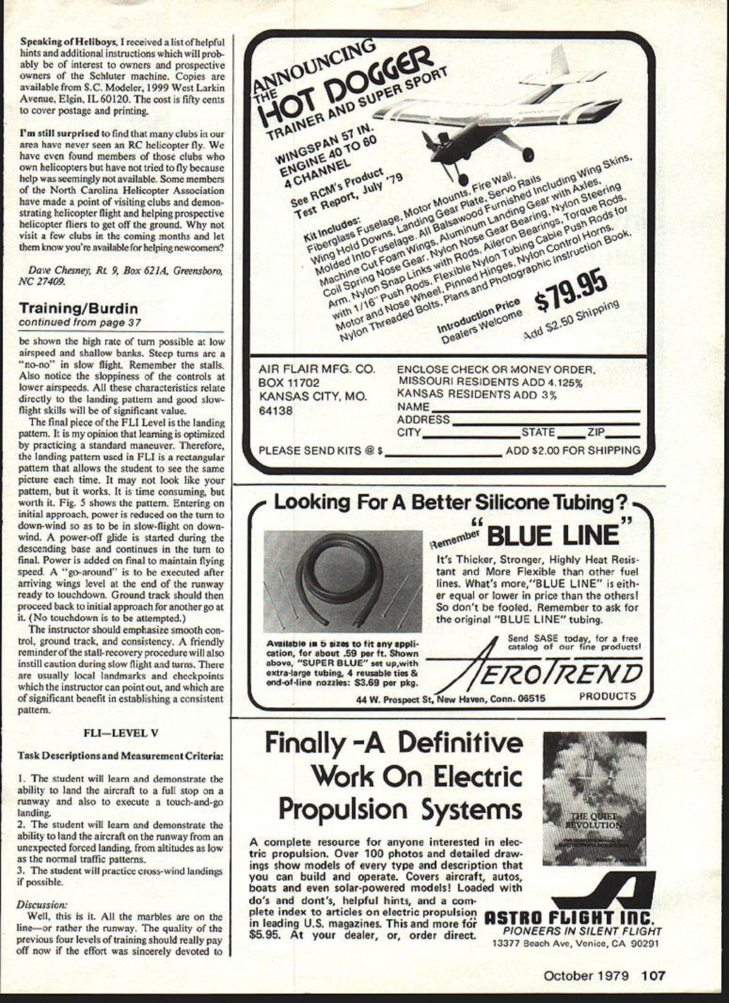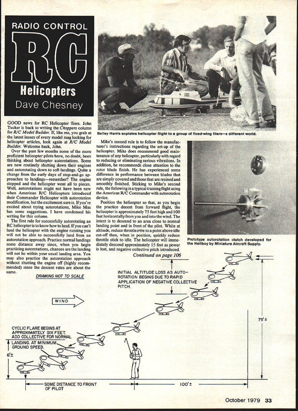 GOOD news RC Helicopter fliers John Tucker back writing Choppers column RIC Model Builder like grab latest issues model mag looking helicopter articles look again A/C Model Builder Welcome back John Over past few months some proficient helicopter pilots have no doubt thinking about helicopter autorotations Some now routinely shutting down engines autorotating down soft landings Quite change early days stop-and-go ap proaches landingsremember engine stopped helicopter went pieces Well autorotations might have new American RC Helicopters introduced Commander Helicopter autorotation modification excitement sure youre excited about trying autorotations Mike Mas has some suggestions have condensed writing column first rule successfully autorotating RC helicopter know land cant land helicopter engine running will able successfully land autorotation approach Practice normal landings some distance away since begin practicing autorotations chances landing will within usual landing area may also practice autorotation approach shutting engine off highly recom mended since descent rates about same Mikes second rule follow manufac turers instructions regarding set-up helicopter Mike does recommend good main tenance helicopter particularly regard reducing eliminating serious vibrations addition recommends close attention rotor blade finish has experienced some difference performance between blades simply covered resined smoothly finished Sticking Mikes second rule following typical training flight using American R/C Commander autorotation device Position helicopter begin practice decent forward flight helicopter approximately 75 feet high 100 feet horizontally wind intent descend area close normal landing point front pilot altitude reduce throttle trim point above idle cut-off position quickiy reduce throttle stick idle helicopter will imme diately descend approximately 15 feet pbwer lost negative collective pitch introduced Continued page 106 INITIAL ALTITUDE LOSS AS AUTO DRA WING NOT TO SCALEROTATION BEGINS DUE TO RAPID APPLICATION OF NEGATIVE COLLECTIVE PITCH 75 CYCLIC FLARE BEGINS AT APPROXIMATELY SIX FEET ADD COLLECTIVE FOR NORMAL LANDING AT MINIMUM GROUND SPEED SOME DISTANCE TO FRONTII 4100 OF PILOT October1979 33 Bailey Harris explains helicopter flight group fixed-wIng fliersa different world Prototype autorotation clutch developed Heliboy Miniature Aircraft Supply troductory Price $8995 S 0 .I6606 S 6SS00 0 Expanded Scale Voltmeter checks bat-U Fuel PumpControl Switch spring-load tery condition both Tx Rx ill side avoid spills urn no Gb-Driver adjustable plug vol- uded tages Automatically compensates forU Starter 12 volt supply elec starter fouled plug Checks plug condition 1000 times per second Operates 12 volt battery source included Field Charger Both Tx Rx either quick-charge trickle modesU Completely Inclosed Can mounted Automatic cut-off protects Ni-Cads ht box used separately Completely Solid State Throughout d SASE Free Catalogl 0 FLASH STARTING ANEW ERA PUBLICATION UNEXCELLED POWERAROBATIC AIRPLANG 0 LOWEST DRAIN49 PAGES 8 XII HOTOS LONGER LIFEBY ROST C MORRISON IS DETAILED DRAWINGS GLOW PLUGS ff ofly $395 PLUS qyCATALOGS SIO0REPLA-TECH 2INTERNATIOPIAL INC SWANSON ASSOCIATES WiL43500 MC KENZIE HWY PT 0X 191WONON VIDA OREGON 97489 69 0UTE 29PEOUANNOCX N W ILlS linders must turn around put pushrods back would equal size h-scale Warner cylinders existed What lift tip sugges tions make 7 diameter wheels 1 dia tires So what cooks have bare-bones fuselage weighs 5 poundswe threw away weight nose form ply because ballast will needed anyway achieve CG located 25% chord SHANGRI LA 45-mile haul casualty gas shortage have flying sites com ing out ears lightly loaded crates fly So lovely greensward much nearer high schoola nice big open field neighbors have annoyed noisewe repaired veritable Lafay ette Escadrilie schoolyard-scale types lo behold appeared group Executive Council types including pres Earl Witt exec John Worth bloody orbiting Buzzard Bombshell Srull de lighted impressive flights rubber pro file Japanese Shindena canard fighter put up Aristocrat Albon Dart Diesel Talk about silent flight Ned Kragness about hundred other things didnt tell about MA story some months ago sistership mechanical trim stabilizer numerous full-scale goodies alas balky Cox seen better days Hurst Bowers put up still another Cox running rich bubbledon Dreamy Luton Minor another bubbly Cox Ace pulse rudder thing will take off smooth ground like Peanut gym hand-launched Talk about slow flight scale-like speeds As circled twi light above line fairly distant trees evoked spirit Old Warden way fly whispered Tongue hanging out replied intelligently Yeah yeah Buzzard got sky high big low-wing cruised high Council types watched knowingly said nothing Wonder what thought strange slow motion fly-in strange schoolyard Northern Virginia peaceful VPs watched building little Aristocrat Said forgotten what flying could like everyone relaxed enjoying himself flying whenever wished Hes dedicated competitorwho also wants get back things way doesnt have give up thing can add considerable pleasure hobby fun things just taking RC Scale/Wischers continued page 31 club field attached local flight strip members brought full size Varga Kachina Shinn 21 50A strip examined plane possible scale project mentioned its tiny tail surfaces being liability because nose wheel could lifted take-off rotation until considerable speed built up What appeared first thought detrimental actually desirable feature since plane must have flying speed before lift off chances snap roll takeoff landing less have similar experiences some scale models have small tail surfaces deHavilland racer mentioned earlier exam ple Old time modelers seeing its tiny tail feathers cast doubt its stability has proven case however models handling near stall has exemplary pitch stability problems have occured other models result overly sensitive elevators greater travel necess