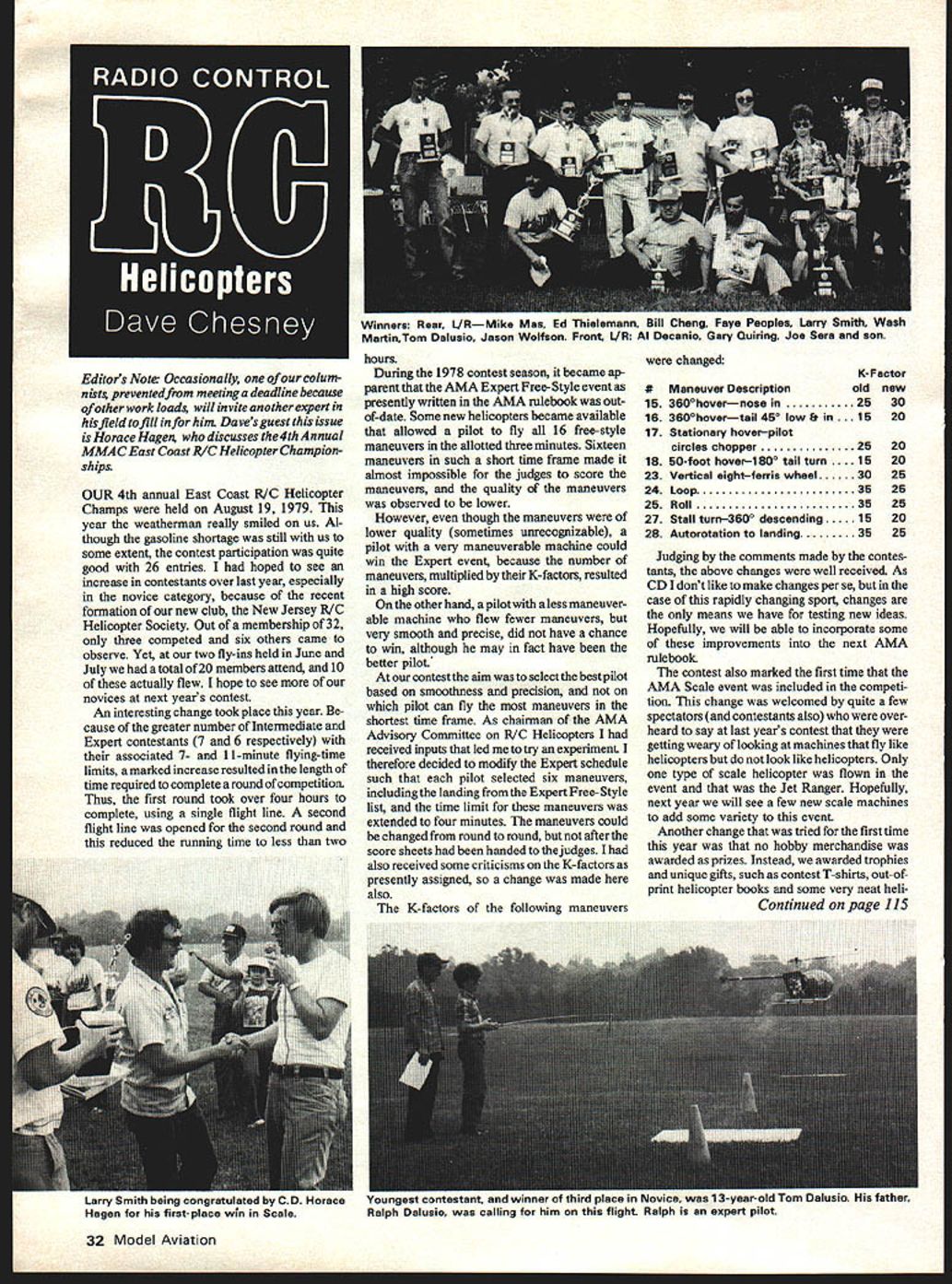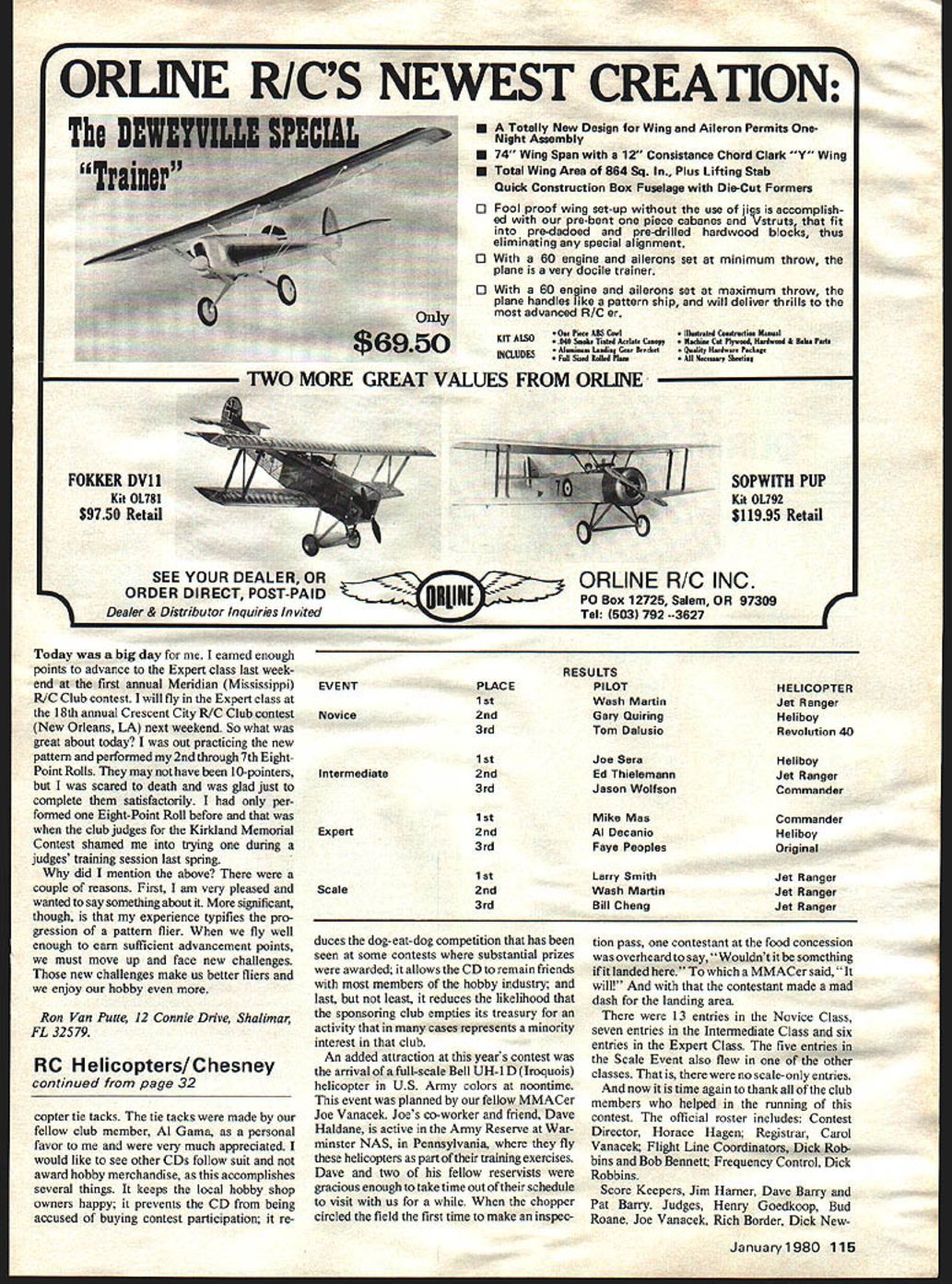 OUR 4th annual East Coast R/C Helicopter Champs held August 19 1979 year weatherman really smiled us Al though gasoline shortage still us some extent contest participation quite good 26 entries hoped see increase contestants over last year especially novice category because recent formation new club New Jersey KC Helicopter Society Out membership 32 three competed six others came observe Yet two fly-ins held June July total 20 members attend 10 actually flew hope see novices next years contest An interesting change took place year cause greater number Intermediate Expert contestants 7 6 respectively associated 7- 1 1-minute flying-time limits marked increase resulted length time required complete round competition Thus first round took over four hours complete using single flight line second flight line opened second round reduced running time less two hours During 1978 contest season became ap parent AMA Expert Free-Style event presently written AMA rulebook outof-date Some new helicopters became available allowed pilot fly 16 freestyle maneuvers allotted three minutes Sixteen maneuvers such short time frame made almost impossible judges score maneuvers quality maneuvers observed lower However though maneuvers lower quality sometimes unrecognizable pilot very maneuverable machine could win Expert event because number maneuvers multiplied K-factors resulted high score other hand pilot less maneuver able machine flew fewer maneuvers very smooth precise did have chance win although may fact have better pilot contest aim select best pilot based smoothness precision pilot can fly maneuvers shortest time frame As chairman AMA Advisory Committee R/C Helicopters received inputs led try experiment therefore decided modify Expert schedule such pilot selected six maneuvers including landing fromthe ExpertFree-Style list time limit maneuvers extended four minutes maneuvers could changed round round after score sheets handed judges also received some criticisms K-factors presently assigned change made also K-factors following maneuvers K-Factor #Maneuver Descriptionoldnew 153600hovernose in2530 163e00hovertail 450 lowfr 1520 17Stationary hoverpilot circles chopper2520 1850-foot hoveri 800 tail turn 1520 23Vertical eightferris wheel3025 24Loop3525 25Roll3525 27Stall turn3600 descending1520 28Autorotation landing3525 Judging comments made contes tants above changes well received As CDI dont like make changes per se case rapidly changing sport changes means have testing new ideas Hopefully will able incorporate some improvements next AMA rulebook contest also marked first time AMA Scale event included competi tion change welcomed quite few spectators contestants also over heard say last years contest getting weary looking machines fly like helicopters look like helicopters Only type scale helicopter flown event Jet Ranger Hopefully next year will see few new scale machines add some variety event Another change tried first time year no hobby merchandise awarded prizes Instead awarded trophies unique gifts such contest T-shirts out-ofprint helicopter books some very neat heli Continued page 115 32 Model Aviation Editors Note Occasionally colum nists preventedfmm meeting deadline because other work loads will invite anot expert hisfieldtofihl inforhim Daves guest issue Horace Hagen discusses 4th Annual MMACEast Coast RIC Helicopter Cha mpion ships Winners Rear L/RMike Mas Ed Thialemann Bill Cheng Faye Peoples Larry Smith Wash MartinTom Daluslo Jason Wolfson Front LIR Al Decanio Gary Quiring Joe Sara son changed Larry ci,tri uuiiy UUfyrCtUICtUU uiy t. LI morace Hagen first-place win Scale nt winner third place Novice year-c.. Ralph Dalusio calling him flight Ralph expert pilot ORLINE RICS NEWEST CREATIONI FOKKER DV11 Kit 0L781 $9750 Retail SEE YOUR DEALER OR ORDER DIRECT POST-PAID Dealer & Distributor Inquiries Invited Totally New Design Wing Aileron Permits OneNight Assembly 74 Wing Span 12 Consistance Chord Clark Y Wing Total Wing Area 864 Sq Plus Lifting Stab Quick Construction Box Fuselage Die-Cut Formers o Foolproof wing set-up use jigs accomplish ed pre-bent piece cabanes Vstruts fit pre-dadoed pre-drilled hardwood blocks thus eliminating special alignment o With 60 engine ailerons set minimum throw plane very docile trainer o With 60 engine ailerons set maximum throw plane handles like pattern ship will deliver thrills advanced R/C er - Illeefreted Ceededee MeeeI - Uehiee Cet PI.ed I1Aeed & 11. Pet - Qee5t5 114,, Peeqe ll,eee, 51Ileg SOPWITH PUP Kit 0L792 $11995 Retail ORLINE RIC INC P0 Box 12725 Salem OR 97309 Tel 503 792 --3627 Today big day earned enough points advance Expert class last week end first annual Meridian Mississippi K/C Club contest will fly Expert class 18th annual Crescent City K/C Club contest New Orleans LA next weekend So what great about today out practicing new pattern performed 2nd through 7th EightPoint Rolls may have 10-pointers scared death glad just complete satisfactorily per formed Eight-Point Roll before club judges Kirkland Memorial Contest shamed trying during judges training session last spring did mention above couple reasons First am very pleased wanted say something about significant though experience typifies pro gression pattern flier fly well enough earn sufficient advancement points must move up face new challenges new challenges make us better fliers enjoy hobby Ron Van Putte 12 Connie Drive Shalimar FL 32579 RC Helicopters/Chesney continued page 32 copter tie tacks tie tacks made fellow club member Al Gama personal favor very much appreciated would like see other CDs follow suit award hobby merchandise accomplishes several things keeps local hobby shop owners happy prevents CD being accused buying contest participation re EVENT PLACE 1 2nd 3rd Novice Intermediate Expert Scale RESULTS 1st 2nd 3rd 1 2nd 3rd 1 St 2nd 3rd duces dog-eat-dog competition has seen some contests substantial prizes awarded allows CD remain friends members hobby industry last least re