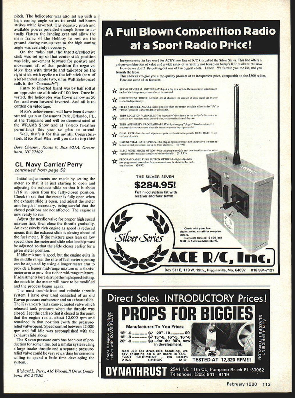 I GUESS things didnt go wrong occasional ly wed get bored stiff Maybe thats enjoyment flying radio-control aircraftNo things go wrong have taken time correct errors rewarded improvement set backs opportunities opportunity continue practicing toward flight perfection learn about workings machinery experiment new im proved pment fun must searching improvements arriving perfection Anyway thats rational ism has gotten through some major rebuilding projects course sometimes seems heli copter winner Im destined loser Take instance recent series crashes very hard landings practicing auto-rotations score three three helicopters favor machine got new parts got experience What fun really takes optimist persevering soul stick RC helicopters Since popularity helicopters rela tively low compared other RC activities definite lack information avail able newcomers Certainly help usually available flying fields ginning fixed wing RC fliers often avail able beginning helicopter flier RC clubs have helicopter filer available newcomer Can popularity RC helicopters grows reliable off-the-shelf equip ment available still pioneers activity Perhaps challenge optimist mastering difficulty flying heli copters Perhaps real challenge share experiences pioneer introduc tion helicopters club sur rounding clubs new product soon available Miniature Aircraft Supply Orlando FL will ease some problems getting word out beginners segregat ed helicopter flying activities cas sette recording explaining set-up Hellboy helicopters should available about time read column tape will about hour half long explana tions will given laymans terms Again tape will deal specifically Hellboy explanations would probably apply RC copters second tape works deals flight training should available shortly after release set-up tape cas settes will probably sell around seven ten dollars Miniature Aircraft Supply may charging tapes also offer service no-charge should terest clubs whether active RC heli copters Walt currently offering heli copter seminars groups southeast expects expand geography Interested clubs should contact Walt Schoon ard Miniature Aircraft Supply 2563 Diver sified Way Orlando FL 32804 few months ago mentioned availabil ity several radios designed helicop ter flier options unique helicopter radios electronic tall-rotor mixer device intended automatical ly compensate torque changes heli copter collective/throttle stick moved simultaneously applying some tall-rotor control hoped have radios tall-rotor mix device installed now due circumstances have able obtain either have received several letters re questing information about electronic tall-rotor mixers promise com plete article later Meanwhile interContinued page 112 34 Model Aviation Tail-rotor mix Dr WR Hartness Heliboy provided electronically via Variant radionote absence mechanical tail-rotor mixer See text about electronic mixers .ouvu utflur ured few iuiu,u . . umn left Bob Hadens version ol .u Hal ibaby seen last years WRAMS show perhaps compare flying techniques flying machines move task along both speed distance Ray specified course procedures would launch turn downwind fly past base immediately enter course Same rules everybody Again fliers knew what extra four minutes working time could played LOFT game few exceptions launching just soon Ray cracked whip Allowances made time launch last minute adjustment like Stan Watson realized section MonoKote size small awning hanging loose acre half Pegasus wing kind old CD turned saintly head Stan company did quick tape job wing launched 14-foot behemoth 14-foot monster F3 B contest say Sure Remember event give get exposure duration three planes launched timewhenever possible duration task flown just like other duration event have ever flown except F3 B times F3 B measurements Some other rules LOFT sidestepped order streamline event no limit number helpers fly plane including someone elses yours brokeand di4 launch either side speed course provided flew course side Contestants also allowed pitch timing chores end result contest over 20 people fly six rounds finished just after lunch Sunday Probably interesting sidelight BROWN CO-2 ENGINES ENGINES ARE N STOCK NEW CHARGER COMPLETE CATALOG $100 AND S SIZES OF TANKS BROWN ENGINES HARD TO FIND ACCDSSOBIER KITS AND PLANS FOR RUBBER POWDRED MODELS PHONE 714 469-8675 Peck-Polymers W BOX 2498-AMLA MESA CALIF 92041 event fact contestants came 11 states Connecticut Delaware Colorado California included However nomads baited some degree Sagitta new ship Lee Renaud parts nine being clamored after LSF Tourna ment nine doled outnot make friends enemies stipulation built entered L 0 F T s F3 B contest Dwight Holley Connecticut thought worth did Keith Finkenbiner/Delaware Renauds Don Edberg came California Skip Miller came Colorado about month build test-fly ships test flying unfortunately last minute affair couple fliers Also Im sure contest itself didnt have Sitars sitting wireless night waiting results rules method running contest proved type can successful paperwork outweigh ing sailplanes Best official speed time 124 Tim Renaud Best unofficial times after flying Saturday 106 104 Skip Miller further attempt destroyed ship Final results Ray Hayes first Osprey 990 Bird Time wings Warren Tiahrt Michigan Sagitta second first F3 B contest Third best looking ship Tim Renaud fourth after taking zero crossing centerline first speed task Miller Sagitta Aquila Grande weekend well spent alL So club looking some thing other straight duration task look FAI section AMA rule book Weed Out stuff think would give club CD gray hair fly basic tasks Try club level once get flavor F3B betcha youll ask outsiders come next Dan Pruss Rtz 2 Box 490 Plainflel4 IL 60544 SAFE FLVING IS NO ACCIDENT RC Helicopters/Chesney continued page 34 ested Ill explain some advantages Most collective-pitch helicopters some fixed-pitch helicopters have includ ed design mechanical tail-rotor mix device mechanical devices can adjust e