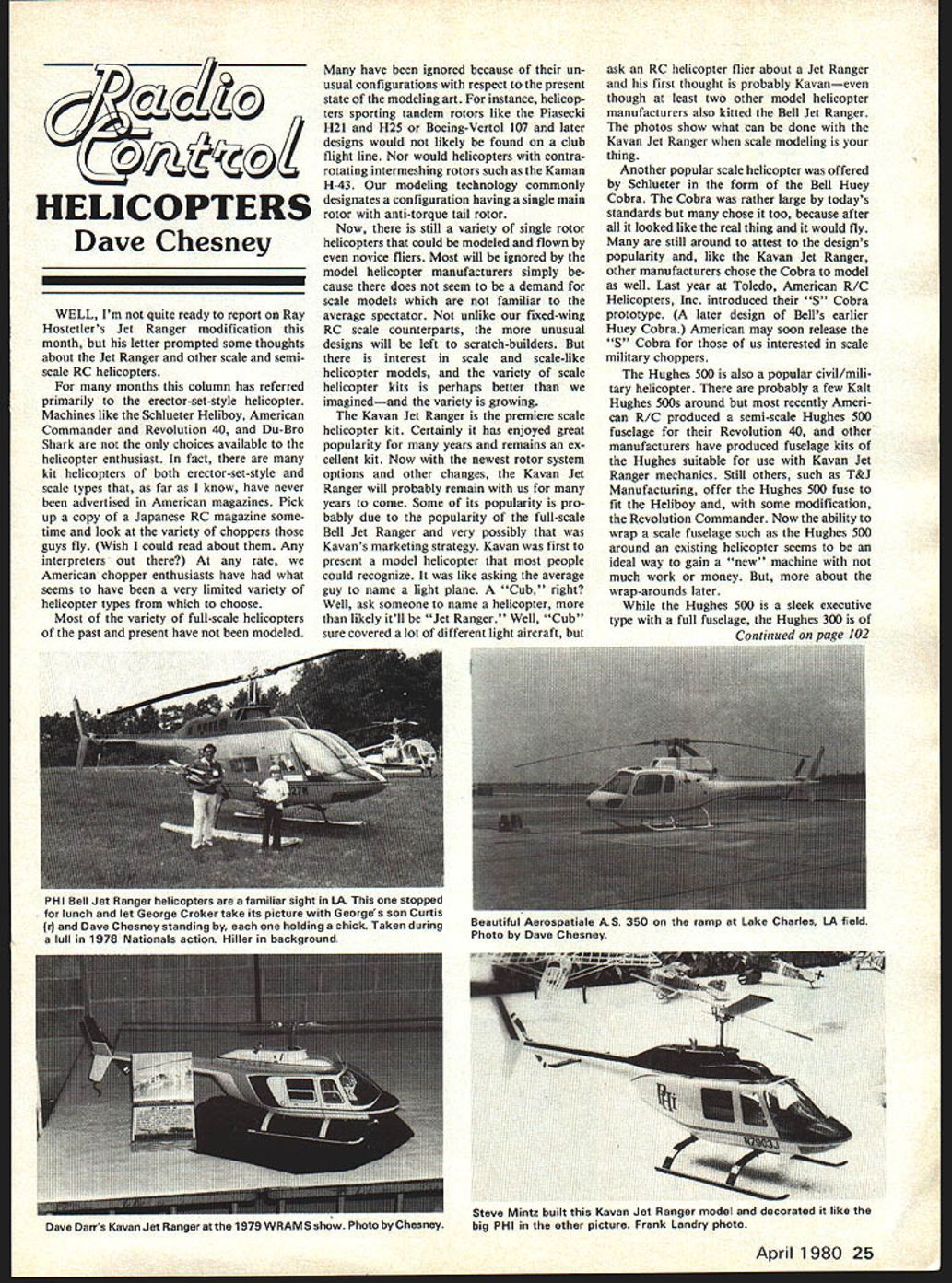 HELICOPTERS Dave Chesney WELL Im quite ready report Ray Hostetlers Jet Ranger modification month letter prompted some thoughts about Jet Ranger other scale semiscale RC helicopters months column has referred primarily erector-set-style helicopter Machines like Schlueter Heliboy American Commander Revolution 40 Du-Bro Shark choices available helicopter enthusiast fact kit helicopters both erector-set-style scale types far know have never advertised American magazines Pick up copy Japanese RC magazine some time look variety choppers guys fly Wish could read about Any interpreters Out rate American chopper enthusiasts have what seems have very limited variety helicopter types choose Most variety full-scale helicopters past present have modeled have ignored because un usual configurations respect present state modeling art instance helicop ters sporting tandem rotors like Piasecki H21 H25 Bocing-Vertol 107 later designs would likely found club flight line Nor would helicopters contrarotating intermeshing rotors such Kaman H-43 Our modeling technology commonly designates configuration having single main rotor anti-torque tall rotor Now still variety single rotor helicopters could modeled flown novice fliers Most will ignored model helicopter manufacturers simply cause does seem demand scale models familiar average spectator unlike fixed-wing RC scale counterparts unusual designs will left scratch-builders interest scale scale-like helicopter models variety scale helicopter kits perhaps better imaginedand variety growing Kavan Jet Ranger premiere scale helicopter kit Certainly has enjoyed great popularity years remains ex cellent kit Now newest rotor system options other changes Kavan Jet Ranger will probably remain us years come Some its popularity pro bably due popularity full-scale Bell Jet Ranger very possibly Kavans marketing strategy Kavan first present model helicopter people could recognize like asking average guy name light plane Cub right Well ask someone name helicopter likely itll Jet Ranger Well Cub sure covered lot different light aircraft ask RC helicopter flier about Jet Ranger first thought probably Kavaneven though least two other model helicopter manufacturers also kitted Bell Jet Ranger photos show what can done Kavan Jet Ranger scale modeling thing Another popular scale helicopter offered Schlueter form Bell Huey Cobra Cobra rather large todays standards chose too because after looked like real thing would fly still around attest designs popularity like Kavan Jet Ranger other manufacturers chose Cobra model well Last year Toledo American R/C Helicopters Inc introduced S Cobra prototype later design Bells earlier Huey Cobra American may soon release 5 Cobra us interested scale military choppers Hughes 500 also popular civil/mili tary helicopter probably few Kalt Hughes 500s around recently Ameri can R/C produced semi-scale Hughes 500 fuselage Revolution 40 other manufacturers have produced fuselage kits Hughes suitable use Kavan Jet Ranger mechanics Still others such T&J Manufacturing offer Hughes 500 fuse fit Heliboy some modification Revolution Commander Now ability wrap scale fuselage such Hughes 500 around existing helicopter seems ideal way gain new machine much work money about wrap-arounds later Hughes 500 sleek executive type full fuselage Hughes 300 n00p 102 April 1980 25 PHI Bell Jet Ranger helicopters familiar sight LA stopped lunch let George Croker take its picture Georges son Curtis r Dave Chesney standing holding chick Taken during lull 1978 Nationals action Hiller background Beautiful Aerospatiale AS 350 ramp Lake Charles LA field Photo Dave Chesney Dave Darrs Kavan Jet Ranger 17 WHAMS snow Photo Chesney Steve Mintz built Kavan Jet Ranger model decorated like big PHI other picture Frank Landry photo ZIF]IhMU EASY 90 NEW HIGH-WING SPORT 90 1/5 Scale 80 Wingspan Flying Weight 101a lbs Fast Building no die-cut parts 15 hrs Inc custom Alum landing Gear$12995 AEROBATIC AIRPLANESprior bending sharply like wing leading BY ROBT C MORRISONIedges Water gave marginally successful results 19 SUPERB ORAWINGSThen day someone suggested use S3 95 P usammon soak balsa Anyone has aoa POS 111111. ~.=used ammonia knows gives fantastic cA OGSRGPLA-1ECHresults never knew However $ 004SO MC k52 .w Leb gh Valley PlC Newsletter edited Tom B Ihe mer short article bending balsa wood went follows bend balsa wood soak ammonia water aqua-ammonia best 15 longer 45 minutes What happens within balsa wood structure orderly assembly arrangement microscopic elongated hollow cellulose tubes held together natural adhesive called lignin temporarily d storted ammonia solution applied balsa wood bent new shape solution water ammonia evapo rates lignin returns its original strength So now know ammonia works About time next column comes out will getting ready fly again after winters hibernation So column will feature suggestions get airplane engine/radio/pilot combination started right foot GET ORGANIZED Hee S set 01 4 stardy tiles holds over 4 years yoa taaolte 5 11 magazInes 4 MAG FILES $495 send $495 pIns $100 postage handling DON INDUSTRIES PO Box 388-K DOVER NH 03820 displacement rating engine intentional some load factor ranges overlap since know hot 35 can swing prop sick 40 After load factor has selected calculations load factors several combinations prop diameter pitch should made determine closest match After initial selection props slight higher lower load factors should tried see satisfies requirements air plane/engine/pilot combination example speed desired prop higher load factor should tried Conversely better low speed thrust will generally obtained using prop lower load factor Unfortunately load factor chart wont tell whether would have better luck manufacturers prop anothers However easy determine everything no would expert Give chart try next time beginner asks what prop put first airplane might think about way go get better vertical performance latest airplane too long time used wa