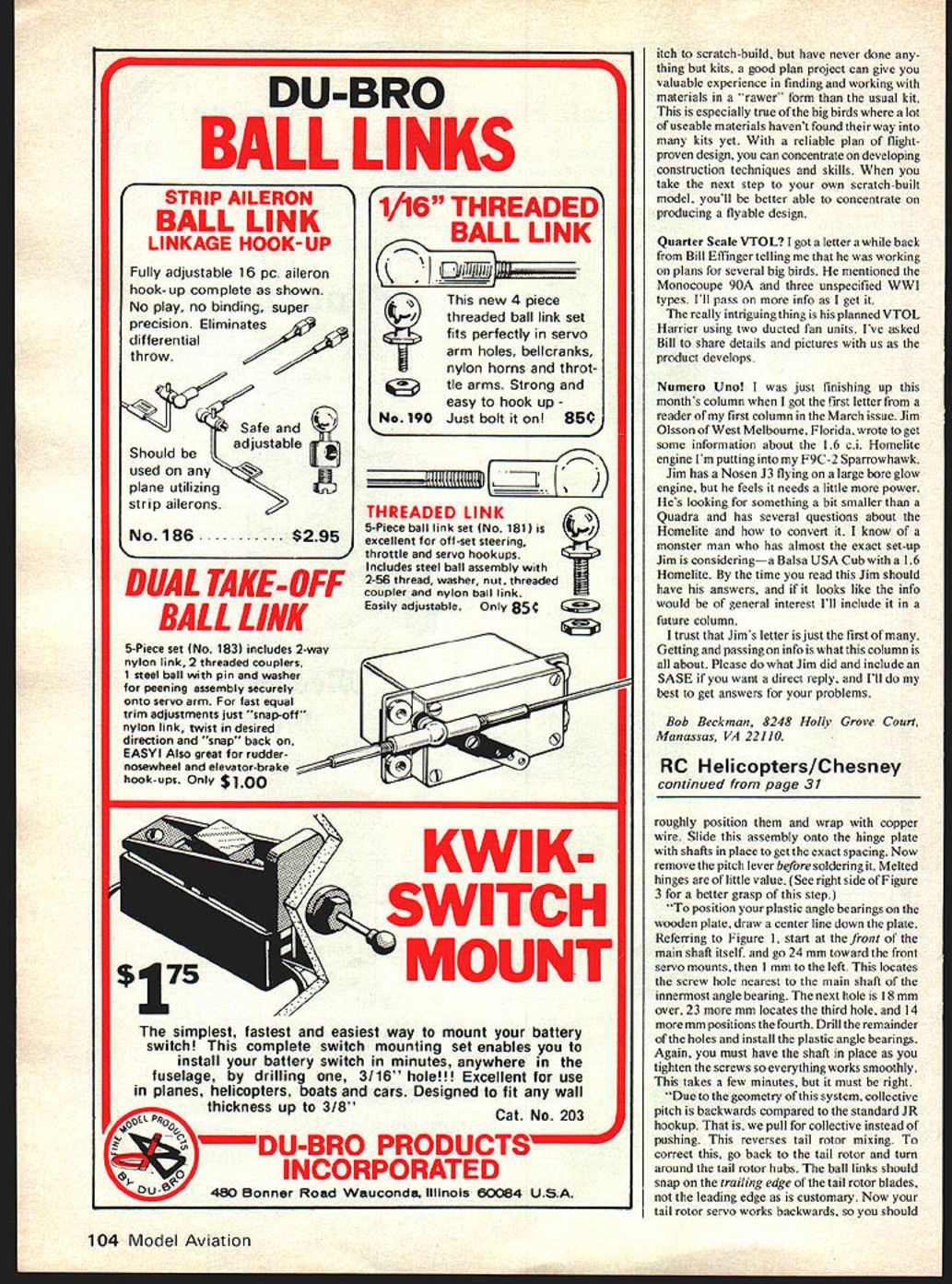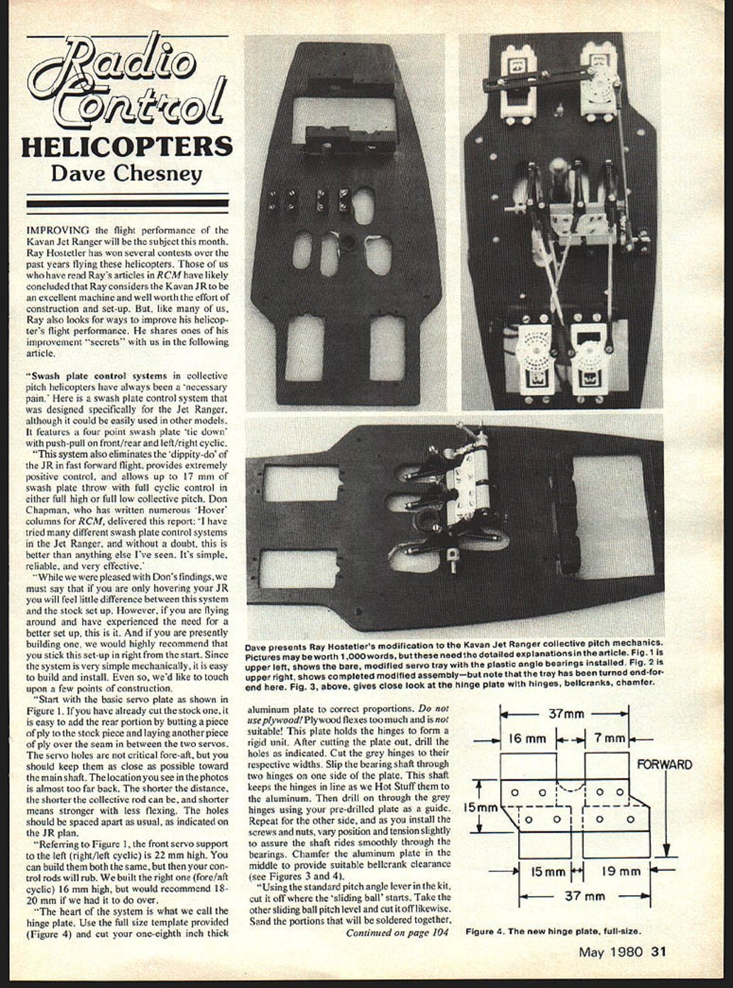 HELICOPTERS Dave Chesney IMPROVING flight performance Kavan Jet Ranger will subject month Ray Hostetler has won several contests over past years flying helicopters us have read Rays articles inRCM have likely concluded Ray considers Kavan JR excellent machine well worth effort construction set-up like us Ray also looks ways improve helicop ters flight performance shares ones improvement secrets us following article Swash plate control systems collective pitch helicopters have always necessary pain swash plate control system designed specifically Jet Ranger although could easily used other models features four point swash plate tie down push-pull front/rear left/right cyclic system also eliminates dippity-do JR fast forward flight provides extremely positive control allows up 17 mm swash plate throw full cyclic control either full high full low collective pitch Don Chapman has written numerous Hover columns RCM delivered report have tried different swash plate control systems Jet Ranger doubt better anything else Ive seen Its simple reliable very effective pleased Dons findings must say hovering JR will feel little difference between system stock set up However flying around have experienced need better set up presently building would highly recommend stick set-up right start Since system very simple mechanically easy build install wed like touch upon few points construction Start basic servo plate shown Figure 1 already cut stock easy add rear portion butting piece ply stock piece laying another piece ply over seam between two servos servo holes critical fore-aft should keep close possible toward main shaft location see photos almost too far back shorter distance shorter collective rod can shorter means stronger less flexing holes should spaced apart usual indicated JR plan Referring Figure 1 front servo support left right/left cyclic 22 mm high can build both same con trol rods will rub built right fore/aft cyclic 16 mm high would recommend 1820 mm over heart system what call hinge plate Use full size template provided Figure 4 cut one-eighth inch thick aluminum plate correct proportions use plywood Plywood flexes too much suitable plate holds hinges form rigid unit After cutting plate out drill holes indicated Cut grey hinges respective widths Slip hearing shaft through two hinges side plate shaft keeps hinges line Hot Stuff aluminum drill through grey hinges using pre-drilled plate guide Repeat other side install screws nuts vary position tension slightly assure shaft rides smoothly through bearings Chamfer aluminum plate middle provide suitable bellcrank clearance see Figures 3 4 Using standard pitch angle lever kit cut off sliding ball starts Take other slidingball pitch level cut itoff likewise Sand portions will soldered together Continued page 104 37mm 16mm F--I 7mm FORWARD 0% 15mm r L1 L ,o oo 0 i5mmH 19mm 37mm Figure 4 new hinge plate fullsize May 1980 31 Dave presents Ray Hostetlers moagilcatlon ravan Jel nrnr Pictures may worth 1 OOOwords butthese need detailed explanations thearticle Fig 1 upper left shows bare modified servo tray plastic angle bearings installed Fig 2 upper right shows completed modified assemblybut note tray has turned endfor end Fig 3 above gives close look hinge plate hinges bellcranks chamfer STRIP AILERON BALL LINK LINKAGE HOOK-UP Fully adjustable 1 6 Pc aileron hook-up complete shown No play no binding super precision Eliminates differential throw Safe Should beadjustable used plane utilizing strip ailerons No186$295 THREADED LINK 5-Piece ball link set No181 excellent off-set steering throttle servo hookups Includes steel ball assembly 2-56 thread washer nut threaded coupler nylon bail link Easily adjustable Only 85C SWITCH T DUAL TAKE-OFF BALL LINK 5-Piece set No 183 includes 2-way nylon link 2 threaded couplers 1 steel ball pin washer peening assembly securely Onto servo arm fast equal trim adjustments just snap-off nylon link twist desired direction snap back EASY Also great rudder nosewheel elevator-brake hook-ups Only lest fastest easiest way mount battery switch complete switch mounting set enables install battery switch minutes anywhere fuselage drilling 3/16 hole! Excellent use planes helicopters boats cars Designed fit wall thickness up 3/8 Cat No 203 DUBRO PRODUCTS RPORATED 480 Bonner Road Wauconda Illinois 60084 USA itch scratch-build have never done thing kits good plan project can give valuable experience finding working materials rawer form usual kit especially true big birds lot useable materials havent found way kits yet reliable plan flightproven design can concentrate developing construction techniques skills take next step own scratch-built model youll better able concentrate producing flyable design Quarter Scale VTOL got letter back Bill Effinger telling working plans several big birds mentioned Monocoupe 90A three unspecified WWI types Ill pass info get really intriguing thing planned VIOL Harrier using two ducted fan units Ive asked Bill share details pictures us product develops Numero Uno just finishing up months column got first letter reader first column March issue Jim Olsson West Melbourne Florida wrote get some information about 16 ci Homelite engine Im putting F9C-2 Sparrowhawk Jim has Nosen J3 flying large bore glow engine feels needs little power Hes looking something bit smaller Quadra has several questions about Homelite convert know monster man has almost exact set-up Jim consideringa Balsa USA Cub 16 Homelite time read Jim should have answers looks like info would general interest Ill include future column trust Jims letter just first Getting passing info what column about Please what Jim did include SASE want direct reply Ill best get answers problems Bob Beckman 8248 Holly Grove Court Manassas VA 22110 RC Helicopters/Chesney continued page 37 roughly position wrap copper wire Slide assembly onto hinge plate shafts place get exact spacing Now remove pitch lever before soldering Melted hinges little value See right