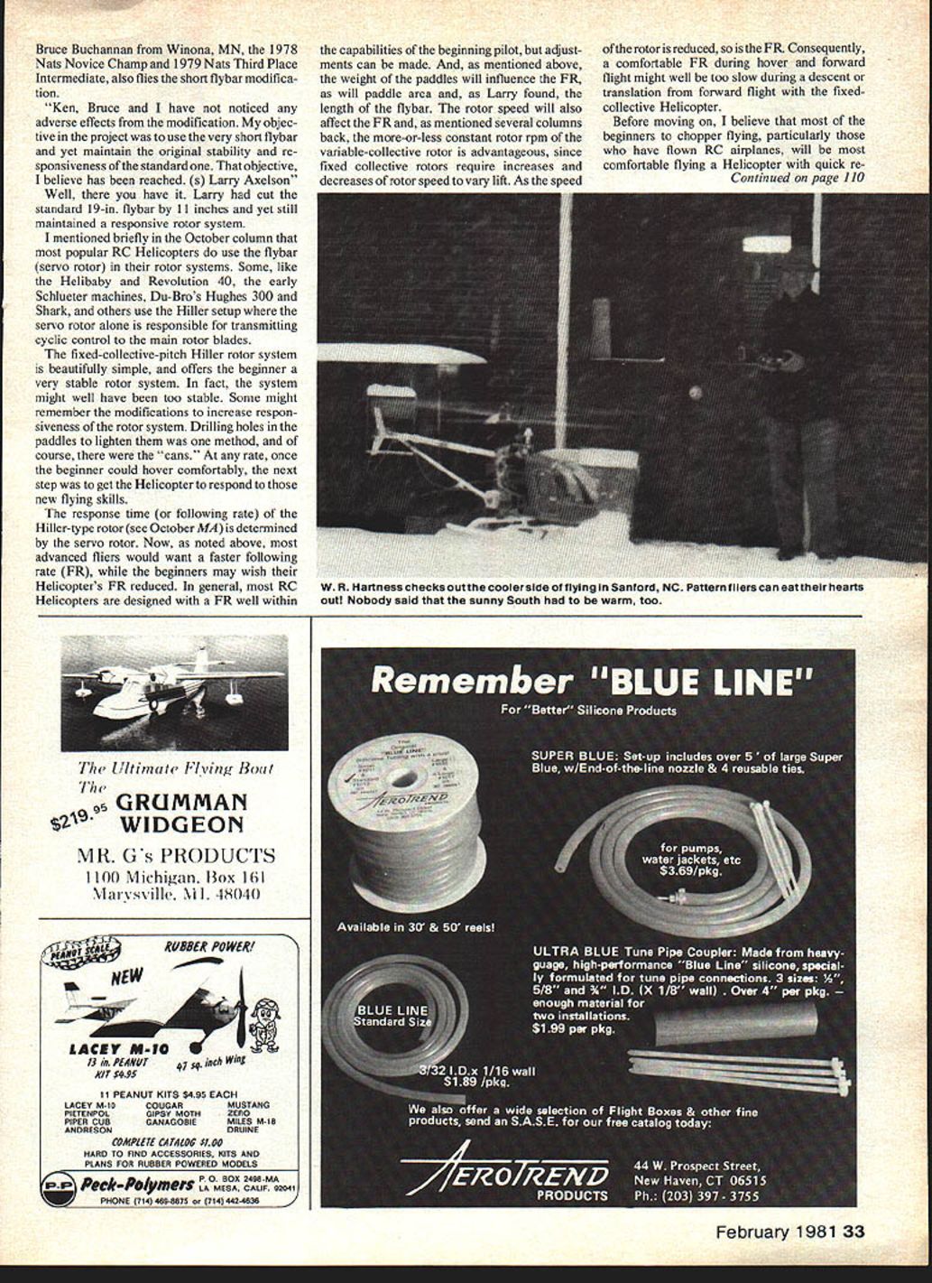 HELICOPTERS Dave Chesney THANKS Ken Kiel others have helped bail Out past few months time flying model Helicopters has replaced time flying via Delta Airlines rented Grumman AA5B company work has added few new branches time home has premium must apologize being responsive letters Ive received over past few months again business travel will have excuse Im recovering slowly time read column letters will have answered letter Larry Axelson leads subject intended cover next noticed shortened control rotor Ken Kiels Heliboy picture last months column mod developed Larry primarily make machine easier transport original longer flybar got way Larry pleased results flying machine flybarless letter notes should sufficient equally success ful modification Heliboy Larrys letter notes follow Dear Dave Thought might interested modificaiton short flybar Heliboy Im sending little write-up along some pictures welcome use form see fit column think other pilots would interested reason pictures cannot used call drop line Ill get some can used read column month find very interesting helpful Keep up good work Sincerely Larry M Axelson Rt 5 Box 364 Sparta WI 54656 608 269-2232 following Larrys notes Heliboy pilots have always wanted shorter flybar afraid try may what have looking forbut have advanced point using mixing arms responsive lead cutting flybar eight inches rethreading cut end standard 10-32 die will have completed hardest part moditication Now necessary reverse mixing arms see photos rotor head pushrods swash plate connect short side mixer pushrods flybar long side mixer test-hovered Heliboy before revers ing mixer linkage found response slow mushy shortened flybar reversal mixer linkage brought back needed responsiveness collective throw desired Reversal linkage reduces collective range DR C simply relocate ball long side equally spaced pivot center ball short side brass ball bolt used tail rotor ball link system works just fine purpose Up point knew short flybar setup worked well hover real test forward flight test called Ken Kiel test pilot Ken president Sparta Area Model Club very good friend have highest degree confidence respect ability fly Ken hovered little get feel machine get trims set lifted off made pass down field pleased Heliboy responded expected also pleased very much see glide hover settle ground smoothly Ken insisted skill flying setup very little successful test Could possible rate Ken now flies modification Heliboy mu uumuwurun uuurpnutuat rigni o uutuiat L1IyMAUISUl esuuasimy paintboththetrucuanu Lriuurloppurarsrsuanomnv roust uIauunaru U flowered contact paperf Photo left shows flls well although Ken Kiel claims own piloting skill Larrys rotu ,ad modification key Heliboy update Ken has modified own Heliboy using Larrys methodhmmm Other photos plus months column tell much about mechanical change 1 Closeup views LarryAxelsons modified Heliboy rotor systemcomplete description column bettU rotor blades too Look machine screws holding things togetheryoud better use Loctite safety 32 Model Aviation Bruce Buchannan Winona MN 1978 Nats Novice Champ 1979 Nats Third Place Intermediate also flies short flybar modifica tion Ken Bruce have noticed adverse effects modification objec tive project use very short flybar yet maintain original stability re sponsiveness standard objective believe has reached s Larry Axelson Well have Larry cut standard 19-in flybar 11 inches yet still maintained responsive rotor system mentioned briefly October column popular RC Helicopters use flybar servo rotor rotor systems Some like Helibaby Revolution 40 early Schlueter machines Du-Bros Hughes 300 Shark others use Hiller setup servo rotor alone responsible transmitting cyclic control main rotor blades fixed-collective-pitch Hiller rotor system beautifully simple offers beginner very stable rotor system fact system might well have too stable Some might remember modifications increase respon siveness rotor system Drilling holes paddles lighten method course cans rate once beginner could hover comfortably next step get Helicopter respond new flying skills response time following rate Hiller-type rotor see October MA determined servo rotor Now noted above advanced fliers would want faster following rate FR beginners may wish Helicopters FR reduced general RC Helicopters designed FR well within capabilities beginning pilot adjust ments can made mentioned above weight paddles will influence FR will paddle area Larry found length flybar rotor speed will also affect FR mentioned several columns back more-or-less constant rotor rpm variable-collective rotor advantageous since fixed collective rotors require increases decreases rotor sneed vzrv lift As sneed rotor reduced FR Consequently comfortable FR during hover forward flight might well too slow during descent translation forward flight fixedcollective Helicopter Before moving believe beginners chopper flying particularly have flown RC airplanes will comfortable flying Helicopter quick re Con unued page 110 GRUMMAN WIDGEON MR Gs PRODUCTS 1100 Michigan Box 161 Marvsvillv XII 4804 RUFIER POWEi~ pEAMU~ NEW 47 sq inch WillS LACE V rn-i 13 PE4NUT KIT $495 II PEANUT KITS $495 EACH LACEv M15COUGARMUSTANG PIETENPOLGIPSY MOTHZERO PIPER CUBGANAGOBIEMILES MIS ANDRESONDRUINE COAIPIETi CAT4t0C $100 HARD TO FIND ACCESSORIES KITS AND PLANS FOR RUBBER POWERED MODELS P 0 BOX 2498MA DA&h.DhIuJmaJic LA MESA CALIF 92041 ii PHONE 714 4898075 714 4424838 February 1981 33 W R Hartness checks outthe coolerside flying Sanford NC Pattern fliers can eattheir hearts out Nobody said sunny South warm too Ultimate Flying Boat Tb e SCALE WHE RADIO CONTROL ROL-UNE 0 _ 0 0 VINTAGESMOOTHGOLDEN AGENEW sizes2YzCONTOURsizes21/iBALLOON 343/"23/43431/a 1334134132/z41/2 11443/i11/4311/443/i34514 11/251/24/z1hz53 1ls6/21451/41s61/2 ELS FREE-FLIGHT SCALE PILOTS CYUNDERS ENGINE KITS MACHINE GUN KITS PLASTIC DISPLAY MODELS EROS INTh SEND $1 FOR COMPLETE ILLUSTRATED CATALOG ___________________ DEPT MA PAWNEE ST
