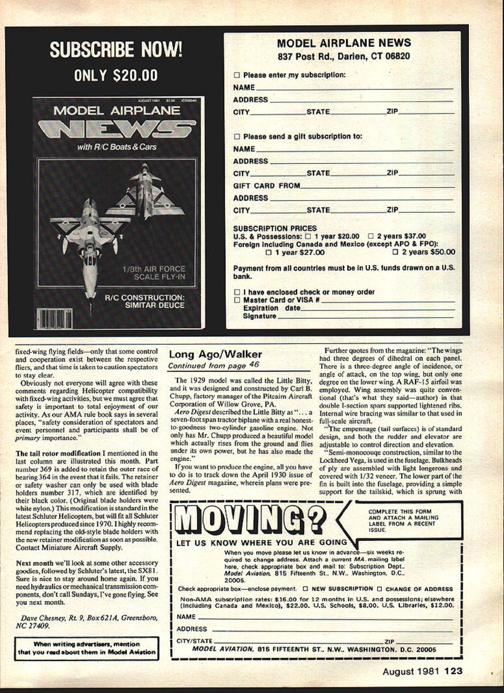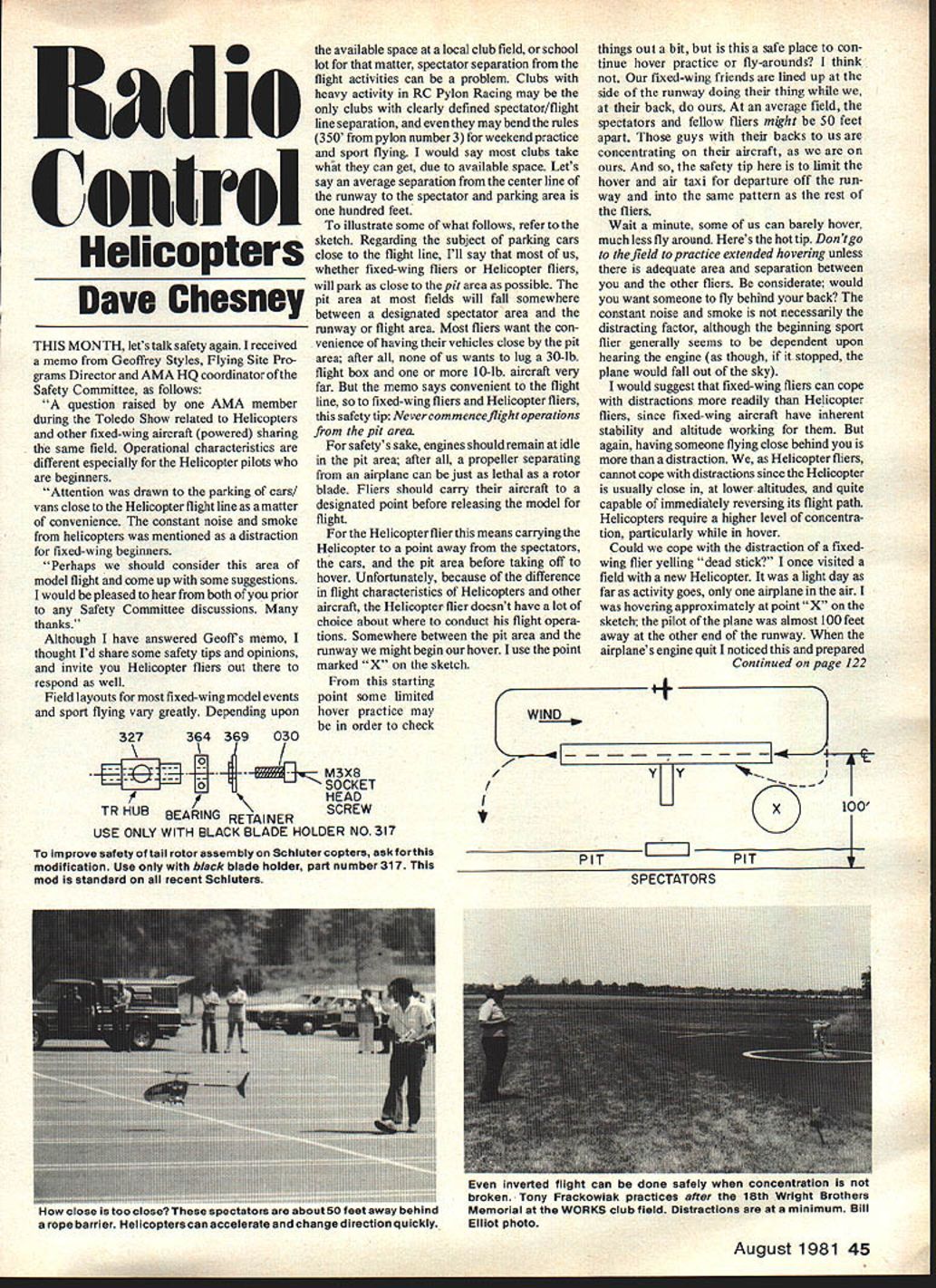 Control Helicopters Dave Chesney THIS MONTH lets talk safety again received memo Geoffrey Styles Flying Site Pro grams Director AMA HQ coordinator Safety Committee follows question raised AMA member during Toledo Show related Helicopters other fixed-wing aircraft powered sharing same field Operational characteristics different especially Helicopter pilots beginners Attention drawn parking cars vans close Helicopter flight line matter convenience constant noise smoke helicopters mentioned distraction fixed-wing beginners Perhaps should consider area model flight come up some suggestions would pleased hear both prior Safety Committee discussions thanks Although have answered Geoffs memo thought Id share some safety tips opinions invite Helicopter fliers out respond well Field layouts fixed-wing model events sport flying vary greatly Depending upon available space local club field school lot matter spectator separation flight activities can problem Clubs heavy activity RC Pylon Racing may clubs clearly defined spectator/flight line separation may bend rules 350 pylon number 3 weekend practice sport flying would say clubs take what can get due available space Lets say average separation center line runway spectator parking area hundred feet illustrate some what follows refer sketch Regarding subject parking cars close flight line Ill say us whether fixed-wing fliers Helicopter fliers will park close pit area possible pit area fields will fall somewhere between designated spectator area runway flight area Most fliers want con venience having vehicles close pit area after us wants lug 30-lb flight box 10-lb aircraft very far memo says convenient flight line fixed-wing fliers Helicopter fliers safety tip Ne vercommenceflight operations pit area safetys sake engines should remain idle pit area after propeller separating airplane can just lethal rotor blade Fliers should carry aircraft designated point before releasing model flight Helicopter flier means carrying Helicopter point away spectators cars pit area before taking off hover Unfortunately because difference flight characteristics Helicopters other aircraft Helicopter flier doesnt have lot choice about conduct flight opera tions Somewhere between pit area runway might begin hover use point marked X sketch starting point some limited hover practice may WIND order check 327364 369030 M3X8 SOCKET HEAD TR HUB BEARING RETAINERSCREW USE ONLY WITH BLACK BLADE HOLDER NO 317 improve safety tail rotor assembly Schiuter copters ask forthis modification Use black blade holder part number 317 mod standard recent Schiuters / things out bit safe place con tinue hover practice fly-arounds think fixed-wing friends lined up side runway doing thing back average field spectators fellow fliers might 50 feet apart guys backs us concentrating aircraft safety tip limit hover air taxi departure off run way same pattern rest fliers Wait minute some us can barely hover much less fly around Heres hot tip Dont go field practice extended hovering unless adequate area separation between other fliers considerate would want someone fly behind back constant noise smoke necessarily distracting factor although beginning sport flier generally seems dependent upon hearing engine though stopped plane would fall out sky would suggest fixed-wing fliers can cope distractions readily Helicopter fliers since fixed-wing aircraft have inherent stability altitude working again having someone flying close behind distraction Helicopter fliers cannot cope distractions since Helicopter usuaily close lower altitudes quite capable immediately reversing its flight path Helicopters require higher level concentra tion particularly hover Could cope distraction fixedwing flier yelling dead stick once visited field new Helicopter light day far activity goes airplane air hovering approximately point X sketch pilot plane almost 100 feet away other end runway airplanes engine quit noticed prepared Continued page 122 / Y Y PIT -j x100 PIT SPECTATORS August 1981 45 et away behind rope ba,ier Helicopters can accelerate change direction quickly inverted flight can done safely concentration broken Tony Frackowiak practices after 18th Wright Brothers Memorial WORKS club field Distractions minimum Bill Elliot photo Price 2995 K Miter Master Mite Master tool designed enable crafts man wake perfect loints wood accurately sanding pre-setangles Thesquaringfence{A aflowsforprecisegO angles retracts below surface Any angle can beset triangular guide using adjacent side complement angle will formed waking inoaluahle truss construction sew cyanuacrylate adhesines require accurately fitted joints achiene full strnngth Miter Master will enableyso wake thaw easily FOURMOST PRODUCTS 4040 24th Ave Forest Grove OR 97116 L-4B spans 110-in 1610 sq wing area projected 18 lb weight wing loading little over 15 lb/sq ft Quadra can deliver over 18 lb static thrust plane can real performer can certainly recommend both plans less-experienced Giant Scale builder flier available Taylorcraft Ltd 216 Willow Rd Roseville CA 95678 DVIII $2500 L-4B $1995 Plans review list plans reviewed keeps growing faster can keep up Add following list Super Cub Big Mach non-scale Anticlike design Biz Cap Plan Service 1408 Morris Saginaw MI 48601 Travelaire 2000 J B Special non-scale flyable biplane monoplane Behrens Plan Service 31-27 Healy Ave Far Rockway NY 11691 Waco YKS-6 Ryan SC Bob Morse Mammoth Scale Plans 3351 Pruneridge Ave Santa Clara CA 95051 FW 190 P-Si Bob Holman Plans P0 Box 741 San Bernardino CA 92402 P6-E Wendell Hostetler 1041 Heatherwood Lane Orrville OH 44667 Christen Eagle T&D Fiberglass 30926 APrice $750 Assembled booed 503 357-2732 Block Garden City MI 48135 SE-5 Baby Air Design 549 Appian Way Napoleon OH 43545 Waco HKS-7 Norm Rosenstock 94 Cedar Dr Plainview NY 11803 Fly-in dates some Giant Scale fly-ins have scheduled along contact further information August 8 & 9 Three Rivers Airport Jim Susemihl 240 South Main Three Rivers M
