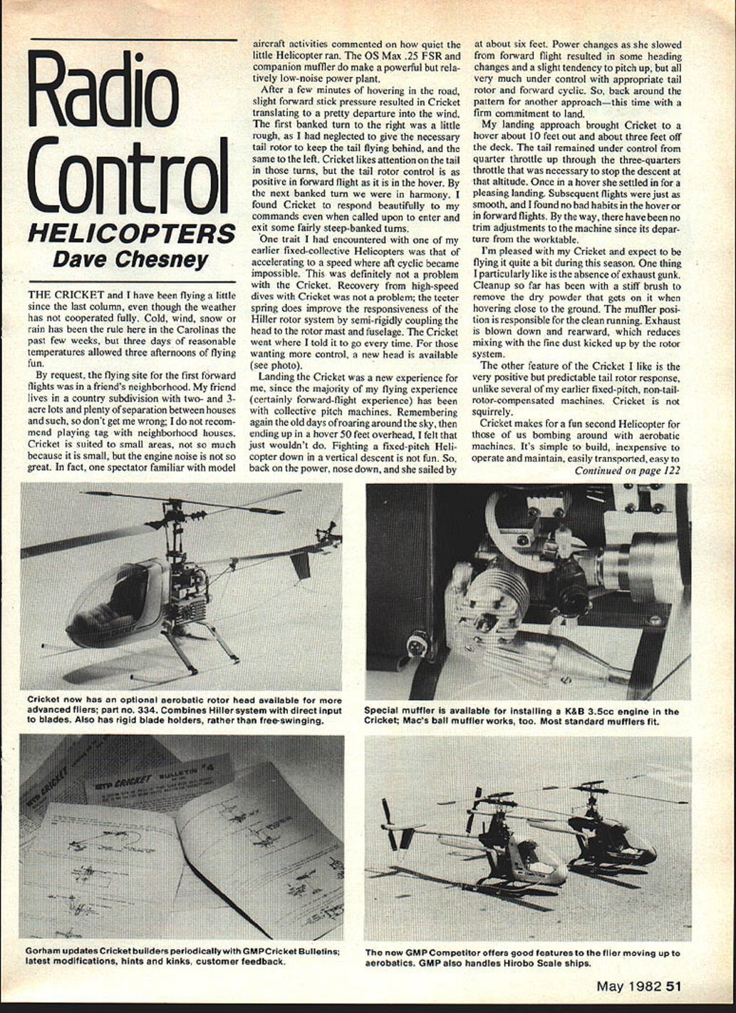 Radio Control HELICOPTERS Dave Chesney THE CRICKET have flying little since last column though weather has cooperated fully Cold wind snow rain has rule Carolinas past few weeks three days reasonable temperatures allowed three afternoons flying fun request flying site first forward flights friends neighborhood friend lives country subdivision two- 3acre lots plenty separation between houses such dont get wrong recom mend playing tag neighborhood houses Cricket suited small areas much because small engine noise great fact spectator familiar model aircraft activities commented quiet little Helicopter ran OS Max 25 FSR companion muffler make powerful rela tively low-noise power plant After few minutes hovering road slight forward stick pressure resulted Cricket translating pretty departure wind first banked turn right little rough neglected give necessary tail rotor keep tail flying behind same left Cricket likes attention tail turns tail rotor control positive forward flight hover next banked turn harmony found Cricket respond beautifully commands called upon enter exit some fairly steep-banked turns trait encountered earlier fixed-collective Helicopters accelerating speed aft cyclic became impossible definitely problem Cricket Recovery high-speed dives Cricket problem teeter spring does improve responsiveness Hiller rotor system semi-rigidly coupling head rotor mast fuselage Cricket went told go time wanting control new head available see photo Landing Cricket new experience since majority flying experience certainly forward-flight experience has collective pitch machines Remembering again old days roaring around sky ending up hover 50 feet overhead felt just wouldnt Fighting fixed-pitch Heli copter down vertical descent fun So back power nose down sailed about six feet Power changes slowed forward flight resulted some heading changes slight tendency pitch up very much under control appropriate tail rotor forward cyclic So back around pattern another approachthis time firm commitment land landing approach brought Cricket hover about 10 feet Out about three feet off deck tail remained under control quarter throttle up through three-quarters throttle necessary stop descent altitude Once hover settled pleasing landing Subsequent flights just smooth found no bad habits hover forward flights way have no trim adjustments machine since its depar ture worktable Im pleased Cricket expect flying quite bit during season thing particularly like absence exhaust gunk Cleanup far has stiff brush remove dry powder gets hovering close ground muffler posi tion responsible clean running Exhaust blown down rearward reduces mixing fine dust kicked up rotor system other feature Cricket like very positive predictable tail rotor response unlike several earlier fixed-pitch non-tailrotor-compensated machines Cricket squirrely Cricket makes fun second Helicopter us bombing around aerobatic machines Its simple build inexpensive operate maintain easily transported easy Continued page 122 May 198251 Cricket now has optional aerobatic rotor head available advanced fliers part no 334 Combines Hiller system direct input blades Also has rigid blade holders rather free-swinging Special muffler available installing K&B 35cc engine Cricket Macs ball muffler works too Most standard mufflers fit Gorham updates Cricket builders periodically GMP Cricket Bulletins latest modifications hints kinks customer feedback new GMP Competitor offers good features flier moving up aerobatics GMP also handles Hirobo Scale ships SCALE WHE RADIO CONTROL ROL-UNE NEW BALSA MAKES PERFECT BUTT JOINTS UP IN SECONDS STRAIGHT EDGER WINGSKIN TO 36 SQUARING FIREWALLS 8 BULKHEADS & MANY OTHER USES TO ORDER NO COD TO STYROCRAFT MODELS 10369 CONES RD LOVELAND OHIO 45140 OR FOR MORE INFORMATION SEND SASE LEFT BANK RIC DISTRIBUTORS P 0 Box 128 Beacon N Y 12508Hours Mon Sat 914 831-121410 am -9 pm H B ENGINES GOLDBERG TOP-FLITE 12R/C w/muttler2995GentleLady1695Opaque Monokote650 15R/C w/rnuttler3195Eaglet502395Transparents650 20R/C w/muttler3695Falcon56 Mk II3695Metallic Monokote750 21PDP w/muttler4895 CRAFT-AIRTrim Seal Tool1095 25R/C w/mutfler4195DrifterII1696Sealing Iron1495 40R/C w/muftler569bPiece-O-Cake1695Heat Gun2195 40POP w/mutfler6796Butterfly II3495 SULLIVAN 50A/C w/muttler6195 DIHi-Tork Starter2795 61A/C w/muftler7995GLA Trainer3495Hi-Tork Delux2995 61POP w/muftler8995Trainer 404295 ADHESIVES Trainer 605195Super Jet 1/ OZ250 HB ACCESSORIESTOPFLITESuper Jet 2 oz795 Tuned Pipe 40502795Contender 40~gsLoctite CA or350 Tuned Pipe 602695 Contender 60Loctite CA Plus 1 350 Header 40-501695 HOUSE OF BALSAHobbypoxy Form I135 Header 601295 2 IDER1695Hobbypoxy Form II395 Perry Pump & Pump CerbP-si40 Wood3995Hobbypoxy Form IV 2 195 40 60 size 3495Hobbypoxy Form IV 9 625 Shipping & Handling $300 Please add $200 COD Service Sorry no Foreign Orders Personal checks will held clearance N Y State Residents must add local sales tax Price subject change notice Send long SASE complete listing ELS FREE-FUGHT 000 VINTAGESMOOTHGOLDEN AGENEW sizes2ACONTOURsizes2hzBALLOON 3/a31/a"2 31/a 133/413% /24/2 1%4/a1143114 4/a31/i 5% 1/z5i1A41411/2533/4 17/i65/i2% 51/4l1/a614 Quick Silver Silver Bearing lnclPost.ZjI Paste Etl4andlrng Dispenser Field Repairs 1I Senne South THS Hobby Distributors PO Box 914 Rosewell GA 30077 No Waste 22000 psi tensile strength Low melting paint open flame lighter soldering iron Will Join 14 different combinations metals Wont Blacken Tarnish RC Helicopters/Chesney Continued page 51 fly easy clean up doesnt take up much space shop floor between flying sessions Beginners will enjoy little machine about same reasons mentioned last month excellent instructions follow-up news letters Cricket available Gorham Model Pro ducts 23961 Craftsman Rd Calabasas CA 91302 GMP also handles Hirobo line Scale RC helicopters fellow hatched Cricket writes month A/C Modeler Magazine John thinks everyone should Give Whirl Vibration Last month mentioned vibration timely topic