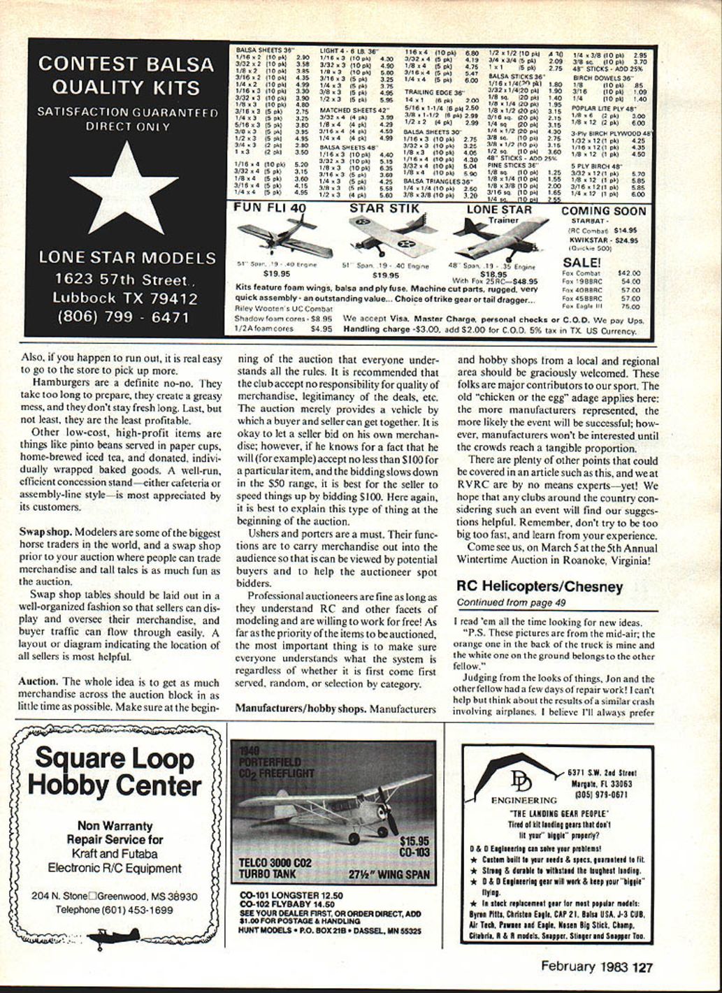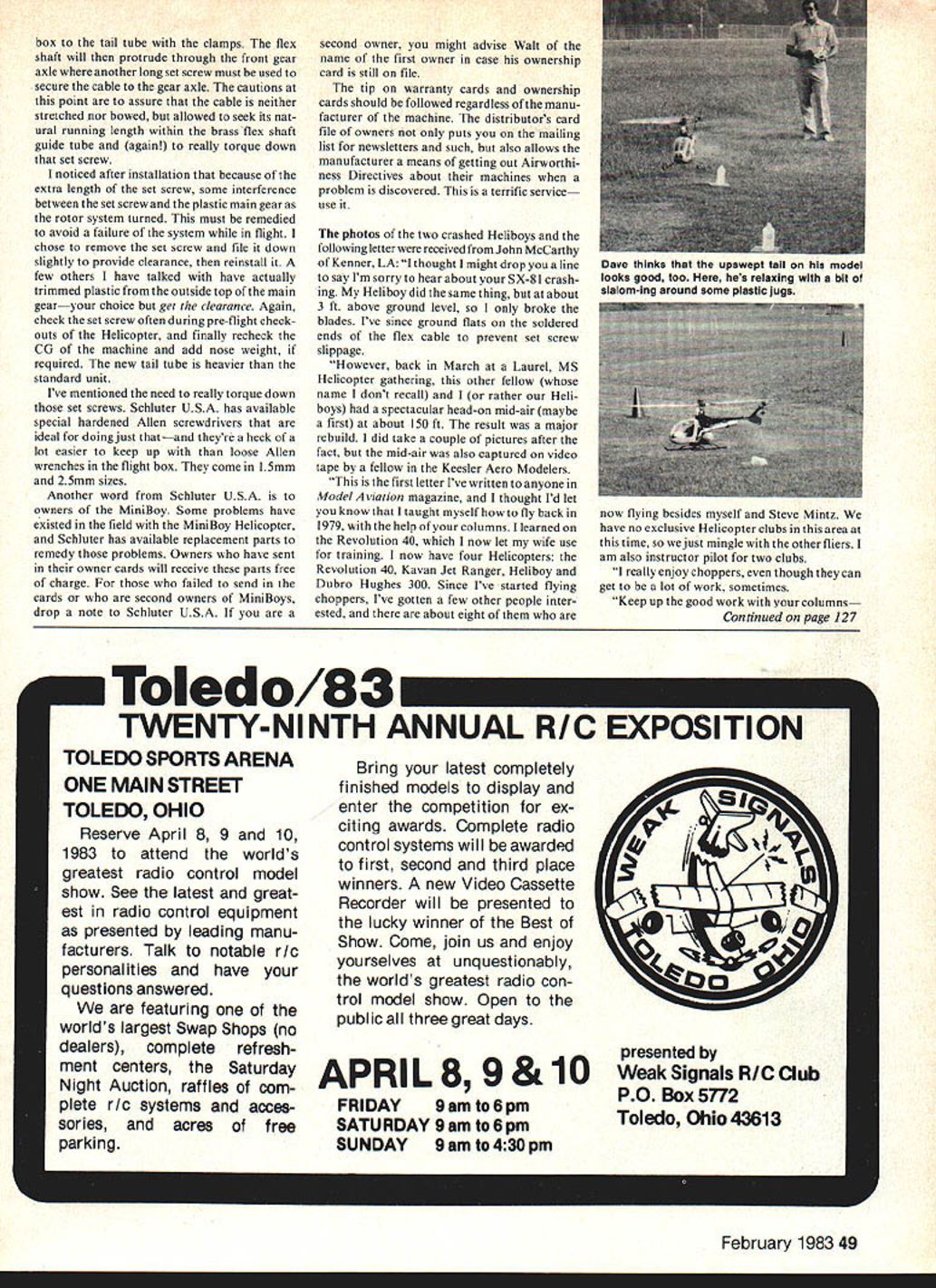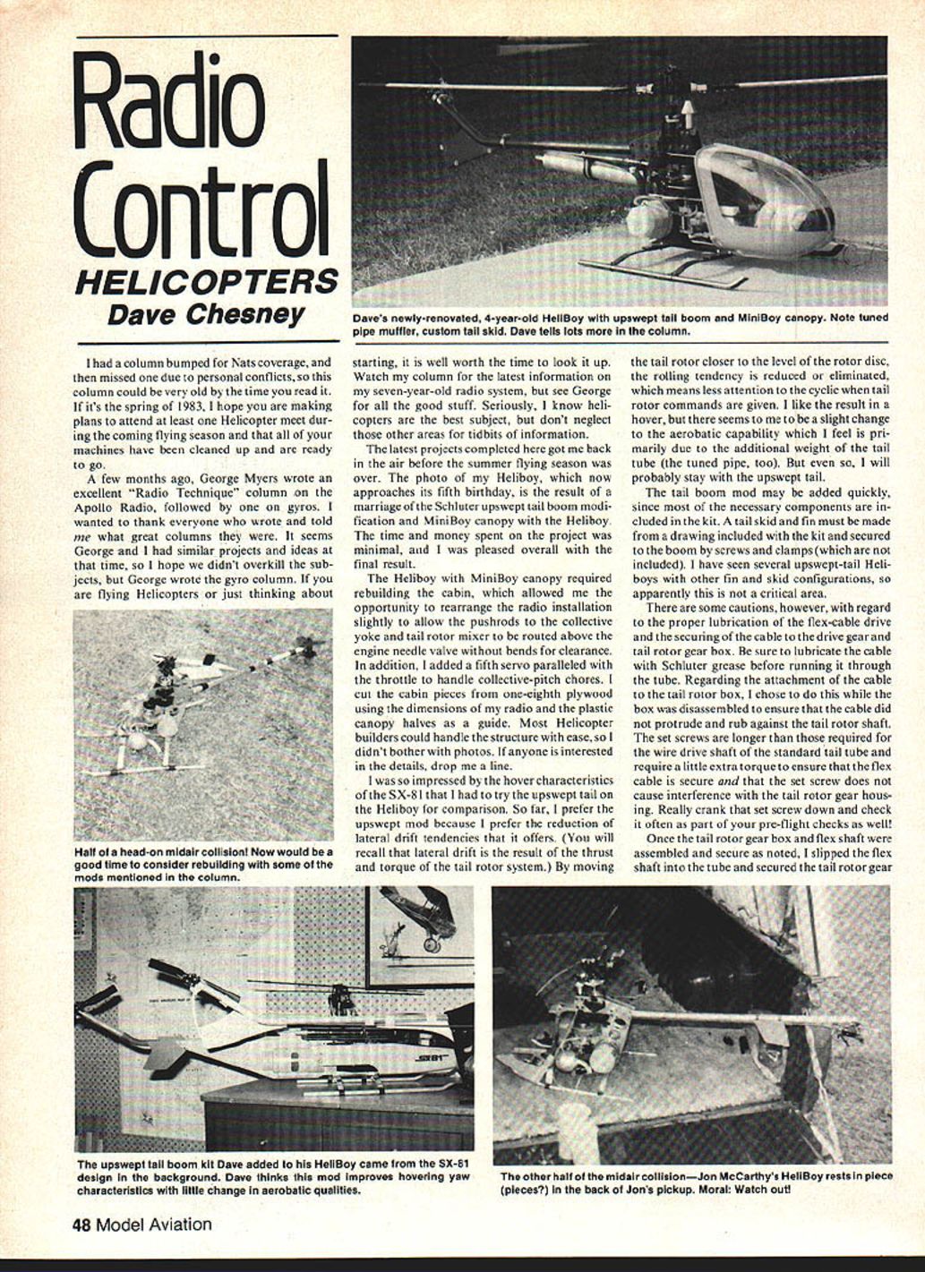 Radio Control HEL IC OP TERS Dave Chesney column bumped Nats coverage missed due personal conflicts column could very old time read its spring 1983 1 hope making plans attend least Helicopter meet dur ing coming flying season machines have cleaned up ready go few months ago George Myers wrote excellent Radio Technique column Apollo Radio followed gyros wanted thank everyone wrote told what great columns seems George similar projects ideas time hope didnt overkill sub jects George wrote gyro column flying Helicopters just thinking about starting well worth time look up Watch column latest information seven-year-old radio system see George good stuff Seriously know heli copters best subject dont neglect other areas tidbits information latest projects completed got back air before summer flying season over photo Heliboy now approaches its fifth birthday result marriage Schluter upswept tail boom modi fication MiniBoy canopy Heliboy time money spent project minimal aud pleased overall final result Heliboy MiniBoy canopy required rebuilding cabin allowed opportunity rearrange radio installation slightly allow pushrods collective yoke tail rotor mixer routed above engine needle valve bends clearance addition added fifth servo paralleled throttle handle collective-pitch chores cut cabin pieces one-eighth plywood using dimensions radio plastic canopy halves guide Most Helicopter builders could handle structure ease didnt bother photos anyone interested details drop line impressed hover characteristics SX-8 try upswept tail Heliboy comparison So far prefer upswept mod because prefer reduction lateral drift tendencies offers will recall lateral drift result thrust torque tail rotor system moving tail rotor closer level rotor disc rolling tendency reduced eliminated means less attention cyclic tail rotor commands given like result hover seems to slight change acrobatic capability feel pri marily due additional weight tail tube tuned pipe too will probably stay upswept tail tail boom mod may added quickly since necessary components cluded kit tail skid fin must made drawing included kit secured boom screws clamps included have seen several upswept-tail Heli boys other fin skid configurations apparently critical area some cautions however regard proper lubrication flex-cable drive securing cable drive gear tail rotor gear box sure lubricate cable Schluter grease before running through tube Regarding attachment cable tail rotor box chose box disassembled ensure cable did protrude rub against tail rotor shaft set screws longer required wire drive shaft standard tail tube require little extra torque ensure flex cable secure set screw does cause interference tail rotor gear hous ing Really crank set screw down check often part pre-flight checks well Once tail rotor gear box flex shaft assembled secure noted slipped flex shaft tube secured tail rotor gear 48 Model Aviation Daves newly-renovated 4-year-old HeliBoy upswept tail boom MiniBoy canopy oie tuned pipe mutfier custom tail skid Dave tells lots column Halt ahead-on midair collision Now woulo DC good time consider rebuilding some mnula montinnsd hn rnlimn upswept tall boom kit Dave added HeliBoy came SX-81 design background Dave thinks mod improves hovering yawh0therhalfofthemidaircolli5iOnJOflMcC5rthy5HCliBOyrC5t5lnpICce characteristics little change aerobatic qualitiespieces back Jons pickup Moral Watch outl box tail tube clamps flex shaft will protrude through front gear axle another long set screw must used secure cable gear axle cautions point assure cable neither stretched nor bowed allowed seek its nat ural running length within brass flex shaft guide tube again really torque down set screw noticed after installation because extra length set screw some interference between set screw plastic main gear rotor system turned must remedied avoid failure system flight chose remove set screw file down slightly provide clearance reinstall few others have talked have actually trimmed plastic outside top main gearyour choice get clearance Again check set screw often during pre-flight check outs Helicopter finally recheck CG machine add nose weight required new tail tube heavier standard unit Ive mentioned need really torque down set screws Schluter USA has available special hardened Allen screwdrivers ideal doing just thatand theyre heck lot easier keep up loose Allen wrenches flight box come 15mm 25mm sizes Another word Schluter USA owners MiniBoy Some problems have existed field MiniBoy Helicopter Schluter has available replacement parts remedy problems Owners have sent owner cards will receive parts free charge failed send cards second owners MiniBoys drop note Schluter USA second owner might advise Walt name first owner case ownership card still file tip warranty cards ownership cards should followed regardless manu facturer machine distributors card file owners puts mailing list newsletters such also allows manufacturer means getting Out Airworthi ness Directives about machines problem discovered terrific service--use photos two crashed Heliboys following letter received John McCarthy Kenner LA thought might drop line say Im sorry hear about SX-8 crash ing Heliboy did same thing about 3 ft above ground level broke blades Ive since ground flats soldered ends flex cable prevent set screw slippage However back March Laurel MS Helicopter gathering other fellow name dont recall rather Heli boys spectacular head-on mid-air maybe first about 150 ft result major rebuild did take couple pictures after fact mid-air also captured video tape fellow Keesler Aero Modelers first letter Ive written anyone Model Aviation magazine thought Id let know taught myself fly back 1979 help columns learned Revolution 40 now let wife use training now have four Helicopters Revolution 40 Kavan Jet Ranger Heliboy Dubro Hughes 300 Since Ive started flying choppers Ive gotten few other people inter ested about eight now flying besides myself Steve Mintz have no exclusive Helicopte