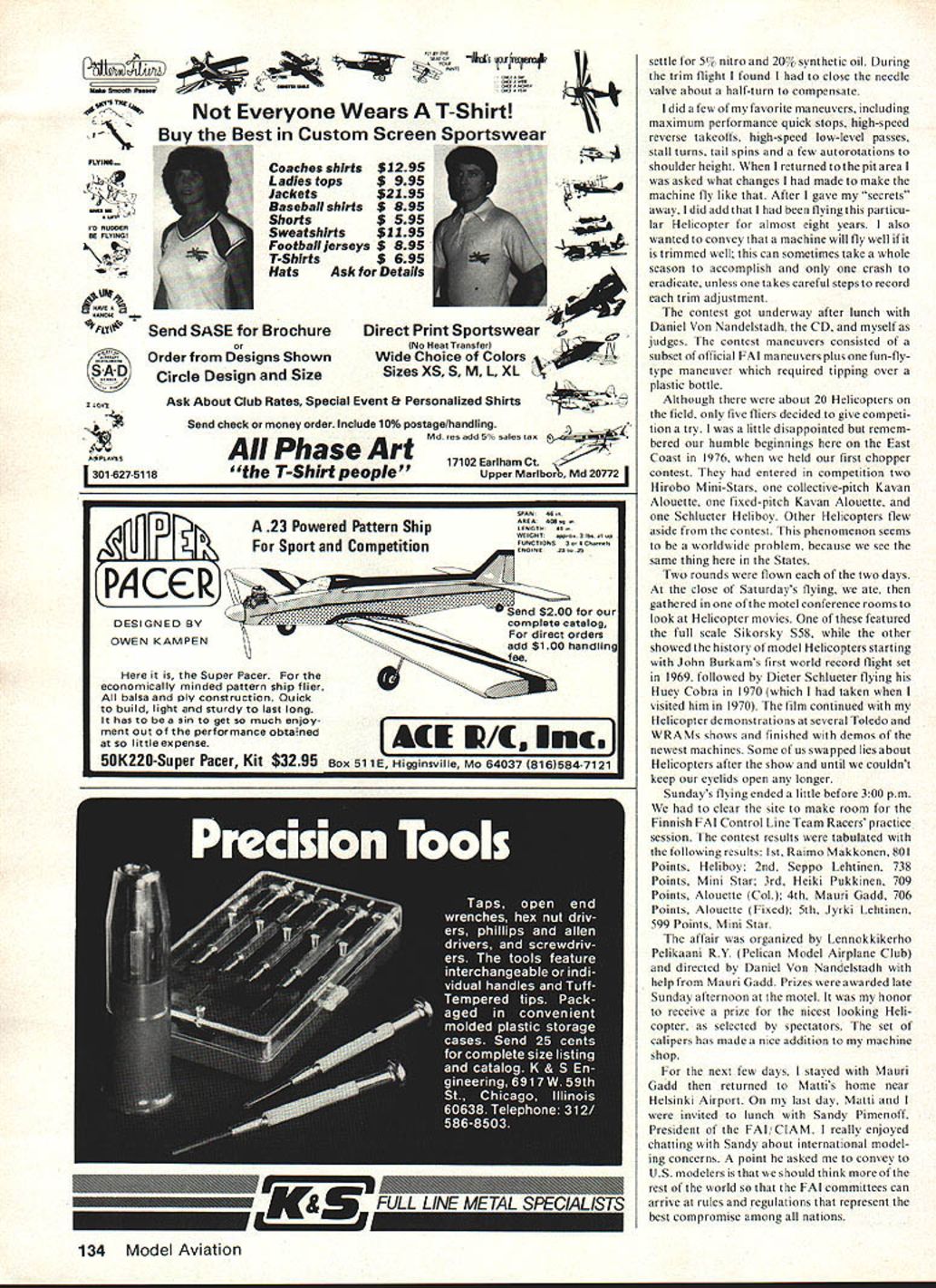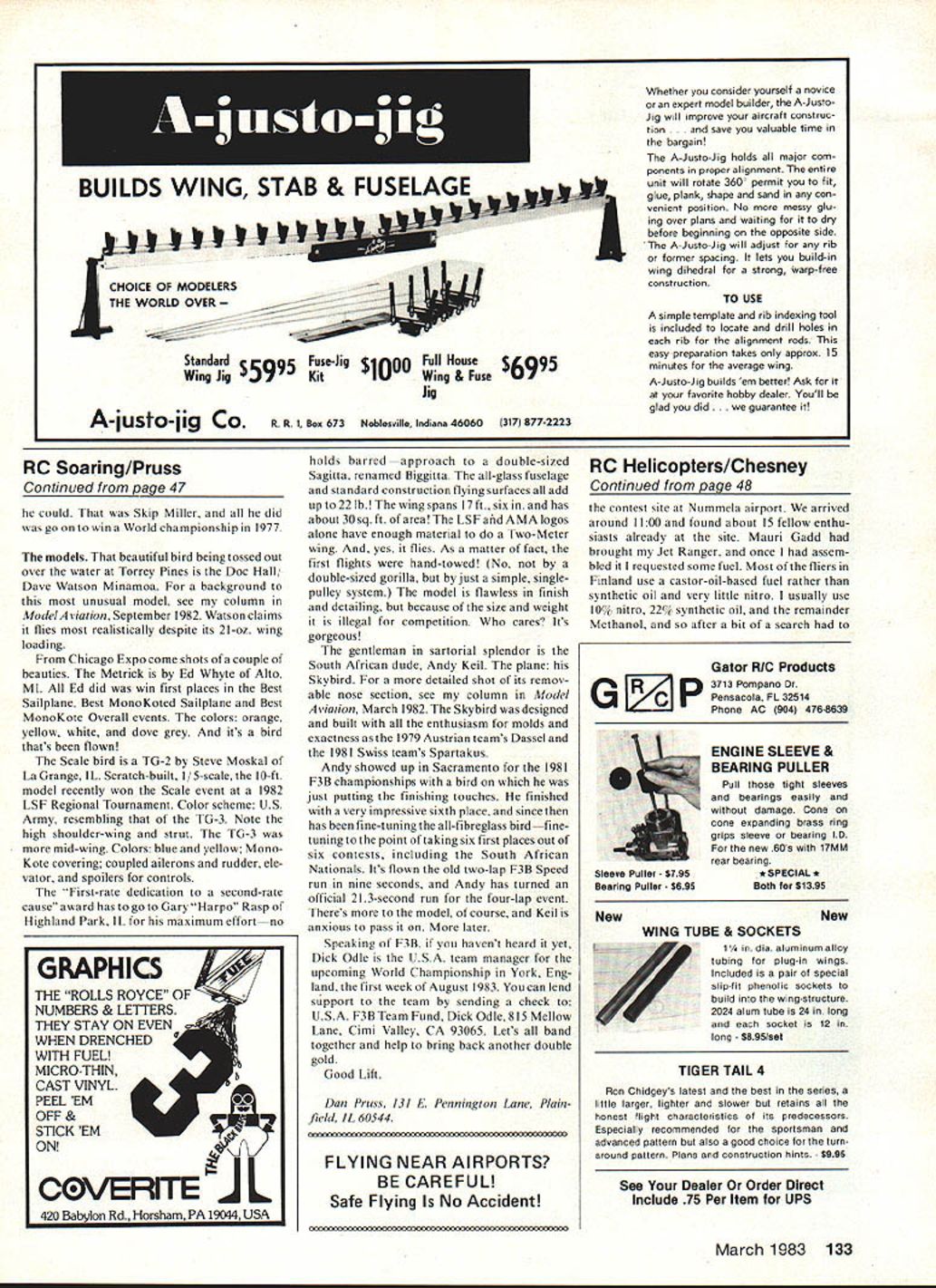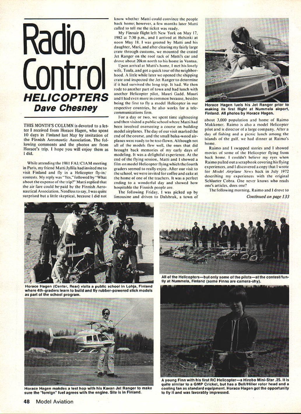 Radio Control HELICOPTERS Dave Chesney THIS MONTHS COLUMN devoted let ter received Horace Hagen spent 10 days Finland last May invitation Finnish Aeronautic Association fol lowing comments photos Horaces trip hope will enjoy did Whileattendingthe 1981 FAI/CIAM meeting Paris friend Matti Jyllila invited visit Finland fly Helicopter fly-in contests reply Yes followed What about expense trip Matti replied air fare could paid Finnish Aero nautical Association Needless say quite surprised little skeptical because did know whether Matti could convince people back home however few months later Matti called tell ticket ready Finnair flight left New York May 1982 730 pm. arrived Helsinki noon May 18 greeted Matti daughter Man after clearing fairly large crate through customs mounted crated Jet Ranger roof rack Mattis car drove about 20km north home Vantaa Upon arrival Mattis home met lovely wife Tuula got quick tour neighbor hood little later opened shipping crate inspected Jet Ranger determine survived long trip rode another part town lunch another Helicopter pilot Mauri Gadd Mauri common because besides being first fly model Helicopter respective countries also works tele communications firm day two spent time sightseeing visited public school Matti involved overseeing course building model airplanes day visit marked end course small balsa-wood air planes ready test-flown Although models flew well ones did brought back memories early days modeling delightful experience end flying session Matti showed film model Helicopter flying fourth graders seemed really enjoy After visit school invited coffee cake home teachers perfect ending wonderful day showed hospitable Finnish people following Friday picked up limousine driven Dalsbruk town about 3000 population home Raimo Makkoner Raimo also model Helicopter pilot director large company After day fishing picnic lunch among islands gulf dinner Raimos home Raimo swapped stories showed movies some Helicopter flying back home couldnt believe eyes Raimo pulled out scrapbook covering flying experiences discovered copy wrote Model Airplane Nens back July 1972 describing experiences original Schlucter Cobra never knows reads ones articles does following morning Raimo drove Continued page 133 48 Model Aviation making ils first flight Nummela airport Finland photos Horace Hagen u-brace riagen 1Lenter near visits PUDHIC scnooi onia u-inland 4th-graders learn build fly rubber-powered stick models nart school orooram 01 Helicoptersbut some pilotsat contest/fun Ily Nummela Finland some Finns camera-shy riorace nagen mauuies U 1551 flOp Will 1W UVUFJ 151 fldII5I flu I~I5 sure foreign fuel agrees engine Site Finland P yuuriy rEEl Ir.l1upnl quite similar u U has cooling tan stanuard equipment Horacs fly favorably impressed BUILDS WING STAB & FUS CHOICE OF MODELERS THEWORLDOVER StandardFuse-Jig $1000 Full House Wing Jig $5995Wing & F use Jig Ajustojig CoR R 1 Box 673Noblesville Indiana 46060317 877-2223 Whether consider yourself novice expert model builder A-i usto Jig will improve aircraft construc tion e valuable time bargain A-Justo-Jig holds major com ponents proper alignment entire unit will rotate 360 permit fit glue plank shape sand con venient position No messy glu ing over plans waiting dry before beginning opposite side A-Justo-Jig will adjust rib former spacing lets build-in wing dihedral strong warp-free construction TO USE simple template rib indexing tool included locate drill holes rib alignment rods easy preparation takes approx 15 minutes average wing A-i usto-Jig builds em better Ask favorite hobby dealer Youll glad did arantee RC Soaring/Pruss Continued page 47 could Skip Miller did wasgoontowina Worldchampionshipin 1977 models beautiful bird being tossed out over water Torrey Pines Doc Hall Dave Watson Minamoa background unusual model see column Model sialion September 1982 Watson claims flies realistically despise its 21-oz wing loading Chicago Expo come shots ofa couple beauties Metrick Ed Whyte Alto Ml Ed did win first places Best Sailplane Best MonoKoted Sailplane Best MonoKote Overall events colors orange yellow white dove grey its bird thats flown Scale bird TG-2 Steve Moskal La Grange IL Scratch-built / 5-scale 10-ft model recently won Scale event 1982 LSF Regional Tournament Color scheme US Army resembling TG-3 Note high shoulder-wing strut TG-3 mid-wing Colors blue yellow Mono Kote covering coupled ailerons rudder ele vator spoilers controls First-rate dedication second-rate eause award has go Gary Harpo Rasp Highland Park IL maximum effortno holds harred-approach double-sized Sagista renamed Biggitta all-glass fuselage standard construction flying surfaces add up 22 lb wing spans 17 ft six has about 30 sq ft area LSF MA logos alone have enough material Two-Meter wing yes flies As matter fact first flights hand-towed No double-sized gorilla just simple singlepulley system model flawless finish detailing because size weight illegal competition cares Its gorgeous gentleman sartorial splendor South African dude Andy Keil plane Skybird detailed shot its remov able nose section see column Model siation March 1982 Skybird designed built enthusiasm molds exactness 1979 Austrian teams Dassel 1981 Swiss teams Sparsakus Andy showed up Sacramento 1981 F3B championships bird just putting finishing touches finished very impressive sixth place since has fine-tuning all-fibreglass birdfinetuning point taking six first places out six contests including South African Nationals Its flown old two-lap F3B Speed run nine seconds Andy has turned official 2 13-second run four-lap event Theres model course Keil anxious pass later Speaking F3B havent heard yet Dick Odle USA team manager upcoming World Championship York Eng land first week August 1983 can lend sipport team sending check USA F3B Team Fund Dick Odle 815 Mellow Lane Cimi Valley CA 93065 Lets band together help bring back another double gold Good Lift Dan Pruss 131 E Penningion Lane Plain field IL 60544