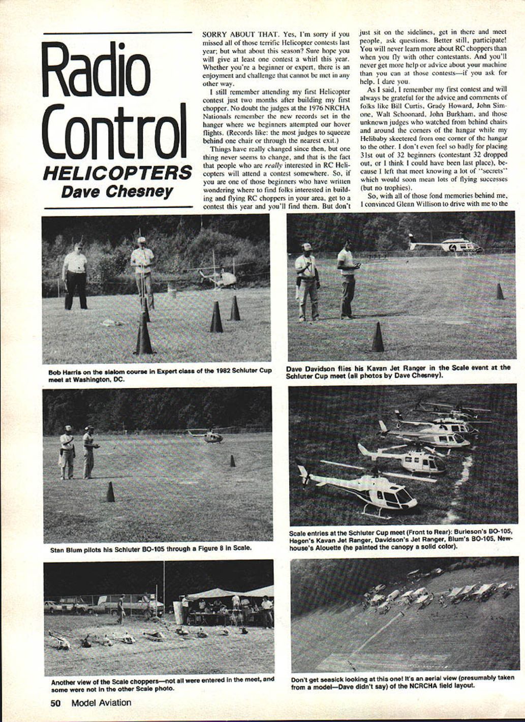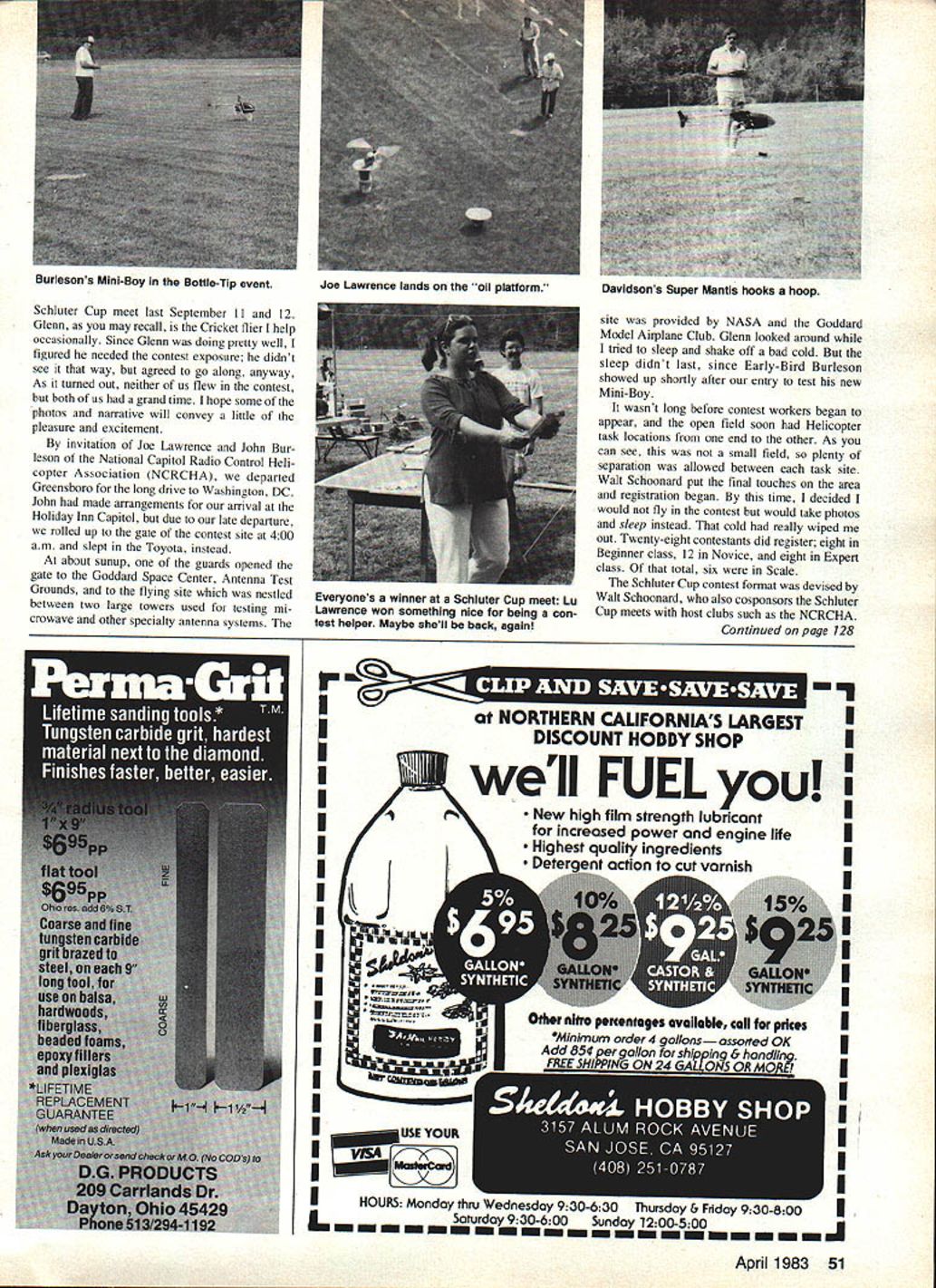 Radio Control HEL IC OP TERS Dave Chesney SORRY ABOUT THAT Yes Im sorry missed terrific Helicopter Contests last year what about season Sure hope will give least contest whirl year Whether youre beginner expert enjoyment challenge cannot met other way still remember attending first Helicopter contest just two months after building first chopper No doubt judges 1976 NRCHA Nationals remember new records set hanger beginners attempted hover flights Records like judges squeeze behind chair through nearest exit Things have really changed since thing never seems change fact people really interested RC Heli copters will attend contest somewhere So beginners have written wondering find folks interested build ing flying RC choppers area get contest year youll find dcnt just sit sidelines get meet people ask questions Better still participate will never learn about RC choppers fly other contestants youll never get help advice about machine can contestsif ask help dare As said remember first contest will always grateful advice comments folks like Bill Curtis Grady Howard John Sim Walt Schoonard John Burkham unknown judges watched behind chairs around corners hangar Helibaby skeetered corner hangar other dont feel badly placing 31st out 32 beginners contestant 32 dropped out think could have last place because left meet knowing lot secrets would soon mean lots flying successes no trophies So fond memories behind convinced Glenn Willison drive 50 Model Aviation mob Harris oit slalom course Expert class 1982 Schluter Cup meet Washington DC Dave Davidson flies Kavan Jet Ranger Scale event Schlutor Cup meet photos Dave Chesney Stan Slum pilots Schiuter 50-105 through Mgure e Scale entries Schluter Cup meet Front Rear Burlesona 50-1 05 Hagens Kavan Jet Ranger Davidsons Jet Ranger Slums B0-1 05 Newhouses Alouette painted canopy solid color Another view Scale choppersnot 511 worm ensered meet some other Scale photo Dont get seasick looking Its aerial view presumably taken modelDave didnt say NCRCHA field layout Schluter Cup meet last September 11 12 Glenn may recall Cricket flier help occasionally Since Glenn doing pretty well figured needed contest exposure didnt see way agreed go along anyway As turned Out neither us flew contest both us grand time hope some photos narrative will convey little pleasure excitement invitation Joe Lawrence John Bur leson National Capitol Radio Control Heli copter Association NCRCHA departed Greensboro long drive Washington DC John made arrangements arrival Holiday Inn Capitol due late departure rolled up gate contest site 400 am slept Toyota instead about sunup guards opened gate Goddard Space Center Antenna Test Grounds flying site nestled between two large towers used testing mi crowave other specialty antenna systems site provided NASA Goddard Model Airplane Club Glenn looked around tried sleep shake off bad cold sleep didnt last since Early-Bird Burleson showed up shortly after entry test new Mini-Boy wasnt long before contest workers began appear open field soon Helicopter task locations end other As can see small field plenty separation allowed between task site Walt Schoonard put final touches area registration began time decided would fly contest would take photos sleep instead cold really wiped out Twenty-eight contestants did register eight Beginner class 12 Novice eight Expert class total six Scale Schluter Cup contest format devised Walt Schoonard also cosponsors Schluter Cup meets host clubs such NCRCHA Continued page 128 rat NORTHERN CALIFORNIAS LARGESTI IDISCOUNT HOBBY SHOPI U ,/UIO\weII FUEL I New high film strength lubricantU increased power engine lifeI ghest ouclily ingredients Deteaction cut varnish1 iiI U II IU II II II II II I _______USE YOURI I7I II HOURS Monday thru weonescay 930-630 Thursday & Friday YJu-0UU L. - m day936ooSunday 120000- - April 1983 51 Burlesons Mini-Boy Bottle-Tip event Joe Lawrence lands oil platform Davidsons Super Mantis hooks hoop Everyones winner Schluter Cup meet Lu Lawrence won something nice being con test helper Maybe shell back again THE flOW POWRTOW WINCH ZIP & LONGER BATTERY LIFE Power size sailplane current draw -kiting & manual drum brakes adjustable speed chute -a round toot switch 115 lb braided line use iith RUTIEVEM launch-a-minute flights end line shagging delays line crossings drag tree operation tangles heavy-duty cables clips braided 30 lb line ribbon hand switch line guides ball bearing swivels mbAUDAVE sysTEms COEPOWAIION ow wOOD LAI4EMALVEINPA193S5 215444-0692 Write call information FAIIFormula airplane can also flown sport airplane desire present day Pylon Racing planes very stable very easy fly fact think will fly better sport planes Try oneyou just might like Now before go further want make clear am no way trying make Formula look bad As far am concerned premier Racing event would give up fly other event am just using comparison also say wouldnt also fly some FAI get going again few local contests FAI 1982 What going 1983 Someone has get ball rolling again Come gangthey have done everything asked ball court now Oh way dont think FAI fast enough flying l20s now write someone may break teens Heres something would like pass received Mr Z Mama Dear Friends would like invite cordially either see directly compete 6th Grand Prix Modela Trophy going held Melnik CSSR June 10-12 1983 inter national F3D category will flown under new FAI mles accepted ClAM December 1980 Grand Prix Modela really big contest very popular among RC enthusiasts attendance over 2000 spectators usually exception airfield beside Melnik roughly 35 km Prague direc non Nord very nicely placed especially 128 Model Aviation F3D purposes airfield going used F3D European Championships next year accommodation possibilities restaurant services very good Melnik hesitate write detailed infonnation following address MODELA Attn Mr Z Malina Holeckova 9 15000 Praha 5 Czecho slovakia Czechoslovakian RC modelers organizing committee Grand Prix Modela look