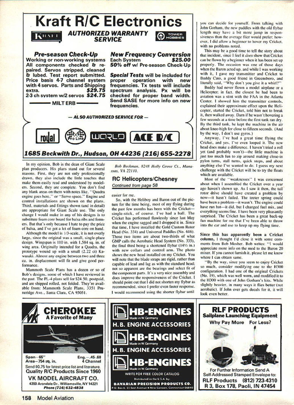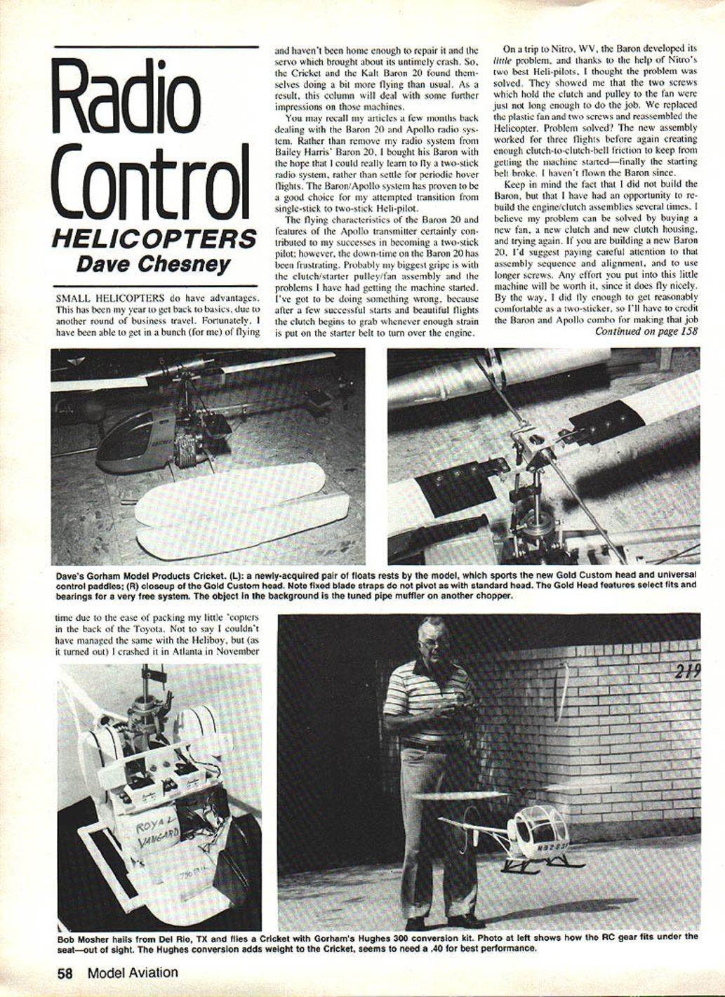 Radio Control HELICOPTERS Dave Chesney SMALL HELICOPTERS have advantages has year get back basics due another round business travel Fortunately have able get bunch flying havent home enough repair servo brought about its untimely crash So Cricket Kalt Baron 20 found selves doing bit flying usual As result column will deal some further impressions machines may recall articles few months back dealing Baron 20 Apollo radio sys tem Rather remove radio system Bailey Harris Baron 20 bought Baron hope could really leam fly two-stick radio system rather settle periodic hover flights Baron/Apollo system has proven good choice attempted transition single-stick two-stick Heli-pilot flying characteristics Baron 20 features Apollo transmitter certainly con tributed successes becoming two-stick pilot however down-time Baron 20 has frustrating Probably biggest gripe clutch/starter pulley/fan assembly problems have getting machine started Ive got doing something wrong because after few successful starts beautiful flights clutch begins grab whenever enough strain put starter belt tum over engine trip Nitro WV Baron developed its little problem thanks help Nitros two best Heli-pilots thought problem solved showed two screws hold clutch pulley fan just long enough job replaced plastic fan two screws reassembled Helicopter Problem solved new assembly worked three flights before again creating enough clutch-to-clutch-bell friction keep getting machine startedfinally starting belt broke havent flown Baron since Keep mind fact did build Baron have opportunity re build engine/clutch assemblies several times believe problem can solved buying new fan new clutch new clutch housing trying again building new Baron 20 Id suggest paying careful attention assembly sequence alignment use longer screws Any effort put little machine will worth since does fly nicely way did fly enough get reasonably comfortable two-sticker Ill have credit Baron Apollo combo making job Continued page 158 58 Model Aviation ' Daves Gorham Model Products Cricket L newly-acquired pair floats rests model sports new Gold Custom head universal control paddles R closeup Gold Custom head Note fixed blade straps pivot standard head Gold Head features select fits bearings very free system object background tuned pipe muffler another chopper time due ease packing little copters back Toyota say couldnt have managed same Heliboy tumed out crashed Atlanta November Mosner nails trom uei Kb IA ana iies uricet witn uornams riugnes uu conversion KIT rnoso ai ien snows now eeI uIL Ufls seatout sight Hughes conversion adds weight Cricket seems need 40 best performance Kraft RIC Electronics AUTHORIZED WARRANTY Y5 SERVICEJiI Pre-season Check-Up Working non-working systems components checked & re paired Servos stripped cleaned & lubed Test report submitted Price basis 4-7 channel system 4 servos Parts Shipping extra$2975 2-3 ch system w12 servos S24 75 MILT ERB New Frequency Conversion System$2500 50% off wI Pre-season Check-Up Special Tests will included proper operation new frequencies Tx tests will include spectrum analysis Px will checked proper band width Send SASE info new frequencies ALSO AUTHORIZED SERWCE FOR EiIJ Beckwith Dr Hudson OH 44236216 655-2278 opinion Bob dean Giant Scale plan producers plans stand out several reasons First professionally drawn also include little touches make easily read understood model ers Second complete dont find blank areas notes like Quadra engine goes Servo space Engine control installations shown plans Third materials fittings shown detail appropriate Giant Scale use change would make designs substitute foam core board balsa ribs form ers thats because hate pay price balsa Ive got lot foam core hand Although model 1/3-scale overly large since original small single-place design Wingspan 110 1584 sq wing area Originally intended Quadra prototype wound up small 222 ci Ka wasaki Almost engine between two three Cu displacement will fit give good per formance Mammoth Scale Plans has dozen Bobs designs some have reviewed past PL-4 plans sell $2450 postpaid shipped rolled folded Theyre avail able Mammoth Scale Plans 3351 Pru neridge Ave Santa Clara CA 95051 Bob Beckman 8248 Holly Grove Ci Mono ssas VA 22110 RC Helicopters/Chesney Continued page 58 easier So Heliboy Baron Out pic ture time being flying during past few months has Cricket single-stick course Ive ball Cricket has performed flawlessly since last May engine sagged dropped Since time have installed Gold Custom Rotor Head No 334 Universal Paddles No 616 two items about two-thirds what GMP calls Aerobatic Head System No 335 final third being shortened flybar 14 new collars control arm photo shows new head installed Cricket will note blade straps rigid rather capable lead lag standard head apparent bearings select fit component parts Its very nice assembly does improve responsiveness Cricket should point out did shorten flybar recommended since prefer faster response would recommend using shorter flybar until can decide yourself talking John Gorham new paddles old flybar length may havc bit jump respon siveness average flier would prefer ever did allow beginner hover Cricket no problems noted may good time tell story about incident since feel does show Cricket can flown beginner has set up properly occasion days Baron acted up working gave transmitter Cricket Buddy Cato good friend Greensboro literally said dont give whirl Buddy never flown model airplane Helicopter fact closest aviation stint FAA Atlanta Center showed him transmitter controls explained approximate effect upon Heli copter started Cricket told him break walked away Dam wasnt hovering few seconds time before first tank ran dry third tank kept machine air about knee-high close fifteen seconds way dont use gyros Anyway Ive great time flying Cricket yes Ive looped new head does make difference havent tried roll yet probably wontthe little machine just too much fun zip around making close-in pylon tums stall tu