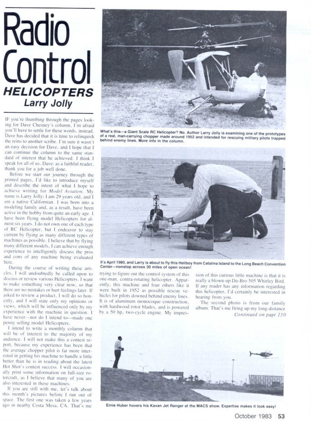 Radio Control HELICOPTERS Larry Jolly IF youre thumbing through pages look ing Dave Chesneys column Im afraid youll have settle words instead Dave has decided time relinquish reins another scribe Im sure wasnt easy decision Dave hope can continue column same stan dard interest achieved think speak us Dave faithful reader thank job well done Before start journey through printed pages d like introduce myself describe intent what hope achieve writing Model Aviation name Larry Jolly am 29 years old am native Californian born modeling family result have active hobby quite early age have flying model Helicopters al six years own type RC Helicopter endeavor stay current flying different types machines possible believe flying different models can achieve enough experience intelligently discuss pros cons machine being evaluated During course writing arti cles will undoubtedly called upon discuss review various Helicopters want make something very clear now no mistakes hurt feelings later asked review product will hon estly will state opinions views will influenced experience machine question have nevernor intend tomade penny selling model Helicopters intend write monthly column will interest majority audience will make contest re port because experience has average chopper pilot far inter ested getting machine handle little better reading about latest Hot Shots contest success will occasion ally print some information full-size ro torcraft believe also interested machines still lets talk about months pictures before run out space first taken few years ago nearby Costa Mesa CA Thats trying figure out control system one-man contra-rotating helicopter Appar ently machine four others like built 1952 possible rescue ve hicles pilots downed behind enemy lines aluminum monocoque construction hardwood rotor blades powered 50 hp two-cycle engine impres sion curious little machine really blown-up Du-Bro 505 Whirley Bird reader has information regarding helicopter Id certainly interested hearing second photo family album Thats firing up long-distance Continued page 150 October 1983 53 Whats thisa Giant Scale RC Helicopter No Author Larry Jolly examining prototypes real man-carrying chopper made around 1952 intended rescuing military pilots trapped behind enemy lines info column Its April 1980 Larry about fly Heliboy Catalina Island Long Beach Convention Centernonstop across 30 miles open ocean Ernie Huber hovers Kavan Jet Ranger MACS show Expertise makes look easy NOW PRODUCED IN THE US ANOTHER GIANT FROM J-5 tough TORNADO 4 feet speed stability TORNADO loves rough water handling best time paint clear air clean just little damp usually no wind plane has whole day dry before come back fondle After drying day clear coat just about bulletproof Go ahead put radio engine silicone wing saddle fly thing have lots questions about go about fading colors Ill take some time go over color-fading techniques Fading probably easiest way striking paint jobbut can also create total mess painters try fade colors too far away other spectrum come out looking like forgot piece masking tape tf going try fading colors should use shades close another Dark/light same color works best colors next another color wheel Always shoot colors together little drying time possible Always fade lightest color over dark always hold airbrush overspray goes back color spraying Again biggest secret fading know ing quit hope series articles has given some points painting did know before way way paint has successful thanks Gary MePike tips finishing Pylon Racer See next month Bill Hager 706 Glen Haven Dr Conroe TX 77302 RC Helicopters/Jolly Continued page 53 timately land Long Beach Convention Center Model Aviation carried story August 1980 issue might want particulars third picture Master Ernie Huber hovering Kavan Jet Ranger verted audiences past MACS show love watch someone Ernies talent fly gives rest us something shoot know can have lot fun articles participate Unlike other editors may have ended columns saying Please send information can have something present month Ill put slightly different way Id like send pictures information might have something column dont youll have listen month because will have column blank space used So until next time keep landing rotor blades up Larry Jolly 5501 W Como Santa Ana CA 92703 Airplane Design/Powers Continued paoe 55 15 The weight power speed etc Scale model have real relationship weight power speed etc full-scale prototype a True b False 16The equation lift LCLqS a This abstruse formula no practical value b A half-hours study equa tion will give modeler very useful tool use designing own models 17 Swept highly-tapered wings should have a Washout b Washin 18 Reynolds Number has a Size b Speed c Viscosity d Density e Drag 19 In level flight horizontal tail nor mally carries a An up load lift aft portion airplane b A down load keep nose up c No load because stabilizers have zero incidence 20 On full-size airplanes wing set some angle incidence yet models have wing set zero incidence a Therefore incidence neces sary b If both wing stabilizer set zero incidence airplane will fly up elevator Answers Discussion b tail-dragger arrangement herently unstable because main wheels ahead CG Tail wheels skids provide degree stability very effective because very lightly loaded up off ground almost immediately takeoff main wheels should toed-in As shown Fig airplane begins yaw usually left because propeller torque drag left wheel combines greater moment arm does right wheel its smaller arm B thus producing net mo ment tending increase yaw left cause ground loop toeing-in wheels drag left wheel reduced right wheel increased has effect increasing favorable restoring moment right wheel decreasing adverse moment left wheel can seen under no circumstances should main wheels ever toed-out 2bTorque Propeller torque can con siderable low speed loads up left wheel unloads right wheel causing airplane want turn left should counte