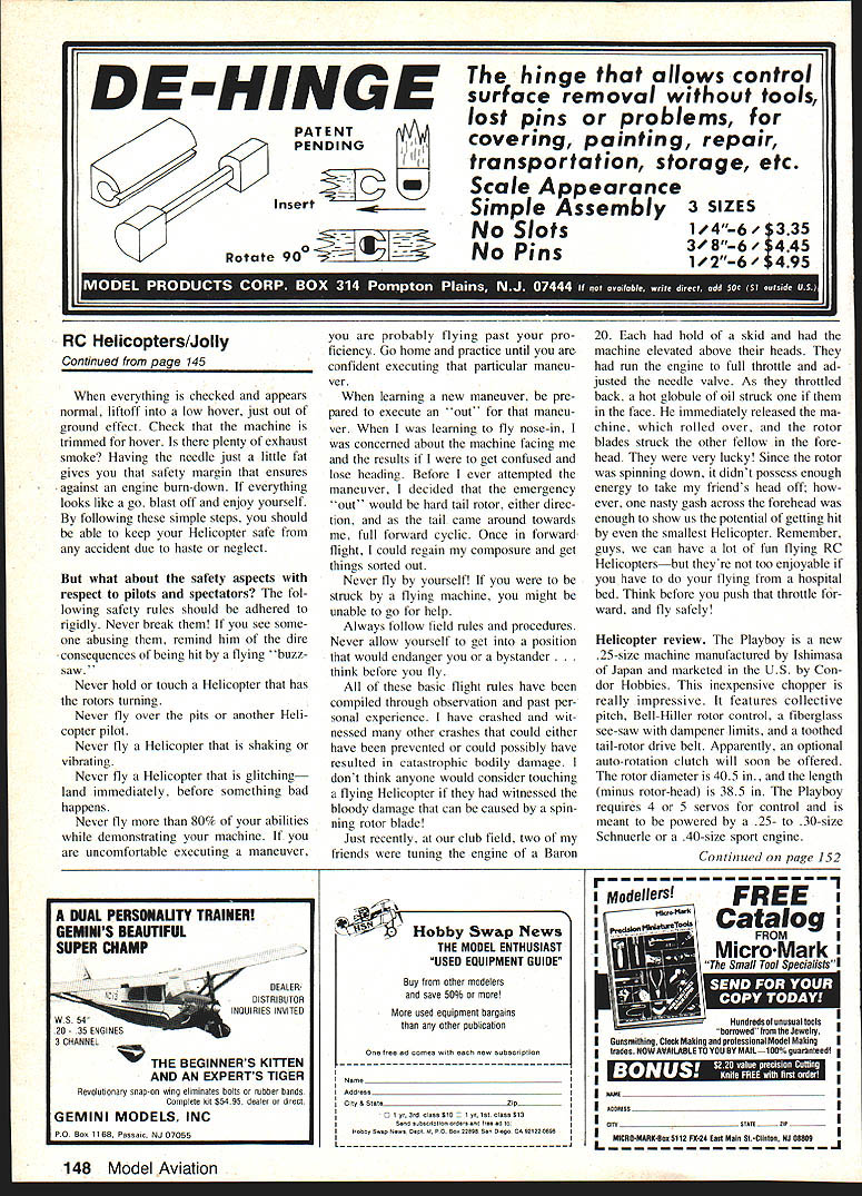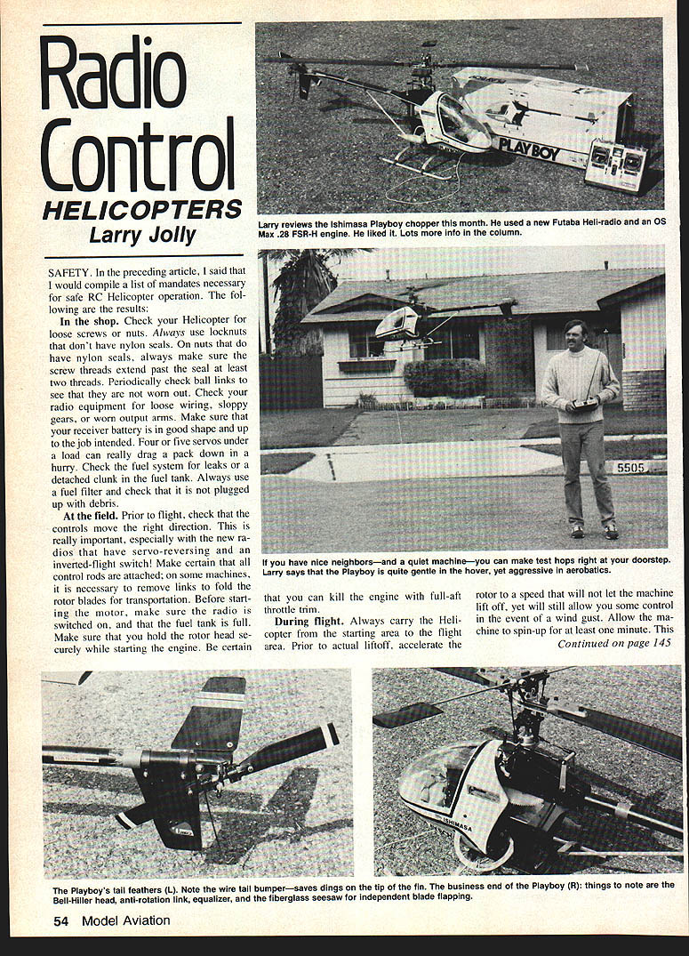Radio Control HEL IC OP TERS Larry Jolly SAFETY preceding article said would compile list mandates necessary safe RC Helicopter operation fol lowing results shop Check Helicopter loose screws nuts Always use locknuts dont have nylon seals nuts have nylon seals always make sure screw threads extend past seal least two threads Periodically check ball links see worn out Check radio equipment loose wiring sloppy gears worn output arms Make sure receiver battery good shape up job intended Four five servos under load can really drag pack down hurry Check fuel system leaks detached clunk fuel tank Always use fuel filter check plugged up debris field Prior flight check controls move right direction really important especially new ra dios have servo-reversing inverted-flight switch Make certain control rods attached some machines necessary remove links fold rotor blades transportation Before start ing motor make sure radio switched fuel tank full Make sure hold rotor head se curely starting engine certain can kill engine full-aft throttle trim During flight Always carry Heli copter starting area flight area Prior actual liftoff accelerate rotor speed will let machine lift off yet will still allow some control event wind gust Allow ma chine spin-up least minute Continued page 145 Playboys tail feathers L Note wire tail bumpersaves dings tip fin business end Playboy R things note Bell-Hiller head anti-rotation link equalizer fiberglass seesaw independent blade flapping 54 Model Aviation Larry reviews Ishimasa Playboy chopper month used new Futaba Hell-radio OS Max 28 FSR-H engine liked Lots Info column have nice neighborsand quiet machineyou can make test hops right doorstep Larry says Playboy quite gentle hover yet aggressive aerobatics TOLEDOI84THIRTIETH ANNUAL RIO EXPOSITIONIU Reserve April 6 7 81984TOLEDO SPORTS ARENA attend worlds greatestONE MAIN STREET radio control model show WeTOLEDO OHIO featuring worlds largest Swap Shops no dealers complete refreshment centers Saturday Night Auction raffles complete nc systems accessories acres free parking Bring latest completely ~nished models display enter competition excit ing awards Competition models will accepted during show hours till 10 am Sunday morning no entry fee Complete nc systems will presented first second third place winners new Microwave Oven will award ed lucky winner Best Show Open public three great days APRIL 67& 8 FRIDAY 9am SATURDAY 9am6pm SUNDAY 9am 430pm Weak Signals RIO Club PO Box 5772 Toledo Ohio 43613 units penultimate available concept reed receiver/transmitter series modulated audio tones vi brated metal strip causing close onto switch turn activated relay turn passed current servo sounds complexit tone such 500 cycles per second emited transmitter pilot activated several switches buttons picked up receiver used vibrate reed Thus tone eventually moved servo direction such Up elevator return surface neutral released transmitter button switch Another switch could pushed generate another tone would activate another control function such Down ele vator other words 10-channel unit capable moving five surfaces two directions until 1960 equipment capable generating tone time became available system referred Simul reader has never seen reed multi-channel flown preceeding likely conjures up visions very herky jerky flying Such case accomplished fliers became adept flicking switches flying closely resembled todays proportional equipment however con siderable accomplishment very early reed equipment Rockwood Schmidt others used control box rather buttons however didnt prove popular Control boxes scalelike sticks also available single-channel fliers simplify flying cas caded compound escapements illustrated past column have cluded some photos Ectron controller provided us reader As era complex enough what single channel compound es capements galloping ghost kicking duck reeds forth Good Worth Don Brown others also flying primitive proportional rigs early Quadraplex Space Control proportional equipment sale 1959 yet multi reed equipment sold well commonly used equipment well mid Sixties ever proportional did catch reed equipment disappeared almost over night Corporal Klingers home town Toledo OH will scene SAM Champs 84 mid-June date has selected likely produce cooler weather lighter winds traditional July dates site former Toledo Municipal airport full-scale aviation activity will suspended three-day Champs Concrete runways well-maintained grass areas should make motorbike retrieval possible Free Flighters Access via 1-75 Ohio Turnpike interchange Quality Semco Mufflers Tuned Pipe Adapter Super Expansion FAI Competition Vertical Down Exhaust PiUs Pitts Jr Super Flo Thru Exhaust Manifolds 215 457-3120 area full motels Although head quarters motel yet unnamed will scene MECA Collecto tra ditional first evening bean feed awards banquet SAM Champs much social hap pening contest shaping up best ever Carl Spielmaker will serve general CD Tom McCoy Buck Zaire charge RC Anyone knows three rascals aware fun bring activity Free Flight director has named writing Watch column Clarence Haughts detailsbut dont let pack wild horses keep attending Dee B Mathews 506 South Walnut Greensburg KS 67054 RC Helicopters/Jolly Continued paqe 54 one-minute period will allow check rate switches trims proper positions Also will able check noticeable vibration During warm-up period engine will come up operating temperature open throttle actual liftoff will able check carburetor properly ad justed good idle Continued page 148 ~blyand Double Value Ideal caddy workbench setting checking wing stab incidence Rgular$4998 1/4 Scale$3495 Balancing Posts5595 Dealer Inquiries Welcome 125 Manor Ave S emco Oaklyn NJ 08107 January 1984 145 ronaere power glow plugs 55 shirt pocket Usiog HeadlockTM adapte, allows stoy plog ond get propeller Rechargeable op 1000 tiwes SO day warranty No wore bulky botterieo nobles Order NISTARTER either 110 220 12 colt fost charger lestroctioc