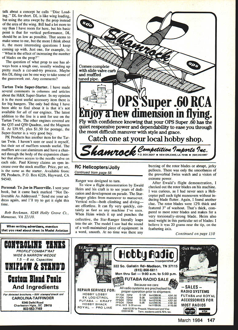 Radio Control HELICOPTERS Larry Jolly LETS TALK about Star-Ranger new kid block have never read foreign publications have little interest RC Helicopters international front may have heard machine called Star-Ranger its creator Ewald Heim remember first time heard men tion dynamic duo back 1978 1 Dave Niemans shop outside London happened see name Star-Ranger English model magazine fellow shop informed Star-Ranger specially-modified Kavan Jet Ranger its builder Heim talented Ger man flier As time passed read pas sages referring Heim machine usually results section European contests can imagine excitement felt learned Heim would demon strating Star-Ranger recent Mer ced CA Fly-In Shortly after arrived Merced met Mr Heim andwas allowed examine machine firsthand im pressed both machine creator found Heim very professional willingly discussed machine gave feel ing Star-Ranger didnt just happen rather developed both calcula tor drawing board well workshop flying field Star-Ranger did indeed start out modified Kavan machine As coal dia monds share common element does Star-Ranger its predecessor things left give us clue its origin clockwise main rotor rotation familiar Bell 206 Jet Ranger fuselage So what makes helicopter StarRanger First Heim methodically lightened consolidated mechanics Instead being metal Star-Ranger mechanics consist mainly injection-molded filled nylon mechanics radio fit upper third fuselage fuselage itself nothing special fiberglass goes surprising unlike airplanes 0 0 After gluing clutch pad Baron 20 clutch pad must shaped clutch contour tile sanding block order get proper operation colum fuselage mainly facade Heli copter Heim has somehow managed pro duce semi-scale machine hefts 60-size motor five servos JR gyro still tips scales measly nine lb Light weight definitely attribute does entirely explain Star-Rangers staggering flight performance As soon heard sound machine hover realized another factor utilizes very high rotor rpm Heim told has model trimmed hover 1750 rpm Thats exactly run main rotor Heliboys normal head speed Ka van down close 1500 rpm Japanese machines around 1300 rpm So what does high rotor speed Because blades spinning faster can get control inputs rotor given period time Properly utilized high rpm makes very responsive Heli copter ability give instantaneous collective-pitch response However high rpm its problems An improperly-assembled out-of-balance out-of-track rotor head can shake itself pieces high rpm Star-Ranger mechanics mainly plastic carefully engineered take fierce loads placed Heim operates rpm StarContinued page 147 Ewald Helm W Germany Star-Rangerfour-time Eurocup winner possibly proficient RC Helicopter pilot world today Take close look Star-Rangers rotor head photo right Photos taken recent Merced CA Fun-Fly 56 Model Aviation Ewald Helm putting Star-Ranger through full Stall-Turn never flew over 6-ft high talk about concept calls Disc Load ing DL short DL like wing loading using area swept prop instead area wing Bill lot say have room basic point vertical performance DL should low possible seems make sense think about interesting questions keep coming up Just example What effect increasing number blades prop question what prop use has al ways tough usually winding up pretty much cut-and-try process Maybe DL thing can way take some guesswork out Any comments Tartan Twin Super-Starter have made several comments columns articles about H&K Super-Starter opinion useful accessory item big bangers bad thing have able find about its available engines latest addition line unit use Tartan Twin other engines covered Q35 Q50 Quadras Magnum II $3995 plus $150 postage Super-Starter very good buy PK Products has another item Tar tan Twin havent seen used myself set mufflers sounds useful mufflers cast aluminum have chan nel through body expansion cham ber allows access needle valve side Paul Kinney claims rpm crease over stock muffler Price per set same starter Available PK Products PO Box 6226 Hayward CA 94540 Personal To Joe Placerville sent book came back marked De liverable As Addressed Send ad dress again Ill try get right time Bob Beckman 8248 Holly Grove Ct Manassas VA 22110 read about Model Aviation writing advertisers mention RC Helicopters/Jolly Continued paqe 56 Ranger designed turn view flight demonstration Ewald Heim craft see years dedi cation development parade StarRanger glides maneuver manuever Vertical rollsboth climbing diving effortless can fly very quickly cer tainly fast machine Ive seen Heim winds up punches collective Star-Ranger literally leaps air model saw sound well-maintained piece equipment word smooth no time buzzing rotor blades abrupt jerky pullouts smoothness proverbial Swiss watch vision extreme power After Ewalds flight demonstration checked out rotor blades machine curious never seen Heli copter pull such tight maneuvers ducing blade flutter Again found another clue rotor blades 12% thick featured 30 washout Thats thick com pared rotor blades makes very torsionally-strong blade Heim also used weight particular set blades believe 20 grams near tip feathering axis Continued page 150 322 So Gallatin RdMadison TN 37115 615 868-6811 Mon thru Sat am 500 pm FUTABA RADIO SALE Because care MIt radio systems prechecked REPAIR SERVICE FORproper operation prior shipment HOBBY LOBBYFP-7GK 72FMS-128 1istS38995$24150 E K LOG CT R 0 LFP7GK 72AMS-28Iist$35995$22500 FUTABA FT FP-50K 72FM5-128 IistS3lS95$20100 FP-5GK 72AMS-25 Iist$28995$18150 HOBBY SHACKFP4LW13 5-28servos1ist519995$11500 ROYAL LINEAdd $295 Prepaid Mastercard Visa 14COD $495Teno residents add 875% tan March 1984 147 Comes complete . slide valve carb muffled tuned pipe i OPSuper 60 RCA njJyThew dimension flying Fly confidence knowing 01S Super 60 has quiet responsive power dependability ease through difficult manuver style grace Catch local hobby shop 7cc 0 BOX 26247 0 NEW ORLEANS LA 70166 0 504 242-6667 CONTROLIII TIllS PROFILE5COMBA 7RA T WIDE & NARROW WEDGE 5 - 6 Ca