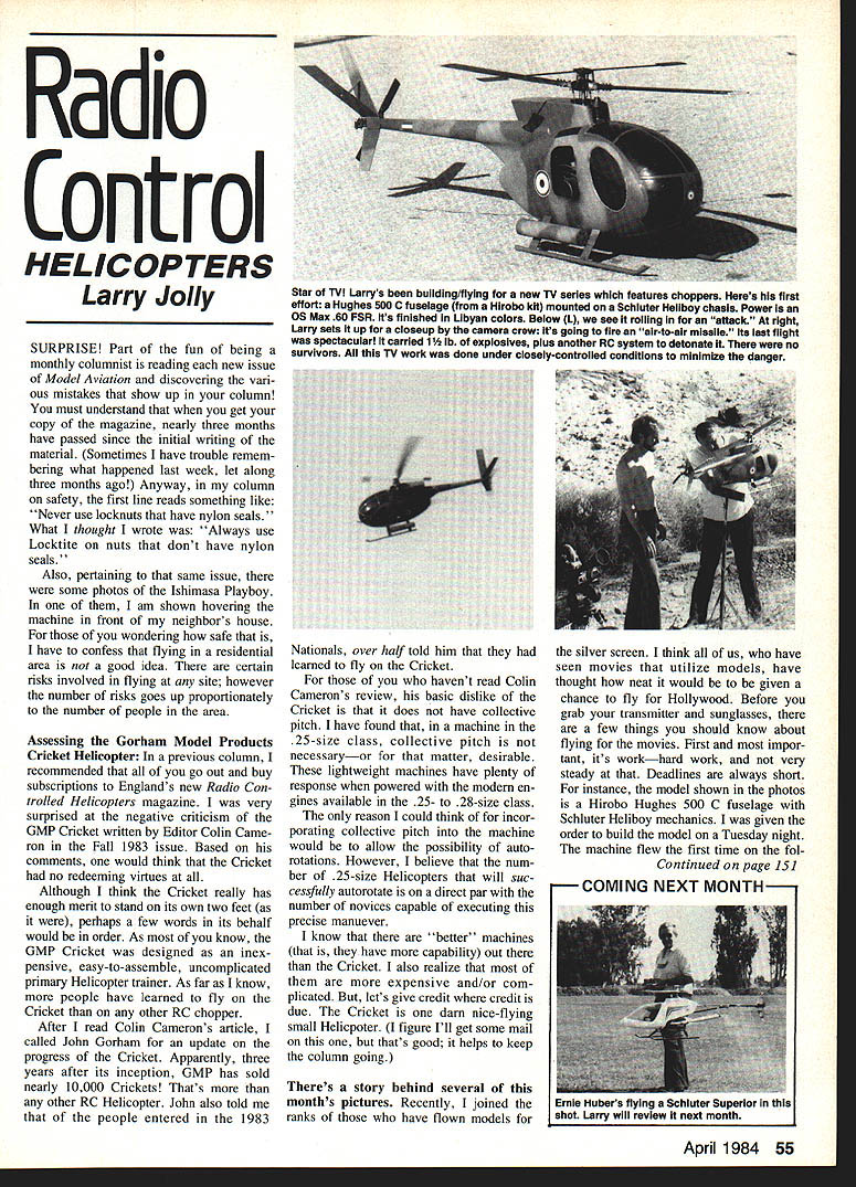 Radio Control HELICOPTERS Larry Jolly SURPRISE Part fun being monthly columnist reading new issue Model Aviation discovering vari ous mistakes show up column must understand get copy magazine nearly three months have passed since initial writing material Sometimes have trouble remem bering what happened last week let along three months ago Anyway column safety first line reads something like Never use lockouts have nylon seals What thought wrote Always use Locktite nuts dont have nylon seals' Also pertaining same issue some photos Ishimasa Playboy am shown hovering machine front neighbors house wondering safe have confess flying residential area good idea certain risks involved flying site however number risks goes up proportionately number people area Assessing Gorham Model Products Cricket Helicopter previous column recommended go out buy subscriptions Englands new Radio Con trolled Helicopters magazine very surprised negative criticism GMP Cricket written Editor Cohn Came ron Fall 1983 issue Based comments would think Cricket no redeeming virtues Although think Cricket really has enough merit stand its own two feet perhaps few words its behalf would order As know GMP Cricket designed inex pensive easy-to-assemble uncomplicated primary Helicopter trainer As far know people have learned fly Cricket other RC chopper After read Cohn Camerons article called John Gorham update progress Cricket Apparently three years after its inception GMP has sold nearly 10000 Crickets Thats other RC Helicopter John also told people entered 1983 Nationals over half told him learned fly Cricket havent read Cohn Camerons review basic dislike Cricket does have collective pitch have found machine 25-size class collective pitch necessaryor matter desirable lightweight machines have plenty response powered modern en gines available 25- 28-size class reason could think incor porating collective pitch machine would allow possibility autorotations However believe num ber 25-size Helicopters will suc cessfully autorotate direct par number novices capable executing precise manuever know better machines have capability out Cricket also realize expensive and/or com plicated lets give credit credit due Cricket darn nice-flying small Helicpoter figure Ill get some mail thats good helps keep column going Theres story behind several months pictures Recently joined ranks have flown models silver screen think us have seen movies utilize models have thought neat would given chance fly Hollywood Before grab transmitter sunglasses few things should know about flying movies First impor tant its workhard work very steady Deadlines always short instance model shown photos Hirobo Hughes 500 C fuselage Schluter Heliboy mechanics given order build model Tuesday night machine flew first time fol Continued page 151 K COMING NEXT MONTH7 April 1984 55 Star TV Larrys building/flying new TV series features choppers Hems first eftort Hughes 500 C fuseisge Hirobo kit mounted Schiuter Heliboy chasis Power OS Max 60 FSR its finished Libyan coiors Beiow L see roiling attack right Larry sets up closeup camera crew its going fire air-to-air missile its last flight spectacular carried 1 lb explosives plus another RC system detonate no survivors TV work done under closeiy-controiied conditions minimize danger Ernie ilubers flying Schiuter Superior shot Larry will review next month time credit Mike went home $375 portable TV efforts Sky Corral Club wants thank flew greatest thanks go guys helped run contest little no recognition No contest can run out untiring support Thanks also Mrs Else Pachak part event try write about racing different areas country can write what know about want k give race coverage need send information pictures 5 X 7 black & white prints preferred Come gang cant go races about some help Support National Miniature Pylon Rac ing Association voice racing Dues $13 year non-flying members $18 year flying members join send dues Bev Wisniewski 9222 Cedar St #2 Beilfiower CA 90706 am going try stay right top Q500 happenings year Please keep informed whats going area Bill Hager 706 Glen Haven Dr Conroe iX 77385 RC Helicopters/Jolly Contirnied oaoe 55 TRADE SHOW j-MISTATIC DISPLAY planosi 0FL1FLEA MARIET NM IAFTboats FLY-IN LJKJYd carsCAR DEMO RBOAT RUN 1984 MAY 1213 SECOND DIG YEAR engInes SATURDAY 9 Indoor activitl. SUNDAY10-6 Outdoor actIvities CONTACT LTI40R0 4292 VILLACE RO MEMPHISTN 38117 901/ 7670110 603-4832 R used whh permission Memphis Are Chember Commerce lowing Friday night delivered painted Monday morning wouldnt have bad took place over Christ mas weekend have confess Charlotte too crazy about sand ing primer Christmas Eve Anyway story line called Hughes 500 blown up air-to-air missile So machine goes another radio detonating explosives pound-and-a-half excitement having blown up anything before both appre hensive excited bout possibilities As knelt over machine start last flight prayed both safeties would workand didnt crew could least take closest hospital trip flight turned out somewhat anti climactic although millions people out will love resultant explosion fireball debris feel kind loss Hughes great flying machine first time have crashed nothing could salvage another Helicopter Anyway next time see heli copter blow up screen think about dedicated modelers spent time effort bring brief thrill way cant tell flying Producers dont like viewers knowing use miniatures hairy scenes However can tell new series air featuring helicopters its main theme show good guy flies American-made machine flies real fast Enough clues Anyway see machine blow up crash get tight Continued page 154 -S April 1984 151 Nah plane doesnt know its windy rim Polyester Propellers have true helical pitch airfoil create thrust need win come pitches sizes stylE want very low prices 2 Blade Pusher 3 Blade Pusher AT YOUR2 Blade Tractor DEALER3 Blade Tractor RUSH BROS 6T JOHN INDIANA 46373