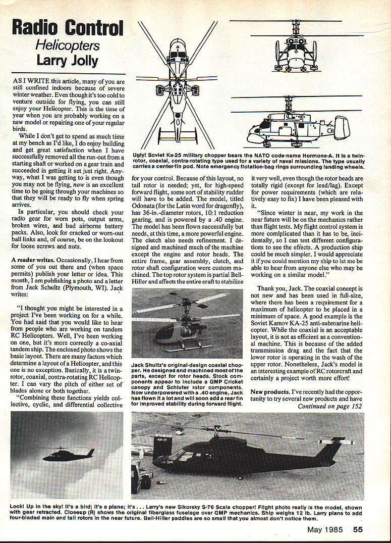 Radio Control Helicopters Larry Jolly AS WRITE article still confined indoors because severe winter weather though its too cold venture outside flying can still enjoy Helicopter time year probably working new model repairing regular birds dont get spend much time bench Id like enjoy building get great satisfaction have successfully removed run-out starting shaft worked gear train succeeded getting set just right Any way what getting though may flying now excellent time going through machines will ready fly spring arrives particular should check radio gear worn pots output arms broken wires bad airborne battery packs Also look cracked worn-out ball links course lookout loose screws nuts reader writes Occasionally hear some out space permits publish letter idea month am publishing photo letter Jack Schultz Plymouth WI Jack writes thought might interested project Ive working said would like hear people working tandem RC Helicopters Well Ive working its correctly co-axial tandem ship enclosed photo shows basic layout factors determine layout Helicopter no exception Basically twinrotor coaxial contra-rotating RC Helicop ter can vary pitch either set blades alone both together Combining functions yields col lective cyclic differential collective Ugly Soviet Ka-25 military chopper bears NATO code-name Hormone-A twinrotor coaxial contra-rotating type used variety naval missions type usually carries center-fin pod Note emergency flotation-bag rings surrounding landing wheels control Because layout no tail rotor needed yet high-speed forward flight some sort stability rudder will have added model titled Odonata Latin word dragonfly has 36-in-diaxneter rotors 101 reduction gearing powered 40 engine model has flown successfully needs time powerful engine clutch also needs refinement de signed machined much machine except engine rotor heads entire frame gear assembly clutch rotor shaft configuration custom ma chined top rotor system partial Bell Hiller affects entire craft stabilize very well though rotor heads totally rigid except lead/lag Except power requirements rela tively easy fix have pleased Since winter near work near future will mechanics rather flight tests flight control system comlplicated has inci dentally can test different configura tions see effects production ship could much simpler would appreciate could mention ship let able hear anyone else may working similar model Thank Jack coaxial concept new has used full-size has requirement maximum helicopter placed minimum space good example Soviet Kamov KA-25 anti-submarine heli copter coaxial acceptable layout efficient convention al machine because added transmission drag fact lower rotor operating wash upper rotor Nonetheless Jacks model interesting example RC rotorcraft certainly project worth effort May1985 55 Jack Shultzs original-design coaxial chop per designed machined parts except rotor heads Stock com ponents appear include GMP Cricket canopy Schiuter rotor components Now underpowered 40 engine Jack New products Ive recently oppor has flown lot will soon add rear fin tunity try several new products have Improved stability during forward flight Continued page 152 Look Up sky Its bird Its plane its. Larrys new Sikorsky S-76 Scale chopper Flight photo really model shown gear retracted Closeup R shows original fiberglass fuselage over GMP mechanics Ship weighs 12 lb Larry plans add four-bladed main tail rotors near future Beli-Hiller paddles small almost dont notice 4 THE COMPETITIONS VIEW 'I OF THE WINDSONG I. C, 0 0 N 0 DODGSON DESIGNS 2904 SW CAMANO DRIVE CAMANO ISLAND WA 9825i2J What makes Windsong best plane have deadair lightlift gusting 25 MPH winds thermal contest What makes windsong best plane have x-country race Some say 11to 1 aspect ratio clean solidcore wing no spoiler bays disturb airflow Others say Eppler 214 airfoil combined exclusive full-span camber changing capability including elevator compensated 80 degree flaps reflexible ailerons fact design innovations contribute Windsongs total design concept its unprecedented performance WITH THE WINOSONG THE WHOLE IS TRULY GREATER THAN THE SUM OF ITS PARTS Windsong 19995Camano 15995Pixy 14995 Send 2 stamps catalog VHS video tape too can made readily-avail able materials youll have build some sophisticated electronics make work Please forward questions SASE author Happy Electric Landings Bob Kopski 25 West End Dr Lansdale PA 19446 RC Giant Scale/Beckman Continued page 53 dont miss information con tact Lee Taylor 216 Willow Ave Rose ville CA 95678 phone number 916 783-4190 next have information all-time favorite events STARS Scale Rally Olean NY scheduled July 6 7 year another event limited Giant Scale dont see much else flying site hospitality fantastic place might see Giant Scale aircraft IMAA Fun-Fly Festival IMAA bash year set July 18-21 Mobile AL fifth year event note time change August July Like Nats FFF rotating around different loca tions year like idea since gives IMAA members around country chance participate what Im hearing will another great Im putting weight just reading menus picnic ban quet Yes Mortimer Giant Scalers other things besides fly big birds things eat info available Don Godfrey 91 Blackstone Ave Binghamton NY 13903 telephone 607 724-0115 Bob Beckman 8248 Holly Grove Ct Manassas VA 22110 RC Pylon Racing/Hager Continued page 54 does make wheel pants last longer Well doesnt shock actually destroys wheel pants eliminated attaching land ing gear General Electrics clear bath tub caulking compound assure get proper shock mount slide wheel pant up landing gear place caulking compound backside landing gear pant gear meet Slide back down line up hole gear pant clean unwant ed caulk away Caution Clean out screw hole could lock up wheels install Now assuming final attach ment ie wheel pants painted use Loc-Tite product secure wheels tighten down Allen wrench four-way wrench Place piece vinyl tape over hole unit complete experience using method has nothing con