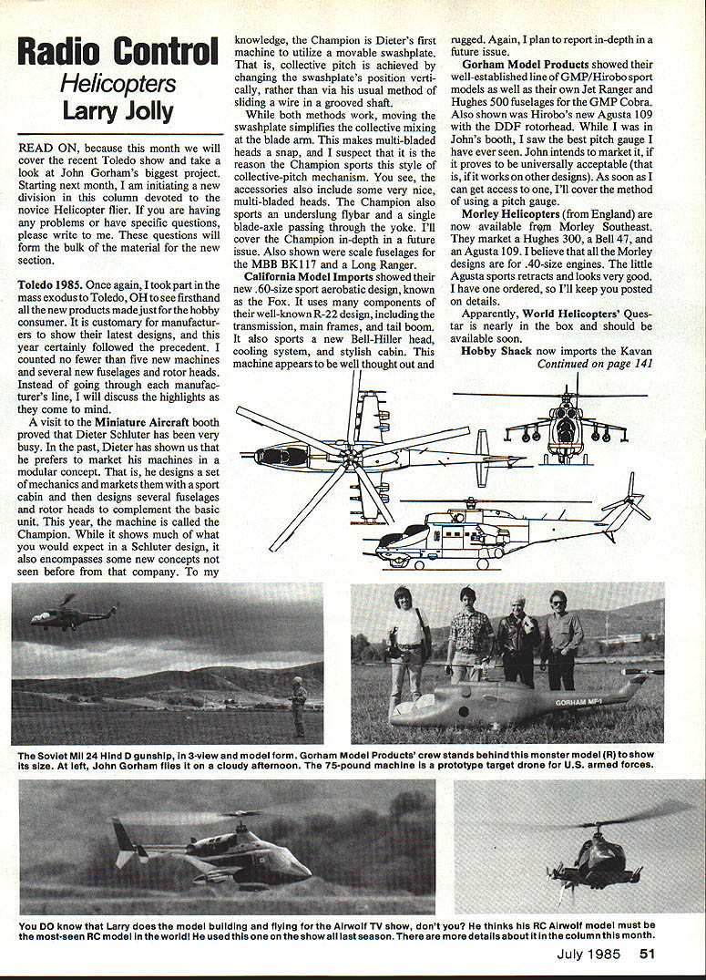 Radio Control Helicopters Larry Jolly READ ON because month will cover recent Toledo show take look John Gorhams biggest project Starting next month am initiating new division column devoted novice Helicopter flier having problems have specific questions please write questions will form bulk material new section Toledo 1985 Once again took part mass exodus Toledo OH see firsthand new products made just hobby consumer customary manufactur ers show latest designs year certainly followed precedent counted no fewer five new machines several new fuselages rotor heads Instead going through manufac turers line will discuss highlights come mind visit Miniature Aircraft booth proved Dieter Schluter has very busy past Dieter has shown us prefers market machines modular concept designs set mechanics markets sport cabin designs several fuselages rotor heads complement basic unit year machine called Champion shows much what would expect Schluter design also encompasses some new concepts seen before company knowledge Champion Dieters first rugged Again plan report in-depth machine utilize movable swashplate future issue collective pitch achieved Gorham Model Products showed changing swashplates position verti- well-established line OMP/Hirobo sport cally rather via usual method models well own Jet Ranger sliding wire grooved shaft Hughes 500 fuselages GMP Cobra both methods work moving Also shown Hirobos new Agusta 109 swashplate simplffies collective mixing DDF rotorhead blade arm makes multi-bladed Johns booth saw best pitch gauge heads snap suspect have ever seen John intends market reason Champion sports style proves universally acceptable collective-pitch mechanism see works other designs As soon accessories also include some very nice can get access Ill cover method multi-bladed heads Champion also using pitch gauge sports underslung flybar single Morley Helicopters England blade-axle passing through yoke Ill now available frn Morley Southeast cover Champion in-depth future market Hughes 300 Bell 47 issue Also shown scale fuselages Agusta 1091 believe Morley MBB BKl 17 Long Ranger designs 40-size engines little California Model Imports showed Agusta sports retracts looks very good new 60-size sport aerobatic design known have ordered Ill keep posted Fox uses components details well-known R-22 design including Apparently World Helicopters Ques transmission main frames tail boom tar nearly box should also sports new Bell-Hiller head available soon cooling system stylish cabin Hobby Shack now imports Kavan machine appears well thought out Continued page 141 Soviet Mu 24 HInd D gunship 3-view model form Gorham Model Products crew stands behind monster model R show Its size left John Gorham flies cloudy afternoon 75-pound machine prototype target drone US armed forces DO know Larry does model building flying Airwoif TV show dont thinks RC Airwoif model must most-seen RC model world used show last season details about column month July1985 51 RC Helicopters/Jolly Continued page 51 line look forward seeing something new Toledo saw several Scale machines static competition no less four Airwolf/Heim 22s very nice Jet Ranger excellent Hind Mil 24d constructed Mike Robbins Toledo always great show year no exception wish would move later year cold weather something else months photos During recent visit OMP able view new prototype Gorham MF-1 target drone machine 10-ft-long range word awesome Intended training aid armed services drone features 22-hp engine weighs 75 pounds fuselage one-fifth scale Mu 24 Hind D typical type operated Soviets As can seen photos MF-l fliesand does very well Im sure wish John well projectand way dont look local hobby shop month also have some pictures personal Airwolf model fea tures own fiberglass fuselage Heim retracts GMP Competitor mechanics rotorhead prototype flybarless design GMP engine OS 60 FSR-H has proved excel lent power li-lb machine particular model has approximately 40 hours failures speaks well components used off-the-shelf items months three-view large Soviet military helicopter design Mil 24 goes back late Sixties United States already realizing potential armed military machine Indeed era Bell came up successful Cobra design Soviets took little longer get gunship service Hind D has proved capable dealing machines Mil 24 very large 56 ft length also very fast Hind cruises 175 mph range holds two world speed records its class Because Hind features articulated rotorhead nimble its US counterparts can however transport squad eight troops scene battle offer standoff protection well definite tankbusting capabilities no wonder NATO concerned rapid develop ment deployment formidable weapon no kit Hind D however have one-twelth scale fuselage available youre planning conquest western Europe BCNU Lariy Jolly 5501 W Como Santa Ana CA 92703 WART Program/Bennett Continued page 54 wing area taken straight plans consider portion wing either passing through fuselage blanketed fuselage high wing Count area sticking out breeze area given square feet multiply 144 convert square inches airframe weight includes absolutely everything carried aloft exception rubber convert ounces grams multiply 29 Usually given plans accompanying article can worked out see Nitty-Gritty glide ratio consists distance traveled horizontally foot verti cal drop Imagine test-gliding finished well-trimmed model height 6 ft launch perfect model travels say 18 ft horizontally fore hits ground G 18/6 3 G value reflects two separate qualities lift drag airfoils speeds trim settings us employ lift coefficient pretty close 10 However drag can vary over wide range depending cleanliness configuration also models size models Jumbo Scale size range list configurations cor responding G values given G Table have worked out either using drag coefficient ooncepts have set in-flight observations use table search among configu rations until find something cor responds cleanliness model pick out proper G factor Also see Nit