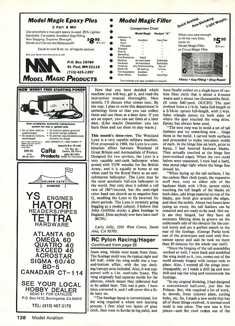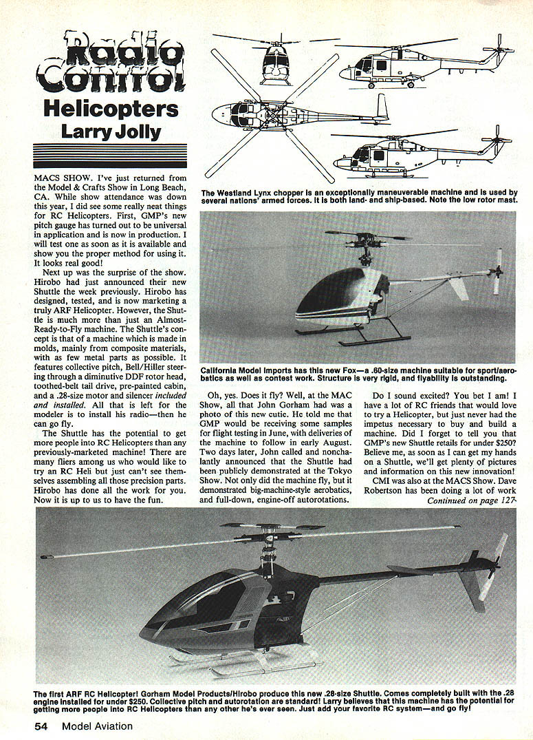 Helicopters Larry Jolly MACS SHOW Ive just returned Model & Crafts Show Long Beach CA show attendance down year did see some really neat things RC Helicopters First GMPs new pitch gauge has turned out universal application now production will test soon available show proper method using looks real good Next up surprise show Hirobo just announced new Shuttle week previously Hirobo has designed tested now marketing truly ARE Helicopter However Shut tle much just AlmostReady-to-Fly machine Shuttles con cept machine made molds mainly composite materials few metal parts possible features collective pitch Bell/Hiller steer ing through diminutive DDF rotor head toothed-belt tail drive pre-painted cabin 28-size motor silencer included installed left modeler install radiothen can go fly Shuttle has potential get people RC Helicopters previously-marketed machine fliers among us would like try RC Hell just cant see selves assembling precision parts Hirobo has done work Now un us have fun Westiand Lynx chopper exce tionally maneuverable machine used several nations armed forces bot land shlpbased Note low rotor mast Oh yes Does fly Well MAC Show John Gorham photo new cutie told GMP would receiving some samples flight testing June deliveries machine follow early August Two days later John called noncha lantly announced Shuttle publicly demonstrated Tokyo Show did machine fly demonstrated big-machine-style aerobatics full-down engine-off autorotations sound excited bet am have lot RC friends would love try Helicopter just never impetus necessary buy build machine Did forget tell GMPs new Shuttle retails under $250 Believe soon can get hands Shuttle well get plenty pictures information new innovation CMI also MACS Show Dave Robertson has doing lot o work Continued page 127 54 Model Aviation Calitornia Model imports has new Foxa 00-size machine suitable tor sportlasro batics well contest work Structure very rigid flyablilty outstanding first ARF RC Heilcopterl Gorham Model ProductelHirobo produce new 28-size Shuttle Comes completely built 28 engine installed under $250 Collective p Itch autorotatlon standard Larry believes mach mo has potential getting people RC Helicopters other hes ever seen Just add favorite RC systemand go flyl planes taxied right up give close look-see Long Distance award went Barry Baxter came way Westminster CA get plane up some good Wyoming flying weather Sunday afternoons flights punc tuated drawings prizes biggie being new JR radio went home Riverton Bill Carpenter events summer Rocky Mountain Region Casper always start close enough get next year DO IT Grab plane head Rockiesyou wont regret Once again thanks Joan Dale Alyea interesting report Bob Beckman 8248 Holly Grove Ct Manassas VA 22110 RC Helicopters/Jolly Continued page 54 people KG Japan Until recently KG has stuck scale semiscale machines Dave kept insisting real market US sport/aerobatic machine So people KG Dave Robertson put heads together voila Fox created Foxs vital stats 50-61-size motor 59-in rotor span 9A lbs all-up autorotation standard rotor head newly-developed Bell/Hiller unit independent blade damping have seen R-22 rotor head Fox very reminiscent flybar added Dave told Fox has strongest mechanics available Ill have show Dave what little black powder fire will pride joy seriousness Fox does look very strong very high quality recently opportunity fly Daves prototype very impressed Fox very aerobatic loops good rolls excellent par ticularly impressed way Fox tracked has very good natural feel hovers rock steady tracks well has very good following rate cyclic con trols also liked fact Fox did show tendency pitch up ward flight happens usual tendency rotor heads style damping Fox looks like winner Ill get some information pictures soon have time build Beginners Corner As promised new addition column month will cover new topic trials tribulations mastering nasty grassthrasher most-asked question get people interested starting RC Helicopters What best machine start Helicopters lot like radiossomeone said best radio have hand RIC Ts & Caps. Get Yours Today 4 tiC Pikd ReallyP White Navy CAPS ONLY $595 ea IaOIO WILD OICdivavy T-SHIRTS ONLY $95 ea 50% cotton/500/o polyester Available small medium larg x-large SPECIAL COMBO OFFER ONLY $995! Matching shirt cap set Adjustable back mesh sides size fits ORDER TODAY! Send check money order US Please dicate item style size color Dont forget mailing address Include $2 postage & handling per item Florida residents add 5% sales tax Allow 4-6 weeks delivery $150 NEW ONLY RIG HANDI-TRIMMER idoal trimm ing iron-on covoring Bright yellow doesnt got lost workbench Great field repairs Safety-lock feature helps prevent needless accidents Refillable Add 504 post & hand per trimmer SAVE Get HANOI-TRIMMER $100 T-shirt Cap Combo Get shop field Please include 50 post & hand per trimmer IS YOUR CLUB LOOKING FOR FUNDRAISER ASK ABOUT OUR CLUB DISCOUNT PROGRAM RC NOVELTIES RO BOX 840205 PEMBROKE PINES FL 33084 working guess great extent true People will tend recommend product have success truth matter can learn fly RC Helicopter now market difference much help will have other words complex machine help can expect need successfully build machine trim learn fly would suggest become acquainted local hobby shop machines stocks go out local flying field see yourself what machines people learning Now make friends fliers find out local instructor is introduce yourself ask him advice machines Chances will suggest several has favorable experiences Now decide machine will choose learn fly must have machine within capabilities buildand within economic budget way local shop does carry spares machine doesnt net get machine cannot get parts ex tremely important beginning able spend much time possible practicing machine down waiting spares will regress have learn over again September 1985 127 * * Long Engine Life * * Use BRU LINE Air Cleaner Completely Fuel Proof Nylon Rubber Parts Cat No 102 Air Cleaner 
