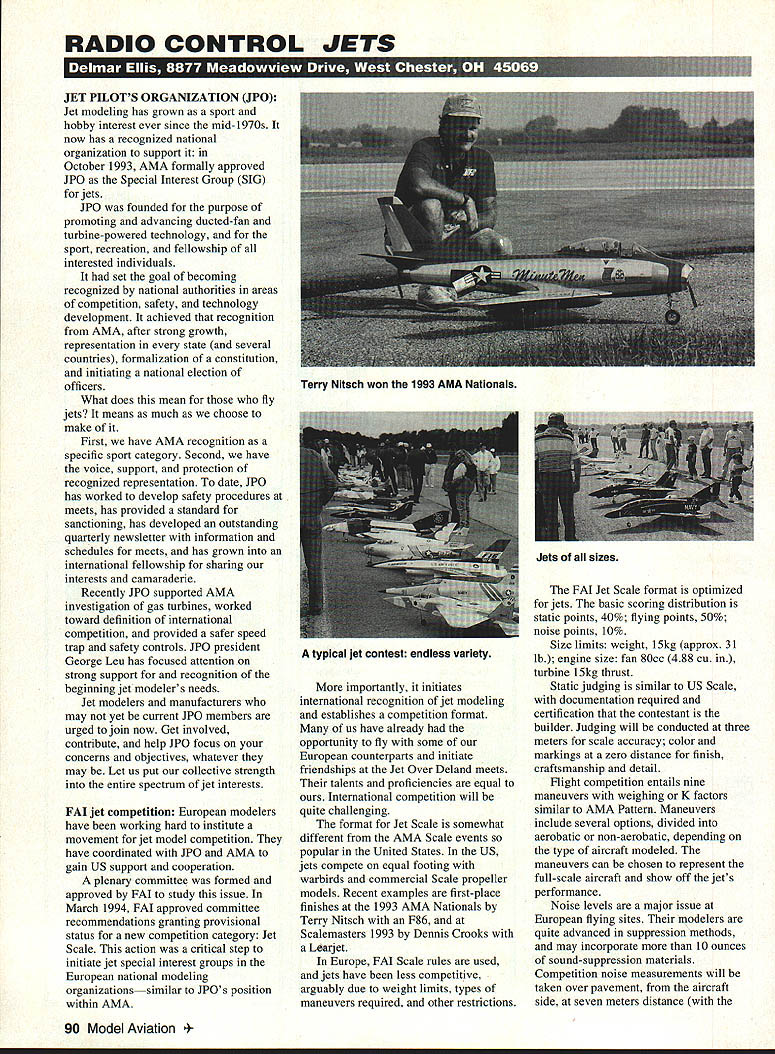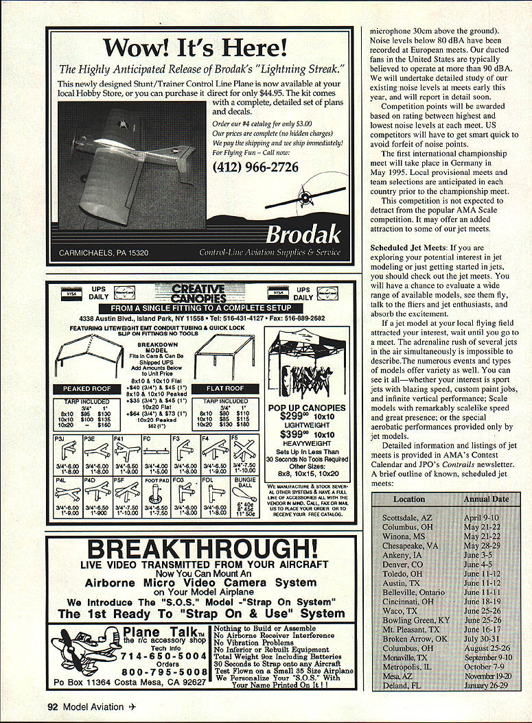 RADIO CONTROL JETS JET PILOTS ORGANIZATION JPO Jet modeling has grown sport hobby interest ever since mid-1970s now has recognized national organization support October 1993 AMA formally approved JPO Special Interest Group SIG jets JPO founded purpose promoting advancing ducted-fan turbine-powered technology sport recreation fellowship interested individuals set goal becoming recognized national authorities areas competition safety technology development achieved recognition AMA after strong growth representation state several countries formalization constitution initiating national election officers What does mean fly jets means much choose make First have AMA recognition specific sport category Second have voice support protection recognized representation date JPO has worked develop safety procedures meets has provided standard sanctioning has developed outstanding quarterly newsletter information schedules meets has grown international fellowship sharing interests camaraderie Recently IPO supported AMA investigation gas turbines worked toward definition international competition provided safer speed trap safety controls JPO president George Leu has focused attention strong support recognition beginning jet modelers needs Jet modelers manufacturers may yet current JPO members urged join now Get involved contribute help JPO focus concerns objectives whatever may Let us put collective strength entire spectrum jet interests FAI jet competition European modelers have working hard institute movement jet model competition have coordinated JPO AMA gain US support cooperation plenary committee formed approved FAL study issue March 1994 FAI approved committee recommendations granting provisional status new competition category Jet Scale action critical step initiate jet special interest groups European national modeling organizationssimilar JPOs position within AMA importantly initiates international recognition jet modeling establishes competition format us have already opportunity fly some European counterparts initiate friendships Jet Over Deland meets talents proficiencies equal International competition will quite challenging format Jet Scale somewhat different AMA Scale events popular United States US jets compete equal footing warbirds commercial Scale propeller models Recent examples first-place finishes 1993 AMA Nationals Terry Nitsch F86 Scalemasters 1993 Dennis Crooks Learjet Europe FAI Scale rules used jets have less competitive arguably due weight limits types maneuvers required other restrictions FAI Jet Scale format optimized jets basic scoring distribution static points 40% flying points 50% noise points 10% Size limits weight 15kg approx 31 lb engine size fan 80cc 488 cu turbine 15kg thrust Static judging similar US Scale documentation required certification contestant builder Judging will conducted three meters scale accuracy color markings zero distance finish craftsmanship detail Flight competition entails nine maneuvers weighing K factors similar AMA Pattern Maneuvers include several options divided aerobatic non-aerobatic depending type aircraft modeled maneuvers can chosen represent full-scale aircraft show off jets performance Noise levels major issue European flying sites modelers quite advanced suppression methods may incorporate 10 ounces sound-suppression materials Competition noise measurements will taken over pavement aircraft side seven meters distance 90 Model Aviation y Nitsch won 1993 AMA Nationals Jets sizes typical jet contest endless variety Wow Its Highly Anticipated Release Brodaks Lightning Streak newly designed Stunt/Trainer Control Line Plane now available local Hobby Store can purchase direct $4495 kit comes complete detailed set plans decals ___DAY 4338 Austin Blvd Island Park NY 11558 516-4314127 516-889-2682 FEATURING UTEWEIGHT EUT CONDUIT TUBING & QUICK LOCK SUP ON FIlliNGS NO TOOLS BREAKDOWN MODEL Fits In Cars & Can Shipped UPS Add Amounts Below Unit Price 8x10 & lOxlO Flat 440 3/4 & $45 V 5x10 & 10x10 Peaked 535 3/4 & $45 1 10x20 Flat 564 3/4 & $73 P 10x20 Peaked $62 1 F1NCLt5fl l3/411 BxiO $80 SilO liOslO $55 $116 P3JP35P41PCF3 Z 3/4-6003/440034 6503/4-4 003/4-6003/4-6503/4-760 1-5001-800 1 9001 5001 8001-900P-1000 P4LP40PSFFOOT PAD P03FOLBUNGlE 3/4-6003/4-6S03/47503/4-6503/46003/4-600 P900V900 1 10001 760I 800P-800 WE MAMJFACIURE & STOaC SEVER AL OThER SYSTEMS & HAVE FLIL IKE OF ACCESEORIES Mi WITh ThE VENDOR ii MW Csa FAX OR MAt US TO PIACE YOUR ORDER OR TO RECEF/E YOUR FREY CATALOG BREAKTHROUGH LIVE VIDEO TRANSMITTED FROM YOUR AIRCRAFT Now Can Mount An Airborne Micro Video Camera System Model Airplane Introduce SOS Model -Strap System 1st Ready Strap & Use System Plane Talk11 nc accessory shop Tech Info 714-650-5004 Orders 800-795-5008 Pa Box 11364 Costa Mesa CA 92627 Nothing Build Assemble No Air~e Receiver Interference No Vibration Problems No Inferior Rebuilt Equipment Total Weight 9oz Including Batteries 80 Seconds Strad onto Aircraft Test Flown mall 35 ize Airplane We Personalize SOS microphone 30cm above ground Noise levels below 80 dBA have recorded European meets ducted fans United States typically believed operate 90 dBA will undertake detailed study existing noise levels meets early year will report detail soon Competition points will awarded based rating between highest lowest noise levels meet US competitors will have get smart quick avoid forfeit noise points first international championship meet will take place Germany May 1995 Local provisional meets team selections anticipated country prior championship meet competition expected detract popular AMA Scale competition may offer added attraction some jet meets Scheduled Jet Meets exploring potential interest jet modeling just getting started jets should check out jet meets will have chance evaluate wide range available models see fly talk fliers jet enthusiasts absorb excitement jet model local flying field attracted interest wait until go meet adrenaline rush several jets air s