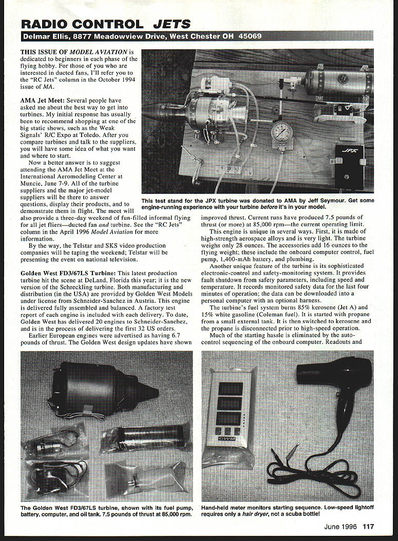 RADIO CONTROL JETS THIS ISSUE OF MODEL AVIATION dedicated beginners phase flying hobby interested ducted fans Ill refer RC Jets column October 1994 issue MA AMA Jet Meet Several people have asked about best way get turbines initial response has usually recommend shopping big static shows such Weak Signals RIC Expo Toledo After compare turbines talk suppliers will have some idea what want start Now better answer suggest attending AMA Jet Meet International Aeromodeling Center Muncie June 7-9 turbine suppliers major jet-model suppliers will answer questions display products demonstrate flight meet will also provide three-day weekend fun-filled informal flying jet fliersducted fan turbine See RC Jets column April 1996 Model Aviation information way Telstar SKS video production companies will taping weekend Telstar will presenting event national television Golden West FD3/67LS Turbine latest production turbine hit scene DeLand Florida year new version Schreckling turbine Both manufacturing distribution USA provided Golden West Models under license Schneider-Sanchez Austria engine delivered fully assembled balanced factory test report engine included delivery date Golden West has delivered 20 engines Schneider-Sanchez process delivering first 32 US orders Earlier European engines advertised having 67 pounds thrust Golden West design updates have shown improved thrust Current runs have produced 75 pounds thrust 85000 rpmthe current operating limit engine unique several ways First made high-strength aerospace alloys very light turbine weighs 28 ounces accessories add 16 ounces flying weight include onboard computer control fuel pump 1400-mAb battery plumbing Another unique feature turbine its sophisticated electronic-control safety-monitoring system provides fault shutdown safety parameters including speed temperature records monitored safety data last four minutes operation data can downloaded personal computer optional harness turbines fuel system burns 85% kerosene Jet 15% white gasoline Coleman fuel started propane small external tank switched kerosene propane disconnected prior high-speed operation Much starting hassle eliminated autocontrol sequencing onboard computer Readouts June1996 117 test stand JPX turbine donated AMA Jeff Seymour Get some engine-running experience turbine before its model Golden West FD3/67LS turbine shown its fuel pump battery computer oil tank 75 pounds thrust 85000 rpm Hand-held meter monitors starting sequence Low-speed lightoft requires hair dryer scuba bottle next-sequence-initiate light diodes located hand-held meter disconnected before flight Flight operation also computer controlled directed throttles receiver channel directs throttle modulating fuel flow pressure variable pump control does require separate throttle servo Another advantage engine simple installation Engine mounts provided optional extractor tailpipe available Golden West Inlet air dumped fuselage used plenum engine intake allows simple-and-easy installation minimum ducting scuba bottle required starting Due turbines light rotor low-drag seals axial turbine very low-speed lightoff hair dryer blowing inlet required Golden West offers hair dryer designs approach keep keep things simple let computer work limited thrust requires careful aircraft selection attention its weight during construction also has keep mind 50 ounces fuel required liftoff will weigh approximately 26 pounds An aircraft gross weight up approximately 15 pounds should acceptable Initial flying examples utilized standard 50-ounce RC fuel tank After unfortunate accident DeLand 96 future installations will incorporate multiple graphite-reinforced tanks AMAs Turbine Committee recently received turbines evaluation plan install CS Models Terminator weight goal 85 pounds dry 11 pounds gross takeoff hope explore full performance potential engine Whats Next After Buying Turbine Hopefully selected turbine also selected first aircraft application youre building model get some enginerunning experience Build yourself simple test stand can simple mounting board pick ground crew get enough runs comfortable turbine operation Undoubtedly will have picked up some experience manufacturers ground school bought engine Test-running gives opportunity gain some confidence evaluate fuel oil consumption flight duration Note variation consumption throttle settings ambient temperature Practice fueling starting procedures Good luck 1996 Summer Thunder April column described ideal jet Field Hebron Ohio previous years site jet nationals year informal Summer Thunder jet meet will held July 27-28 will feature fun flying no competition trophies Door prizes will given out Speed traps will available information readings Additional entertainment will available Saturday hot rod custom car cruise-in will held parking area Night Fire will held nearby NHRA drag strip Saturday night will feature gas-turbine-powered drag racing will blast magnificent proportions didnt really think would get too far away turbines did entry fee jet meet $15 day $20 weekend Special admission prices drag race being negotiated RC Bloopers Video fortunate have SKS Telstar sources quality videotapes jet events new tape just released SKS particularly delightful am crashes negative aspects hobby did find SKS new RC Bloopers tape entertaining thoughtprovoking Although spares no including yours truly shows vulnerability sensitivity footage up-close provides great detail includes ducted fans turbines Scale Masters competition Modei Aviation Guii siai winner Hot scale jii 6nter UULiI1 Lrn Easy tu see easy land u1mer iVCflLK 1nJ says cant sport fly jet Speed recoro noiaer 240 mph SPEND SIX BUCKS SAVE BUNDLE Thinking jets2 Think about modelers choosing BVM jets start because theyre far away best engineered complete highest performing Just attend jet fly see yourself So often after modelers built flown BVM jet tell us gosh wish Id bought BVM jet first Buy cheap buy twice never rang truer youre inter