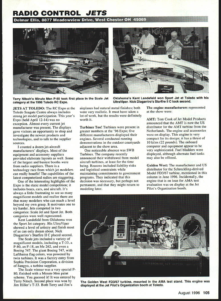 RADIO CONTROL JETS JETS AT TOLEDO RC Expo Toledo Seagate Centre always includes strong jet model participation years Expo held April 12-14 no exception Almost current jet manufacturer present displays gave visitors opportunity shop investigate newest products technologies talk supplier sources counted dozen jet-aircraft manufacturers displays Most equipment accessory suppliers provided elaborate layouts well Some largest busiest booths radio suppliers technology race jet modelers can really benefit capabilities latest computerized radios staggering interesting highlights Expo static model competition includes boats cars aircraft Its always little frustrating see magnificent models realize modelers can reach level beyond own grasp motivates try harder Jets competed two categories Scale Jet Sport Jet Both categories well represented Kent Landefeld Oklahoma won Sport Jet category UltraViper showed level artistry finish us can dream about Nick Diagarriros Starfire II C placed second Scale jets included variety magnificent models including T-33 P-80 F-18 262 Boeing 747 giant Boeing 747 Lufthansa flag colors powered twin turbines factory entry Sophia Precision Corporation division Sangyo turbine supplier Scale winner very special P SO finished Minute Men paint scheme guessed entered Terry Nitsch Second place won Jim Hillers T-33 Both Terry Jims airplanes natural metal finishes both very realistic must have taken lot work results definitely worth Turbines Too Turbines present greater numbers 96 Expo five different manufacturers displayed engines Several conducted running demonstrations outdoor courtyards adjacent show area noticeable absence SWB Turbines company recently announced withdrawal model aircraft turbines least time being Reasons included liability risks logistical constraints maintaining commitments government programs indicated decision necessary perhaps permanent might return modeling later engine manufacturers represented show AMT Tom Cook Jet Model Products announced AMT now US distributor AMT turbine Netherlands engine accessories display engine very compact its design has thrust 10 kilos 22 pounds onboard computer equipment appear very sophisticated Fuel bladders displayed although alternate fuel tanks may also offered Golden West manufacturer US distributor Schreckling-derived Model FD3167 turbine mentioned column June 1996 Incidentally engine loan AMA test evaluation display Jet Pilots Organization booth August1996 105 Terry Nitschs Minute Men P-80 took first place Scale Jet category 1996 Toledo RC Expo Oklahomas Kent Landefeld won Sport Jet Toledo UltraViper Nick Diagarriros Starfire ii C took second Golden West FD3167 turbine mounted AMA test stand engine displayed Jet Pilots Organization booth Toledo five minutes can upgrade stan dard Futaba Airtronics servos ball bearing servos new EMS Ball Bearing Conversion Kit New case tops accurately molded super tough glass filled fuel-proof Celcon include top quality stainless steel ball bearing servo output shaft * Stops case top and/or plastic bushing wear * Prevents output gear shaft shimmy * Reduces friction improves servo centering * Enhances performance airplanes boats & cars * Mandatory helicopter servos * Free output arm provided case top * Guaranteed against breakage year * Why pay $3995 $2995 -1Fits FUTABA S28/S 128 S38/S 138 S48/S148 Servos set 4$2595 0-2As above set 1$695 0-3Fits AIRTRONICS 94102 Servos set 4$2595 IBC4As above set 1$695 BBC-5 Ball Bearing Only JR 501 507 RCD APOLLO 05 10 FOCUS HS300 HS500 ACE 330342 342HS TOWER TS-51 Servos set 4$1995 Add $300 Shipping Handling orders tl4 692-1393 Info Only california Residents Add 775% Sales Tax 800 845-8978 Orders Only vISA MASTERCARD Accepted Typhoon 22 Special Order Pre-built Parts Honeycomb Top Bottom Turtle Deck$325 Built-up Glassed wing Panels$395 complete Honeycomb Fuselage & Fin$595 Foam cores wing Tail$95 rlans -909 sq version 2 Sheets $1595 Plans 1000 sq version 2 Sheets $1595 Plans-1l4OSq ln22version 2Shts $1995 Fiberglass cowl 909 & 1000 $2195 Fiberglass cowl 22 version $2195 clear canopy versions $1495 wing Tube & Socket 7/8 x 24 $1195 wing Tube & Socket 7/8 x30 22 $119S Plug-In Wing Adluster Kit 4-Pack $1295 Plug-In Adlustable Stab Kit $995 R3713 Pompano Drive Pensacola FL 32514 Phone 904 494-0203 RIC Products Inc /MasterCard Welcomed $450 per item S&H esidents add 6% Tax HIGHEST UALITV TOP PERFORMANCE COMPETITIVE PRICES ALL ENGINES INCLUDE Sacha Dolmar cylinder Crankshaft Aasemblies OH Electronics heavy duty Ignition aystem Bosch plug cover year limited warranty parts labor Tapped smoke Walbro carburetor ran end ready fly OPTIONAL EQuIPMENT Single bolt prop adapter Tilloston in-l 46 HOURSS & H $1200 Spm-lOpm Mon -FriPrloea aubject lO*n-4pmto change noitoe 11 ILL RvLNtk EXSIOR SPGS. MD 84024 QUALITY BUILT GIANT SCALE ENGINES 8181830-5140 ENGINES SSORIES ICEFAX 818 8373890 engine produces 75 pounds thrust using kerosene/gasoline fuel mixture has very sophisticated control safety-monitoring system JPX-Bob Violett Models BVM BVM well-known distributor JPX turbine well extensive line jet models fans engines accessories large display booth just-released JPX Model 260 engine shown engine update result field experience factory technical refinements engine now has improved thrust result major redesign redesign now eliminates automotive rotor components favor factoryengineered produced parts BVM also introduced area-ruled closed-flowpath duct system JPX engine very compact wellengineered beautifully finished includes very lightweight doubleannular tailpipe fabricated stainless steel duct systems should already available turbine-powered versions BVMs T-33 P-80 either new turbine kits engineconversion kit form BVM also offers turbine groundsupport equipment including flightbox built-in air-blower system temperature monitoring system scuba air tank systems including regulators fire extinguishers propane bottles bottom safety feed Sangyo This engine currently productio
