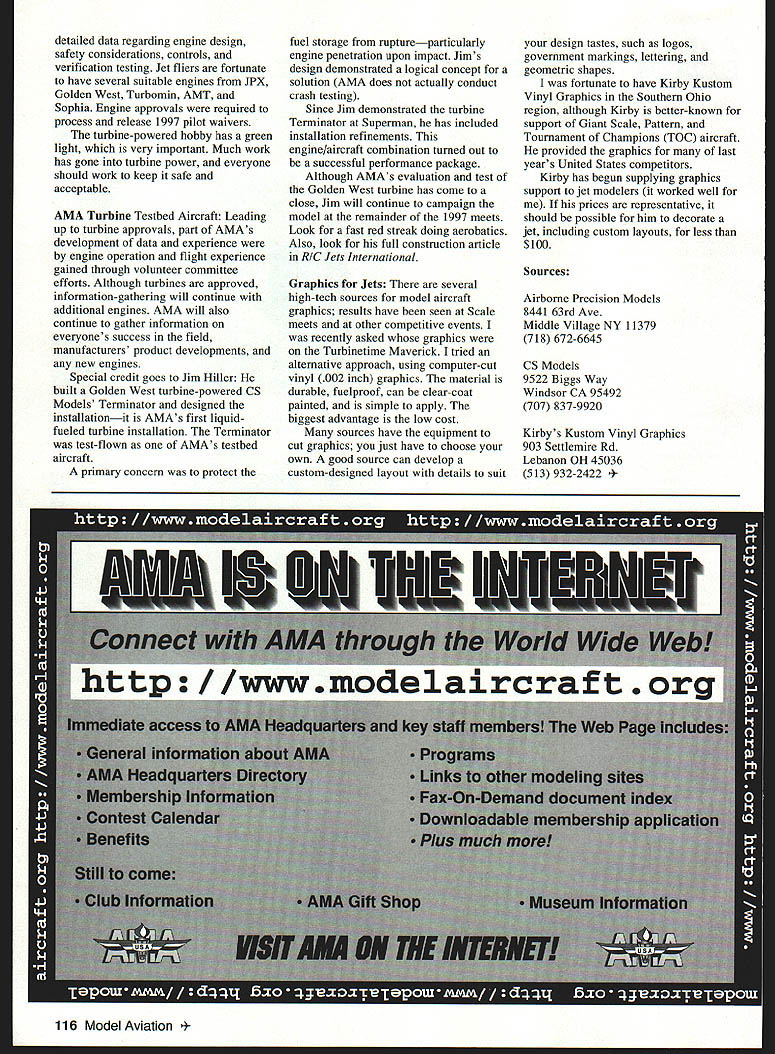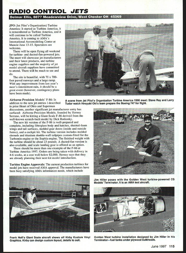 RADIO CONTROL JETS JPO Jet Pilots Organization Turbine America started Turbine America remembered Turbine America will continue called Turbine America coming AMAs International Aeromodeling Center Muncie June 13-15 Spectators welcome will open flying weekend turbine- ducted-fan-powered jets meet will showcase jet manufacturers latest products turbine engine suppliers majority jet model aircraft suppliers have committed attend will much see site beautiful 70 x 700foot paved runways large ramp improvement last years meets intermittent rain should great event however contingency plans have made Airborne Precision Models F-86 addition new jet entries described prior Heart Ohio Superman discussions another significant jet manufacturer entry has surfaced Airborne Precision Models founded Herney Serrano will kitting Giant Scale F-86 derived well-known scratch-built model Dick Rotkosky new kit version F-86 well-prepared complete including fiberglass body hatches sheeted-foam wings tail surfaces molded gear doors inside outside forms cockpit kit turbine version includes molded shrouds titanium double-wall tailpipes custom-fitted Turbomin engine Sophia engine finished weight turbine should about 23 pounds ducted-fan version also available scale landing gear offered option should example F-86 Turbine America 1997 Orders being taken delivery 4-6 weeks cost well below $2000 Herney says already planning next kit model introduction Turbine Engine Approvals current production turbines model jets have received AMA approval manufacturers have busy satisfying AMA information needs include June1997 115 scene Jet Pilots Organization Turbine America 1996 meet Steve Ray Larry Tudor watch Hiroyuki Okis team prepare Boeing 747 flight Jim Hiller poses Golden West turbine-powered CS Models Terminator AMA test aircraft Frank Nolls Giant Scale aircraft shows off Kirby Kustom Vinyl Graphics Kirby can design custom layout details suit Golden West turbine installation designed Jim Hiller Terminatorfuel tanks under plywood bulkheads detailed data regarding engine design safety considerations controls verification testing Jet fliers fortunate have several suitable engines JPX Golden West Turbomin AMT Sophia Engine approvals required process release 1997 pilot waivers turbine-powered hobby has green light very important Much work has gone turbine power everyone should work keep safe acceptable AMA Turbine Testhed Aircraft Leading up turbine approvals part AMAs development data experience engine operation flight experience gained through volunteer committee efforts Although turbines approved information-gathering will continue additional engines AMA will also continue gather information everyones success field manufacturers product developments new engines Special credit goes Jim Hiller built Golden West turbine-powered CS Models Terminator designed installationit AMAs first liquidfueled turbine installation Terminator test-flown AMAs testbed aircraft primary concern protect fuel storage ruptureparticularly engine penetration upon impact Jims design demonstrated logical concept solution AMA does actually conduct crash testing Since Jim demonstrated turbine Terminator Superman has included installation refinements engine/aircraft combination turned out successful performance package Although AMAs evaluation test Golden West turbine has come close Jim will continue campaign model remainder 1997 meets Look fast red streak doing aerobatics Also look full construction article RIG Jets International Graphics Jets several high-tech sources model aircraft graphics results have seen Scale meets other competitive events recently asked graphics Turbinetime Maverick tried alternative approach using computer-cut vinyl 002 inch graphics material durable fuelproof can clear-coat painted simple apply biggest advantage low cost sources have equipment cut graphics just have choose own good source can develop custom-designed layout details suit design tastes such logos government markings lettering geometric shapes fortunate have Kirby Kustom Vinyl Graphics Southern Ohio region although Kirby better-known support Giant Scale Pattern Tournament Champions TOG aircraft provided graphics last years United States competitors Kirby has begun supplying graphics support jet modelers worked well prices representative should possible him decorate jet including custom layouts less $100 Sources Airborne Precision Models 8441 63rd Ave Middle Village NY 11379 718 672-6645 CS Models 9522 Biggs Way Windsor CA 95492 707 837-9920 Kirbys Kustom Vinyl Graphics 903 Settlemire Rd Lebanon OH 45036 513932-2422 Model Aviation w modelaircraft o