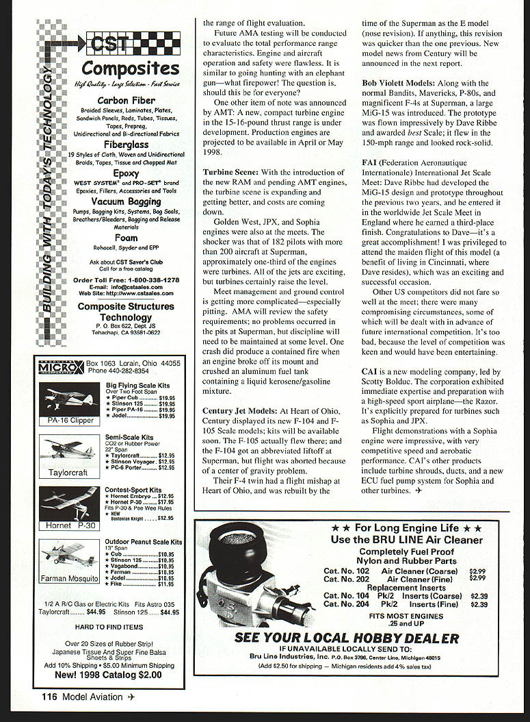 RADIO CONTROL JETS JET FLYING reaches new heights late summer fall Two outstanding jet meets Midwest famous level activity quality participation new product introductions Heart Ohio late August Superman early October Rather review meets Ill discuss new products shown next report will present some individual entries RA Microjet Turbomin USA Florida has renamed RA Microjet RAM company will still distribute Turbomin engines introducing new line turbine engines produced US new RAM turbine offered two versionsone size 13 17 pounds thrust difference controller settings buy both controllers can vary thrust settings same engine different-weight aircraft price less $2600 deliveries scheduled start November 1997 Heart Ohio RAM turbine demonstrated bench test After 75 starts runs witnesses became convinced about ease operation reliability engine starts propane switches Jet kerosene Controls simple safety features built Prior Superman RAM received Academy Model Aeronautics AMA formal approvals turbine Superman engine demonstrated Bob Violett Models Bandit Garland Hamilton conducted demonstration flights Performance engine/aircraft combination remarkable aircraft already superior aerobatic performance speed blazing engine usually unflappable Garland visibly excited nearly jumping up down might want AMT production AMT turbine demonstrated both Midwest meets two magnificent aircraft utilized first well-known Wee Two JMP T-33 other new BVM F-4 single engine 22 pounds thrust engine exhausts through bifurcated exhaust duct worked great BVM F-4 already well-known its high-velocity performance elevated giant step turbine model looked supersonic down deck Dont surprised installation becomes available production package its too good pass upthe ultimate combination single large-engine bifurcated-duct approach seems practical simple reliable think act cant matched theres AMT presented its new 35-pound thrust turbine installed Yellow Aircraft Giant Scale F-18 also bifurcated exhaust duct could demonstrated during sanctioned meet because exceeded AMA regulations single-engine thrust However did get see fly after hours AMA Turbine Committee has commissioned AMA conduct variety special tests including flight test over-reg thrust level order conduct tests committee members have issued special AMA waivers extending allowable range operations Terry Nitsch committee member test pilot AMT engine real horse Holding aircraft against full thrust during runup revelation requires persons concentrated effort flight performance exciting thing since Big Red F-18 SWB prototype Seymour turbine gets up goes initial flight extraconservative particularly since weight balance biased toward tail-heaviness flight after weight corrections extended February 1998 115 single-engine BVM F-4 housed new AMT turbine demonstrationgreat combination Pilot Terry Nitsch center RA Microjet turbine test stand Heart Ohio After 75 runsDave Ribbe MiG-15 after maiden flight Model pilot went engine proved reliability ease operationto win third place Jet Scale meet England Composites $6 ______________ L~u Carbon Fiber Braided Sleeves Laminates Plates Sandwich Panels Rods Tubes Tissues Tapes Prepreg Un d red anal Bi-directional Fabrics Fiberglass 19 Styles Cloth Woven Unidirectional Braids Tapes Tissue Chopped Mat Epoxy SYSTEM PftO-SET5 brand Fillers Accessories Tools Vacuum Bagging Pumps Bagging Kits Systems Bag Seals Breathers/Bleeders Bagging Release Materials Foam Rohacell Spyder EPP U, Ask about CST Savers Club Call free catalog Order Toll Free 1-800-338-1278 E-mail info@cstaalescom Web Site httIIwwwcstsaIescom Composite Structures Technology P o Box 622 Dept JS Tehachapi CA g3581-o622 Box 1063 Lorain Ohio 44055 P hone 440-282-8354 Ki~er rcraft [nysquItJ Big Flying Scale Kits Over Two Foot Span * Piper Cub$1995 * Stinson 125$1995 * Piper PA-16$1995 * Jodel$1995 Semi-Scale Kits G02 Rubber Power 22 Span * Taylorcraft 1295 * Stinson Voyager $1295 * PC-6 Porter 1295 Contest-Sport Kits * Hornet Embryo . $1295 * Hornet P-30 795 Fits P-30 & Pee Wee Rules * NEW Bnstonian Knight$1295 Outdoor Peanut Scale Kits 13 Span * Cub$1995 * Stinson 125$1995 * Vagabond$1995 * Farman$1995 * Jodel$1995 *Fike$1195 1/2 RIO Gas Electric Kits Fits Astro 035 Tayloreraft$4495 Stinson 125$4495 HARD TO FIND ITEMS Over 20 Sizes Rubber Stripl Japanese Tissue Super Fine Balsa Sheets & Strips Add 10% Shipping Minimum Shipping New 1998 Catalog $200 116 Model Aviation range flight evaluation Future AMA testing will conducted evaluate total performance range characteristics Engine aircraft operation safety flawless similar going hunting elephant gunwhat firepower question should everyone other item note announced AMT new compact turbine engine 15-16-pound thrust range under development Production engines projected available April May 1998 Turbine Scene introduction new RAM pending AMT engines turbine scene expanding getting better costs coming down Golden West JPX Sophia engines also meets shocker 182 pilots 200 aircraft Superman approximately one-third engines turbines jets exciting turbines certainly raise level Meet management ground control getting complicatedespecially pitting AMA will review safety requirements no problems occurred pits Superman discipline will need maintained some level crash did produce contained fire engine broke off its mount crushed aluminum fuel tank containing liquid kerosenelgasoline mtxture Century Jet Models Heart Ohio Century displayed its new F-104 F105 Scale models kits will available soon F-105 actually flew F-104 got abbreviated liftoff Superman flight aborted because center gravity problem F-4 twin flight mishap Heart Ohio rebuilt time Superman E model nose revision anything revision quicker previous New model news Century will announced next report Bob Violett Models Along normal Bandits Mavericks P-80s magnificent F-4s Superman large MiG-15 introduced prototype flown impressively Dave Ribbe awarded best Scale flew 150-mph range looked rock-solid FAI