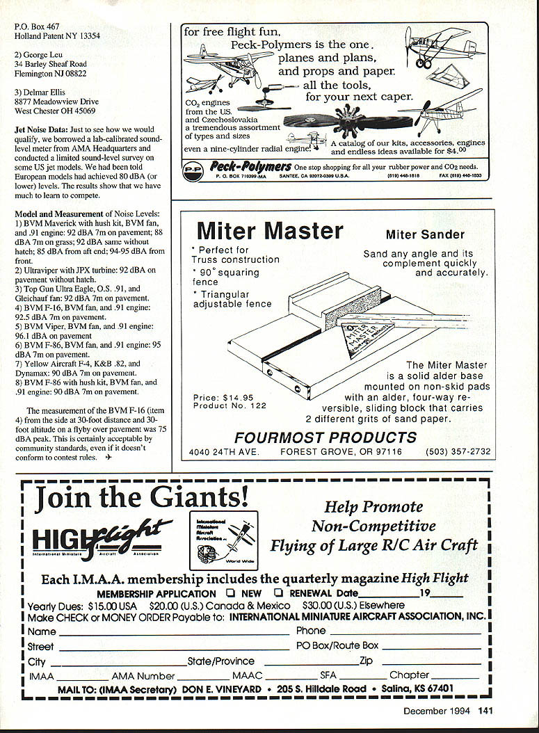RADIO CONTROL JETS U PIJ .1a ND SUPPORT Dont forget important ground support flying hobby jets otherwise consent support spouse may have noticed model flying predominanfly male avocation understanding approval time financial commitment intense focus required fly jets borders veto power have wifes approval consider yourself blessed participates openly doubly blessed thought lost wifes support just making transition jets club invited Teny Nitsch put jet-flying demonstration under pressure Sandy agreed attend witness firsthand jet thing about talked endlessly Tenys wife Sheila came ground support removed model van took off wing mittens wiped down already spotless informed Terry could fuel started together Sheila carried out spotted runway became backup-person during flight After landing Terry returned radio impound Sheila retrieved model inspected wiped down again Jean Famey tapped Sandy arm announced Now Mrs Del thats new job sure cause just became hopeless never lost support approval Believe recognize very special blessing see some special wives Fan-Flys become pit crew spotters like Sheila Sandy Any ladies pack up attend meets supportive share time away home deserve special recognition bring kids weekend must really saints season love gift giving dont forget spouseyour important supporter life Maybe could give new radio set great-looking scale wheels built-in brakesor own model Gas Turbine Development US manufacturers developing gas turbine model products anticipation future AMA acceptance old news Bob Violett Models has assumed role sole US dealer IPX turbines update developing T-33 F-80 models turbine including integrated flow duct system could available early 1995 Jet Model Products has also initiated development Starfire T-33 models turbines Final development testing awaits engine availability SWB SWB has redesigned gas turbine produce 20 pounds thrust SWB has confirmed new SWB-4 kerosene fueled model turbojet engine successfully run during 1994 summer benchtesting will test-flown JMP T-33 fall 1994 engine smaller version SWB-3 turbojet captured interest US model jet community used Yellow Aircrafts F-l8 over last two years Development plans indicate new engine T-33 combination would ready perform flight demonstrations October 1994 Tournament Champions Las Vegas International Jets Over Deland January 1995 Full production could initiate 1995 turbojet will have future other aircraft suitable models developed modified manufacturers appear taking thorough in-depth development approach expediting production plans encouraging think end products will results extensive testing system integration kind responsible approach will help win final acceptance FAI Jet Scale July Model Aviation sketched upcoming FAI Jet Scale format notified new rule clarifications changes 1 aircraft must qualify 90 dBA noise limit compete 2 Gas turbine thrust limit 10 kg static approximately 22 pounds 3 Maximum aircraft weight 15 kg approximately 33 pounds 4 Jettisonable items must same no duplicates both static flying 5 flights two highest scores three flights count 6 PilotlBuilder Pilot must sole builder immediately questioned noise limitation level response noise limits under further review will change years end Final limits expected revised upward 92 93 dBA over grass seven meters noise measurements taken instrument meter above ground model stand addition 2-4 dBA handicap being considered multiengined entries changes will make big difference US representatives becoming qualified still have compete noise-level judged points first international championship meet will held Leipheim Germany ex NATO air base late August 1995 Entries must confirmed June 1 United States allowed send up five representatives compete Jet Pilots Organization JPO has appointed planning committee help US applications selection coordination need survey interest participation determine whether qualifier meet necessary need JPO member participate Travel costs responsibility competitor understand pilots pit crew team managers will permitted free use base barracks facilities Inexpensive hotels also reported nearby interested important drop note competition committee know proceed 1 Art Arro 140 Model Aviation Violett Models F-80 1994 Jets Over Deland Bob developing F-80 T-33 JPX turbine SWB-4 kerosene-powered turbojet successful 1994 bench-testing will test-flown T-33 fall 1994 PO Box 467 Holland Patent NY 13354 2 George Leu 34 Barley Sheaf Road Flemington NJ 08822 3 Delmar Ellis 8877 Meadowview Drive West Chester OH 45069 Jet Noise Data Just see would qualify borrowed lab-calibrated soundlevel meter AIvIA Headquarters conducted limited sound-level survey some US jet models told European models achieved 80 dBA lower levels results show have much learn compete Model Measurement Noise Levels 1 BVM Maverick hush kit BVM fan 91 engine 92 dBA 7m pavement 88 dBA 7m grass 92 dBA same hatch 85 dBA aft end 94-95 dBA front 2 Ultraviper JPX turbine 92 dBA pavement hatch 3 Top Gun Ultra Eagle OS 91 Gleichauf fan 92 dBA 7m pavement 4 BVM F-16 BVM fan 91 engine 925 dBA 7m pavement 5 BVM Viper BVM fan 91 engine 961 dBA pavement 6 BVM F-86 BVM fan 91 engine 95 dBA 7m pavement 7 Yellow Aircraft F-4 K&B 82 Dynamax 90 dBA 7m pavement 8 BVM F-86 hush kit BVM fan 91 engine 90 dBA 7m pavement measurement BVM F- 16 item 4 side 30-foot distance 30foot altitude flyby over pavement 75 dBA peak certainly acceptable community standards doesnt conform contest rules r free flight fun Peck-Polymers planes plans props paper tools 002 enginesfor next US Czechoslovakia tremendous assortment types sizes nine-cylinder radialA catalog kits accessories engines evenengineand endless Ideas available $400 PeckP.ya*ers stop shopping rubber power C02 needs QP 0 BOX 710399MASANTEE CA 920720399 USA819 4481818FAX 819 4481833 Miter Master * Perfect Truss construction * 90* squaring fence * Triangular adjustable fence Miter Sander Sand angle its complement quickly accurately Miter Master solid al