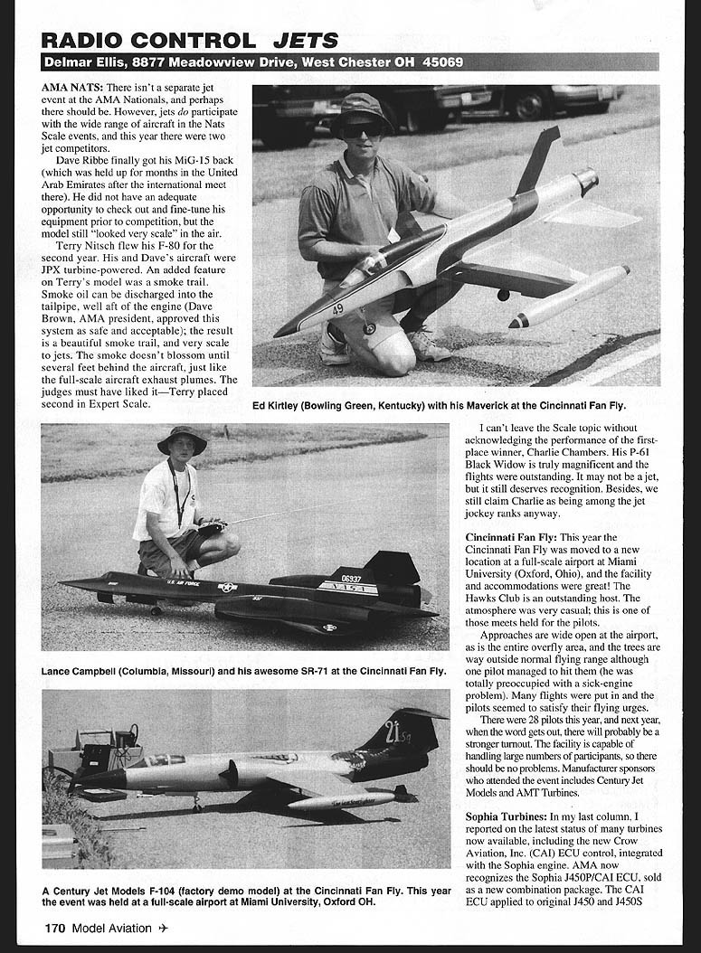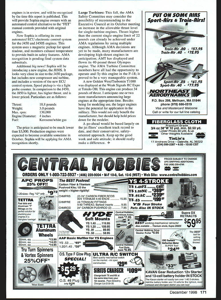 RADIO CONTROL JETS I---.- -- NATS isnt separate jet event AMA Nationals perhaps should However jets participate wide range aircraft Nats Scale events year two jet competitors Dave Ribbe finally got MiG-15 back held up months United Arab Emirates after international meet did have adequate opportunity check out fine-tune equipment prior competition model still looked very scale air Terry Nitsch flew F-80 second year Daves aircraft IPX turbine-powered An added feature Terrys model smoke trail Smoke oil can discharged tailpipe well aft engine Dave Brown AMA president approved system safe acceptable result beautiful smoke trail very scale jets smoke doesnt blossom until several feet behind aircraft just like full-scale aircraft exhaust plumes judges must have liked itTerry placed second Expert Scale cant leave Scale topic acknowledging performance firstplace winner Charlie Chambers P-61 Black Widow truly magnificent flights outstanding may jet still deserves recognition Besides still claim Charlie being among jet jockey ranks anyway Cincinnati Fan Fly year Cincinnati Fan Fly moved new location full-scale airport Miami University Oxford Ohio facility accommodations great Hawks Club outstanding host atmosphere very casual meets held pilots Approaches wide open airport entire oveffly area trees way outside normal flying range although pilot managed hit totally preoccupied sick-engine problem flights put pilots seemed satisfy flying urges 28 pilots year next year word gets out will probably stronger turnout facility capable handling large numbers participants should no problems Manufacturer sponsors attended event includes Century Jet Models AMT Turbines Sophia Turbines last column reported latest status turbines now available including new Crow Aviation Inc CAl ECU control integrated Sophia engine AMA now recognizes Sophia J45OPICAI ECU sold new combination package CAl ECU applied original J450 J4505 170 Model Aviation * Ed Kirtley Bowling Green Kentucky Maverick Cincinnati Fan Fly Lance Campbell Columbia Missouri awesome SR-71 Cincinnati Fan Fly Century Jet Models F-104 factory demo model Cincinnati Fan Fly year event held full-scale airport Miami University Oxford OH engines review will recognized time report published will provide Sophia engine owners automated control alternative FET manual controls provided original engines Now Sophia offering its own automated ECU electronic control system J450 J450S engines system uses magnetic pickup speed readout monitors exhaust temperature provide built-in safety features AMA recognition pending final system data submittals Additional big news Sophia will introducing new engine J850S looks very close size J450 package includes new compressor turbine includes version new ECU control system Speed pickup via light probe counter comparison J450 J850 lighter has higher thrust lower priced Particulars follows Thrust Weight Max rpm Engine Diameter Fuel 188 pounds 30 pounds 130000 4 inches Kerosene/white gas price anticipated much lower $3000 Production engines expected become available sometime October Sophia will applying AMA recognition shortly Large Turbines fall AMA Safety Committee may consider possibility recommending Executive Council its October meeting increase allowable thrust level single-turbine engines Thrust higher current single-engine limit 22 pounds can already achieved under AMA regulations using multiple engines Although AMA decisions yet made manufacturers developing high-thrust engines anticipation AMT has displayed flown its 40-pound thrust Olympus engine AMA Turbine Committee members have opportunity operate fly engine F-18 proved very manageable system new Golden WestlTurbomin TlOOO displayed Weak Signals RC Expo Toledo OH engine can produce 34 pounds thrust anticipate two manufacturers announcing large engines appropriate time Besides being modeling use larger engines have potential application military would benefit manufacturer should help hold prices down modeler go-ahead would based largely jet fliers excellent track record date conservative safetyoriented approach Keep up good work safe attitude should really make difference T ON SOME AIRS Sport-Airs Train-Airs EWZuEEEE~ 7 RO Box 208 Methuen MA 01844 phone 978 686-0319 Visa Mastercard Welcome Call write full line catalog Premium Grade 314 oz 38W 10 yrd mm $250 yd Lower Prices 30 yds & up Weights Available Z Other TinLins 17 Andrews Drive Dalevdle AL 36322 334 598-2287 - 10 00 CST December 1998 171 Sport-fir 4U - $6195 $7795