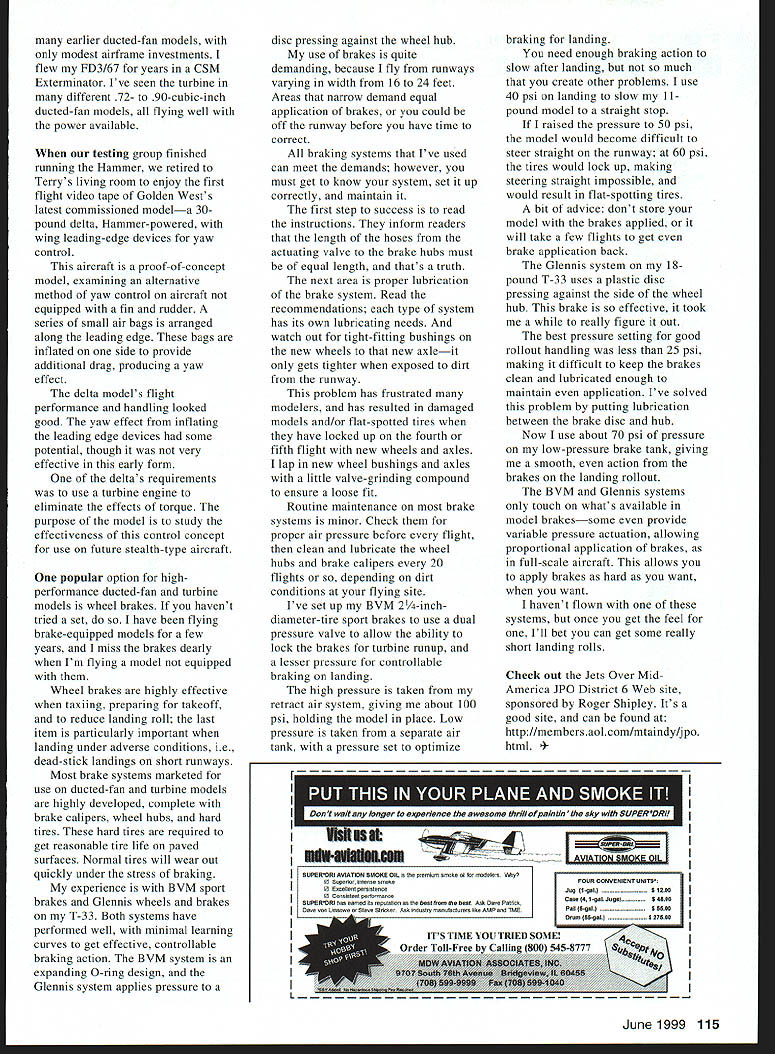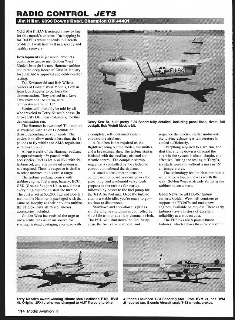 RADIO CONTROL JETS q II U III r] ULIUU IrVj tzu rlor r U SI YOU MAY HAVE noticed new byline months column Im stepping Del Ellis tends health problem wish him well speedy healthy recovery Developments jet model products continue amaze Golden West Models brought its new Hammer turbine out deep freeze Ohio January final AMA approval cold-weather testing Tad Krzanowski Bob Wilcox owners Golden West Models flew Los Angeles perform demonstration arrived Level Two snow ice storm temperatures around 150 Stories will probably told traveled Terry Nitschs house Grove City OH near Columbus demonstration run Hammer awesome turbine available 13 17 pounds thrust depending needs option allow models less 19 pounds fly within AMA regulations turbine All-up weight Hammer package approximately 4/2 pounds accessories Fuel Jet K-i 5% turbine oil separate oil system required Throttle response similar other turbines thrust range turbine package comes turbine engine fuel pump battery ECU GSU Ground Support Unit almost everything required start turbine cost set $3200 Tad Bob tell Hammer packaged same philosophy previous turbine FD3/67 miscellaneous accessories included Golden West has resisted urge use scuba tank air source starting instead upstaging everyone complete self-contained system onboard airplane field box required flightline bring out model transmitter fire extinguisher turbine start initiated auxiliary channel throttle control complete startup sequence controlled electronic control unit onboard airplane small electric motor turns compressor onboard systems power glow plug solenoid valve feeds propane turbine startup followed power fuel pump Jet fuel/oil mix Once turbine attains stable idle youre ready go no lines disconnect Shutdown cool-down just simple Engine shutdown controlled slow idle trim auxiliary channel switch ECU will shut down fuel pump close fuel valve solenoid sequence electric starter motor until turbine exhaust gas temperature cooled sufficiently Everything required start run shut engine down onboard aircraft system clean simple effective During testing Terrys six starts run miss 150 air temperatures technology Hammer took develop worth wait Golden West already shipping turbines customers Good News FD3/67 turbine owners Golden West will continue support FD3/67s make new engines available request early turbines have history excellent reliability modest cost FD3/67s 8-pound-thrust turbines allows used 114 Model Aviation y Kerr Sr built pretty F-86 Saber fully detailed including panel lines rivets full cockpit Bob Violett Models kit Terry Nitschs award-winning Minute Men Lockheed F-80BVM Authors Lockheed T-33 Shooting Star BVM kit has BVM kit Original JPX turbine changed AMT Mercury turbine 91 ducted fan Glennis Aircraft scale T-33 wheels brakes disc pressing against wheel hub use brakes quite demanding because fly runways varying width 16 24 feet Areas narrow demand equal application brakes could off runway before have time correct braking systems Ive used can meet demands however must get know system set up correctly maintain first step success read instructions inform readers length hoses actuating valve brake hubs must equal length thats truth next area proper lubrication brake system Read recommendations type system has its own lubricating needs watch out tight-fitting bushings new wheels new axleit gets tighter exposed dirt runway problem has frustrated modelers has resulted damaged models and/or flat-spotted tires have locked up fourth fifth flight new wheels axles lap new wheel bushings axles little valve-grinding compound ensure loose fit Routine maintenance brake systems minor Check proper air pressure before flight clean lubricate wheel hubs brake calipers 20 flights depending dirt conditions flying site Ive set up BVM 2/4-inchdiameter-tire sport brakes use dual pressure valve allow ability lock brakes turbine runup lesser pressure controllable braking landing high pressure taken retract air system giving about 100 psi holding model place Low pressure taken separate air tank pressure set optimize braking landing need enough braking action slow after landing much create other problems use 40 psi landing slow 11pound model straight stop raised pressure 50 psi model would become difficult steer straight runway 60 psi tires would lock up making steering straight impossible would result flat-spotting tires bit advice dont store model brakes applied will take few flights get brake application back Glennis system 18pound T-33 uses plastic disc pressing against side wheel hub brake effective took really figure out best pressure setting good rollout handling less 25 psi making difficult keep brakes clean lubricated enough maintain application Ive solved problem putting lubrication between brake disc hub Now use about 70 psi pressure low-pressure brake tank giving smooth action brakes landing rollout BVM Glennis systems touch whats available model brakessome provide variable pressure actuation allowing proportional application brakes full-scale aircraft allows apply brakes hard want want havent flown systems once get feel Ill bet can get some really short landing rolls Check out Jets Over MidAmerica JPO District 6 Web site sponsored Roger Shipley Its good site can found http//membersaolcom/mtaindy/jpo html ier ducted-fan models modest airframe investments flew FD3167 years CSM Exterminator Ive seen turbine different 72- 90-cubic-inch ducted-fan models flying well power available testing group finished running Hammer retired Terrys living room enjoy first flight video tape Golden Wests latest commissioned modela 30pound delta Hammer-powered wing leading-edge devices yaw control aircraft proof-of-concept model examining alternative method yaw control aircraft equipped fin rudder series small air bags arranged along leading edge bags inflated side provide additional drag producing yaw effect delta models flight performance handling looked good yaw effect inflating leading edge devices some 