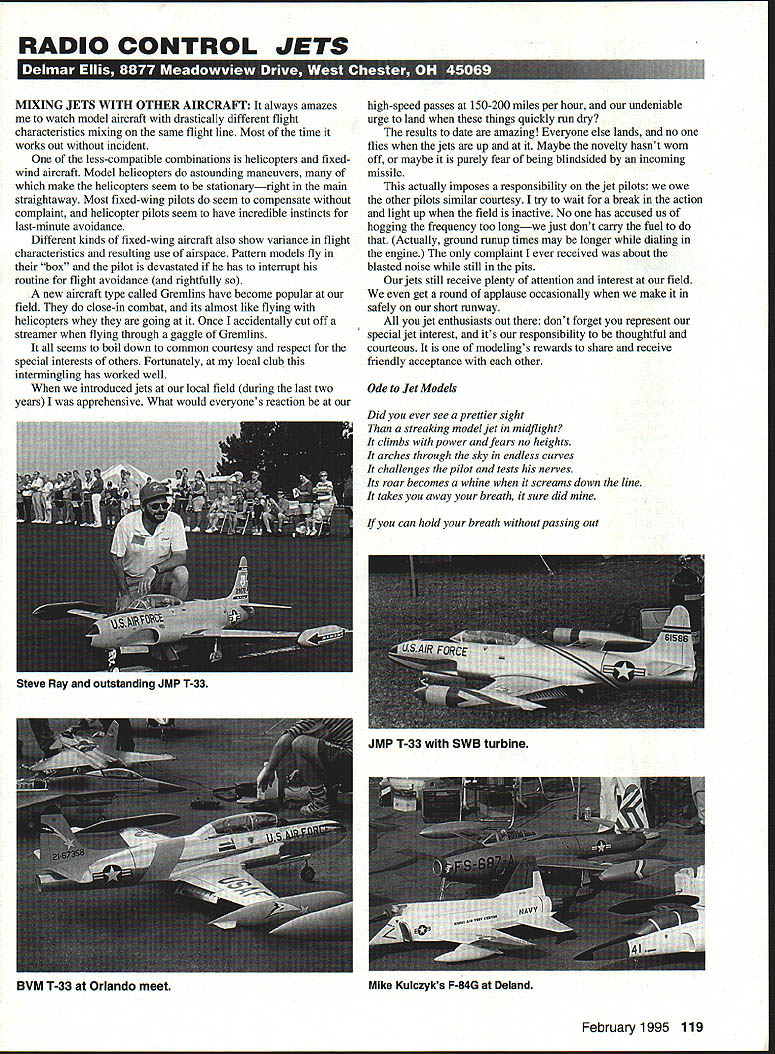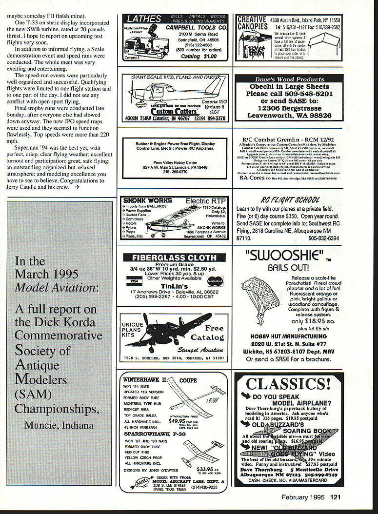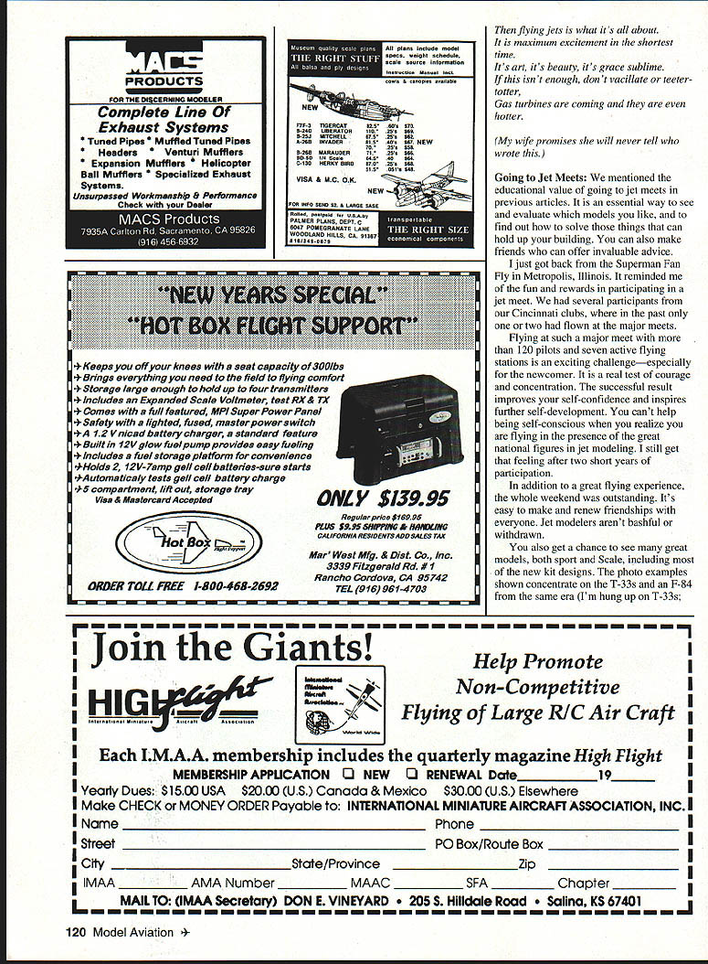 RADIO CONTROL JETS U -4uuIuTwm '1-1'm MIXING JETS WITH OTHER AIRCRAFT always amazes watch model aircraft drastically different flight characteristics mixing same flight line Most time works out incident less-compatible combinations helicopters fixedwind aircraft Model helicopters astounding maneuvers make helicopters seem stationaryright main straightaway Most fixed-wing pilots seem compensate complaint helicopter pilots seem have incredible instincts last-minute avoidance Different kinds fixed-wing aircraft also show variance flight characteristics resulting use airspace Pattern models fly box pilot devastated has interrupt routine flight avoidance rightfully new aircraft type called Gremlins have become popular field close-in combat its almost like flying helicopters whey going Once accidentally cut off streamer flying through gaggle Gremlins seems boil down common courtesy respect special interests others Fortunately local club intermingling has worked well introduced jets local field during last two years apprehensive What would everyones reaction high-speed passes 150-200 miles per hour undeniable urge land things quickly run dry results date amazing Everyone else lands no flies jets up Maybe novelty hasnt worn off maybe purely fear being blindsided incoming missile actually imposes responsibility jet pilots owe other pilots similar courtesy try wait break action light up field inactive No has accused us hogging frequency too longwe just dont carry fuel Actually ground runup times may longer dialing engine complaint ever received about blasted noise still pits jets still receive plenty attention interest field get round applause occasionally make safely short runway jet enthusiasts out dont forget represent special jet interest its responsibility thoughtful courteous modelings rewards share receive friendly acceptance other Ode Jet Models Did ever see prettier sight streaking model jet midflight climbs power fears no heights arches through sky endless curves challenges pilot tests nerves Its roar becomes whine screams down line takes away breath sure did can hold breath passing out February 1995 119 Steve Ray outstanding JMP T-33 JMP T-33 SWB turbine BVM T-33 Orlando meet Mike Kulozyks F-84G Deland PRODUCTS Complete Line Exhaust Systems * Tuned Pipes led Tuned Pipes * Headers uri Mufflers Expansion Mufflers copter Ball Mufflers ialized Exhaust Systems Unsurpassed Wokmeashi 8 PeifarmanCe s offyour knees seat capacity 300/ba gs everything need field flying comfort age large enough hold up four transmitters udes Expanded Scale Voltmeter test RX& TX s full featured MPI Super Power Panel ty alighted fused master power switch 12 V nicad battery charger standard feature t 12V glow fuel pump provides easy fueling udes fuel storage platform convenience 1-bIds 2 12 V-Tamp gell cell batteries-sure starts Automaticaly tests ge/I cell battery charge #5 compartment lift out storage tray Visa ercardAccepted ---lx ORDER TOLL FREE 1-500-468-2692 flying jets what its about maximum excitement shortest time Its art its beauty its grace sublime isnt enough dont vacillate teetertotter Gas turbines coming hotter wife promises will never tell rote Going Jet Meets mentioned educational value going jet meets previous articles essential way see evaluate models like find out solve things can hold up building can also make friends can offer invaluable advice just got back Superman Fan Fly Metropolis Illinois reminded fun rewards participating jet meet several participants Cincinnati clubs past two flown major meets Flying such major meet 120 pilots seven active flying stations exciting challengeespecially newcomer real test courage concentration successful result improves self-confidence inspires further self-development cant help being self-conscious realize flying presence great national figures jet modeling still get feeling after two short years participation addition great flying experience whole weekend outstanding Its easy make renew friendships everyone Jet modelers arent bashful withdrawn also get chance see great models both sport Scale including new kit designs photo examples shown concentrate T-33s F-84 same era Im hung up T-33s Join Giants Help Promote N Non-CompetitiveI F1II __ainininmFluinr Laive RIC Air Craft gnl991Ofll MeataA cnallAssecalao0J0 I IMAA membership includes quarterly magazine High Flight I MEMBERSHIP APPUCATlON U NEW U RENEWAL Date19I Yearly Dues$1500 USA $2000 US Canada & Mexico $3000 US ElsewhereI Make CHECK MONEY ORDER Payable INTERNATIONAL MINIATURE AIRCRAFT ASSOCIATION INC I Name _________________ Phone ___________ Street ______________________________________ P0 Box/Route Box ________________ City __________________________________ IAMAState/Province ________________Zip IMAA ________Number________ MAAC ________ SEA ________ Chapteri L TO IMAA Secretary DON E VINEYARD S Hilldcde Road na KS 67401 m 120 Model Aviation 4cowls & canopies available FTF3TIGERCAT925fi0970 6-240URERATORIt0.259169 B25JMITCHELL675299162 A-SRI INVADER 915 409 167 NEW 7O 259 116 6-266 MARAUDER71259 166 RD-SO 114 Scala 645 40 664 G130 HERKY BIRD 670 259 168 515 OS19 49• z ff1 VISA K NEW_ Mar West Mfg Co Inc 3339 Fitzgerald Rd #1 Rancho Cordova CA 95742 TEL 916961-4703 ONLY $13995 negular price $18995 PLUS $995 SlWPKG & NRA DL 1MG CALIFORNIA RESIDENO25ADD SALES TAX maybe someday Ill finish 1-33 static display incorporated new SWB turbine rated 20 pounds thrust hope report upcoming test flights very soon addition informal flying Scale demonstration event speed runs conducted whole meet very exciting entertaining speed-run events particularly well organized successful Qualifying flights limited flight station part day did see conflict open sport flying Final trophy runs conducted late Sunday after everyone else slowed down anyway new JPO speed traps used seemed function flawlessly Top speeds 220 mph Superman 94 best yet perfect crisp clear flying weather excellent turuout participation great safe flying out