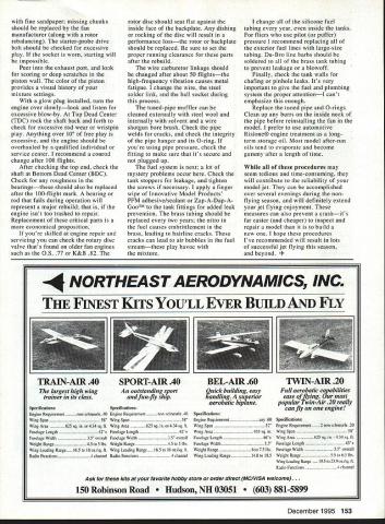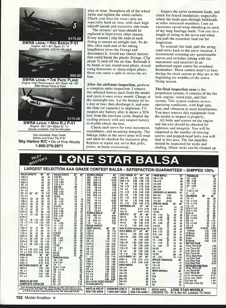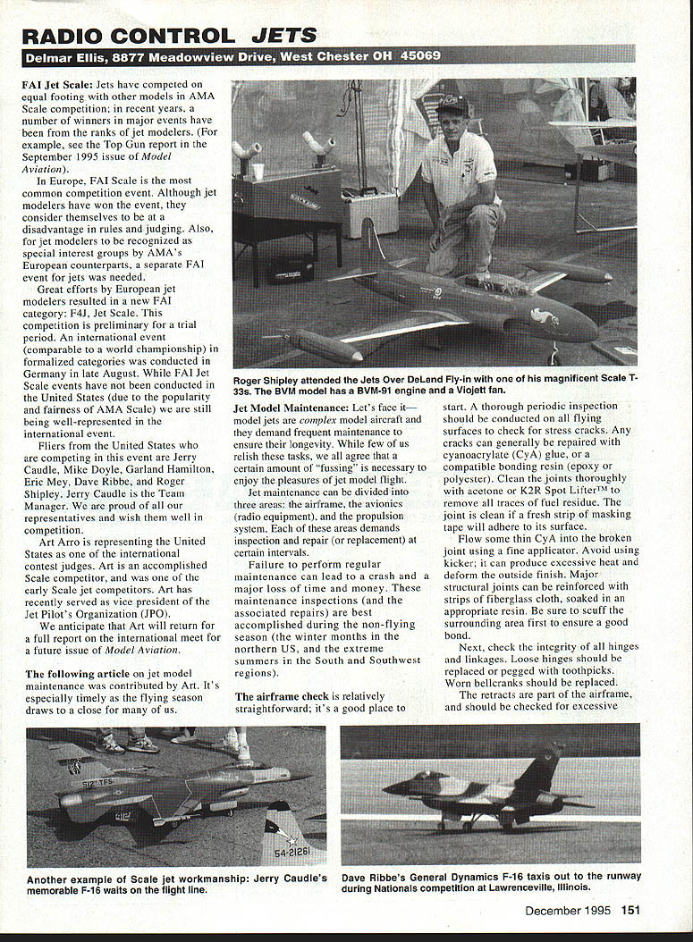 RADIO CONTROL JETS FAI Jet Scale Jets have competed equal footing other models AMA Scale competition recent years number winners major events have ranks jet modelers example see Top Gun report September 1995 issue Model Aviation Europe FAI Scale common competition event Although jet modelers have won event consider themselves disadvantage rules judging Also jet modelers recognized special interest groups AMAs European counterparts separate FAI event jets needed Great efforts European jet modelers resulted new FAI category F4J Jet Scale competition preliminary trial period An international event comparable world championship formalized categories conducted Germany late August FAI Jet Scale events have conducted United States due popularity fairness AMA Scale still being well-represented international event Fliers United States competing event Jerry Caudle Mike Doyle Garland Hamilton Eric Mey Dave Ribbe Roger Shipley Jerry Caudle Team Manager proud representatives wish well competition Art Arro representing United States international contest judges Art accomplished Scale competitor early Scale jet competitors Art has recently served vice president Jet Pilots Organization JPO anticipate Art will return full report international meet future issue Model Aviation following article jet model maintenance contributed Art Its especially timely flying season draws close us Jet Model Maintenance Lets face model jets complex model aircraft demand frequent maintenance ensure longevity few us relish tasks agree certain amount fussing necessary enjoy pleasures jet model flight Jet maintenance can divided three areas airframe avionics radio equipment propulsion system areas demands inspection repair replacement certain intervals Failure perform regular maintenance can lead crash major loss time money maintenance inspections associated repairs best accomplished during non-flying season winter months northern US extreme summers South Southwest regions airframe check relatively straightforward its good place start thorough periodic inspection should conducted flying surfaces check stress cracks Any cracks can generally repaired cyanoacrylate CyA glue compatible bonding resin epoxy polyester Clean joints thoroughly acetone K2R Spot LifterTM remove traces fuel residue joint clean fresh strip masking tape will adhere its surface Flow some thin CyA broken joint using fine applicator Avoid using kicker can produce excessive heat deform outside finish Major structural joints can reinforced strips fiberglass cloth soaked appropriate resin sure scuff surrounding area first ensure good bond Next check integrity hinges linkages Loose hinges should replaced pegged toothpicks Worn bellcranks should replaced retracts part airframe should checked excessive December 1995 151 Roger Shipley attended Jets Over DeLand Fly-in magnificent Scale T 33s BVM model has BVM-91 engine Viojett fan Another example Scale jet workmanship Jerry CaudlesDave Ribbes General Dynamics F-16 taxis out runway memorable F-16 waits flight lineduring Nationals competition Lawrenceville Illinois Also Available Rob Finish Stiletto Color Tile P-Si Sky Harbor R/C Fine Woods 1-800-279-2871 play wear Straighten wheel struts tighten wheel collars Check tires wearjets especially hard tires high takeoff speeds excessive side loads retracts air lines should replaced least other season season clip ends fitting ensure airtight seal slice end tubing lengthwise over fitting disconnect Avoid lateral tension could break plastic fittings Clip about /8 inch off air line Reinstall hand use round-nose pliers Avoid using hemostats sharp-edged pliers can cause split stress air line After airframe inspection perform complete radio inspection remove onboard battery pack model cycle once month Charge overnight rate Let battery sit day two discharge note time capacity depletion Ill suspect battery after shows 20% loss previous cycle Repeat cycling process suspect battery double-check loss Check servo total movement smoothness mounting integrity linkage holes servo arms will wear must checked excessive play Replace repair servo jerks jitters hums excessively Inspect servo extension leads check frayed insulationespecially leads pass through bulkheads other structural members use electronic spiral-wrap sheathing long fuselage leads can tie length string servo end pull extension lead out inspection reinstall lead pull string wire back servo location recommend returning questionable servos switches along transmitter receiver authorized repair center overhaul Remember centers arent busy during slack season beginning middle active flying season final inspection area propulsion system consists fan unit engine tuned pipe fuel system system endures severe operating conditions high rpm heat vibration installations must remove equipment model inspect properly bolts screws engine fan unit should checked tightness integrity will surprised number missing screws popped-head bolts will find area fan impeller should inspected nicks chafing Minor nicks can cleaned up BALSASHEETS 3648 1/32s23344 1/18s23344 3/32x24053 I/B s24357 3/16x25065 1/4 s26079 3/8 x230 42 78105 1/2 o295125 1/32o333 45 3953 1/20x 333 45 3953 1/16x333 AS 3953 3/32x 339 54 A760 1/8 x 347 65 5775 3/16o355 75 8890 1/4 a370 100 85115 5/16x398135 3/8 x395 130 102150 1/2 o3115 155 135180 3/4 x3199270 1/32o450 70 5979 1/201450 70 5979 1/ltx 450 70 5979 3/32x459 90 7398 1/8 o468 100 83115 3/161478 120 97135 1/4 x405 138 125155 5/16x4182203 3/8 x4145 214 185247 1/2 x4209 270 249290 WINGSKINS 3036 1/20o 12479535 1/ito 12479535 3/32x 12579845 MATCHED SHEETS 4248 3/32o4109125 1/8 s4129148 3/16x4144165 1/4 x4155178 SEND $100 FOR COMPLETE CATALOG BALSA STICKS 1/16 80 1/18 sl/4 1/16s3/8 1/16 sl/2 3/32 80 3/32 s 1/4 3/32s3/8 3/32 sl/2 1/880 1/81 1/4 1/8s3/8 1/8x 1/2 3/16 80 3/18sl/4 3/16x3/8 3/16xl/2 3/16o3/4 3/16x 1/4 80 1/4x3/8 1/40 1/2 1/4x3/4 1/4xl 5/1680 3/880 3/8 xl/2 3/8x3/4 3/8xl 1/280 1/2x3/4 1/2xl 5/8 80 3/480 TRAILING EDGE 1/8 x