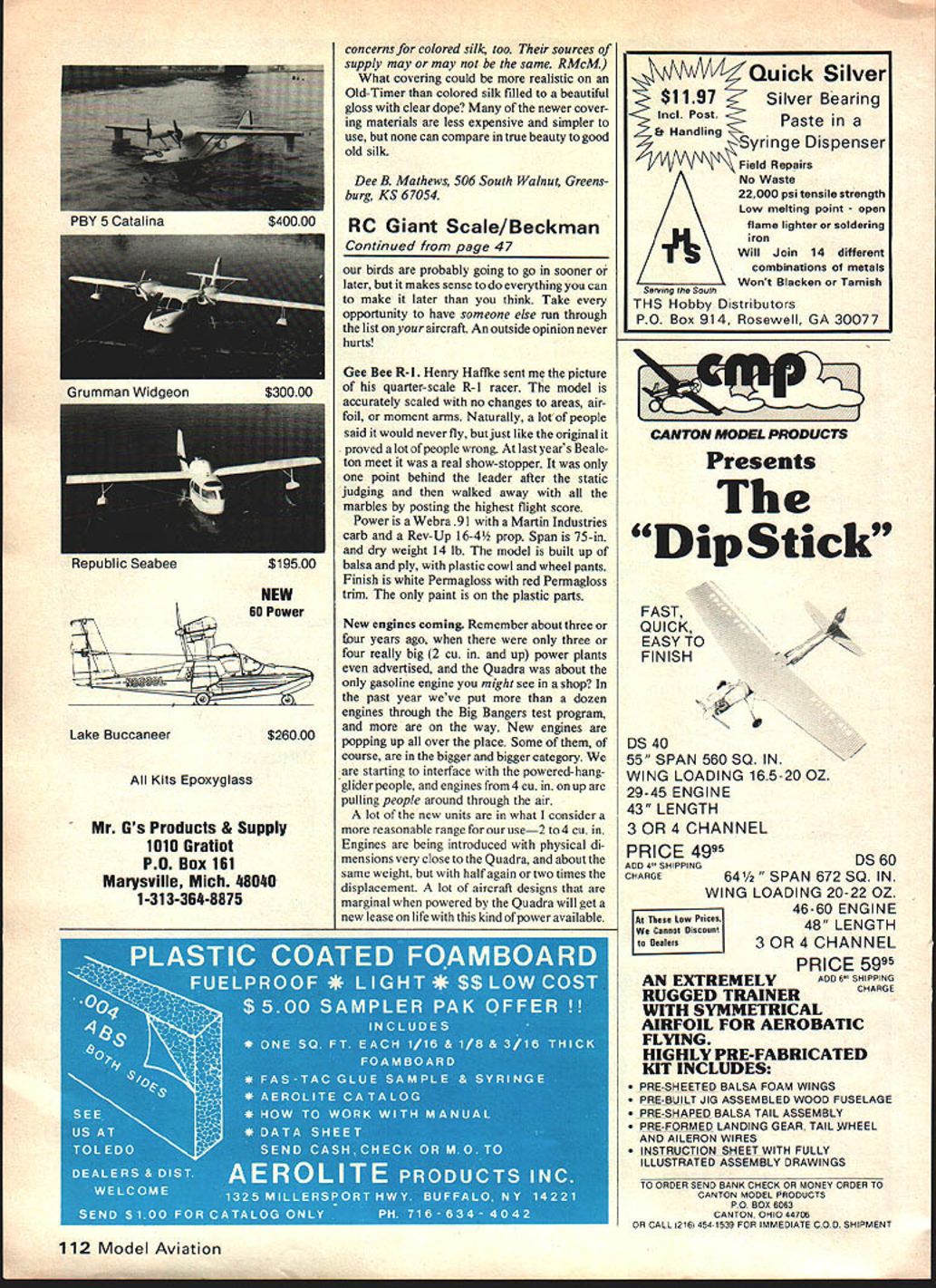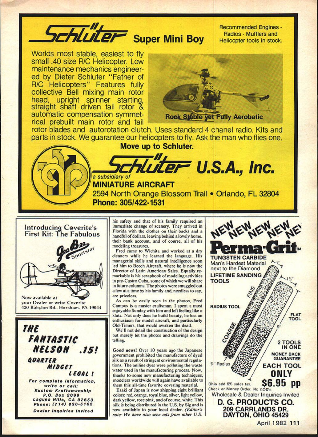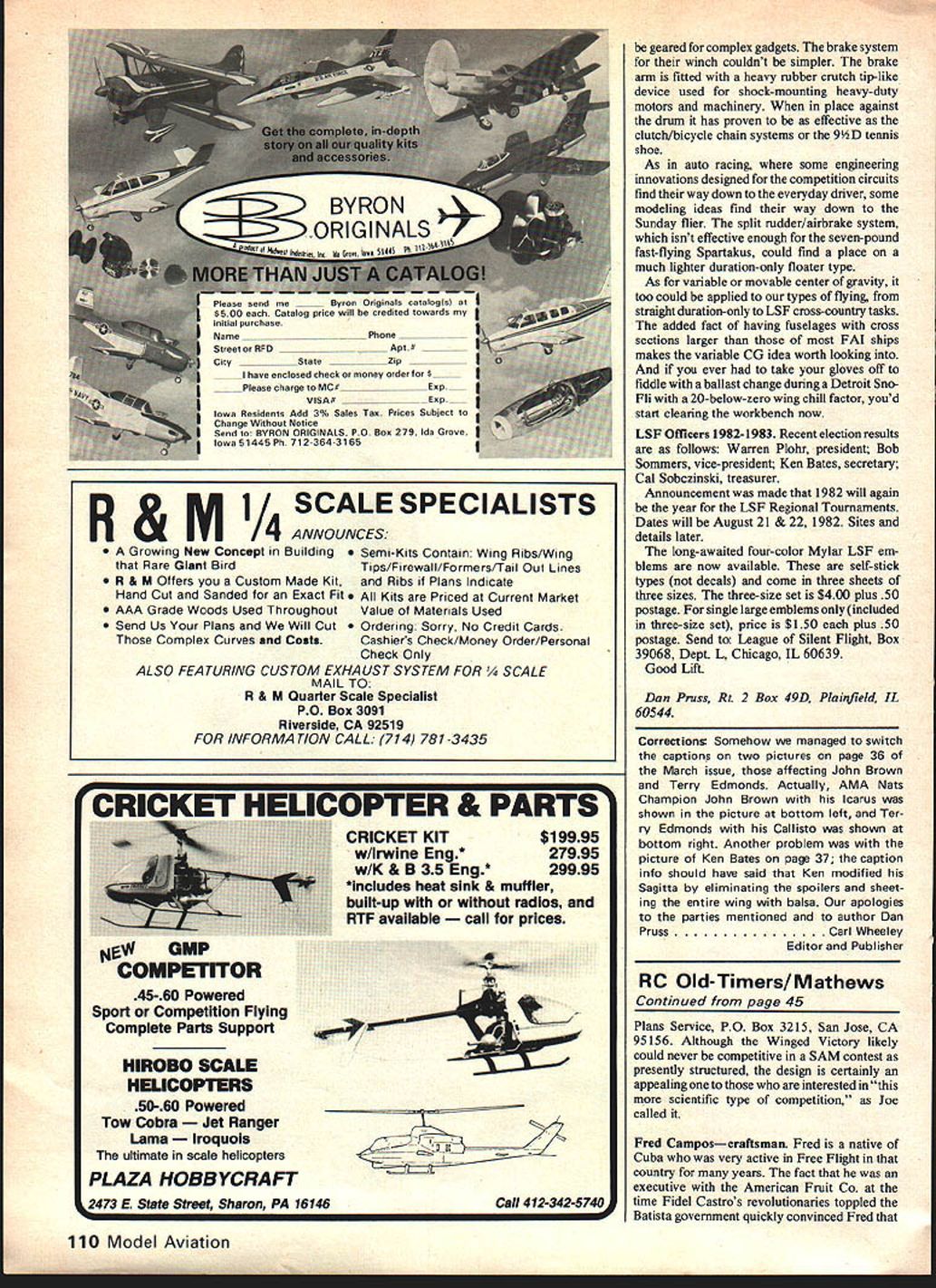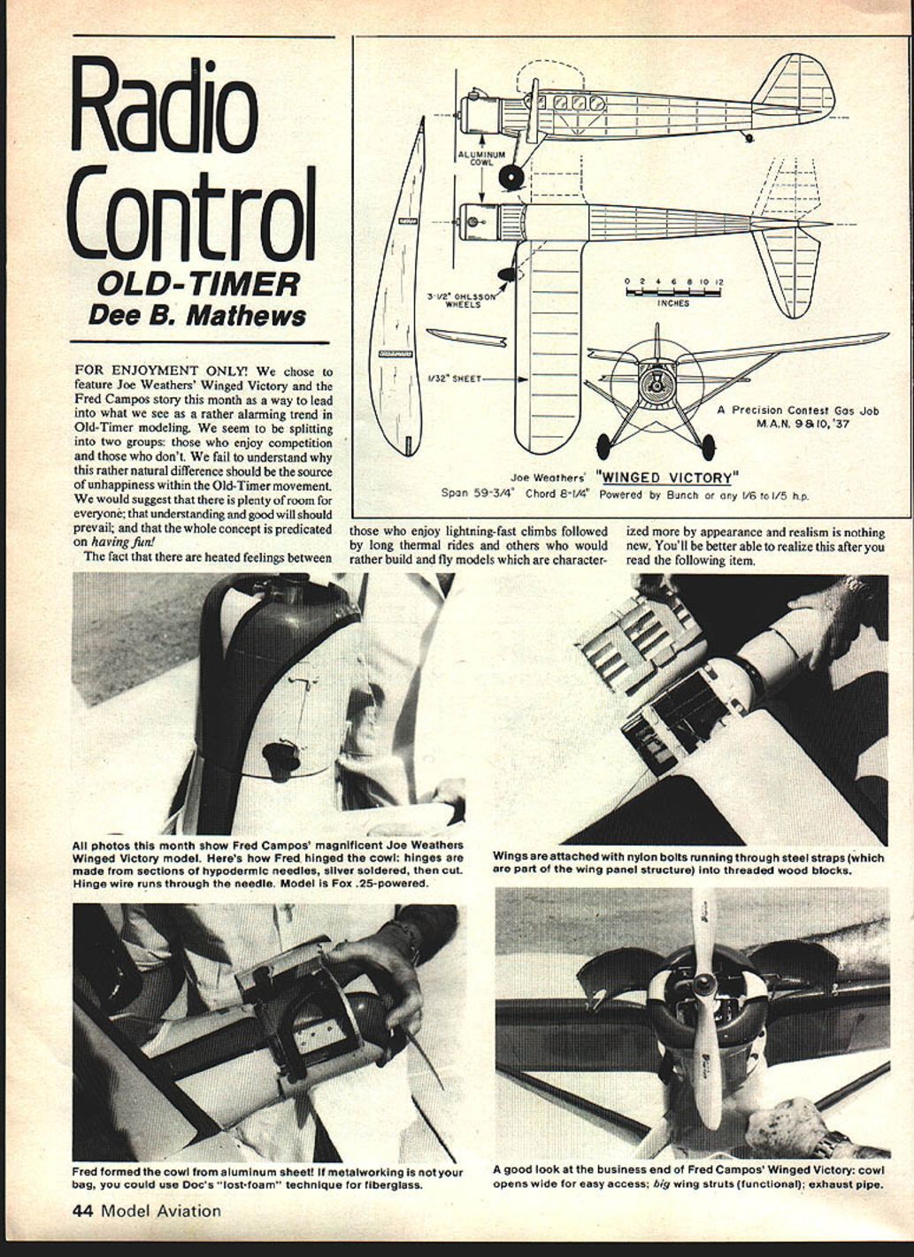 Radio Control OLD- TIMER Dee B Mathews FOR ENJOYMENT ONLY chose feature Joe Weathers Winged Victory Fred Campos story month way lead what see rather alarming trend Old-Timer modeling seem splitting two groups enjoy competition dont fail understand rather natural difference should source unhappiness within Old-Timer movement would suggest plenty room everyone understanding good will should prevail whole concept predicated having flint fact heated feelings between -'-'-4I \/1II II ALUMINUMI / II I'I / /I 141 7------31/2 0HLSSON WHEELS I/52 SHEETI_____ 0 2 4 6 8 10 2 INCHES Precision Contest Gas Job 981037 UV Joe Weathers WINGED VICTORY Spon 59-3/4 Chord 8-1/4 Powered Bunch 1/6 1/5 hp enjoy lightning-fast climbs followed ized appearance realism nothing long thermal rides others would new Youll better able realize after rather build fly models character- read following item V L photos month show Fred Campos magnificent Joe Weathers Winged Victory model Heres Fred hinged cowl hinges made sections hypodermic needles silver soldered cut Hinge wire runs through needle Model Fox 25-powered 44 Model Aviation Wings attacnea witn nylon bolts running through steel straps part wing panel structure threaded wood blocks l-rea normea tne cowl trom aluminum sneet metalworking bag could use Docs lost-foam technique fiberglass good look business end Fred Campos Winged Victory cowl opens wide easy access big wing struts functional exhaust pipe precision contest As generally acknowledged Precision-Type Gas Model Contest fast becoming standard purely durational meets now practically thing past Any con scientious builder upon entering scien tific type competition immediately impressed new phases judging model engineering construction workmanship sharing points awarded through actual flight plane generally-used point system Precision Contest follows A Engineering 20 points maximum 1 De sign 2 Construction 3 Workmanship B Takeoff 20 points maximum 1 Takeoff roll 2 Duration 3 Approximate Distance 4 Altitude C Flight 25 points maximum 1 Stability 2 Performance D Landing35 points maximum 1 Approach 2 Attitude landing position relative restrictcd area field About point readers likely saying Doc has totally lost mind really see above quoted directly lead comments Elbert Joe Weathers twopart article September October 1937 issues ModelA iiplane News odd 45 years later precision events seem coming back popularity As can see Joes words clearly illustrate dif fering factions back Old-Timers really New-Timers Winged Victory Although articles titled otherwise photos accompanying clearly show letters Winged Victory designs fuselage sides Equally unusual era full-sized patterns bulkheads ribs dimensions called out drawing assist relatively simple enlarge ment no full-sized drawings avail able magazine articles until well 1940s pure esthetic beauty Joe Weathers classic really remarkable compared usual contest designs era Weathers designs usually slanted toward beauty rather utility Another Weathers design characteristic use con touring strips along fuselage top bottom formers cut sheet final-sanded rounded tapered form method also seen Pacific Coaster Westerner others Another trademark feature common Joe Weathers designs use numerous crosspieces running between spars ribs wings empennage partial-geodetic ar rangement also seen surfaces Dennyplanes system wing attachment used Winged Victory also remarkably similar Dennyplane Sr leads us speculate possible connection though Dennyplane credited Joe Weathers readers know cowl fabricated two thick balsa rings fore aft thin aluminum sheet burnished over rolled circular-sectioned cowl sides hinged access Bunch engine As can seen photos very complex unit has likely major factor frightening away few potential builders However cowl could easily constructed using Lost Foam tech nique featured article February 1982 issue magazine Full-size drawings available Pond Continued page 110 ALL WINNERS 2657 NE 188th Street Build fly winning kit Miami Florida 33180 Telephone 935-1436 V BUCKER JUNGMEISTER 1/5 scale Au-i 33 winners circle major standoff scale meet Easy building easy flying kits complete detailed plans & hardware package April 1982 45 Fred Campos friend Hes true craftsman THE WACO 1 FW 190 D-9 N DUELLIST 2140 SPITFIRE MK-9 - &PARTS CRICKET KIT$19995 w/lrwine Eng* *27995 wIK & B 35 Eng29995 *incIudea heat sink & muffler built-up radios RTF available prices OMP COMPETITOR 45-80 Powered Sport Competition Flying Complete Parts Support HIROBO SCALE HELICOPTERS 50-60 Powered Tow Cobra Ranger Lama uois ultimate scale helicopters PLAZA HOBBYCRAFT L 2473 E State Street Sharon PA 16146 __~1~ Call 412-342-574~ geared complex gadgets brake system winch couldnt simpler brake arm fitted heavy rubber crutch tip-like device used shock-mounting heavy-duty motors machinery place against drum has proven effective clutch/bicycle chain systems 9D tennis shoe As auto racing some engineering innovations designed competition circuits find way down everyday driver some modeling ideas find way down Sunday flier split rudder/airbrake system isnt effective enough seven-pound fast-flying Spartakus could find place much lighter duration-only floater type As variable movable center gravity too could applied types flying straight duration-only LSF cross-country tasks added fact having fuselages cross sections larger FAI ships makes variable CG idea worth looking ever take gloves off fiddle ballast change during Detroit Sno Fli 20-below-zero wing chill factor youd start clearing workbench now LSF Officers 1982-19S3 Recent election results follows Warren Plohr president Bob Sommers vice-president Ken Bates secretary Cal Sobczinski treasurer Announcement made 1982 will again year LSF Regional Tournaments Dates will August21 & 22 1982 Sites details later long-awaited four-color Mylar LSF em blems now available self-stick types decals come three sheets three sizes three-size set $400 plus 50 postage single large emblems i