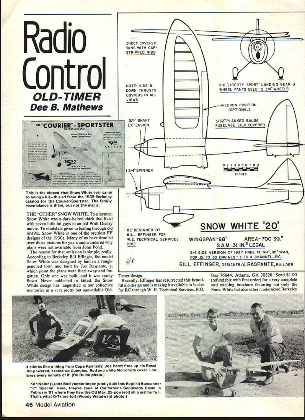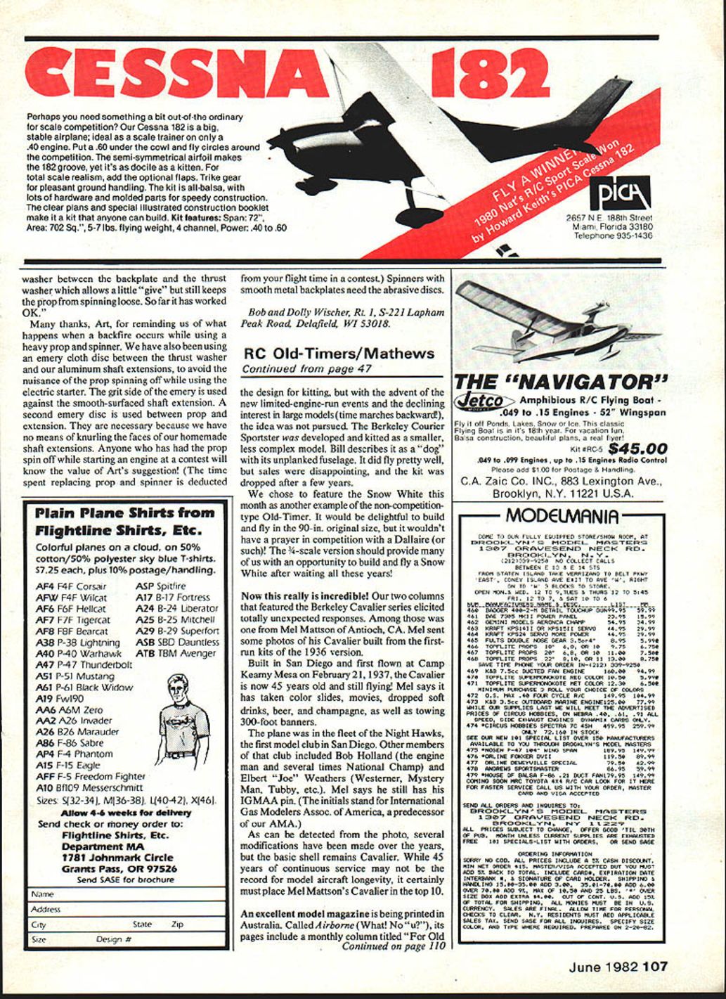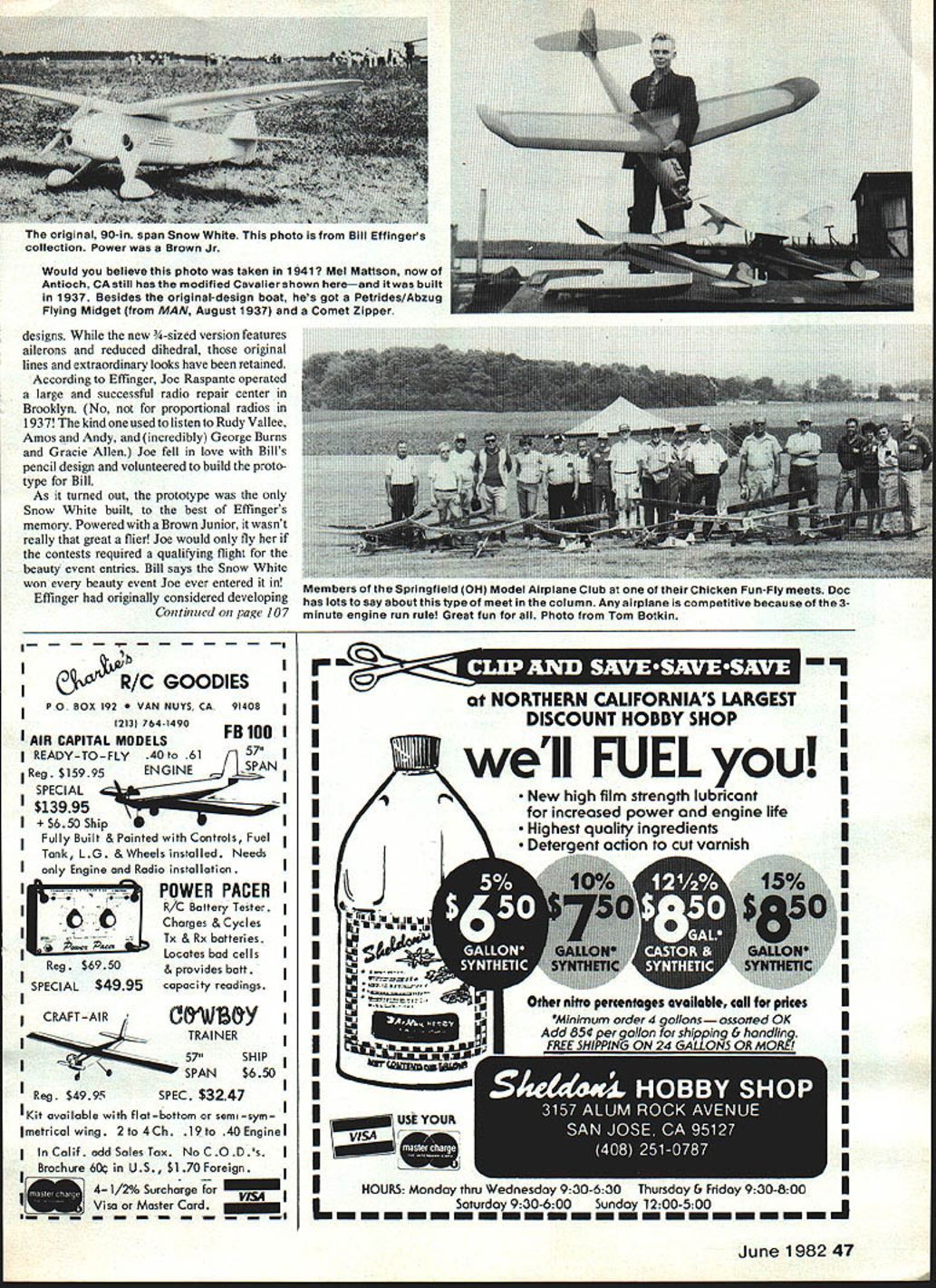 Radio Control OLD- TIMER Dee B Mathews THE OTHER SNOW WHITE layman Snow White adark-haired chick lived seven little fat guys old Walt Disney movie modelers given leafing through old MANs Snow White prettiest FF designs 1930s us have drooled over pictures years wondered plans available John Pond reason omission simple really According Berkeley Bill Effinger model Snow White designed him roughpenciled form built Joe Raspante point plans filed away gotten Only built rarely flown Never published kitted Snow White design has languished collective memories very pretty unavailable OldSHEET COVERED WING WITH CAPSTRIPPED RIBS NOTE SIDE 8 DOWN THRUSTS OBVIOUS IN ALL VIEWS 510 LIBERTY SPORT LANDING GEAR WHEEL PANTS USED- 2 3/4 WHEELS AILERON POSITION OPTIONAL 8i 3/4 SHAFT EXTENSION3/32 PLANKED BALSA FUSELAGE SILK COVERED I______ I0123456789 3/4 SPINNER INCHES RE-DESIGNED BY BILL EFFINGER FOR W E TECHNICAL SERVICES 1982 SNOW WHITE 20 WINGSPAN-68AREA-700 SQ 5AM 31 IN3 LEGAL 3/4 SIZE VERSION OF 1937 FREE FLIGHT90SPAN FOR 15 TO 30 ENGINES 3 TO 4 CHANNEL BC BILL EFFI NGER DESIGNER/JRASPANTE BUILDER Timer design Recently Effinger has resurrected beauti ful old design making available -size RC through W E Technical Services PO climbs like thing Cape Kennedy Joe Percy fires up Rossi 60-powered scaled-up Cumulus Red white MonoKote cover Joe loves minute Bo Buice photo Ken Nolan L Bud Vanderlinden jointly builtthis Replikit Buccaneer C Special theyre seen Californias Sepulveda Basin February 81 flew OS Max 25-powered ship just fun Thats what O-Ts Woody Woodward photo Box 76844 Atlanta GA 30328 Send $100 refundable first order very complete exciting brochure featuring Snow White also other modernized Berkeley 46 Model Aviation closest Snow White ever came being kitthis ad 1939 Berkeley catalog Courier-Sportster family resemblance magic original 90-in span Snow White photo Bill Effingers collection Power Brown Jr Would believe photo taken 1941 Mel Mattson now Antioch CA still has modified Cavalier shown hereand built 1937 Besides original-design boat hes got Petrides/Abzug Flying Midget MAN August 1937 Comet Zipper designs new -sized version features ailerons reduced dihedral original lines extraordinary looks have retained According Effinger Joe Raspante operated large successful radio repair center Brooklyn No proportional radios 1937 kind used listen Rudy Vallee Amos Andy incredibly George Burns Gracie Allen Joe fell love Bills pencil design volunteered build proto type Bill As turned out prototype Snow White built best Effingers memory Powered Brown Junior wasnt really great flier Joe would fly contests required qualifying flight beauty event entries Bill says Snow White won beauty event Joe ever entered Effinger originally considered developing Continued page 107 Members Springfield OH Model Airplane Club Chicken Fun-Fly meets Doc has lots say about type meet column Any airplane competitive because 3minute engine run rule Great fun Photo Tom Botkin II JR/C GOODIES P0 BOX 192 NUYS CA 91408I 213 7641490FR 100 AIR CAPITAL MODELS READY-TO-FLY40 61 1Reg $15995ENGINESPAN SPECIAL $13995 $65OShipI Fully Built & Painted Controls Fuel Tank LG & Wheels installed Needs Ionly Engine Radio installationI II o AcPaw Reg $6950 SPECIAL $4995I II CRAFTAIR SHIP SPAN$650 Reg $4995SPEC $3247 Kit available flat-bottom semi -sym Imetrical wing 2 4 Ch 19 40 Engine I Calif add Soles Tax No CODs Brochure 6O US $170 Foreign 4-1/2% Surcharge 111U1VISA _______ Visa Master Card POWER PACER R/C Battery Tester Charges & Cycles Tx & Rx batteries Locates bad cells & provides batt capacity readings CWTY TRAINER well FUEL New high film strength lubricant increased power engine life Highest qualily ingredients J Deternnt action cut varnish HERN CALIFORNIAS LARGESTU DISCOUNT HOBBY SHOPI II II II II II III II II I I I I U June 198247 I I I II I HOURS Monday thru Wednesday 930-630 Thursday & Fnday 9 30-800 I urday 930-600 Sunday 12 00-5 00 J EESS Perhaps need something bit out-of-the ordinary scale competition Cessna 182 big stable airplane ideal scale trainer 40 engine Put 60 under cowl fly circles around competition semi-symmetrical airfoil makes 182 groove yet its docile kitten total scale realism add optional flaps Trike gear pleasant ground handling kit all-balsa lots hardware molded parts speedy construction clear plans special illustrated construction booklet make kit anyone can build Kit features Span 72 Area 702 Sq 5-7 lbs flying weight 4 channel Power 40 60 washer between backplate thrust washer allows little give still keeps prop spinning loose So far has worked OK thanks Art reminding us what happens backfire occurs using heavy prop spinner have also using emery cloth disc between thrust washer aluminum shaft extensions avoid nuisance prop spinning off using electric starter grit side emery used against smooth-surfaced shaft extension second emery disc used between prop extension necessary because have no means knurling faces homemade shaft extensions Anyone has prop spin off starting engine contest will know value Arts suggestion time spent replacing prop spinner deducted Plain Plane Shirts Flightilne Shirts Etc Colorful planes cloud 500/0 cotton/500/o polyester sky blue T-shirts $725 plus 10% postage/handling ASP Spitfire A17 B-I 7 Fortress A24 B-24 Liberator A25 B-25 Mitchell A29 B-29 Superfort ASB SBD Dauntless ATB TBM Avenger AF4 F4F Corsair AFW F4F Wilcat AF6 F6F Hellcat AF7 F7F Tigercat AFB F8F Bearcat A38 P-38 Lightning A40 P-40 Warhawk A47 PA 7 Thunderbolt A51 P-SI Mustang A61 P-61 Black Widow A19 FwI9O AA6 A6M Zero AA2 A26 Invader A26 B26 Marauder A86 F-B6 Sabre AP4 F-4 Phantom A15 F-IS Eagle AFF F-S Freedom Fighter AIO BfIO9 Messerschmitt Sizes S32-34 M36-38l L40-42j X461 Allow 44 weeks deilvuty Send check money order Flightllne Shirts Etc Department MA 781 Johnmark Circle Grants Pass OR 97526 Send SASE brochure Name Address CityStateZip StzeDesign # N flight time contesL Spinners smooth metal backplates need abrasive disc