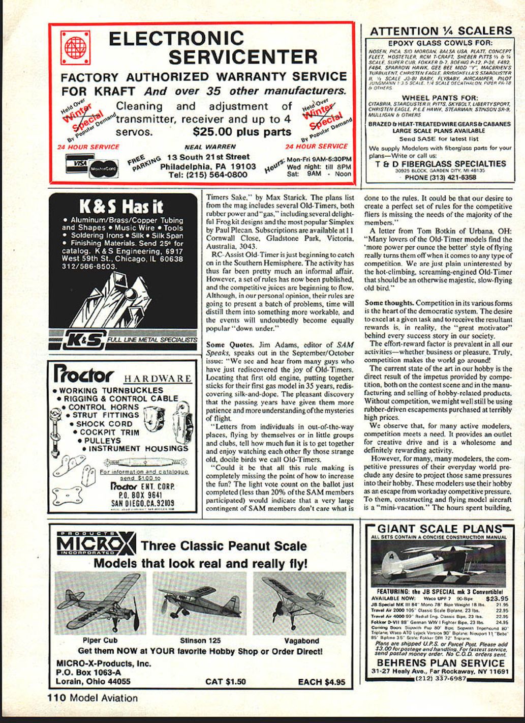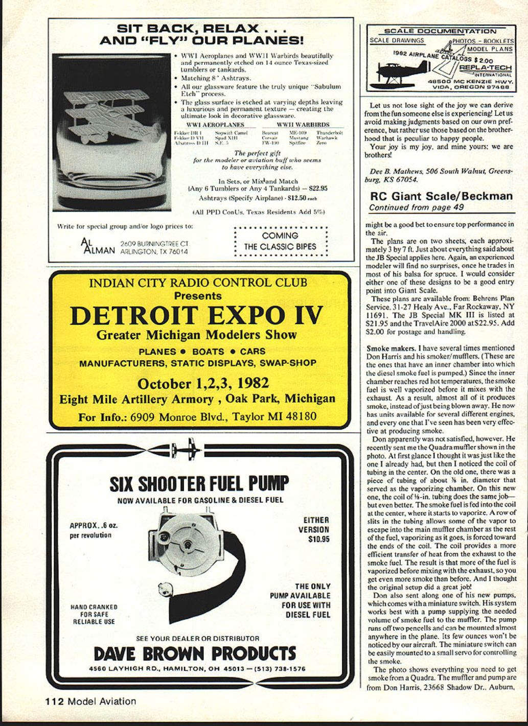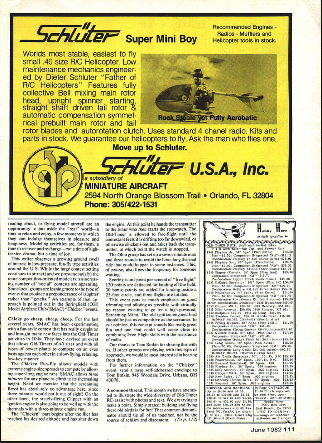 Radio Control OLD- TIMER Dee B Mathews THE OTHER SNOW WHITE layman Snow White adark-haired chick lived seven little fat guys old Walt Disney movie modelers given leafing through old MANs Snow White prettiest FF designs 1930s us have drooled over pictures years wondered plans available John Pond reason omission simple really According Berkeley Bill Effinger model Snow White designed him roughpenciled form built Joe Raspante point plans filed away gotten Only built rarely flown Never published kitted Snow White design has languished collective memories very pretty unavailable OldSHEET COVERED WING WITH CAPSTRIPPED RIBS NOTE SIDE 8 DOWN THRUSTS OBVIOUS IN ALL VIEWS 510 LIBERTY SPORT LANDING GEAR WHEEL PANTS USED- 2 3/4 WHEELS AILERON POSITION OPTIONAL 8i 3/4 SHAFT EXTENSION3/32 PLANKED BALSA FUSELAGE SILK COVERED I______ I0123456789 3/4 SPINNER INCHES RE-DESIGNED BY BILL EFFINGER FOR W E TECHNICAL SERVICES 1982 SNOW WHITE 20 WINGSPAN-68AREA-700 SQ 5AM 31 IN3 LEGAL 3/4 SIZE VERSION OF 1937 FREE FLIGHT90SPAN FOR 15 TO 30 ENGINES 3 TO 4 CHANNEL BC BILL EFFI NGER DESIGNER/JRASPANTE BUILDER Timer design Recently Effinger has resurrected beauti ful old design making available -size RC through W E Technical Services PO climbs like thing Cape Kennedy Joe Percy fires up Rossi 60-powered scaled-up Cumulus Red white MonoKote cover Joe loves minute Bo Buice photo Ken Nolan L Bud Vanderlinden jointly builtthis Replikit Buccaneer C Special theyre seen Californias Sepulveda Basin February 81 flew OS Max 25-powered ship just fun Thats what O-Ts Woody Woodward photo Box 76844 Atlanta GA 30328 Send $100 refundable first order very complete exciting brochure featuring Snow White also other modernized Berkeley 46 Model Aviation closest Snow White ever came being kitthis ad 1939 Berkeley catalog Courier-Sportster family resemblance magic original 90-in span Snow White photo Bill Effingers collection Power Brown Jr Would believe photo taken 1941 Mel Mattson now Antioch CA still has modified Cavalier shown hereand built 1937 Besides original-design boat hes got Petrides/Abzug Flying Midget MAN August 1937 Comet Zipper designs new -sized version features ailerons reduced dihedral original lines extraordinary looks have retained According Effinger Joe Raspante operated large successful radio repair center Brooklyn No proportional radios 1937 kind used listen Rudy Vallee Amos Andy incredibly George Burns Gracie Allen Joe fell love Bills pencil design volunteered build proto type Bill As turned out prototype Snow White built best Effingers memory Powered Brown Junior wasnt really great flier Joe would fly contests required qualifying flight beauty event entries Bill says Snow White won beauty event Joe ever entered Effinger originally considered developing Continued page 107 Members Springfield OH Model Airplane Club Chicken Fun-Fly meets Doc has lots say about type meet column Any airplane competitive because 3minute engine run rule Great fun Photo Tom Botkin II JR/C GOODIES P0 BOX 192 NUYS CA 91408I 213 7641490FR 100 AIR CAPITAL MODELS READY-TO-FLY40 61 1Reg $15995ENGINESPAN SPECIAL $13995 $65OShipI Fully Built & Painted Controls Fuel Tank LG & Wheels installed Needs Ionly Engine Radio installationI II o AcPaw Reg $6950 SPECIAL $4995I II CRAFTAIR SHIP SPAN$650 Reg $4995SPEC $3247 Kit available flat-bottom semi -sym Imetrical wing 2 4 Ch 19 40 Engine I Calif add Soles Tax No CODs Brochure 6O US $170 Foreign 4-1/2% Surcharge 111U1VISA _______ Visa Master Card POWER PACER R/C Battery Tester Charges & Cycles Tx & Rx batteries Locates bad cells & provides batt capacity readings CWTY TRAINER well FUEL New high film strength lubricant increased power engine life Highest qualily ingredients J Deternnt action cut varnish HERN CALIFORNIAS LARGESTU DISCOUNT HOBBY SHOPI II II II II II III II II I I I I U June 198247 I I I II I HOURS Monday thru Wednesday 930-630 Thursday & Fnday 9 30-800 I urday 930-600 Sunday 12 00-5 00 J EESS Perhaps need something bit out-of-the ordinary scale competition Cessna 182 big stable airplane ideal scale trainer 40 engine Put 60 under cowl fly circles around competition semi-symmetrical airfoil makes 182 groove yet its docile kitten total scale realism add optional flaps Trike gear pleasant ground handling kit all-balsa lots hardware molded parts speedy construction clear plans special illustrated construction booklet make kit anyone can build Kit features Span 72 Area 702 Sq 5-7 lbs flying weight 4 channel Power 40 60 washer between backplate thrust washer allows little give still keeps prop spinning loose So far has worked OK thanks Art reminding us what happens backfire occurs using heavy prop spinner have also using emery cloth disc between thrust washer aluminum shaft extensions avoid nuisance prop spinning off using electric starter grit side emery used against smooth-surfaced shaft extension second emery disc used between prop extension necessary because have no means knurling faces homemade shaft extensions Anyone has prop spin off starting engine contest will know value Arts suggestion time spent replacing prop spinner deducted Plain Plane Shirts Flightilne Shirts Etc Colorful planes cloud 500/0 cotton/500/o polyester sky blue T-shirts $725 plus 10% postage/handling ASP Spitfire A17 B-I 7 Fortress A24 B-24 Liberator A25 B-25 Mitchell A29 B-29 Superfort ASB SBD Dauntless ATB TBM Avenger AF4 F4F Corsair AFW F4F Wilcat AF6 F6F Hellcat AF7 F7F Tigercat AFB F8F Bearcat A38 P-38 Lightning A40 P-40 Warhawk A47 PA 7 Thunderbolt A51 P-SI Mustang A61 P-61 Black Widow A19 FwI9O AA6 A6M Zero AA2 A26 Invader A26 B26 Marauder A86 F-B6 Sabre AP4 F-4 Phantom A15 F-IS Eagle AFF F-S Freedom Fighter AIO BfIO9 Messerschmitt Sizes S32-34 M36-38l L40-42j X461 Allow 44 weeks deilvuty Send check money order Flightllne Shirts Etc Department MA 781 Johnmark Circle Grants Pass OR 97526 Send SASE brochure Name Address CityStateZip StzeDesign # N flight time contesL Spinners smooth metal backplates need abrasive disc