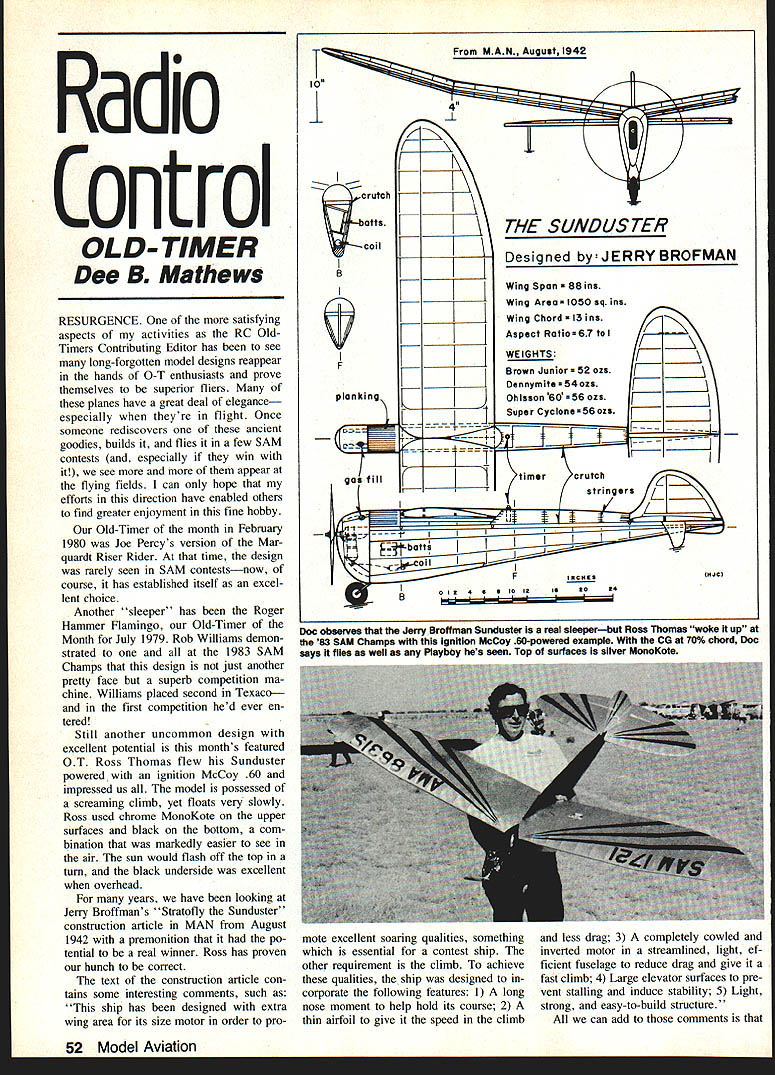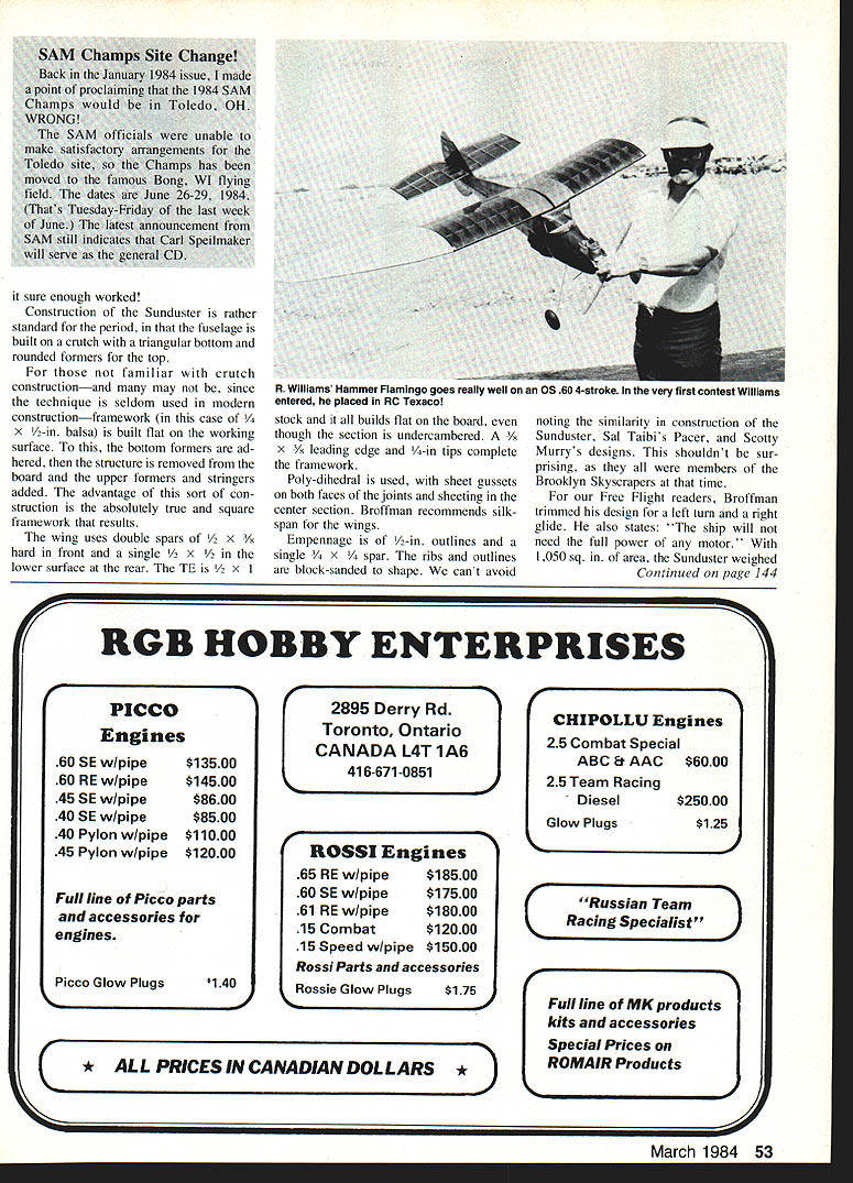 Radio Control OLD- TIMER Dee B3 Mathews RESURGENCE satisfying aspects activities RC OldTimers Contributing Editor has see long-forgotten model designs reappear hands O-T enthusiasts prove themselves superior fliers planes have great deal elegance especially theyre flight Once someone rediscovers ancient goodies builds flies few SAM contests especially win see more appear flying fields can hope efforts direction have enabled others find greater enjoyment fine hobby Old-Timer month February 1980 Joe Percys version Mar quardt Riser Rider time design rarely seen SAM contestsnow course has established itself excel lent choice Another sleeper has Roger Hammer Flamingo Old-Timer Month July 1979 Rob Williams demon strated 1983 SAM Champs design just another pretty face superb competition ma chine Williams placed second Texaco first competition hed ever en tered Still another uncommon design excellent potential months featured OT Ross Thomas flew Sunduster powered ignition McCoy 60 impressed us model possessed screaming climb yet floats very slowly Ross used chrome MonoKote upper surfaces black bottom com bination markedly easier see air sun would flash off top turn black underside excellent overhead years have looung Jerry Broffmans Stratofly Sunduster construction article MAN August 1942 premonition po tential real winner Ross has proven hunch correct text construction article con tains some interesting comments such ship has designed extra wing area its size motor order proFrom MAN August 1942 Ia 9- crutch otts coil B K THE SUNDUS TER Designed byJERRYBROFMAN Wing Span 88 ins Wing Area sq ins Wing ChordI3ins Aspect Ratio67 tol 6 stringers L. ii ~LbattII Sc iiI_ NV Si ES 0924S500iS 55S mote excellent soaring qualities something essential contest ship other requirement climb achieve qualities ship designed corporate following features 1 long nose moment help hold its course 2 thin airfoil give speed climb less drag 3 completely cowled inverted motor streamlined light ef ficient fuselage reduce drag give fast climb 4 Large elevator surfaces pre vent stalling induce stability 5 Light strong easy-to-build structure can add comments 52 Model Aviation Doc observes Jerry Broff man Sunduster real sleeperbut Ross Thomas woke up 83 SAM Champs ignition McCoy 60-powered example CG 70% chord Doc says files well Playboy hes seen Top surfaces silver MorioKote sure enough worked Construction Sunduster rather standard period fuselage built crutch triangular bottom rounded formers top familiar crutch constructionand may since technique seldom used modern constructionframework case /4 x /-in balsa built flat working surface bottom formers ad hered structure removed board upper formers stringers added advantage sort con struction absolutely true square framework results wing uses double spars /2 x 3/ hard front single /2 X /2 lower surface rear TE /2 x stock builds flat board though section undercambered x ing edge /4-in tips complete framework Poly-dihedral used sheet gussets both faces joints sheeting center section Broffman recommends silkspan wings Empennage -in outlines single spar ribs outlines block-sanded shape cant avoid noting similarity construction Sunduster Sal Taibis Pacer Scotty Murrys designs shouldnt sur prising members Brooklyn Skyscrapers time Free Flight readers Broffman trimmed design left turn right glide also states ship will need full power motor 1050 sq area Sunduster weighed Continued page 144 RGB HOBBY ENTERPRISES 0 2895 Derry Rd Toronto Ontario CANADA L4T 1A6 416-671-0851 ROSSI Engines $18500 $17500 $18000 $12000 $15000 65 RE wipipe 60 SE w/pipe 61 REw/pipe 15 Combat 15 Speed w/pipe Ross Parts accessories C Picco Glow Plugs140Rossie Glow Plugs$175 . _________________________ C LPRICESINCANADIANDOLLARS Russian Team Racing Specialist Full line MK products kits accessories Special Prices ROMAIR Products D 2 March 1984 53 R Williams Hammer Flamingo goes really well OS 60 4-stroke very first contest Williams entered placed RC Texaco PICCO Engines 60 SE w/pipe$13500 60 RE wlpipe$14500 45 SE w/pipe$8600 40 SE wlpipe$8500 40 Pylon w/pipe$11000 45 Pylon w/pipe$12000 Full line Picco parts accessories engines r CHIPOLLU Engines 25 Combat Special ABC & AAC $6000 25 Team Racing Diesel$25000 Glow Plugs$125 RC AerobaticsNan Putte Continued page 140 ably would better off avoided flying thunderstorms area As written cold weather just hit part Florida Yes know what frost like along Gulf Coast am about begin winter hibernation because dont like cold weather shiv ering flying field isnt idea fun So Ive given engines good shot rust preventative should keep good shape until its time wake next spring forgot winterize engines last fall its February read wouldnt hurt now Better late never comes winterizing engines could preclude having buy new bearings next spring Ron Van Putte 111 Sleepy Oaks Rd Ft Walton Beach FL 32548 RC Soaring/Pruss Continued page 51 sport youre asking Whats Well radio dependable radiowhich hasnt scene few years still see popping up flying scene time time Good news still have need servicing Full ser vice replacement parts available Full Command Systems 908 E Rosewood Spokane WA 99208 new catalog tells Davey Systems Corporation folks have come up line-retriever really works Ted Davey has made Sail plane life simpler often-sought-after winch items winch drum usually stops do-it-yourselfers cold Ted has available drum has 5/s-in bore ideally suited Ford long-shaft startersa four-in center four-in spacing between eight-in -diameter plates goes $50 plus $3 shipping See DSCs ad issue Model Aviation winch retrieval systems HIGH QUALITY FOAM WING CORES AND CUSTOM FOAM CUTTING have large selection wing cores available stock meet modeling needs also specialize custom cutting reasonable prices like top quality products low prices fast service contact us next project information & p ces contac Ocean State Aeromode Eng nneer ng 21 Jaycee Dr West Warwick Rl 02893 OrcallRonaftar6OOpm -40 82888 3 Fec Feam 