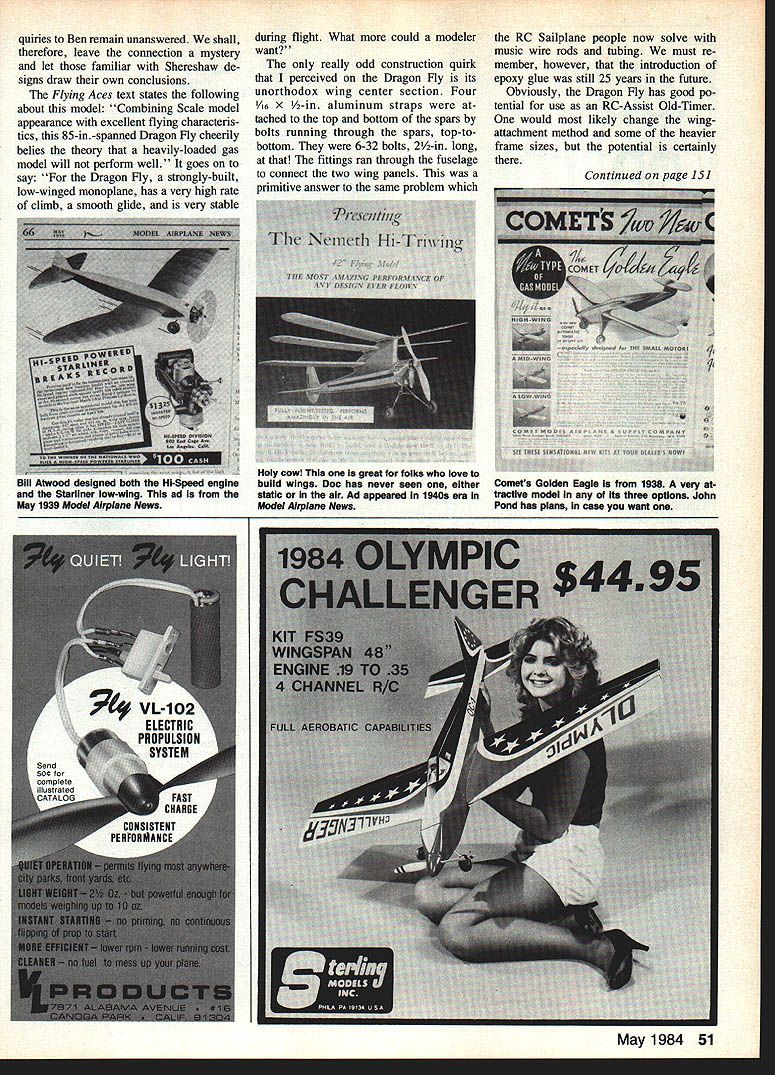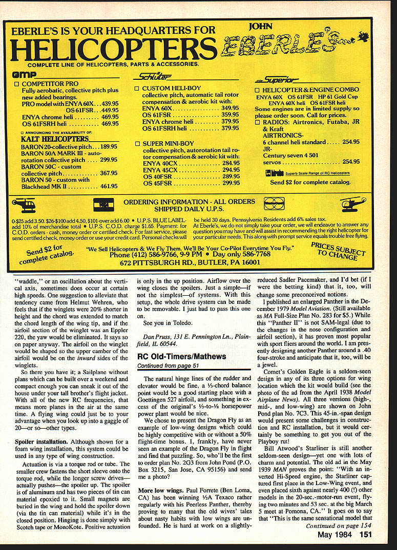 rIUM ILTINb ALL MAHUJi Ii Radio SEC D TYP CAL Control 0 OLD- TIMER Dee B Mathews THREE facts have running around head lately 1 West Coast SAM Champs will award low-wing planes 50% increase flight times up limit max 2 Bill Winter beat Doc punch featuring Sadlers low-wing Pace maker design 3 thermal has no idea models wing located What does lead months Old-Timer published March 1938 issue Flying Aces Although construc tion article credited Charles Williams piercing look model makes sus pect genius Ben Shereshaw lurks background models construc tion methods its dynamics very rem iniscent other Shereshaw designs empennage shape wing tip outlines use planking around tips quite similar Bens Cumulus Cloud Cruiser designsand others example fuselage constructed formers crutch planked balsa strips very much like Shereshaws early Cavalier can speculate concerning asso ciation between Charles Williams Ben Shereshaw however since inWING 8 STAB RIBS ARE CAPPED STRIPPEDAT OPEN AREAS Desianed CHARLES K WILLIAMS WING SPAN85 INS WING AREA926 SO INS APPROX LENGtH5O /2 INS POWERBROWN JR 75/B {SOLID TIPS. III c. - - IL~a I DRAGONFLY WING SECTIONHINGE GOETTINGEN 527LINE FOR RC TYP I,N III N EI II iiIN -t----I 0 N CONSTRUCT C/S AS THIS B INSERT FUSE GLUE ON RIB LEADING 8 TRAILING EDGE DRILL HOLES FOR BATT BLOCKFITTINGS BEFORE INSTALLING--9 I. 1.- :JADDSPAR FOR RC NO E ENT RE FUSE AGE P ANKEDI COMP- FROM F REWALL AFT/I METAL FITTINGS TOP 8 BOT OM ...1~ hIe Doc rampage low-wingers Heres latest featurea Dragon Fly Panther popular old days seems now E L Lukow 1 flIes Panther ii MA plan No 283 December 1979 Charleston SC Radio Control Society Meanwhile Paul Forrette files less Panther R Texaco California wife Lee calms model its photo could taken 50 Model Aviation quiries Ben remain unanswered shall therefore leave connection mystery let familiar Shereshaw de signs draw own conclusions Flying Aces text states following about model Combining Scale model appearance excellent flying characteris tics 85-in-spanned Dragon Fly cheerily belies theory heavily-loaded gas model will perform well goes say Dragon Fly strongly-built low-winged monoplane has very high rate climb smooth glide very stable during flight What could modeler want really odd construction quirk perceived Dragon Fly its unorthodox wing center section Four 1A6 X 1/2-in aluminum straps tached top bottom spars bolts running through spars top-tobottom 6-32 bolts 2/2-in long fittings ran through fuselage connect two wing panels primitive answer same problem RC Sailplane people now solve music wire rods tubing must re member however introduction epoxy glue still 25 years future Obviously Dragon Fly has good po tential use RC-Assist Old-Timer would likely change wingattachment method some heavier frame sizes potential certainly Continued page 151 May 1984 51 Pill RiWOO aesignea pain ni-opeeg engine Starilner low-wing ad May 1939 Model Airplane News Holy cowl great foiks love buiid wings Doc has never seen eitherComets Goiden Eagle 1938 very atstatic air Ad appeared 1940s era intractive modei its three options John Model Airplane NewsPond has pisns case want EBERLES IS YOUR HEADQUARTERS FOR HEIJCOPTERS EBLE& COUPtETE LOGE OF HEUCOPTERS PARTS & ACCESSORIES um o COMPETITOR PRO Fully aerobatic collective pitch plus new added bearings PRO model with ENYA 60X 5 OS6IFSR. 44995 ENYA chrome hell46995 OS 6IFSRH hell46995 O ANUOa4OING TN AVAILAUUTV 0 KALF HWJCOflUS__ BARON 20-collctive pitch 5 BARON 50A MARK ill auto rotation collective pitch .. 29995 BARON SOC custom olective pitch36795 BARON 50 custom BlmckheadMK II46195 o CUSTOM Hal-BOY collective pitch automatic tail rotor compensation & aerobic kit ENYA 60X34995 OS 61FSR35995 ENVA chrome hell37995 OS 61FSRH hell. 95 o SUPER MINIBOY collective pitch autorotation tail ro tor compensatio& aerobic kit ENYA 4OCX28495 ENVA 4SCX29495 OS 4OFSR28995 OS 4SFSR29995 o HEUCOPTER &ENGR*COMBO ENYA6OX OS61FSR HP6I Gold Cup ENVA 60X hell OS 61F8flhell Some engines Endt*&s4pIy please order soon Cal Sot pelces O RADIOS Airtronics Fat*o JR &Kraft AJRTRONICS 6 channel hell standard25496 JR Century seven 4501 seivos25495 PWI Seal Range ci AC NalICOPIiI Send $2 complete catalg Z ORDERING INFORMATION ALL ORDERS SHIPPED DAILY UPS 0425 add 350 $264100add40$101-overadd600 BLUE LABEL- held 30 days Pennsylvania Residents add 6% sales tax add 10% merchandise total COD charge $165 Payment Ebedes simply take order will endeavor answer COD orders cash money order certified check fast service please question may have will assist recommending ri9bt helicopter send certified check money-orderer use credit card Personal checks will particular needs along prompt service equals troublefree lying l Helicopters & Fly Wel Co-Pilot Everytime Fly ICI$ 412586-97669-9 PM 586-7768TO cgjcr 672 PI1TSBURGH RD BUTLER PA 16001E waddle oscillation about verti cal axis sometimes does occur certain high speeds suggestion alleviate tendency came Helmut Wehren feels winglets 20% shorter height chord extended match chord length wing tip airfoil section winglet Eppler 220 yaw would eliminated says paper anyway airfoil winglet would shaped upper camber airfoil would inward sides winglets So have Sailplane plans can built over weekend compact enough can sneak out house under tall brothers flight jacket new RC frequencies means planes air same time flying wing could just advantage look up gaggle 20or soother types Spoiler installation Although shown foam wing installation system could used type wing construction Actuation via torque rod tube smaller crew fastens short sleeve onto torque rod longer screw drivesactually pushesthe spoiler up spoiler aluminum has two pieces tin can material epoxied Small magnets buried wing hold spoiler down via tin can material its closed position Hinging done simply Scotch tape MonoKote Positive actuation up position Airflow over wing closes spoilers Just simpleif simplestof systems setup whole drive system can made removable just pass See Toledo