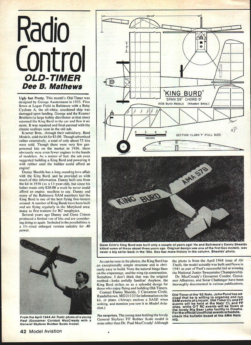 Radio Control OLD- TIMER Dee B8 Mathews Ugly Pretty months Old-Timer designed George Austermann 1935 First flown Logan Field Baltimore Baby Cyclone all-white uncolored ship damaged upon landing George Kramer Brothers large hobby distributor time returned King Burd car flew no repaired final-painted classic scallops seen old ads Kramer Bros. through subsidiary Burd Models sold kit $300 Though advertised rather extensively total about 75 kits sold Though very few gaspowered kits market 1936 obviously fewer engines bands modelers As matter fact ads suggested building King Burd powering rubber until builder could afford engine Danny Sheelds has long-standing love affair King Burd provided us much information Danny built kit 1936 13-year-old since father made $2000 week never could afford engine needless say Danny Baltimore SAM members feel King Burd best flying five-footers around number King Burds have built flying regularly Maryland area first trainers RC neophytes Several years ago Danny Gene Crimm produced limited run kits consider ing doing again Included possibilities 1-sized enlarged version suitable 40 power U_ 3 A- ____ di SPAN 59 CHORD 9 936 BURD MODELSKRAMER BROS 0369 __________________SECTION-CLARK V FULL SIZE INCHES Fl As can seen photos King Burd has exceptionally simple structure obvi ously easy build Note natural hinge lines empennage wing tip construction Somehow dont think original methodlooks awfully familiar Anyhow King Burd strikes us splendid design enjoy flying building Old-Timers Contact Danny Sheelds 3 Cinnamon Circle Randallstown MD 21133 information kit plans Always enclose SASE writing mention saw Model via don No surprises young man holding lovely General Skyfarer FF Rubber Scale model other Dr Paul MacCready Although photo April 1944 issue Air Trails model actually built flown 1941 part Pauls successful bid winning National Junior Sweepstake Championship Dr MacCreadys Gossamer Condor Gossa mer Albatross Solar Challenger have thoroughly documented various publications Old-Timeratthe82 Nats John Pond has ad vised willing organize run SAM events Lincoln Old-Timer CLand FF events will held Nats CL FF sites O-T RC events will flown lovely Big Bear Lake facility Omaha official Unofficial events schedule check bulletin board AMA Nats HO 42 Model Aviation Gene srlms llng uurd bullS couple ot years ago ualtlmores vanny neelU5 kitted some about three years ago Original design first Gas models never big seller back 30s Doc has history column Sheelds photo April 1944 Air Trails photo young Paul Gossamer Condor MacCready General Skyfarer Rubber Scale model modelers have detected concepts obviously derived model airplanes construction aerodynamics Examples obvious exterior wire bracing commonly used Indoor models large-diameter slow-moving props commonly seen Rubber Power duration models heat-shrink Mylar coverings perhaps interesting unconventional feature use stab tilt control lateral movement features much model aircraft full-scale practices should feel justifiable pride Mac Creadys accomplishments did get aircraft development through hobby utilized some its basic principles construction flying Gas oil February column detailed some development testing doing electronic ignition systems Bill Carpenter CHS Electronics Included two photos some early findings have now using units several applications highly impressed Features particularly appreci ate absolutely noth ing need cut bolted onto engine black bO\ totally selfcontained coil condenser chip etc idiot-proof method setting up unit CHS unit available smaller size better suited engines 15 29 range well original unit will run chainsaw engines Some sample performance numbers K&B 40 Stock No 8011il x 6 Top Flite Super Maple8500 rpm five minutes per ounce regular gas Klotz oil results really shocked us 8500 rpm 16 x 6 Top Flite two-and-one-half minutes per ounce OS Max 90 smaller unit will give about one-and-onehalf hours sparks 250 mAh battery pack larger 500 mAh setup will spark Continued page 129 Iat NORTHERN CALIFORNIAS LARGESTU ISCOUNT HOBBY SHOPI I well FUEL New high film strength lubricant U increased power engine lifeI Highest quality ingredients I II II II II II II II II II IHOURS Monday thru Wednesday V-JU-O iU lflurSday b 1-riday YZJU-6-OU L m Saturday 930-600Sunday 1200-500J m ugust 1 982 43 uoc-s neen playing around transistorized ignition systems again Heres K&B 61 prototype system tells us about month Swings 12-6 Top Flite atg500 rpm runs 31/2 mm ounce regular gas Klotz oil look like timing marks spinner backplate Ignition electronics black box next fuel tank Ni-Cd battery pack just behind Sensor detects spinner-mounted impulse magnet engine mounting lug Its wonderful Leisure electronics exquisite Playboy kitsuitable Iortheir05 electric system add-on prop drive Wood parts superior Note plans show rare Cabin Playboy configuration too MAXIMIZE YOUR FLYING TIME WITH ELECTRIC EAGLES FLIGHT TIMER ~ecf Tic Flight Timer $2495 postage Add 6% sales tax Calif res 25 Weeping Wood Irvine CA 92714 worlds first LCD Countdown Timer alarm mounts transmitter INCLUDES Easy set 72 hour maximum timer 30 second alarm easy-mount slide-in tray extra battery extended use highly visible display bright sunlight also has travel alarm clock calendar H0bbV Horn 4 WE ARE PLEASED TO ANNOUNCE acqcisition Hal Osborne Plans Service Included over 190 eaceptionally high quality Scale plans drawings Cowplele list 50 PP see below COMING SOON enpect have Partial Kit Snow White Antique Gas Model 193t1 available near future pro duced Gene Wallock P W Model Service Price Availability date known liwe Watch ad information OLD TIMER KITS Partial Full Kits P 0 1 Seni Kilo- --Cot Porta Kilo --Olochine Cal 1939 Comet Zipper 54 Spon plon inetpricel $3309 1939 Trenton Terror 72 Iplon md price $2t09 93f Berkeley B occaovcr 04 plan net price $2559 Other P & N Seroi Kits oVaitolle 12100 net lricv 1939 Comet Clipper MK $19 25 1932 tialtaire Sportster $3109 t939 Scie