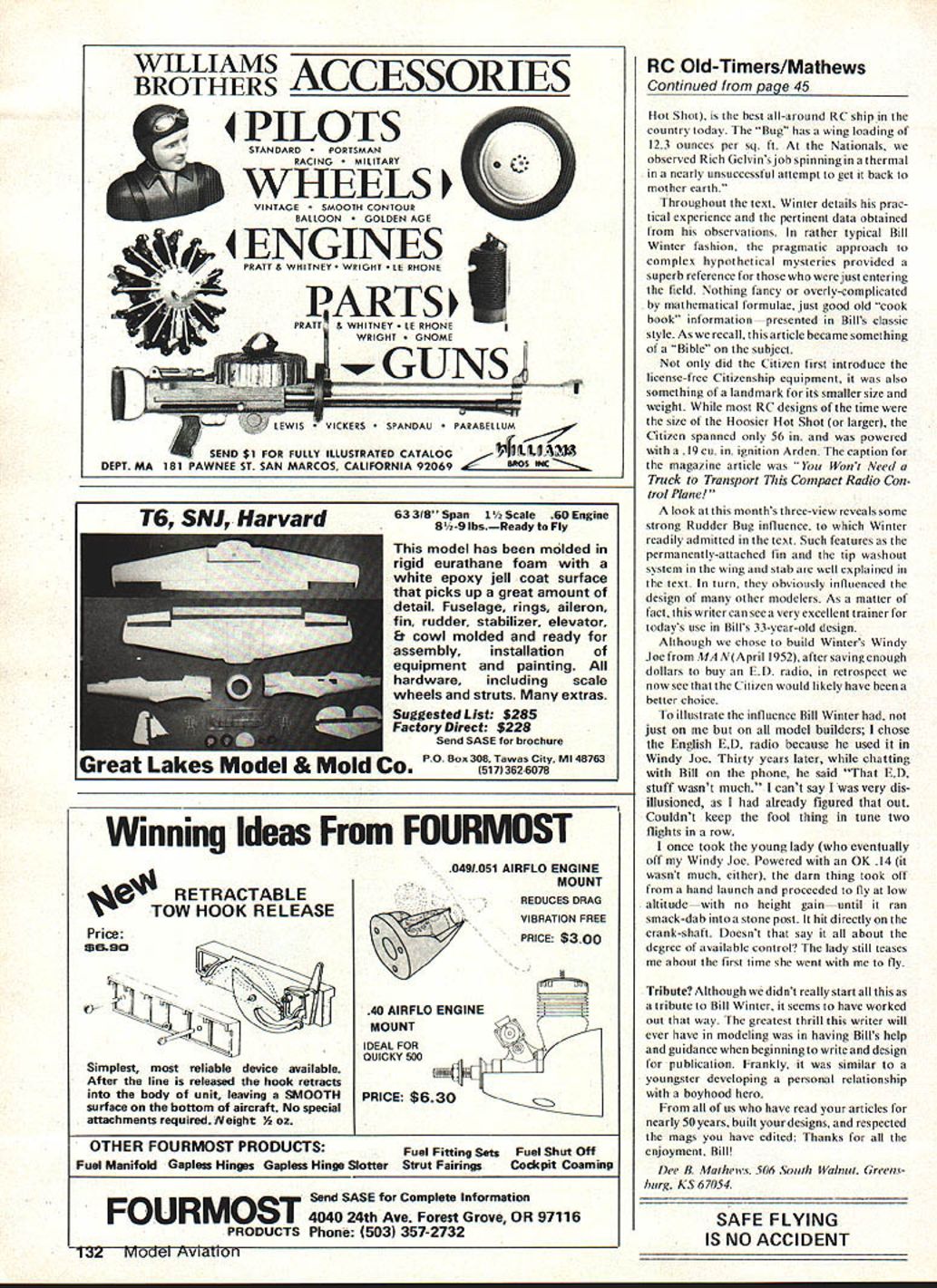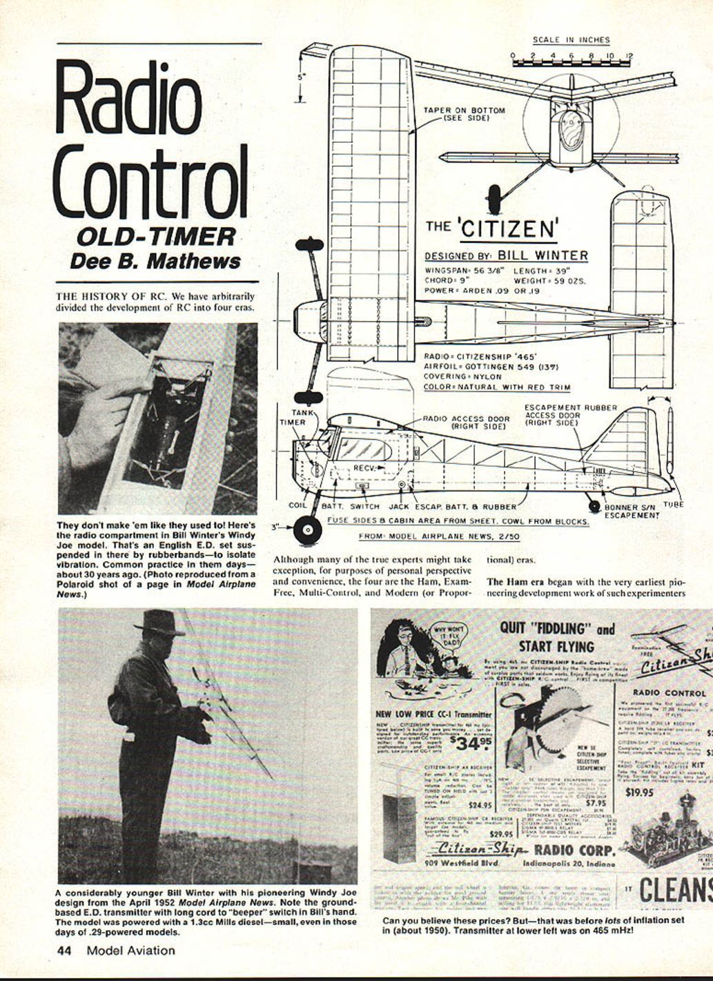 Radio Control OLD- TIMER Dee B Mathews THE HISTORY OF RC have arbitrarily divided development RC four eras dont make em like used Heres radio compartment Bill Winters Windy Joe model Thats English ED set sus pended rubberbandsto isolate vibration Common practice days about 30 years ago Photo reproduced Polaroid shot page Model Airplane News SCALE IN INCHES TAPER ON BOTTOMC SEE SIDE 0 THE c ITIZE N DESIGNED BY BILL WINTER WINGSPAN- 563/8LENGTH 39 CHORD- 9WEIGHT 59 OZS POWER ARDEN 09 OR 19 - -J --I ___ - 1I RADIO CITIZENSHIP 465 AIRFOIL GOTTINGEN 549 137 COVERING NYLON H. COLOR NATURAL WITH RED TRIM ESCAPEMENT RUBBER TACCESS DOOR TIMERNRADIO ACCESS DOORRIGHT SIDE RIGHT SIDE -a I OILBATT SWITCH JACK ESCAR BATT ERBONNER S/N TitiE ESCAPEMENT FUSE SIDES N AREA FROM SHEET COWL FROM BLOCKS 30 FROM MODEL AIRPLANE NEWS 2/50 Although true experts might take tional eras exception purposes personal perspective convenience four Ham Exam- Ham era began very earliest pinFree Multi-Control Modern Propor- neeringdevelopmentworkofsuchexperimenters $2 w s CI5ZfII0p - "" -- $3 snemsKIT $2495 - $199S $2995 Citileft O CORP fldIn4iuopls 20 Indieoa PIrA1I Eiu3u j Can believe theae prices Butthat before lots inflation set about 1950 Transmitter lower left 465 mHz 44 Model Aviation consiaerably younger uili Winter wilfl faa pioneering winay Joe design April 1952 Model Airplane News Note groundbased ED transmitter long cord beeper switch Bills hand model powered 13cc Mills dieselsmall days 29-powered models Clinton DeSoto Leo Wiess Chet Lanzo Good brothers Charles Sigfried Jim Walker several others almost instance primarily modelers strong educa tional practical experience electronics Ham radio radio enthusiasts also model airplane builders last column attempted point out tinkerers delight nature available equipment Foxworthy example years consultant major electronics manufacturers US Goods ended up PhDs physics Jim Walker can described Thomas Edison model flying other pioneers ended up making living electronics time primary emphasis devel oping workable radio control equipment secondary interest model airplanes led application control flying models models part converted Free Flight designs concession unreli able nature RC equipment hope models inherent stability would prevent serious crashes event radio system failure owe much pioneering efforts endless hours experimenting testing led development RC know today Examination-Free era opened up RC vastly larger segments hobby 1950 reliable commercially-available equipment market Ham license still required however obtaining simple matter sending check test taken passed covering electronic theory law andmost exasperating allone able receive transmit Morse code flying buddy days interested enough radio take correspondence course LaSalle Institute remember prepa ration licensing exam Primitive workable equipment avail able Beacon Good design RC H Aero trol Bell Labs 5354 mHz bands bulky heavy tricky expen sive sure no longer RC limited ability design build own equspment Summer 1950 Vernon McNabb Indianapolis introduced single-channel RC equipment 465 mHz could licensed withou examination Foxworthys Nationalwinning Hoosier Hot Shot used equipment although magazine plans show Good Brothers equipment find rather amusing note original commercial use term Citizen band applied RC equipment 465 mHz rather later good buddy bunch 27 mHz us unforgettable identifier Citizen ship 465 transmitters antenna looked bit like TB Association symbol Christmas seal didnt receiver antenna rectangular sheet-metal folded box mounted below receiver pair hefty plastic insulators knowledge McNabb system ever sold 465 mHz weve often wondered memory serves 465 mHz frequency was already allo cated such use Citizenship developed equipment take advantage Should reader overly impressed low prices ad weve duplicated little perspective order same time Arden 19 sold $1095 considered finest engine size available Currently Duke Foxs would fit same descrip tion sells 54995 newly-reduced price Multiply radio components differen tial youll find price 1983 dollars Makes todays six-channel proportional system look like real bargain doesnt March 24 1952 significant date history RC modeling After months hard work AMA obtained 27255 mHz frequency use date hobby has grown popular recreational activity world Academy and-its members per sisted letter-writing campaigns elected Washingtcn representatives strong lobbying efforts carefully-executed applica tion would likely still trying learn Morse code model month three-view photos effort recapture dawning era Future columns will take glimpse MultiControl Proportional eras Bill Winters Citizen have selected months model illustrate beginning License-Free era Published Model Airplane News February March 1950 design yen first published use examination-free radio control s Istem text Winter explains McNabb loaned him three original test units As being written transmitter before FCC possible approval expounding Isis design philosophy Bill wrote An analysis made Rudderbug Walt Goods along Gene Foxworthys twin-tailed job last columns Hoosier Confinuedon page 132 1. 315 TA-SI MX Complete adjustable exhaust mount $ 26590 -4 1/4 AXLE with support wheel Pant 1495 Pr BOOSTER FUEL MIX 3oz Oil 3oz NITROETHANE R Add gasoline ke gallon LI S Put aBEET your-R tank TigersJ cant fly 325 2 Servos safer coupled Think Fail Safe h 1983 45 K AWA S K NEW FOR 83 PLANES 82/83 IM Plans Handbooks No 1 L Free Flight Planes No 3 Trains Steam Engines No 4 Radio Control Planes No 5 Scale Drawings Planes Radio Modeller Planbook H/C FF Scale Any ONE above PLUS TAUBMAN catalog planes $275 plus $125 3rd class domestic ship ping Can Mex overseas surface mail overseas airmail $400 ONE plans handbook add $200 per EACH plus $ 50 shipping BOATS TAUBMANS 83/84 Boat catalog whopping 140 pages 1000 illustrated plans books galore some interes j-ting stuff PLUS 82/83 IMA Plans Handbook No 2 boats L cars $350 plus $150 d