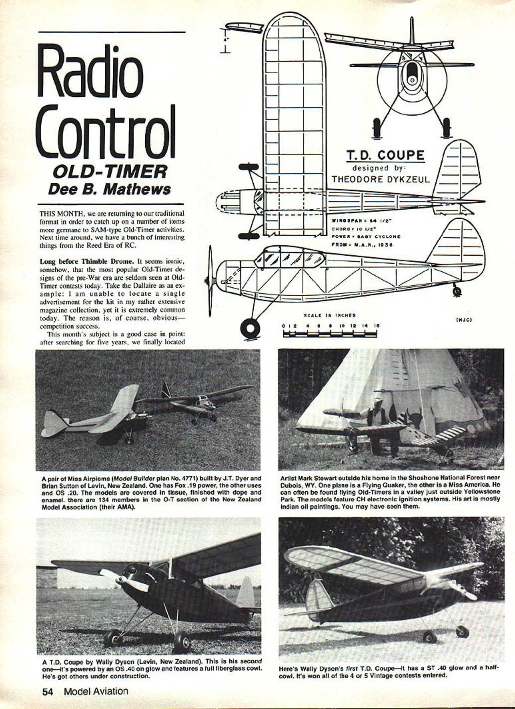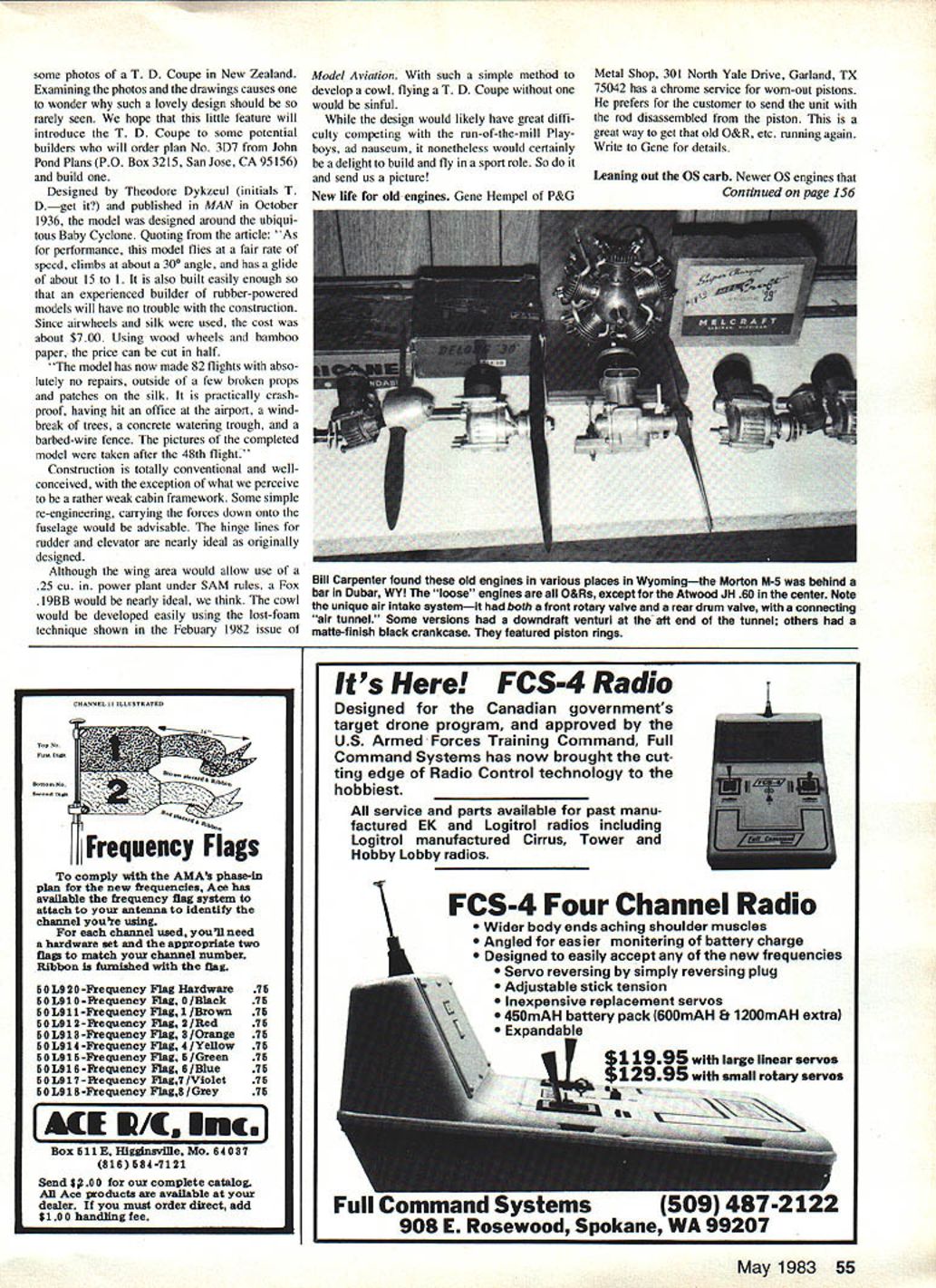 Radio Control OLD- TIMER Dee B Mathews THIS MONTH retuming traditional format order catch up number items germane SAM-type Old-Timer activities Next time around have bunch interesting things Reed Era RC Long before Thimble Drome seems ironic somehow popular Old-Timer de signs pre-War era seldom seen OldTimer contests today Take Dallaire ex ample am unable locate single advertisement kit rather extensive magazine collection yet extremely common today reason course obvious competition success months subject good case point after searching five years finally located 4 4J L L L K L KTD COUPE designed THEODORE DYKZEUL L ______ ______ _____ II Il~---- CHOR0 10 /2 IJ~v4IJ POWER BABY CYCLONE MAN 1936______ 1/SCALE IN INCHES tNJC 012 w 6 10 15 14 IS pair Miss Airpiems Model Builder plan No 4771 built JT Dyer Brian Sutton Levin New Zealand has Fox 19 power other uses Os 20 models covered tissue finished dope enamel 134 members O-T section New Zealand Model Association AMA TD Coupe Wally Dyson Levin New Zealand second oneits powered 05 40 glow features full fiberglass cowl Hes got others under construction Artist Mark Stewart outside home Shoshone National Forest near Dubois WY plane Flying Quaker other Miss America can often found flying Old-Timers valley just outside Yellowstone Park models feature CH electronic ignition systems art mostly Indian oil paintings may have seeti 54 Model Aviation Heres Wally Dysons first TD Coupeit has ST 40 glow halfcowl Its won 4 5 vintage contests entered some photos T D Coupe New Zealand Examining photos drawings causes wonder such lovely design should rarely seen hope little feature will introduce T D Coupe some potential builders will order plan No 3D7 John Pond Plans PO Box 3215 San Jose CA 95156 build Designed Theodore Dykzeul initials T Dget published MAN October 1936 model designed around ubiqui tous Baby Cyclone Quoting article As performance model flies fair rate speed climbs about 300 angle has glide about 15 also built easily enough experienced builder rubber-powered models will have no trouble construction Since airwheels silk used cost about $700 Using wood wheels bamboo paper price can cut half model has now made 82 flights abso lutely no repairs outside few broken props patches silk practically crashproof having hit office airport wind break trees concrete watering trough barbed-wire fence pictures completed model taken after 48th flight Construction totally conventional wellconceived exception what perceive rather weak cabin framework Some simple re-engineering carrying forces down onto fuselage would advisable hinge lines rudder elevator nearly ideal originally designed Although wing area would allow use 25 cu power plant under SAM rules Fox I9BB would nearly ideal think cowl would developed easily using lost-foam technique shown Febuary 1982 issue Model Aviation such simple method develop cowl flying T D Coupe would sinful design would likely have great diffi culty competing run-of-the-mill Play boys ad nauseum nonetheless would certainly delight build fly sport role So send us picture New life old engines Gene Hempel P&G Metal Shop 301 North Yale Drive Garland TX 75042 has chrome service worn-out pistons prefers customer send unit rod disassembled piston great way get old O&R etc running again Write Gene details Leaning out OS carb Newer OS engines Continued page 1S6 May 1983 55 Bill Carpenter found old engines various places Wyomingthe Morton M-5 behind bar Dubar WY loose engines 0&Rs except Atwood JH 60 center Note unique air intake systemit both front rotary valve rear drum valve connecting air tunnel Some versions downdraft venturi aft end tunnel others matte-finish black crankcase featured piston rings Its FCS-4 Radio Designed Canadian governments target drone program approved US Armed Forces Training Command Full Command Systems has now brought cut ting edge Radio Control technology hobbiest ___________________ service parts available past manu factured EK Logitrol radios including Logitrol manufactured Cirrus Tower Hobby Lobby radios N Frequency Flags comply AMAs phase-In plan new frequencies Ace has available frequency flag system attach antenna Identify channel youre using channel used youll need hardware set appropriate two flag match channel number Ribbon furnished flag 50 L9 20 -Frequency Flag Hardware 75 SOLB1O-l6equency l1lag0/Black 75 50 L91 1-Frequency Flag 1/Brown 75 SOLBl2-ftequency 112ag2/Rad 75 50 LB 18-Frequency Flag 8 /Orange 75 SOLBid-Frequency Flag4/Yellow 75 SOLBiS-Frequency Flag 5/Green 75 li0L9l6-1equency Flag8/Blue 75 50 LB 1 7- equency Flag /Vlolet 75 50LB18Frequency Flag8/Grey 75 ME E/ EhuEJ Box BilE Hignsvlfle Mo 64081 816 584-7121 Send $1 00 complete catalog Afl Ace products available dealer must order direct add $100 handling fee FCS-4 Four Channel Radio Wider body ends aching shoulder muscles Angled easier monitering battery charge Designed easily accept new frequencies Servo reversing simply reversing plug Adjustable stick tension Inexpensive replacement servos 45OmAH battery pack 600mAH & 1200mAH extra Expandl Command 908 E Rosewooa spokane WA TOLEDO/83 TWENTY-NI NTH ANNUAL RADIO CONTROL EXPOSITION TOLEDO SPORTS ARENA ONE MAIN STREET TOLEDO OHIO Reserve April 8 9 10 1983 attend worlds greatest radio con trol model show featuring worlds largest Swap Shops no dealers complete ref resh ment centers Saturday Night Auction raffles complete nc systems accessories acres free parking Bring latest com pletely finished models display enter com petition exciting awards Complete nc systems will presented first second third place win ners new Video Cassette Recorder will awarded lucky winner Best Show Open public three great days APRIL8 9&1O presented Weak Signals RIC Club PO Box 5772 Toledo Ohio 43613 Fine Quality Flying Models atalogS1 50 98 RUBBER POWER KITS plus Gliders c/L R/C Accessories Books 4 4 4 4 4 4 4 4 4 MAJESTIC MODELS 3273 West 129th Street Cleveland Ohio 44111 Just before airplane ready land reduce throttle