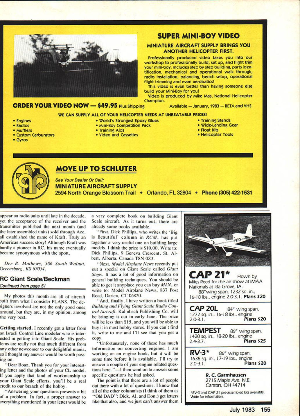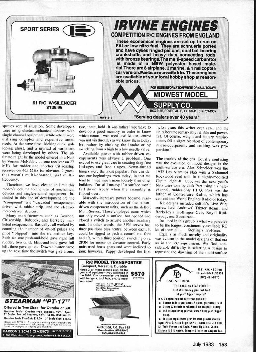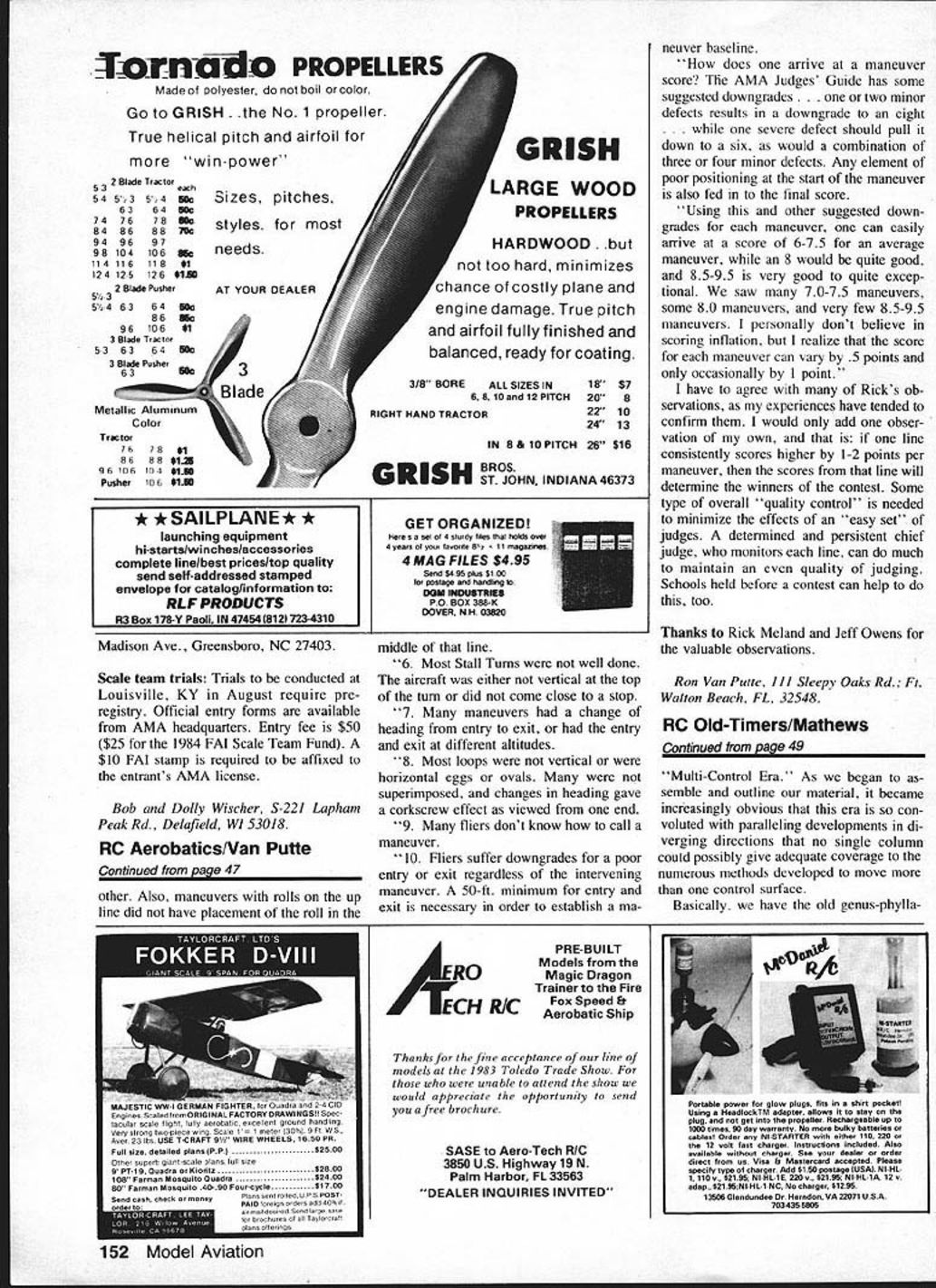 Radio Control OLD- TIMER Dee B Mathews SAM CHAMPS 1983 Society An tique Modelers Championships sched uled July 19-2 1 La Junta CO La Junta small city population about 8000 located near exact center southeast quarter state Sangre de Cristos range Rocky Mountains lies rougly 120 miles directly west former Air Corps field lies three miles north city has three intersecting runways 8000-ft length Field altitude 4238 ft Surrounding terrain essentially flat treeless however area exten sively irrigated canals run through along fields home famous Rocky Ford cantaloupe although harvested until later season July weather usually has very warm dry days cooler evenings Winds can range dead calm very strong depending frontal passages area dominated high pressure dome dead calm winds will prevail however low pressure passing through stationary farther downwind can anticipate 20 30 mph perhaps stronger gusts Pray high pressure Like poem weather high Plains can run very very good horrid According Wind Power Chart sent us Bob Bostrom Santa Maria CA place adjacent USA stronger daily average wind velocities Dodge City KS Rawlins-Laramie WY area just Dick Haung Ft Worth recently-constructed computer model atmospheric data La Junta found can expect lose about 25% sea-level performance model achieving 400 sec still air sea level duration will decrease about 300 sec Most 25% loss due decrease climb speed resulting power output losses air-breathing engine number used generate figure based Playboy Senior should applicable Old-Timer Heres what innards compound escape ment looked like Cam follower would sol dered wire torque rod run control surface Wiper controlled electrical circuit energize second escapement Antique design except electric-power Housing will available dorms junior college area motels Early reservations advisable latecomers likely will find accommodations although perhaps close necessary qualify way compete SAM Champs Spectators 2 lIZ TIPICAL WING SECTION ISUILO AS FLAT THEN GOD HOTTOM PART OF N B m 2 S/lO /II / I 11 7 71fl 77 777 l~fl K77 I7 IB 1FLI Designed bys PHIL KRAFT very welcome urged bring along stopwatch help out timing chores Come out join fun Membership SAM has re quired contestants past some winners have actually members Such tightwad behavior will likely allowed year BONNER VARI COMP SPEED GOVERNOR CAMPAWL CAM FOLLOWER 48 Model Aviation WINgSPAN47 TOP M 1POWEROB MAX 15 OR 19 ICASCADED BONNEt VANI-COMPS IFOR NIGHTLEFTGPOOWN S IFOR QUICK BLIP MOTOR BUILT IN INOT SHOWNIT 3 RIGHT THRUST1CONTROL S1 dlli.... Li]I II INCHES H IC0 12345675101214IN further information contact Jim Thomas 1050 Clarkson Denver CO 80218 Hal deBolt first motorized actuators Doc remembers first nylon gears hed ever seen Ad Fifties Further Maturation RC Previous columns have taken quick glimpses Ham Exam-Free eras RC de velopment month subject Continued page 152 another manufacturer 465 MHz RC gearBabcock ad 1956 MAN Multi-Servos powerful dependable motor driven R/C actuators built Worlds oldest largest producer li/C servos Developed through years i type gives best possible action sort model control Multi-Servos smallest lightest powerful actuators available yet eco nomical operate Latest types use special servo motor Nylon gears vernier brakes printed wiring MODELS ONE 1 u GREAT R EVERY PURPOSE SINGLE CHANNELBOAT SERVO 2PN rudder $1195 ZP2N auxiliary. $1195 3P8N engine . $1195 DELUXE TYPES SPNX compound action$1495 ZP2NX auxiliary . $1495 SP3NX engine control.. $1495 Model SPN gives ward reverse stop plus steering . $2495 MULTI-CHANNEL Mcli rudder aileron controls elec tronic neutral . $1895 MCE elevators engine Full partial trim $1895 Patented Number 2867394 SERVO INFO BOOKLET 25c W P rI tm THE NEWEST MOTOR FROM Fox AMERICAS LARGEST INDEPENDENT MANUFACTURER OF MODEL AIRPLANE PRODUCTS POX 19 BB Bore 650 Stroke600 Diaplacement199 RPM wIth 6-4 prop . 17000 Weight8 ConsumptIon 4 oz mm Schnuurle porting course rugged parts lots power good idle unique design feature upper cylinder casting can turned exhaust either side back rear exhaust installations Structurally Fox 19BB peer crankshaft made aircraft quality 8620 steel supported two 11mm ball bearings con rod bushed piston fully machined mehanite runs leaded steel liner 22000 Fox 19BBRC$5995 90219 Tiltdown Muffler1995 90220 TIlt-up Muffler1995 50203 Motor Mount800 Fox MFG CO 5305 TOW5ON AVt FORT SMITH ARK 72901 Hot Line 15011 646-1656 USA NIEm~3PROOUCFSINCIJEPI-U XJJ PO BOX 818 0 POTTSTOWN PA 19464 37-1231 o u TAt TACHOr4ETeu Left GMP-2001-R Regular Right CMP-2001 0 Deluxe Dealers Invited ELECTRIC RETRACTS GIEZENDANNER Two Time World Champion REGULAR RETRACTS 5/32 Pattern- Up 10 lbs HEAVY DUTY RETRACTS 3/16 ForScale-lOto 18 lbs EXTRA HEAVY DUTY RETRACTS 1/4 Big Onus 18 50 lbs retract Slip Clutch prevent jamming stripping gears ELECTRONIC DIGITAL TACHOMETERS GMP-2001-R 2001-D Visiblu Visible display ondisplay Visible low batteryVisible low battery displaydisplay 2 Bladed Only2 & 3 Bladed props W liquid display4 liquid display Crystal control ledCrystal controlled Catalog Available Ideal beginner well master flier CHARGE IT Yes have Giezendanner Wipers 3 Bladed Low-Noise Glass Filled Props Juiy 1983 49 Guess Phil Kraft winds escapement er 1959 Bi-Fli r I-li 1981c Aerooatmcunampi - ui 7 consecutive Las Vegas Tour,0 nt Champions Shown above Giezendanner GMP 2001-0 Digital Tachometer fiOiflO Made 0 yeste bo color Go GRISH No 1 propeller True helical pitch airfoil win-power 2 elade Tractor 53each 545354Uk 6364lOc 747678Uk 848688C 949697 98104106 eds 114116118 i 1241251261U 2 Blade Pusher 5 3 54 6364USc 86USc 96106i 3 Bladetractor 53 63 64 Nc 3 Blade Pusher 63USc3 Metallic AluminumBlade color Tractor Of75i 8688iu 96 06104JS Puohr106*135 Madison Ave Greensboro NC 27403 Scale team trials Trials conducted Louisville KY August require pre registry Official entry forms available AMA headquarters Entry fee $50 $25 1984 FAI Scale Team Fund $10 FAI stamp required affixed entrants AMA l