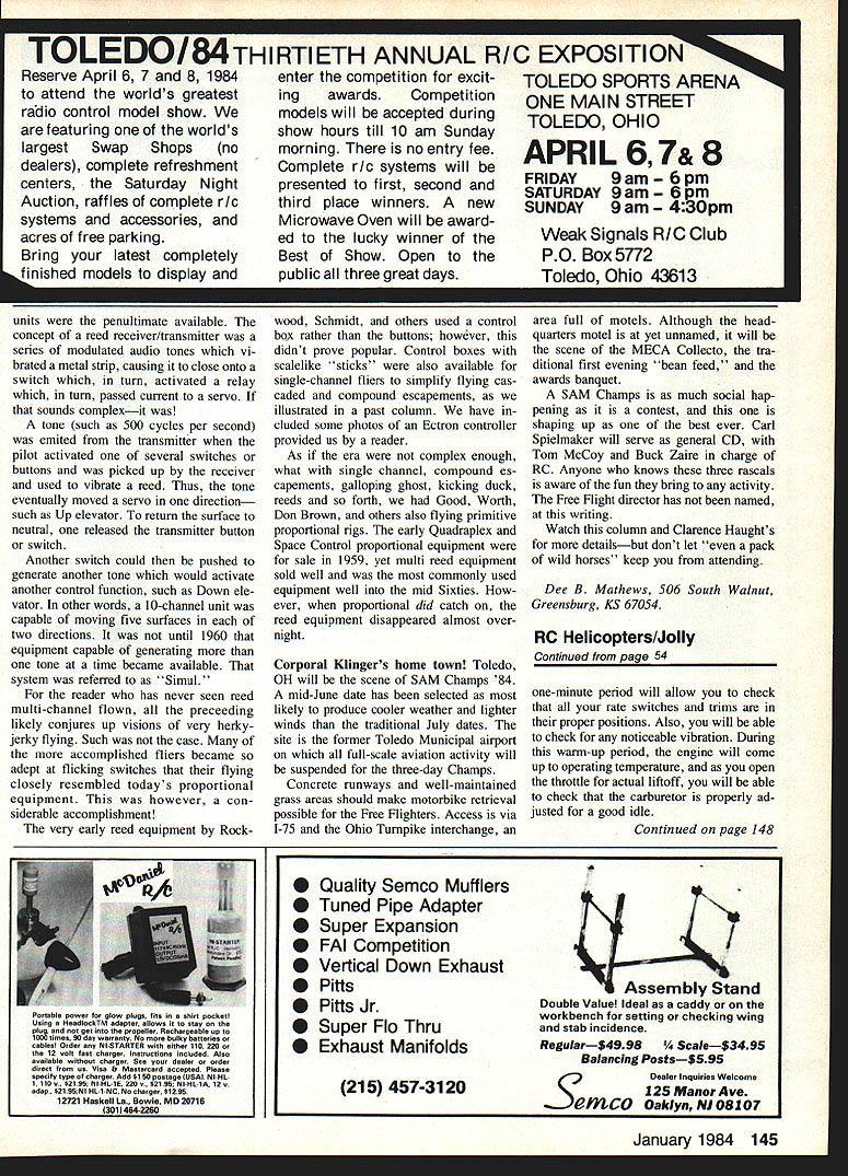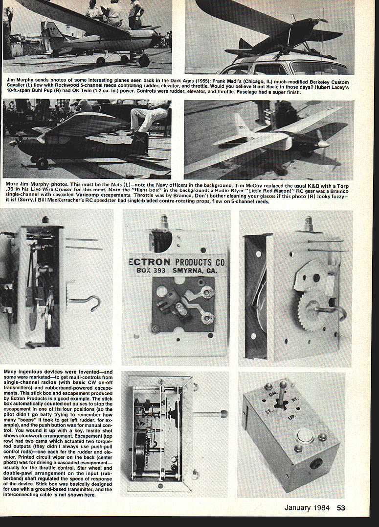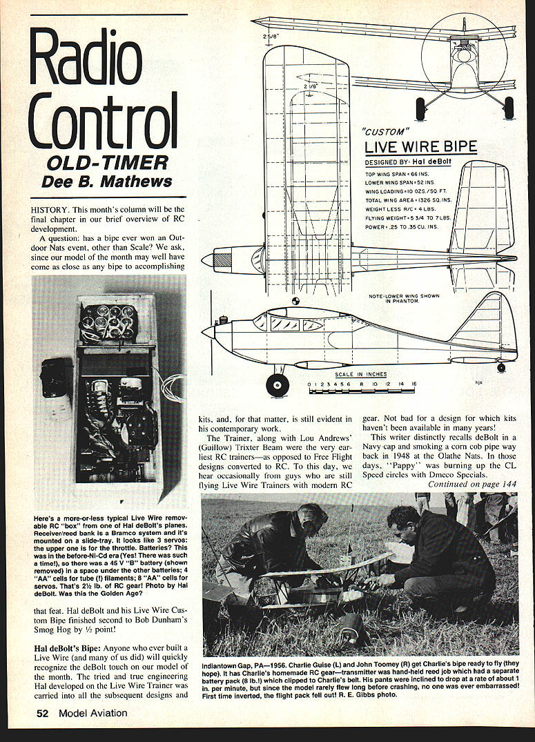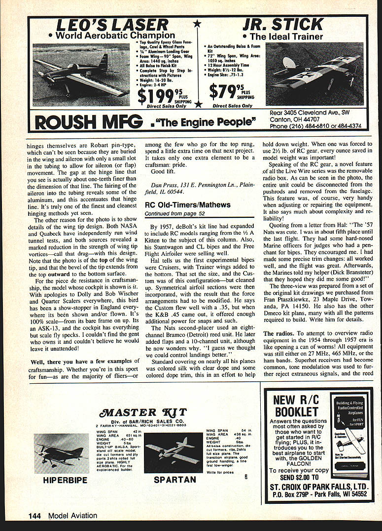 Radio Control OLD- TIMER Dee B Mathews HISTORY months column will final chapter brief overview RC development question has bipe ever won Out door Nats event other Scale ask since model month may well have come close bipe accomplishing feat Hal deBolt Live Wire Cus tom Bipe finished second Bob Dunhams Smog Hog /2 point Hal deBolts Bipe Anyone ever built Live Wire us did will quickly recognize deBolt touch model month tried true engineering Hal developed Live Wire Trainer carried subsequent designs N 2 1/8 III -v ~CUS TOM LIVE WIRE BIPE DESIGNED BY Hal deBolt TOP WING SPAN 66 INS LOWER WING SPAN52 INS WING LOADINGIO OZS/SO FT TOTAL WING AREA 1326 SQ INS WEIGHT LESS R/C S FLYING WEIGHThS 3/4 TO 7 LBS POWER 25 TO 35 CU INS________ II_ TELOWER WING SHOWN SCALE IN INCHES 0123456810 1214 16 kits matter still evident contemporary work Trainer along Lou Andrews Guillow Trixter Beam very ear liest RC trainersas opposed Free Flight designs convened RC day hear occasionally guys still flying Live Wire Trainers modem RC gear bad design kits havent available years writer distinctly recalls deBolt Navy cap smoking corn cob pipe way hack 1948 Olathe Nats days Pappy burning up CL Speed circles Dmeco Specials Continued page 144 52 Model Aviation V Heres more-or-less typical Live Wire remov able RC box Hal deBolts planes Receiver/reed bank Bramco system its mounted slide-tray looks like 3 servos upper throttle Batteries before-Ni-Cd era Yes such time 45 V 8 battery shown removed space under other batteries 4 AA cells tube filaments 8 AA cells servos Thats 2 lb RC gear Photo Hal deBolt Golden Age Indiantown Gap PAi 956 Charlie Guise L John Toomey R get Charlies bipe ready fly hope has Charlies homemade RC geartransmitter hand-held reed job separate battery pack 8 lb clipped Charlies belt pants inclined drop rate about 1 per minute since model rarely flew long before crashing no ever embarrassed First time inverted flight pack fell out R E Gibbs photo Jim Murphy sends photos some interesting planes seen back Dark Ages 1955 Frank Madis Chicago IL much-modified Berkeley Custom Cavalier L flew Rockwood 5-channel reeds controlling rudder elevator throttle Would believe Giant Scale days Hubert Laceys 1O-ft-span BuhI Pup R OK Twin 12 Cu power Controls rudder elevator throttle Fuselage super finish Jim Murphy photos must Nets Lnote Navy officers background Tim McCoy replaced usual K&B Torp 35 Live Wire Cruiser meet Note flight box background Radio Rlyer Little Red Wagon RC gear Bramco single-channel cascaded Varicomp escapements Throttle Bramco Dont bother cleaning glasses photo R looks fuzzy Sorry Bill MacKerrachers RC speedster single-bladed contra-rotating props flew 5-channel reeds ingenious devices inventedand some marketedto get multi-controls single-channel radios basic CW on-off transmitters rubberband-powered escape ments stick box escapement produced Ectron Products good example stick box automatically counted Out pulses stop escapement its four positions pilot didnt go batty trying remember beeps took get left rudder ex ample push button manual con trol wound up key Inside shot shows clockwork arrangement Escapement top row two cams actuated two torquerod outputs didnt always use push-pull control rodsone rudder ele vator Printed circuit wiper back center photo driving cascaded escapement usually throttle control Star wheel double-pawi arrangement input rub berband shaft regulated speed response device Stick box basically designed use ground-based transmitter Interconnecting cable shown January 1984 53 LEOS LASER *JR3 STICK World Aerobatic Champion Ideal Trainer Top Quolity Epoxy Glass Fuse loge Cowl & Wheel Punts An Outstanding Balsa Ia Aluminum Landing Sew Kit Foam Wlng90 Span Wing 12 Wing Span Wing Area Areo 1440 sq indes 1050 sq inches Balsa Finish Kit 12 Hour Assembly Time Complete Step Step I- Weight B/-12 lbs structions Pictures Engine Size 75-13 Weight 16-20 lbs Engine 24 HP $197 PLUS 7 PLUS7SHIPPING SNIPPING DIrect Sales OnlyDIrectSales Only Rear 3405 Cleveland Ave SW ROUSH MFG Engine People CantoR OH 44707 484-4374 hinges themselves Robart pin-type cant seen because buried wing aileron small slot tubing allow aileron flap movement gap hinge line see actually about one-tenth finer dimension line fairing aileron tubing reveals some aluminum accentuates hinge line Its truly finest cleanest hinging methods yet seen other reason photo show details wing tip design Both NASA Quabeck have independently run wind tunnel tests both sources revealed marked reduction strength wing tip vorticescall dragwith design Note photo top wing tip bevel tip extends top outward bottom surface piece de resistance craftsman ship model cockpit shown apologies Dolly Bob Wischer Quarter Scalers everywhere bird has show-stopper England its shown and/or flown Its 100% scalefrom its bare frame up Its ASK- 13 cockpit has everything scale fly specks couldnt find gent owns couldnt believe would leave unattended Well have few examples craftsmanship Whether youre sport funas majority fliersor among few go top rung spend little extra time next project takes extra element craftsman pride Good lift Dan Pruss 131 E Penningion Ln Plainfield IL 60544 RC Old-Timers/Mathews Continued page 52 1957 deBolts kit line expanded include RC models ranging en subject column Also Stuntwagon CL bipes Free Flight Airfoiler selling well Hal tells us first experimental bipes Cruisers Trainer wings added bottom set size Cus tom configurationbut cleaned up Symmetrical airfoil sections incorporated result force arrangements modified says Custom flew well 35 K&B 45 came out offered enough additional power snaps such Nats second-placer used eightchannel Bramco Detroit reed unit later added flaps 10-channel unit although now wonders guess thought could control landings better Standard covering nearly planes colored silk clear dope some colored dope trim effort help hold down weight forced use 2 lb RC gear ounce saved model weight important Speaking RC gear no
