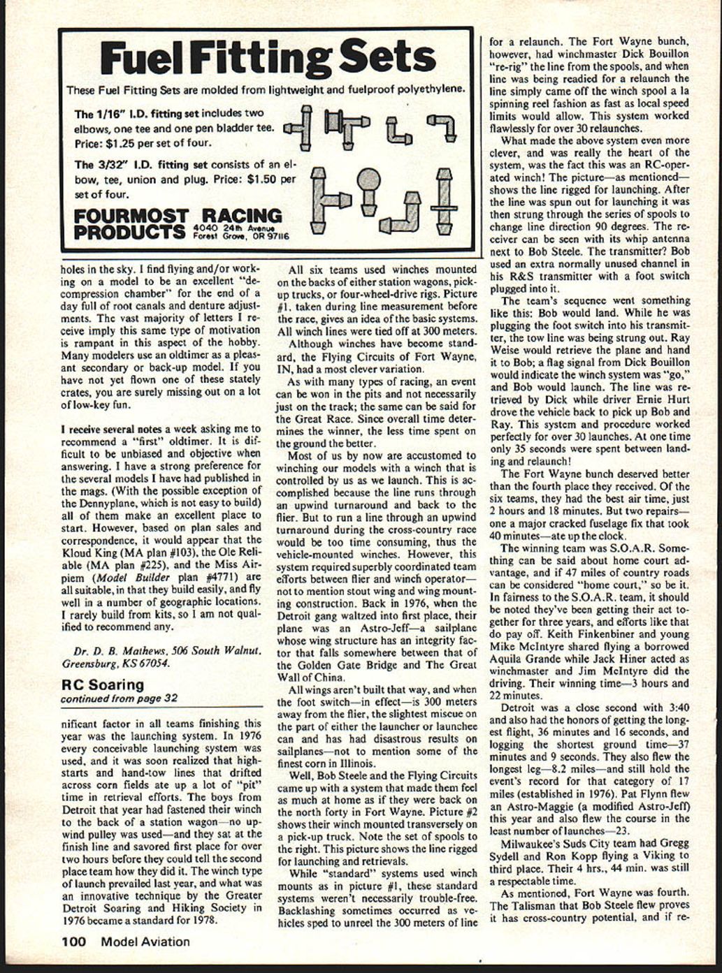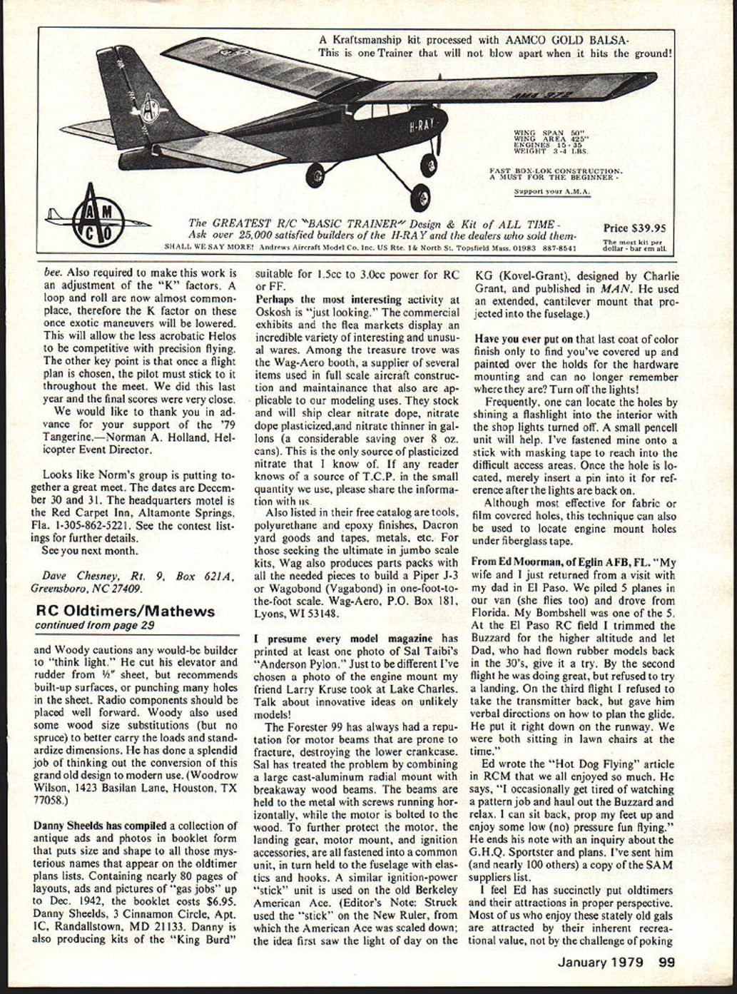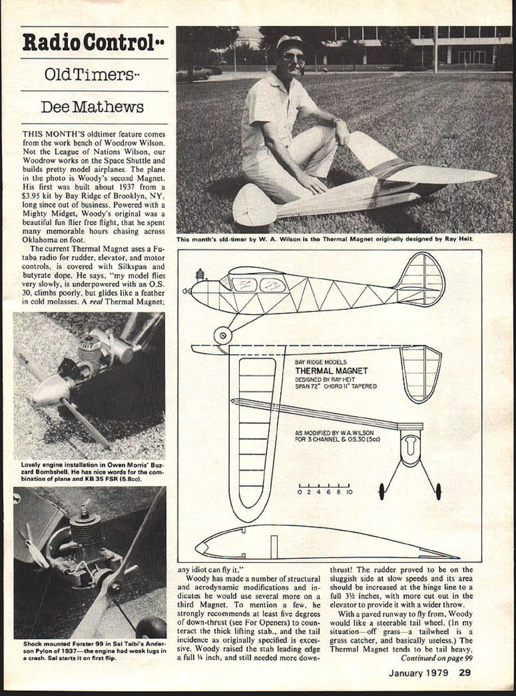 Radio Oontrol O1dTimers Dee Mathews THIS MONTHS oldtimer feature comes work bench Woodrow Wilson League Nations Wilson Woodrow works Space Shuttle builds pretty model airplanes plane photo Woodys second Magnet first built about 1937 $395 kit Bay Ridge Brooklyn NY long since out business Powered Mighty Midget Woodys original beautiful fun flier free flight spent memorable hours chasing across Oklahoma foot current Thermal Magnet uses Fu taba radio rudder elevator motor controls covered Silkspan butyrate dope says model flies very slowly underpowered 05 30 climbs poorly glides like feather cold molasses real Thermal Magnet idiot can fly Woody has made number structural aerodynamic modifications dicates would use several third Magnet mention few strongly recommends least five degrees down-thrust see Openers coun teract thick lifting stab tail incidence originally specified exces sive Woody raised stab leading edge full still needed downthrust rudder proved sluggish side slow speeds its area should increased hinge line full 3 inches cut out elevator provide wider throw paved runway fly Woody would like steerable tail wheel situationoff grassa tailwheel grass catcher basically useless Thermal Magnet tends tail heavy Continued page 99 January 1979 29 ma monins 010-timer O W vviison i nermai agnei originaiiy aesegnea oy nay neil LOV.y engii nw.auon Jwurl iviurras nuz zard Bombshell has nice words com bination plane KB 35 FSR 58cc 0 2 4 8 8 10 H nocK mouniea i-orsrer aioi Anoer son Pylon 1937the engine weak lugs crash Sa starts first flip bee Also required make work adjustment K factors loop roll now almost common place therefore K factor once exotic maneuvers will lowered will allow less acrobatic Helos competitive precision flying other key point once flight plan chosen pilot must stick throughout meet did last year final scores very close would like thank ad vance support 79 TangerineNorman Holland Hel icopter Event Director Looks like Norms group putting gether great meet dates Decem ber 30 31 headquarters motel Red Carpet Inn Altamonte Springs Fla 1-305-862-5221 See contest list ings further details See next month Dave Chesney Rt 9 Box 621A Greensboro NC 27409 RC Oldtimers/Mathews continued page 29 Woody cautions would-be builder think light cut elevator rudder /2 sheet recommends built-up surfaces punching holes sheet Radio components should placed well forward Woody also used some wood size substitutions no spruce better carry loads stand ardize dimensions has done splendid job thinking out conversion grand old design modern use Woodrow Wilson 1423 Basilan Lane Houston TX 77058 Danny Sheelds has compiled collection antique ads photos booklet form puts size shape mys terious names appear oldtimer plans lists Containing nearly 80 pages layouts ads pictures gas jobs up Dec 1942 booklet costs $695 Danny Sheelds 3 Cinnamon Circle Apt lC Randalistown MD 21133 Danny also producing kits King Burd suitable 15cc 30cc power RC FF Perhaps interesting activity Oskosh just looking commercial exhibits flea markets display incredible variety interesting unusu al wares Among treasure trove Wag-Aero booth supplier several items used full scale aircraft construc tion maintainance also ap plicable modeling uses stock will ship clear nitrate dope nitrate dope plasticizedand nitrate thinner gal lons considerable saving over 8 oz cans source plasticized nitrate know reader knows source TCP small quantity use please share informa tion us Also listed free catalog tools polyurethane epoxy finishes Dacron yard goods tapes metals etc seeking ultimate jumbo scale kits Wag also produces parts packs needed pieces build Piper J-3 Wagobond Vagabond one-foot-tothe-foot scale Wag-Aero PO Box 181 Lyons WI 53148 presume model magazine has printed least photo Sal Taibis Anderson Pylon Just different Ive chosen photo engine mount friend Larry Kruse took Lake Charles Talk about innovative ideas unlikely models Forester 99 has always repu tation motor beams prone fracture destroying lower crankcase Sal has treated problem combining large cast-aluminum radial mount breakaway wood beams beams held metal screws running hor izontally motor bolted wood further protect motor landing gear motor mount ignition accessories fastened common unit turn held fuselage elas tics hooks similar ignition-power stick unit used old Berkeley American Ace Editors Note Struck used stick New Ruler American Ace scaled down idea first saw light day KG Kovel-Grant designed Charlie Grant published MAN used extended cantilever mount pro jected fuselage Have ever put last coat color finish find youve covered up painted over holds hardware mounting can no longer remember Turn off lights Frequently can locate holes shining flashlight interior shop lights turned off small pencell unit will help Ive fastened onto stick masking tape reach difficult access areas Once hole lo cated merely insert pin ref erence after lights back Although effective fabric film covered holes technique can also used locate engine mount holes under fiberglass tape Ed N4oorman Eglin AFB FL wife just returned visit dad El Paso piled 5 planes van flies too drove Florida Bombshell 5 El Paso RC field trimmed Buzzard higher altitude let Dad flown rubber models back 30s give try second flight doing great refused try landing third flight refused take transmitter back gave him verbal directions plan glide put right down runway both sitting lawn chairs time Ed wrote Hot Dog Flying article RCM enjoyed much says occasionally get tired watching pattern job haul out Buzzard relax can sit back prop feet up enjoy some low no pressure fun flying ends note inquiry about GHQ Sportster plans Ive sent him nearly 100 others copy SAM suppliers list feel Ed has succinctly put oldtimers attractions proper perspective Most us enjoy stately old gals attracted inherent recrea tional value challenge poking January 1979 99 Kraftsmanship kit processed AAMCO GOLD BALSAThis Trainer will blow apart hits ground Support AM