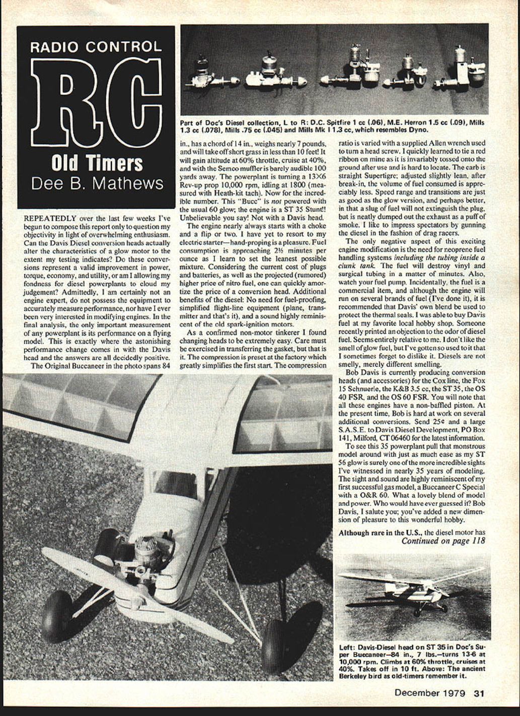 REPEATEDLY over last few weeks Ive begun compose report question objectivity light overwhelming enthusiasm Can Davis Diesel conversion heads actually alter characteristics glow motor extent testing indicates conver sions represent valid improvement power torque economy utility am allowing fondness diesel powerplants cloud judgement Admittedly am certainly engine expert possess equipment accurately measure performance nor have ever very interested modifying engines final analysis important measurement powerplant its performance flying model exactly astonishing performance change comes Davis head answers decidedly positive Original Buccaneer photo spans 84 has chord 14 weighs nearly 7 pounds will take off short grass less 10 feet will gain altitude 60% throttle cruise 40% Semco muffler barely audible 100 yards away powerplant turning 1 3X6 Rev-up prop 10000 rpm idling 1800 mea sured Heath-kit tach Now incred ible number Bucc powered usual 60 glow engine ST 35 Stunt! Unbelievable say Davis head engine nearly always starts choke flip two have yet resort electric starterhand-proping pleasure Fuel consumption approaching 2 minutes per ounce learn set leanest possible mixture Considering current cost plugs batteries well projected rumored higher price nitro fuel can quickly amor tize price conversion head Additional benefits diesel No need fuel-proofing simplified flight-line equipment plane trans mitter thats sound highly reminis cent old spark-ignition motors As confirmed non-motor tinkerer found changing heads extremely easy Care must exercised transferring gasket compression preset factory greatly simplifies first start compression ratio varied supplied Allen wrench used turn head screw quickly learned tie red ribbon invariably tossed onto ground after use hard locate carb straight Supertigre adjusted slightly lean after break-in volume fuel consumed appre ciably less Speed range transitions just good glow version perhaps better slug fuel will extinguish plug neatly dumped out exhaust puff smoke like impress spectators gunning diesel fashion drag racers negative aspect exciting engine modification need neoprene fuel handling systems including tubing inside clunk tank fuel will destroy vinyl surgical tubing matter minutes Also watch fuel pump Incidentally fuel commercial item although engine will run several brands fuel Ive done it recommended Davis own blend used protect thermal seals able buy Davis fuel favorite local hobby shop Someone recently printed objection odor diesel fuel Seems entirely relative dont like smell glow fuel Ive gotten used sometimes forget dislike Diesels smelly merely different smelling Bob Davis currently producing conversion heads accessories Cox line Fox 15 Schnuerle K&B 35 cc ST 35 OS 40 FSR 0S60 FSR will note engines have non-baffled piston present time Bob hard work several additional conversions Send 25 large SA SE Davis Diesel Development P0 Box 141 Milford CT 06460 latest information see 35 powerplant pull monstrous model around just much ease ST 56 glow surely incredible sights Ive witnessed nearly 35 years modeling sight sound highly reminiscent first successful gas model Buccaneer C Special O&R 60 What lovely blend model power would have ever guessed Bob Davis salute youve added new dimen sion pleasure wonderful hobby Although rare US diesel motor has Continued page 118 Lett UaViS-LJIeseI flead i Jbin uocsSu per Buccaneer84 7 lbsturns 13-6 10000 rpm Climbs 60% throttle cruises 40% Takes off 10 ft Above ancient Berkeley bird old-timers remember December 1979 31 Part Docs Diesel collection L R DC Spitfire 1 cc 06 ME Herron 15cc 09 Mills 13cc 078 Mills 75cc 045 Mills Mk 113cc resembles Dyno OUR AIM IS TO KEEP SPORT FLYING SPECIALIZING IN OT FF KITS AND ENGINES FOR THE COMPETITOR WE HAVE THE HOT EQUIPMENT NUSTJIiS6S 4 PLANES 1S Enb Rind BOATS PO Sex 227 CARS Panules Cmitw ThAINS Vms Wuit OIl 48396 Joe Onylma 141J 233-26 WE BUY OR TRADE OLD ENGINES AND KITS seasoned pilot like Lloyd Wheeler can happen lesser pilot much faster machines like other machines can very dangerous treated care respect times few things remember 1 Disregard instructions grab tail boom trim out check rotor blade tracking 2 Have someone around help possible Most things go wrong during first run upout cone pitch bent main shaft etc 3 Carry blanket have ready throw over Helicopter smother whirling blades will stop blades whole lot damage chopper anyone else blades break can fly also 4 Always check loose worn parts replace tighten needed Chopper parts easier replace human parts 5 Make sure battery pack cannot discon nect receiver Remember machines can give much joy fun used safety mind times will eat face carefuL RC Clubs Ludington MI praised compassion aid Wheelers hour need some mighty nice planes too anyone has ideas about birds write Ray Hanchett 1647 Lake Lansing Road Haslett MI 48840 phone 517 3398437 Mr Chesney hope can publish have heard few other accidents same nature Ray Hanchett OK anyone out want tackle com plete set safety rules specifically RC Helicopters Well publish list column after review RC Helicopter Advisory Committee other interested parties Speaking interested parties Richard Gielow Jr president Rantoul Chanute RC Club trying organize Midwestern Helicopter Association District VI Illinois Indiana Kentucky Missouri believes eventually gathering state/district organizations could replace old National RC Helicopter Association youre interested drop Richard line 1536 Apollo Drive Rantoul IL 61866 way drop line name Helicopter group contact name address can direct some aspiring RC Helicopter fliers way youre ham listen KA4K1G Id love talk Helicopters Well thats month Now catch up some letter writing Fly safely Dave Chesney Rt 9 Box 621A Greensboro NC 27409 RC Old Timers/Mathews continued page 31 highly popular Europe since 1945 typical European sport model UC FF RC powered small diesel of5 cc 25 cc reasons diesels continued popu larity Europe diverse certainly frugality for