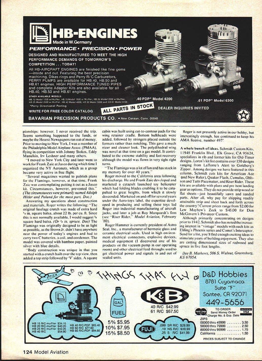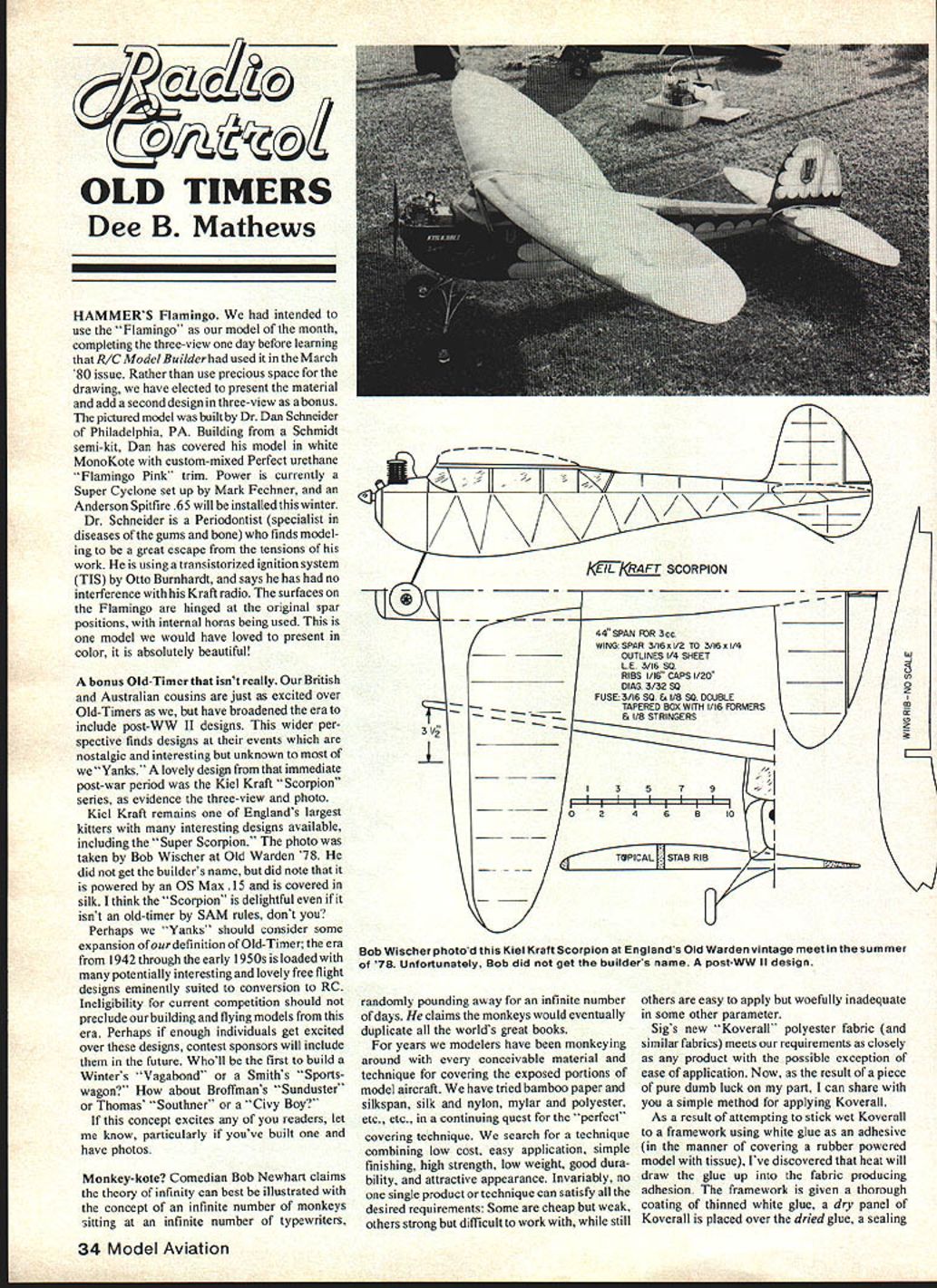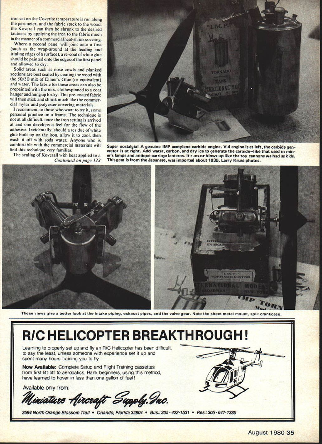 OLD TIMERS Dee B Mathews HAMMERS Flamingo intended use Flamingo model month completing three-view day before learning R/C ModelBuilder used itin March 80 issue Rather use precious space drawing have elected present material add second design three-view bonus pictured model built Dr Dan Schneider Philadelphia PA Building Schmidt semi-kit Dan has covered model white MonoKote custom-mixed Perfect urethane Flamingo Pink trim Power currently Super Cyclone set up Mark Fechner Anderson Spitfire 65 will installed winter Dr Schneider Periodontist specialist diseases gums bone finds model ing great escape tensions work using transistorized ignition system TIS Otto Burnhardt says has no interference Kraft radio surfaces Flamingo hinged original spar positions internal horns being used model would have loved present color absolutely beautiful bonus Old-Timer isnt really British Australian cousins just excited over Old-Timers have broadened era include post-WW II designs wider per spective finds designs events nostalgic interesting unknown Yanks lovely design immediate post-war period Kiel Kraft Scorpion series evidence three-view photo Kiel Kraft remains Englands largest kitters interesting designs available including Super Scorpion photo taken Bob Wischer Old Warden 78 did get builders name did note powered OS Max 15 covered silk think Scorpion delightful isnt old-timer SAM rules dont Perhaps Yanks should consider some expansion ourdefinition Old-Timer era 1942 through early 1 950s loaded potentially interesting lovely free flight designs eminently suited conversion RC Ineligibility current competition should preclude building flying models era Perhaps enough individuals get excited over designs contest sponsors will include future Wholl first build Winters Vagabond Smiths Sports wagon about Broffmans Sunduster Thomas Southner Civy Boy concept excites readers let know particularly youve built have photos Monkey-kote Comedian Bob Newhart claims theory infinity can best illustrated concept infinite number monkeys sitting infinite number typewriters kEIL KRAFT SCORPION TAPERED BOX WITH 1/16 FORMERS & I/B STRINGERS I3579 Bob Wischer photod Kiel Kraft Scorpion Englands Old Warden vintage meet summer 78 Unfortunately Bob did get builders name postWW II design randomly pounding away infinite number days claims monkeys would eventually duplicate worlds great books years modelers have monkeying around conceivable material technique covering exposed portions model aircraft have tried bamboo paper silkspan silk nylon mylar polyester etc etc continuing quest perfect covering technique search technique combining low cost easy application simple finishing high strength low weight good dura bility attractive appearance Invariably no single product technique can satisfy desired requirements Some cheap weak others strong difficult work still others easy apply woefully inadequate some other parameter Sigs new Koverall polyester fabric similar fabrics meets requirements closely product possible exception ease application Now result piece pure dumb luck part can share simple method applying Koverall As result attempting stick wet Koverall framework using white glue adhesive manner covering rubber powered model tissue Ive discovered heat will draw glue up fabric producing adhesion framework given thorough coating thinned white glue dry panel Koverall placed over dried glue sealing 34 Model Aviation 0 z iron set Coverite temperature run along perimeter fabric stuck wood Koverall can shrunk desired tautness applying iron fabric much mannerofa commercial heat-shrink covering second panel will joint Onto first such wrap-around leading trialing edges surface re-coat white glue should painted onto edges first panel allowed dry Solid areas such nose cowls planked sections best sealed coating wood 50/50 mix Elmers Glue equivalent water fabric areas can also prepainted mix clothespinned coat hanger hung up dry pre-coated fabric will stick shrink much like commer cial mylar polyester covering materials recommend want try some personal practice frame technique difficult once iron setting arrived develops feel flow adhesive Incidentally should residue white glue built up iron allow cool wash off soda water Anyone comfortable commercial materials will Super nostalgia genuine IMP acetylene carbide engine V-4 engine isat Ieftthe carbide gen find technique very familiar erator right Add water carbon dry ice generate carbidelike used mmThe sealing Koverall heat applied ers lampsand antique carriage lanterns runs blows up like toy cannonswe askids Continued page 123 gem Japanese imported about 1935 Larry Kruse photos views give better look intake piping exhaust pipes valve gear Note aheet metal mount split crankcase August 1980 35 RIC HELICOPTER BREAKTHROUGH Learning properly set up fly R/C Helicopler has difficult say least unless someone experience set up spent hours training fly Now Available Complete Setup Flight Training cassettes first lift off aerobatics Rank beginners using method have learned hover less gallon fuel l Available 9G9*O 2594 North Orange Blossom Trail ndo Florida 32804 305-422-1531 305-847-1335 Tanks ver half winning contestants 1979 National Model Airplane Cham pionships held Lincoln Nebraska specified what tank installed entries said using Sullivan Brand Over half No other brand could come close Champion modelers agree FULL TANK SYSTEM Sullivan has really put together built-in bubble space air tubing can fill way top enjoy extralong flights Just like other champions use tanks diesel tuei Winning control line flyers AMA championships chose Sullivan lines rate almost 3 1 over next popular brand Thats lead thats almost long four standard lengths . 35 52 60 70 . Sullivans Pylon Brand Control Lines dealers stock dont forget diameters run 008 up 021 size champions GOLDN PUSH RODS -i / push rods beat clog Pat ented splines inner rod cut right through mess Temperature compen sated prevent 1 elongation Good gold Insist Go