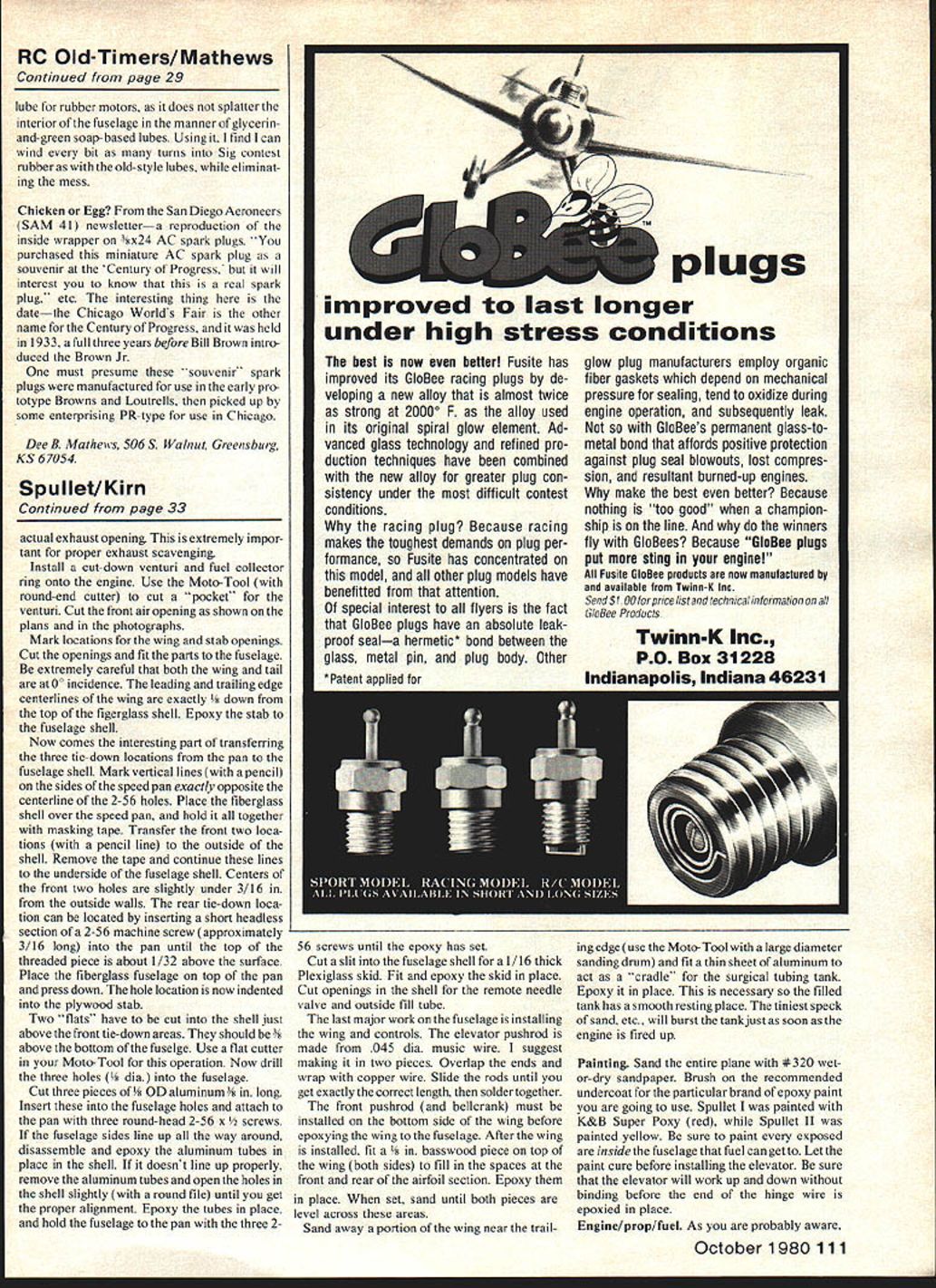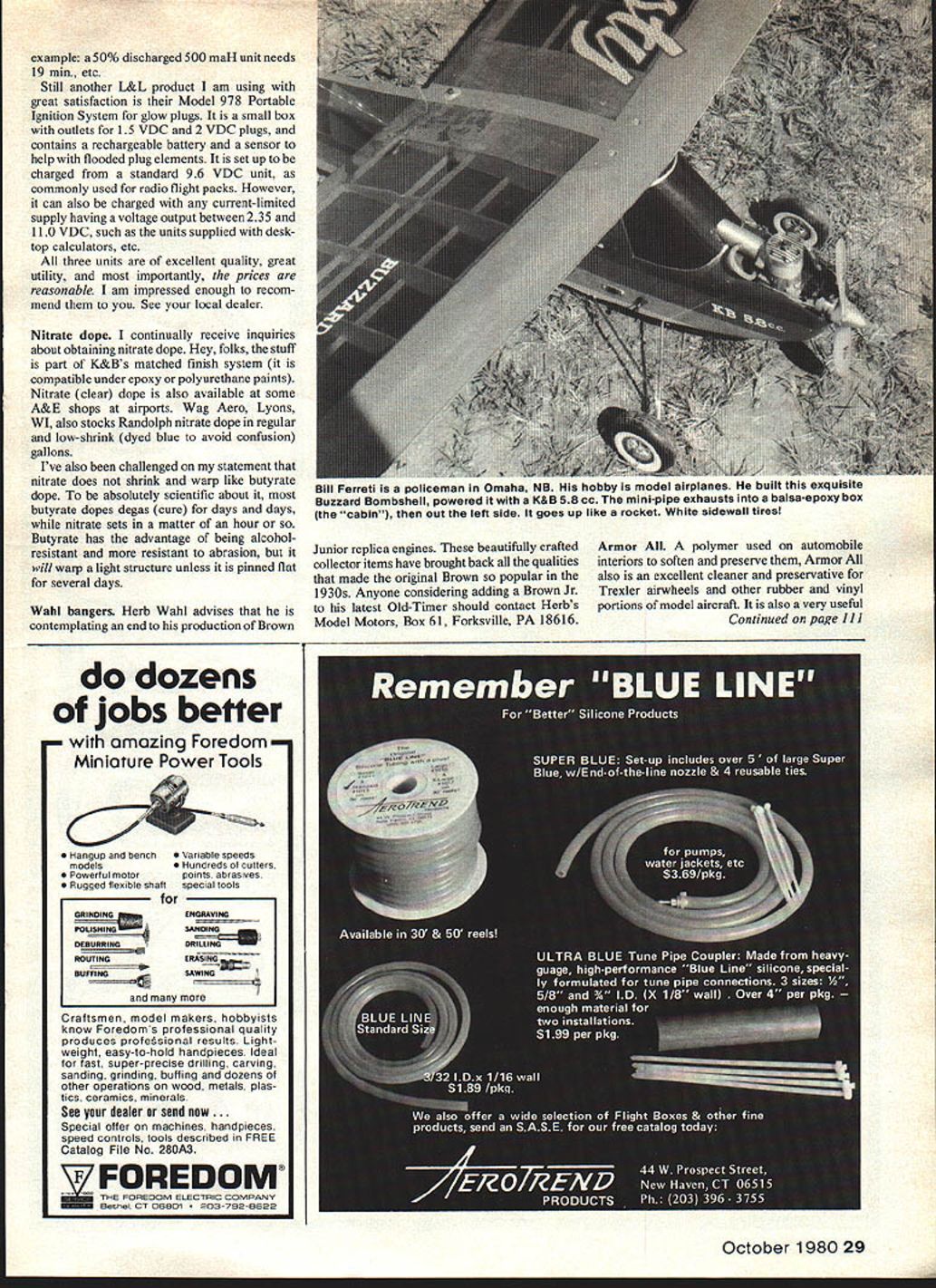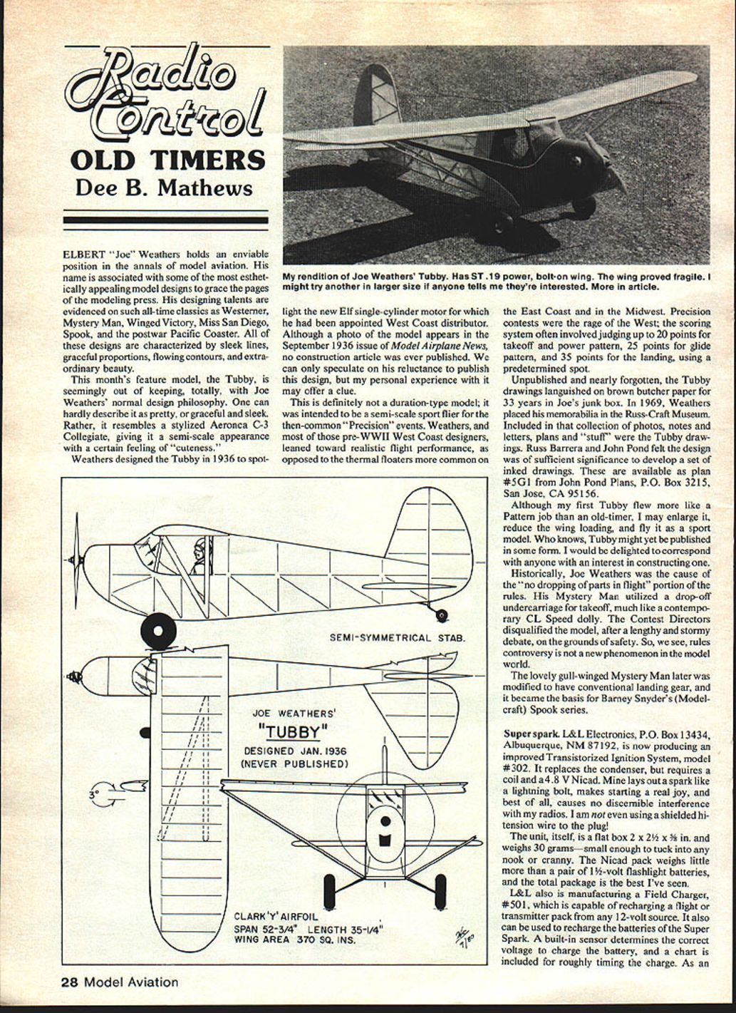 OLD TIMERS Dee B Mathews ELBERT joe Weathers holds enviable position annals model aviation name associated some esthet ically appealing model designs grace pages modeling press designing talents evidenced such all-time classics Westerner Mystery Man Winged Victory Miss San Diego Spook postwar Pacific Coaster designs characterized sleek lines graceful proportions flowing contours extra ordinary beauty months feature model Tubby seemingly Out keeping totally Joe Weathers normal design philosophy can hardly describe pretty graceful sleek Rather resembles stylized Aeronca C-3 Collegiate giving semi-scale appearance certain feeling cuteness Weathers designed Tubby 1936 spotI 30 I 141 / , I/I ____ ii IIi III IIi III IIII 1/: // I II Iii light new Elf single-cylinder motor appointed West Coast distributor Although photo model appears September 1936 issue ModelAirplane News no construction article ever published can speculate reluctance publish design personal experience may offer clue definitely duration-type model intended semi-scale sport flier then-common Precision events Weathers pre-WWII West Coast designers leaned toward realistic flight performance opposed thermal floaters common SEMI-SYMMETRICAL STAB NEVER PUBLISHED U CLARK Y AIRFOIL SPAN 52-3/4 LENGTH 35-1/4 WING AREA 370 SQ INS East Coast Midwest Precision contests rage West scoring system often involved judging up 20 points takeoff power pattern 25 points glide pattern 35 points landing using predetermined spot Unpublished nearly forgotten Tubby drawings languished brown butcher paper 33 years Joes junk box 1969 Weathers placed memorabilia Russ-Craft Museum Included collection photos notes letters plans stuff Tubby draw ings Russ Barrera John Pond felt design sufficient significance develop set inked drawings available plan #5G1 John Pond Plans PO Box 3215 San Jose CA 95156 Although first Tubby flew like Pattern job old-timer may enlarge reduce wing loading fly sport model knows Tubby might yet published some form would delighted correspond anyone interest constructing Historically Joe Weathers cause no dropping parts flight portion rules Mystery Man utilized drop-off undercarriage takeoff much like contempo rary CL Speed dolly Contest Directors disqualified model after lengthy stormy debate grounds ofsafety So see rules controversy new phenomenon model world lovely gull-winged Mystery Man later modified have conventional landing gear became basis Barney Snyders Model craft Spook series Super spark L&L Electronics PO Box 13434 Albuquerque NM 87192 now producing improved Transistorized Ignition System model #302 replaces condenser requires coil 48 V Nicad Mine lays out spark like lightning bolt makes starting real joy best causes no discernible interference radios am using shielded hitension wire plug unit itself flat box 2 x 2 x hs 30 gramssmall enough tuck nook cranny Nicad pack weighs little pair 1-volt flashlight batteries total package best Ive seen L&L also manufacturing Field Charger #501 capable recharging flight transmitter pack 12-volt source also can used recharge batteries Super Spark built-in sensor determines correct voltage charge battery chart included roughly timing charge As 28 Model Aviation rendition J00 Weathers Tubby Has ST 19 power bolt-on wing wing proved fragile might try another larger size anyone tells theyre interested article example 50% discharged 500 maH unit needs 19 mm etc Still another L&L product am using great satisfaction Model 978 Portable Ignition System glow plugs small box outlets 15 VDC 2 VDC plugs contains rechargeable battery sensor help flooded plug elements set up charged standard 96 VDC unit commonly used radio flight packs However can also charged current-limited supply having voltage output between 235 110 VDC such units supplied desk top calculators etc three units excellent quality great utility importantly prices reasonable am impressed enough recom mend See local dealer Nitrate dope continually receive inquiries about obtaining nitrate dope Hey folks stuff part K&Bs matched finish system compatible under epoxy polyurethane paints Nitrate clear dope also available some A&E shops airports Wag Aero Lyons WI also stocks Randolph nitrate dope regular low-shrink dyed blue avoid confusion gallons Ive also challenged statement nitrate does shrink warp like butyrate dope absolutely scientific about butyrate dopes degas cure days days nitrate sets matter hour Butyrate has advantage being alcoholresistant resistant abrasion will warp light structure unless pinned flat several days Wahi bangers Herb Wahl advises contemplating end production Brown Junior replica engines beautifully crafted collector items have brought back qualities made original Brown popular 1930s Anyone considering adding Brown Jr latest Old-Timer should contact Herbs Model Motors Box 61 Forkaville PA 18616 Armor polymer used automobile interiors soften preserve Armor also excellent cleaner preservative Trexler airwheels other rubber vinyl portions model aircraft also very useful Continued page 111 dozens jobs better amazing Foredom Miniature Power Tools Hangup snd benchS Variable speeds modelsS Hundreds of- cutters Powerful motor points abrasives Rugged flexible shatf special fools ENGRAVING SANDING ORNG ERASING SAWING DEBINH ROUTING Craftsmen model makers hobbyists know Foredoms professional quality produces profesional results Light weight easy-to-hold handpieces Ideal fast super-precise drilling carving sanding grinding buffing dozens other operations wood metals plas tics ceramics minerals See dealer send now Special offer machines handpieces speed controls tools described FREE Catalog F le No 280A3 FOREDOM THE FOPEDOM ELECTRIC cOMPANY h C 06801 203-7ea-6e22 October 1980 29 Bill Ferreti policeman Omaha NB hobby model airplanes iie bulls mis OXUI5I5G Buzzard Bombshell powered K&B 58 cc mini-pipe exhausts balsa-epoxy box cabin Out left side goes up like rocket White sidewall tires RC Old-Timers/Mathews Continued page 29 lu