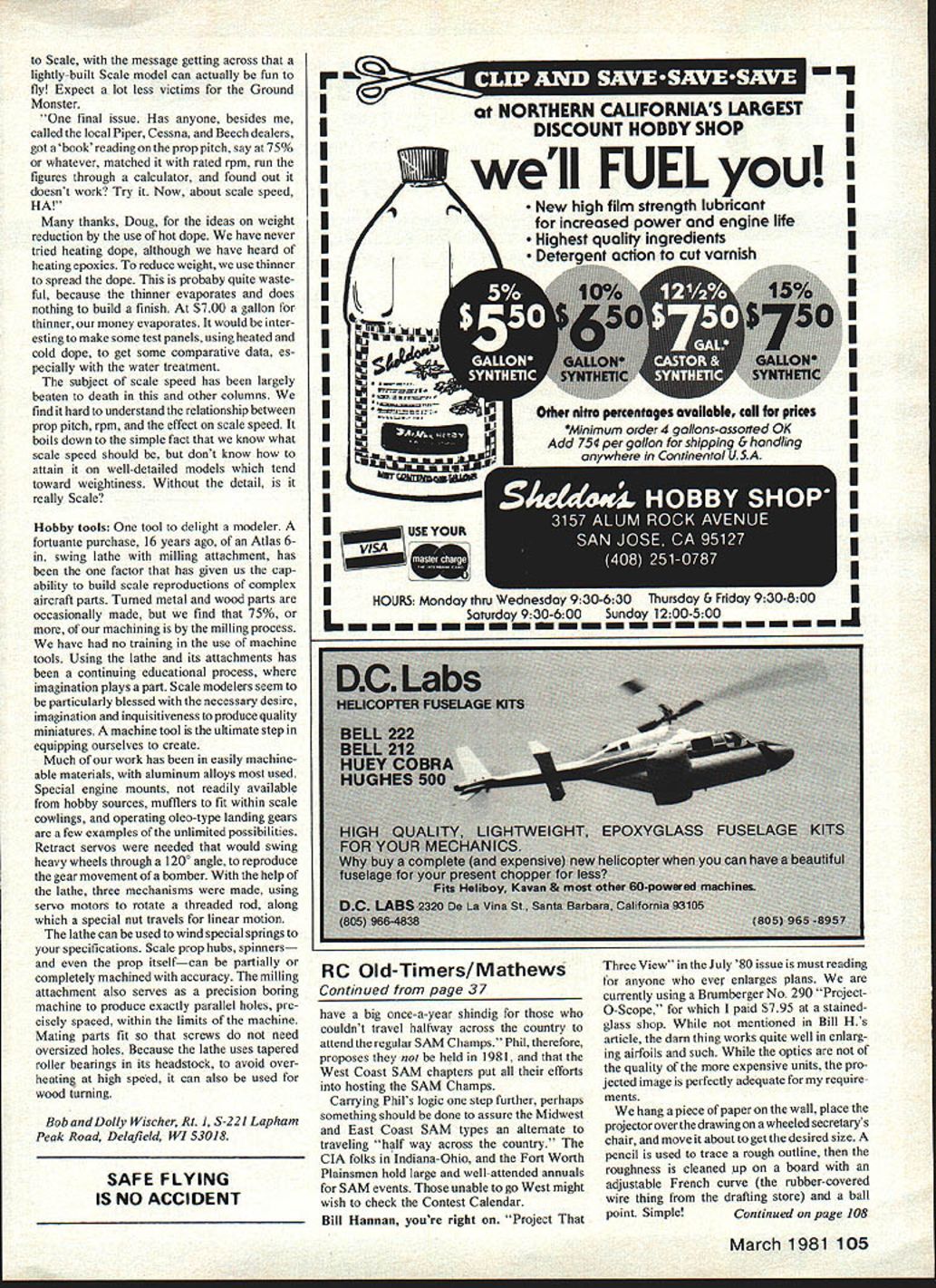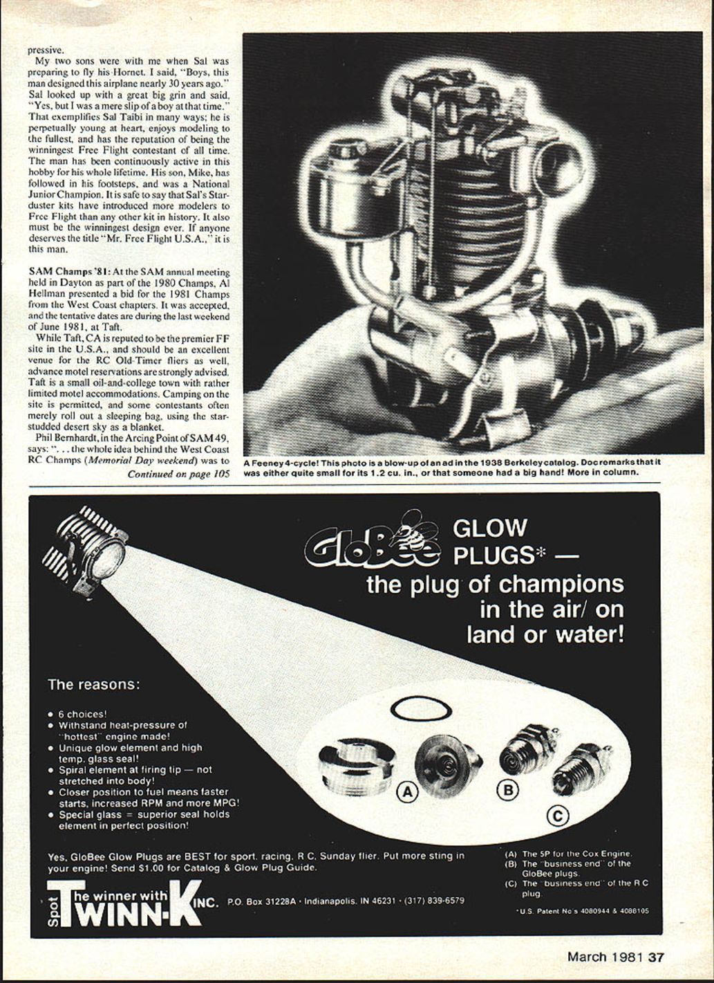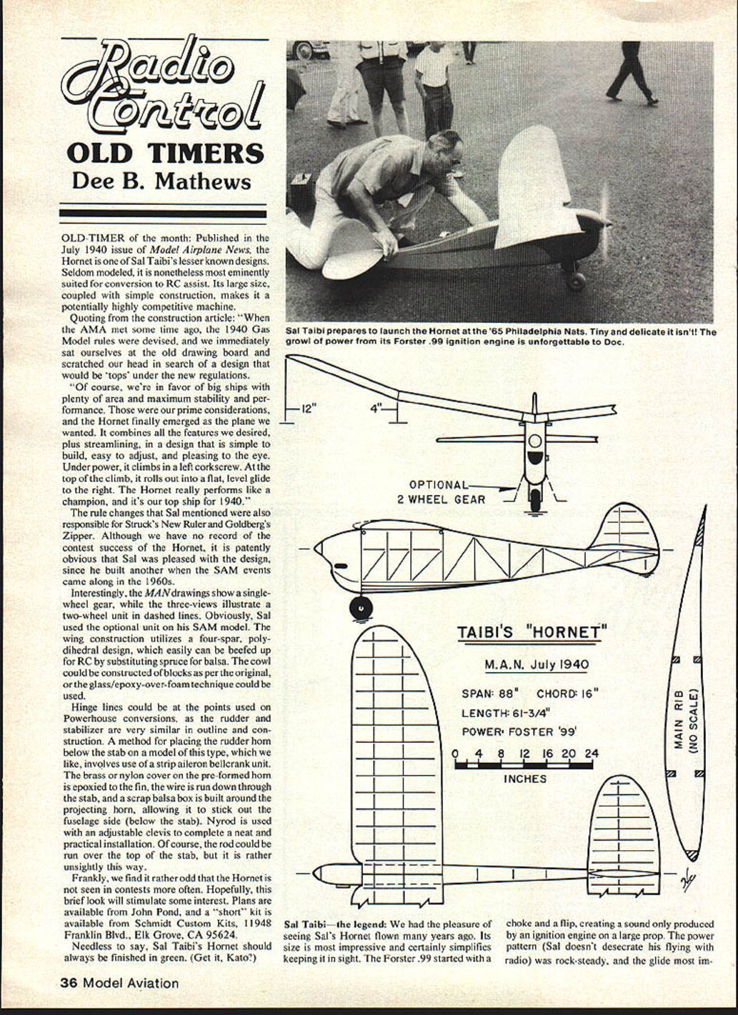 OLD TIMERS Dee B Mathews OLD-TIMER month Published July 1940 issue Model Airplane News Hornet Sal Taibis lesser known designs Seldom modeled nonetheless eminently suited conversion RC assist Its large size coupled simple construction makes potentially highly competitive machine Quoting construction article AMA met some time ago 1940 Gas Model rules devised immediately sat ourselves old drawing board scratched head search design would tops under new regulations course favor big ships plenty area maximum stability per formance prime considerations Hornet finally emerged plane wanted combines features desired plus streamlining design simple build easy adjust pleasing eye Under power climbs left corkscrew As top climb rolls out flat level glide right Hornet really performs like champion its top ship 1940 rule changes Sal mentioned also responsible Strucks New Ruler Goldbergs Zipper Although have no record contest success Hornet patently obvious Sal pleased design since built another SAM events came along 1960s Interestingly MANdrawings show singlewheel gear three-views illustrate two-wheel unit dashed lines Obviously Sal used optional unit SAM model wing construction utilizes four-spar poly dihedral design easily can beefed up RC substituting spruce balsa cowl could constructed blocks per original glass/epoxy-over-foam technique could used Hinge lines could points used Powerhouse conversions rudder stabilizer very similar outline con struction method placing rudder horn below stab model type like involves use strip aileron bellcrank unit brass nylon cover pre-formed horn epoxied fin wire run down through stab scrap balsa box built around projecting horn allowing stick out fuselage side below stab Nyrod used adjustable clevis complete neat practical installation course rod could run over top stab rather unsightly way Frankly find rather odd Hornet seen contests often Hopefully brief look will stimulate some interest Plans available John Pond short kit available Schmidt Custom Kits 11948 Franklin Blvd Elk Grove CA 95624 Needless say Sal Taibis Hornet should always finished green Get Kato 2 WHEEL GEAR J II i-i-i-i-Sal Taibithe legend pleasure seeing Sals Hornet flown years ago Its size impressive certainly simplifies keeping sight Forster 99 started 4 TAIBIS HORNET MAN July 1940 SPAN 88 CHORD 6 LENGTH 6l-3/4 POWER FOSTER 99 9 16 20 24 mj choke flip creating sound produced ignition engine large prop power pattern Sal doesnt desecrate flying radio rock-steady glide im 36 Model Aviation sal aiw prepares launch Hornet 65 Philadelphia Nats Tiny delicate isnt growl power its Forster 99 ignition engine unforgettable Doc pressive two sons Sal preparing fly Hornet said Boys man designed airplane nearly 30 years ago Sal looked up great big grin said Yes mere slip boy time exemplifies Sal Taibi ways perpetually young heart enjoys modeling fullest has reputation being winningest Free Flight contestant time man has continuously active hobby whole lifetime son Mike has followed footsteps National Junior Champion safe say Sals Starduster kits have introduced modelers Free Flight other kit history also must winningest design ever anyone deserves title Mr Free Flight USA man SAM Champs 81At SAM annual meeting held Dayton part 1980 Champs Al Hellman presented bid 1981 Champs West Coast chapters accepted tentative dates during last weekend ofJune 1981 Taft Taft CA reputed premier FF site USA should excellent venue RC Old-Timer fliers well advance motel reservations strongly advised Taft small oil-and-college town rather limited motel accommodations Camping site permitted some contestants often merely roll out sleeping bag using starstudded desert sky blanket Phil Bemhardt Arcing Point SAM 49 says .. whole idea behind West Coast RC Champs Memorial Day weekend Continued page 105 March 1981 37 Feeney 4-cycle photo blow-up ad 1938 Berkeley catalog Doc remarkstllat either quite small its 12 cu someone big hand column Scale message getting across lightly-built Scale model can actually fun fly Expect lot less victims Ground Monster final issue Has anyone besides called local Piper Cessna Beech dealers got book reading prop pitch say 75% whatever matched rated rpm run figures through calculator found Out doesnt work Try Now about scale speed HA thanks Doug ideas weight reduction use hot dope have never tried heating dope although have heard heating epoxies reduce weight use thinner spread dope probaby quite waste ful because thinner evaporates does nothing build finish $700 gallon thinner money evaporates would inter esting make some test panels using heated cold dope get some comparative data es pecially water treatment subject scale speed has largely beaten death other columns find hard understand relationship between prop pitch rpm effect scale speed boils down simple fact know what scale speed should dont know attain well-detailed models tend toward weightiness Without detail really Scale Hobby tools tool delight modeler fortuante purchase 16 years ago Atlas 6in swing lathe milling attachment has factor has given us cap ability build scale reproductions complex aircraft parts Turned metal wood parts occasionally made find 75% machining milling process have no training use machine tools Using lathe its attachments has continuing educational process imagination plays apart Scale modelers seem particularly blessed necessary desire imagination inquisitiveness produce quality miniatures machine tool ultimate step equipping ourselves create Much work has easily machineable materials aluminum alloys used Special engine mounts readily available hobby sources mufflers fit within scale cowlings operating oleo-type landing gears few examples unlimited possibilities Retract servos needed would swing heavy wheels through 1200 angle reproduce gear movement bomber help lathe three mechanisms made using servo motors rotate threaded rod along special nut travels linear motion lathe can used wind special springs specifications Scale p