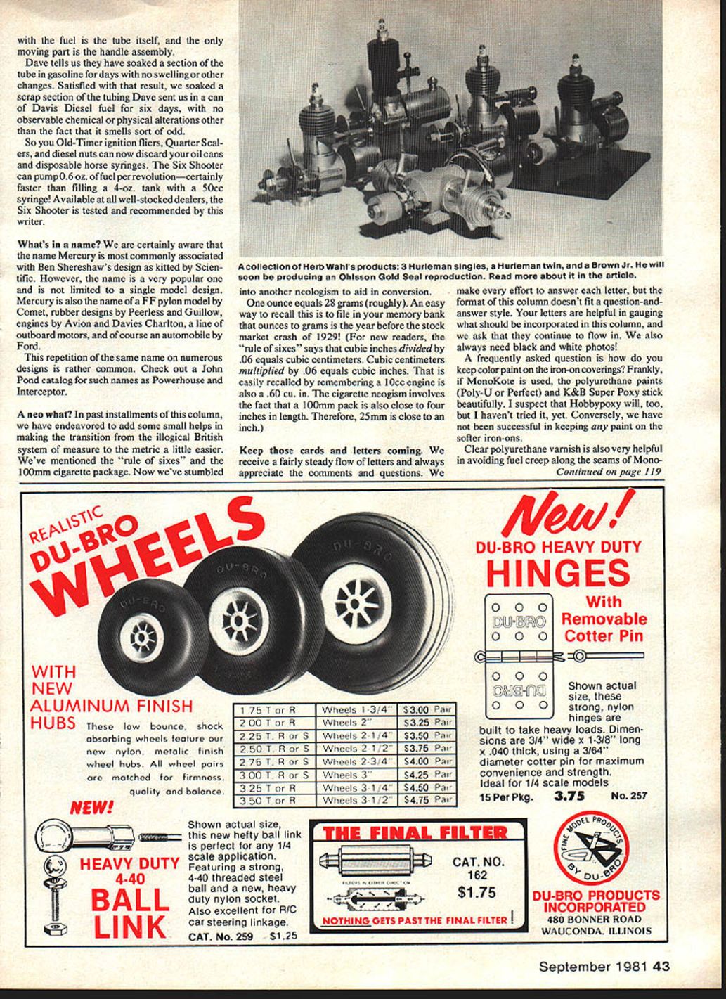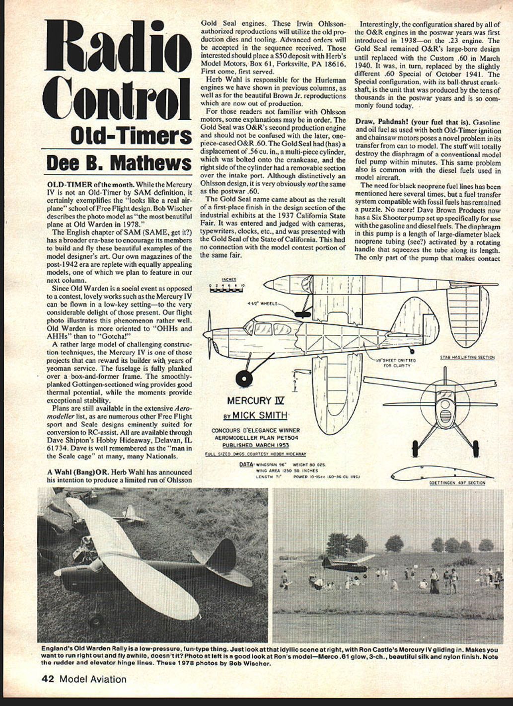 Radio Control Old-Timers Dee B Mathews OLD-TIMER month Mercury IV is Old-Timer SAM definition certainly exemplifies looks like real air plane school Free Flight design Bob Wischer describes photo model beautiful plane Old Warden 1978 English chapter SAM SAME get has broader era-base encourage its members build fly beautiful examples model designers art own magazines post- 1942 era replete equally appealing models plan feature next column Since Old Warden social event opposed contest lovely works such Mercury IV can flown low-key settingto very considerable delight present flight photo illustrates phenomenon rather well Old Warden oriented OHHs AHHs Gotcha rather large model challenging construc tion techniques Mercury IV projects can reward its builder years yeoman service fuselage fully planked over box-and-former frame smoothly planked Gottingen-sectioned wing provides good thermal potential moments provide exceptional stability Plans still available extensive Aero modeller list numerous other Free Flight sport Scale designs eminently suited conversion RC-assist available through Dave Shiptons Hobby Hideaway Delavan IL 61734 Dave well remembered man Scale cage many Nationals Gold Seal engines Irwin Oblsson authorized reproductions will utilize old pro duction dies tooling Advanced orders will accepted sequence received interested should place $50 deposit Herbs Model Motors Box 61 Forksville PA 18616 First come first served Herb WahI responsible Hurleman engines have shown previous columns well beautiful Brown Jr reproductions now out production readers familiar Ohlsson motors some explanations may order Gold Seal O&Rs second production engine should confused later onepiece-cased O&R 60 Gold Seal has displacement of56 cu multi-piece cylinder bolted onto crankcase right side cylinder removable section over intake port Although distinctively Ohlsson design very obviously same postwar 60 Gold Seal name came about result first-place finish design section industrial exhibits 1937 California State Fair entered judged cameras typewriters clocks etc presented Gold Seal State California no connection model contest portion same fair INCHES Interestingly configuration shared O&R engines postwar years first introduced 1938on 23 engine Gold Seal remained O&Rs large-bore design until replaced Custom 60 March 1940 turn replaced slightly different 60 Special October 1941 Special configuration its ball-thrust crank shaft unit produced tens thousands postwar years com monly found today Draw Pahdnah fuel Gasoline oil fuel used both Old-Timer ignition chainsaw motors poses novel problem its transfer can model stuff will totally destroy diaphragm conventional model fuel pump within minutes same problem also common diesel fuels used model aircraft need black neoprene fuel lines has mentioned several times fuel transfer system compatible fossil fuels has remained puzzle No Dave Brown Products now has Six Shooter pump set up specifically use gasoline diesel fuels diaphragm pump length large-diameter black neoprene tubing see activated rotating handle squeezes tube along its length part pump makes contact ____________ STAB HAS LIFTING SECTION 1___ / MERCURY1_ BYMICK SMITHQ coNcouRs DELEGANcE WINNER AEROMODELLER PLAN PET5O4 PUBLISHED MARCH 1953 FULL SiZES SWUS COURTESY HOBBY HIDEAWAY DATA WINGSPAN 96WEIGHT 80 GOS WahI BangOR Herb Wahl has announcedWING AREA 1050 SQ INCHES intention produce limited run OhlssonPOWER 10-16CC L60-9H CO INSIGOETYINGEN 497 SECTION 42 Model Aviation Englands Old Warden Rally low-pressure fun-type thing Just look idyllic scene right Ron Castles Mercury IV gliding Makes want run right out fly awhile doesnt Photo left good look Rons modelMerco 61 glow 3-ch beautiful silk nylon finish Note rudder elevator hinge lines 1978 photos Bob Wischer fuel tube itself moving part handle assembly Dave tells us have soaked section tube gasoline days no swelling other changes Satisfied result soaked scrap section tubing Dave sent us can Davis Diesel fuel six days no observable chemical physical alterations other fact smells sort odd So Old-Timer ignition fliers Quarter Scal ers diesel nuts can now discard oil cans disposable horse syringes Six Shooter can pump 06 oz fuel per revolutioncertainly faster filling 4-oz tank 50cc syringe Available well-stocked dealers Six Shooter tested recommended writer Whats name certainly aware name Mercury commonly associated Ben Shereshaws design kitted Scien tific However name very popular limited single model design Mercury also name FF pylon model Comet rubber designs Peerless Guillow engines Avion Davies Charlton line outboard motors course automobile Ford repetition same name numerous designs rather common Check out John Pond catalog such names Powerhouse Interceptor neo what past installments column have endeavored add some small helps making transition illogical British system measure metric little easier Weve mentioned rule sixes 100mm cigarette package Now weve stumbled another neologism aid conversion ounce equals 28 grams roughly An easy way recall file memory bank ounces grams year before stock market crash 1929 new readers rule sixes says cubic inches divided 06 equals cubic centimeters Cubic centimeters multiplied 06 equals cubic inches easily recalled remembering 10cc engine also 60 cu cigarette neogism involves fact lOOmns pack also close four inches length Therefore 25mm close inch Keep cards letters coming receive fairly steady flow letters always appreciate comments questions make effort answer letter format column doesnt fit question-andanswer style letters helpful gauging what should incorporated column ask continue flow also always need black white photos frequently asked question keep color paint iron-on coverings Frankly MonoKote used polyurethane paints Poly-U Perfect K&B Super Poxy stick beautifully suspect Hobbypoxy will too havent tried yet Conversely have successful keeping paint softer iron-ons Clear polyurethane varnish also very helpful a